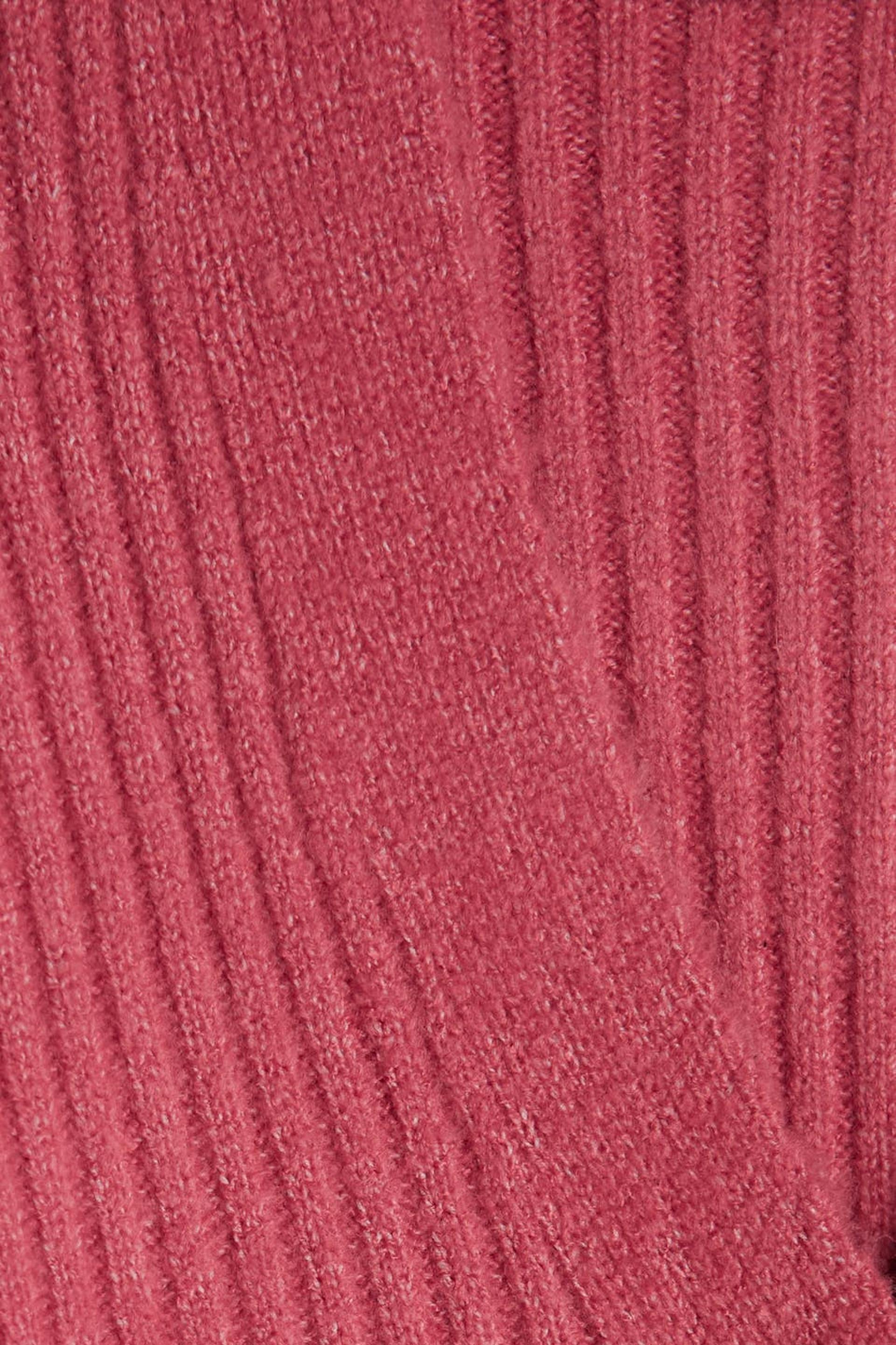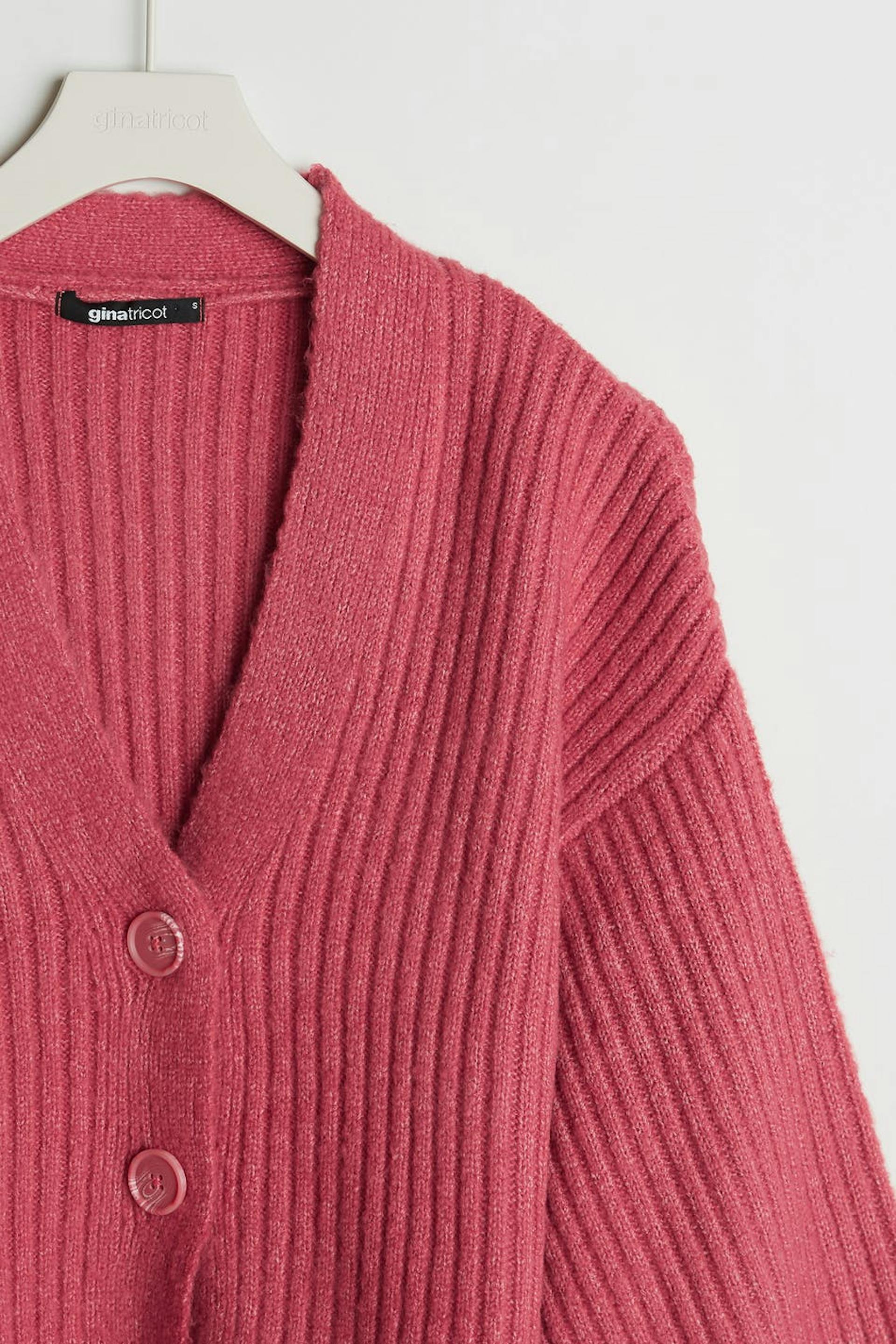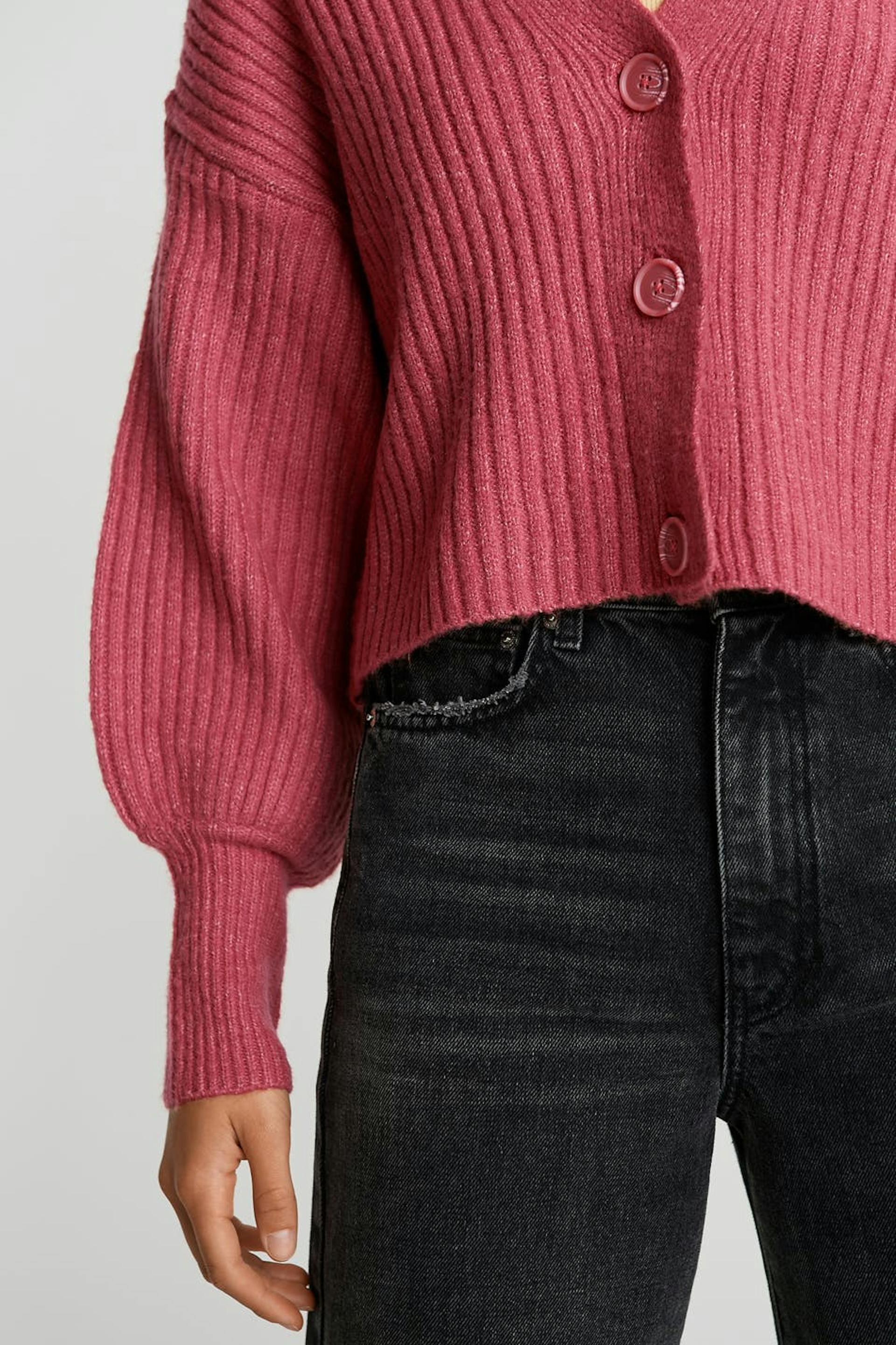 Knitted jumper with long rib knit on the sleeves. The jumper is pink and shorter.