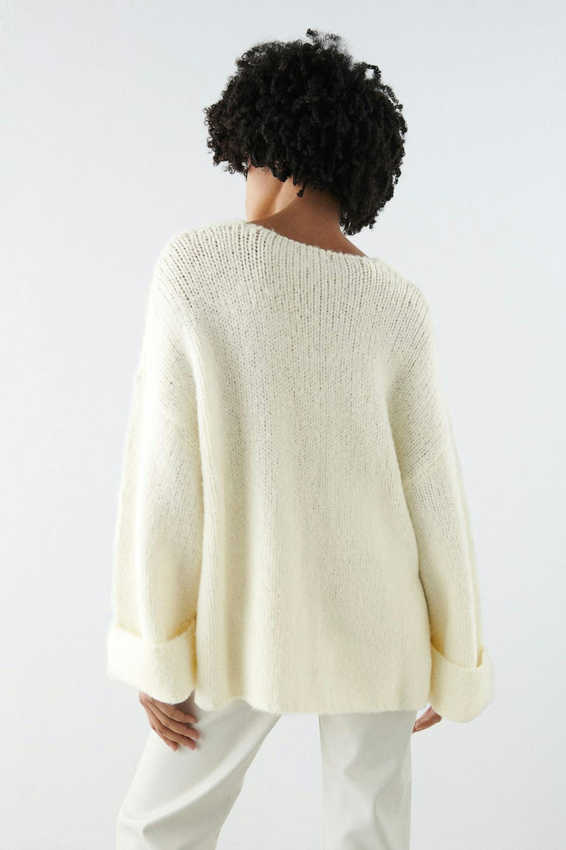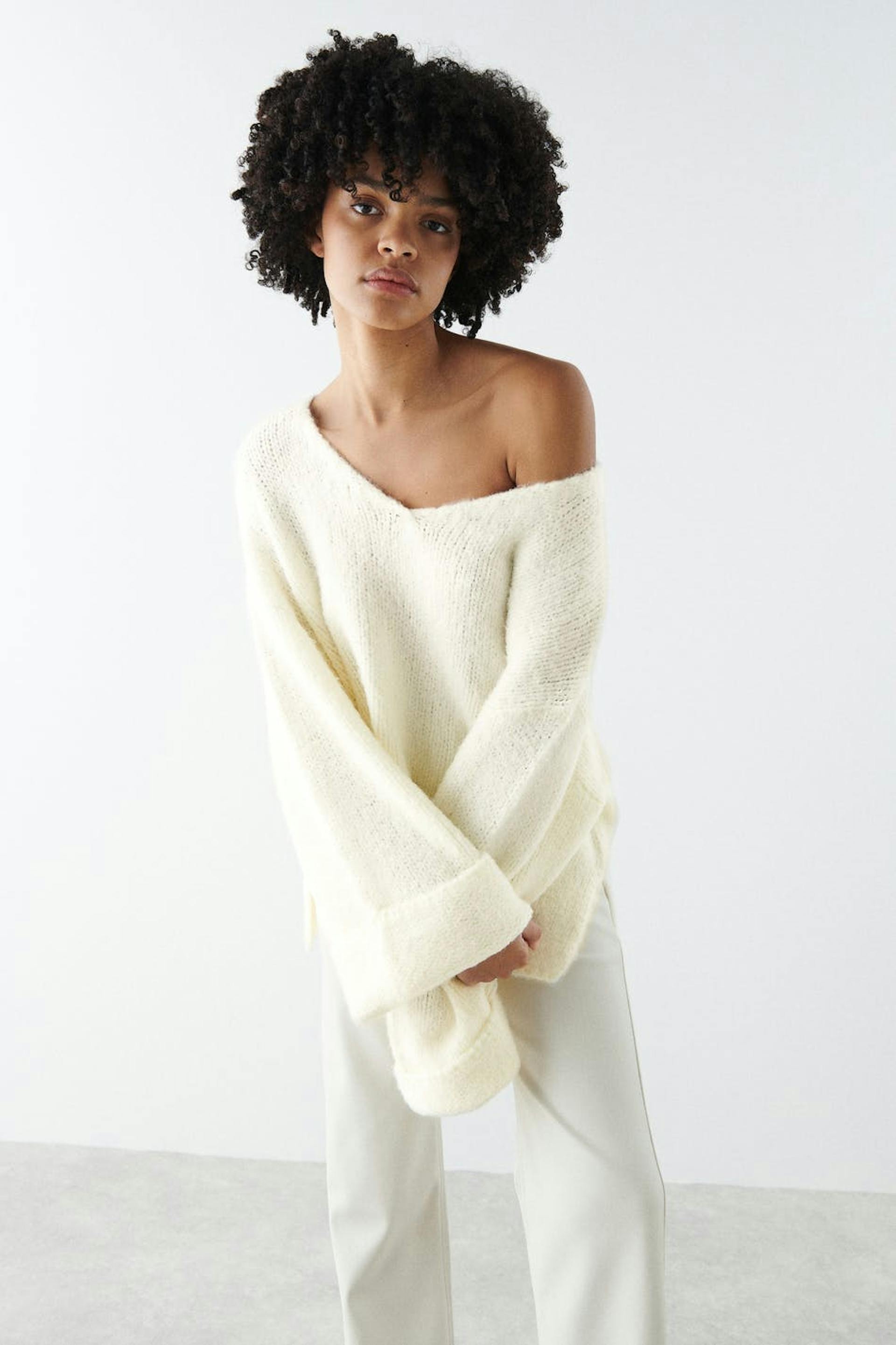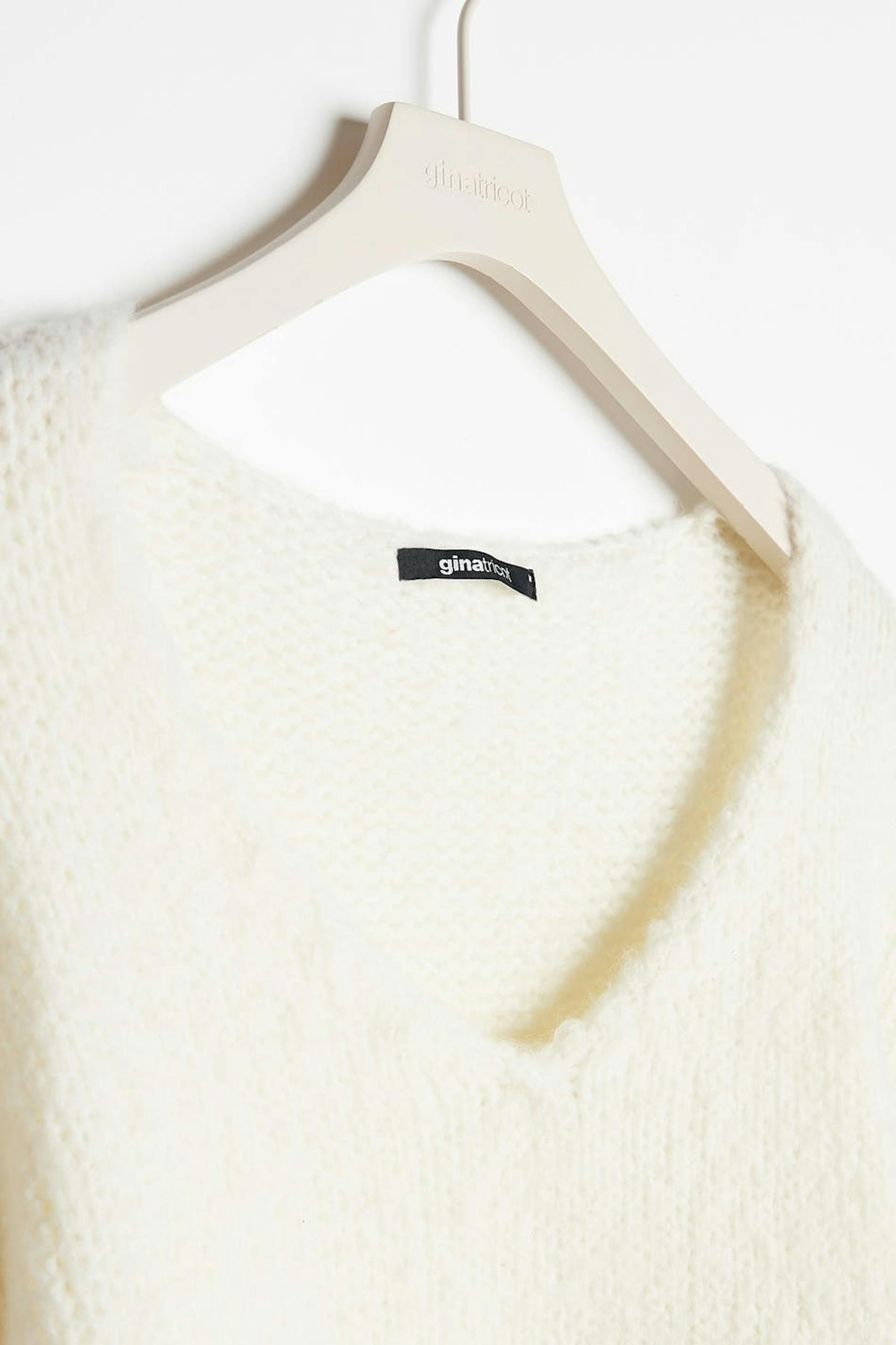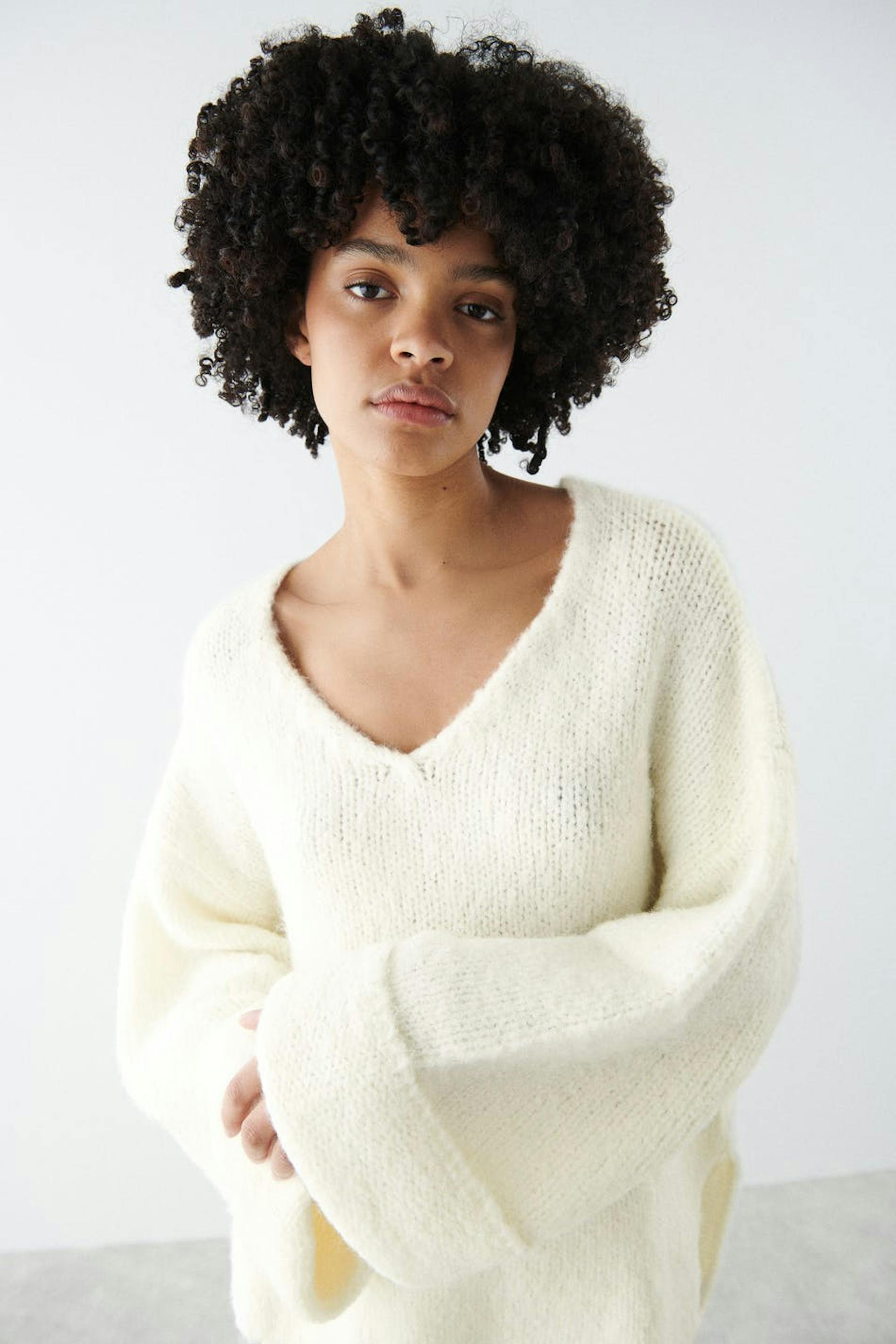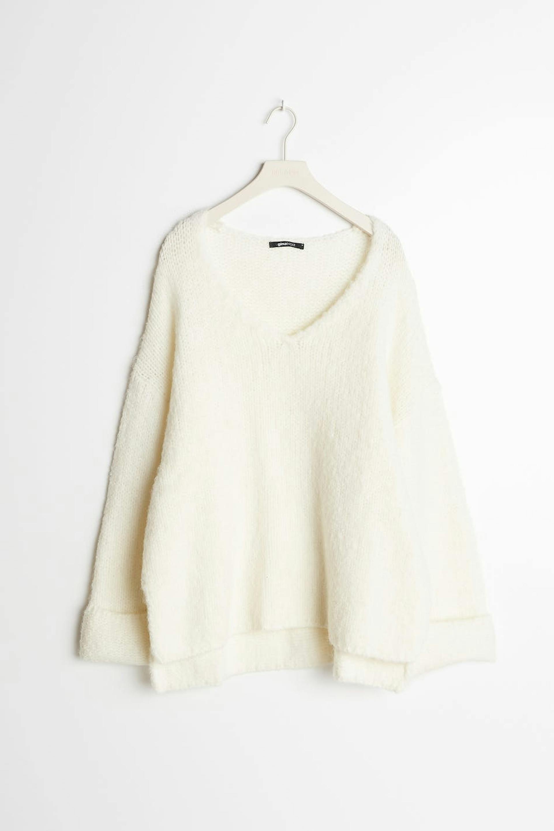 Knitted jumper with a regular fit. The jumper is white and has a soft quality. It has a V-neck and long sleeves.