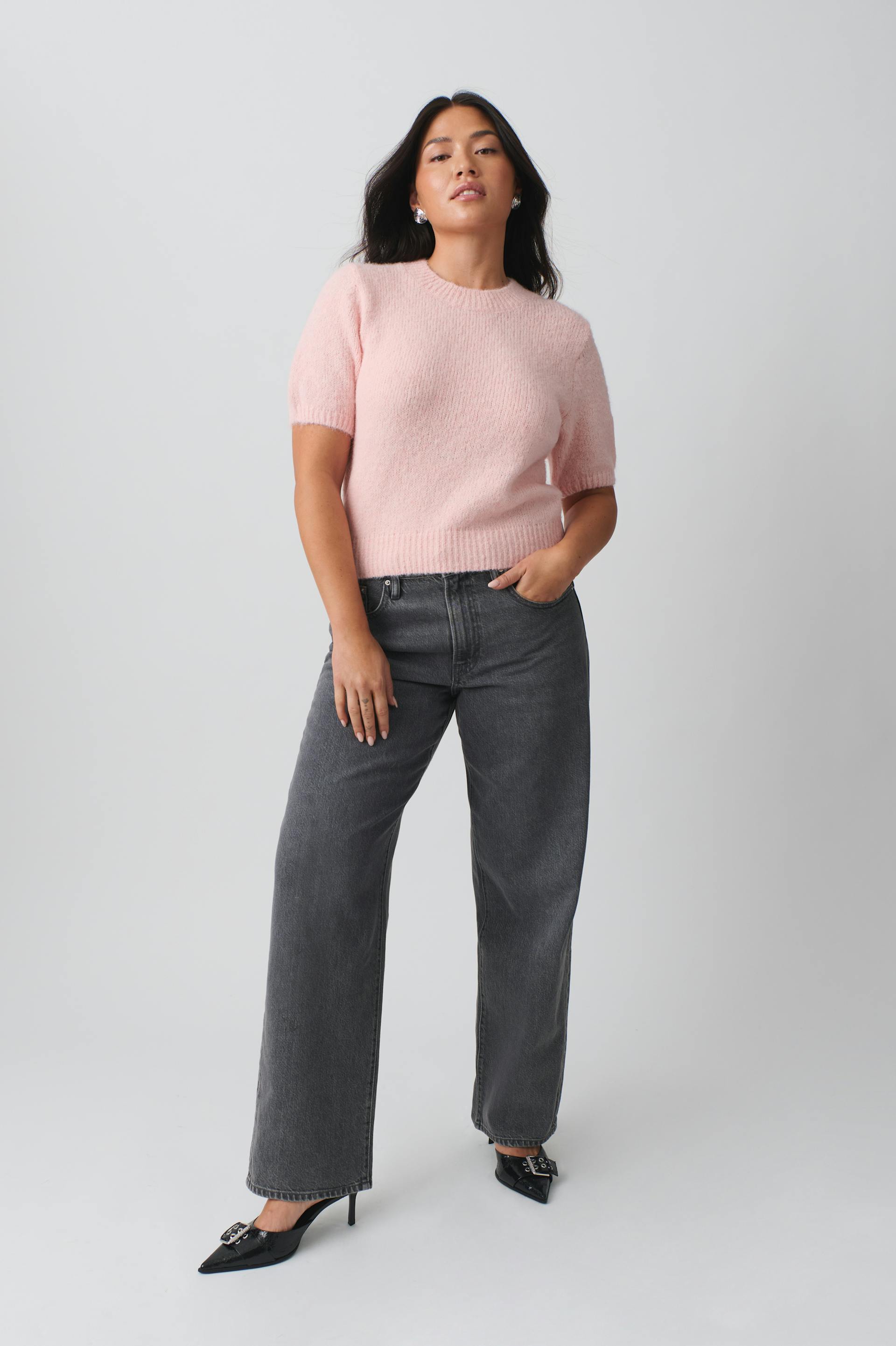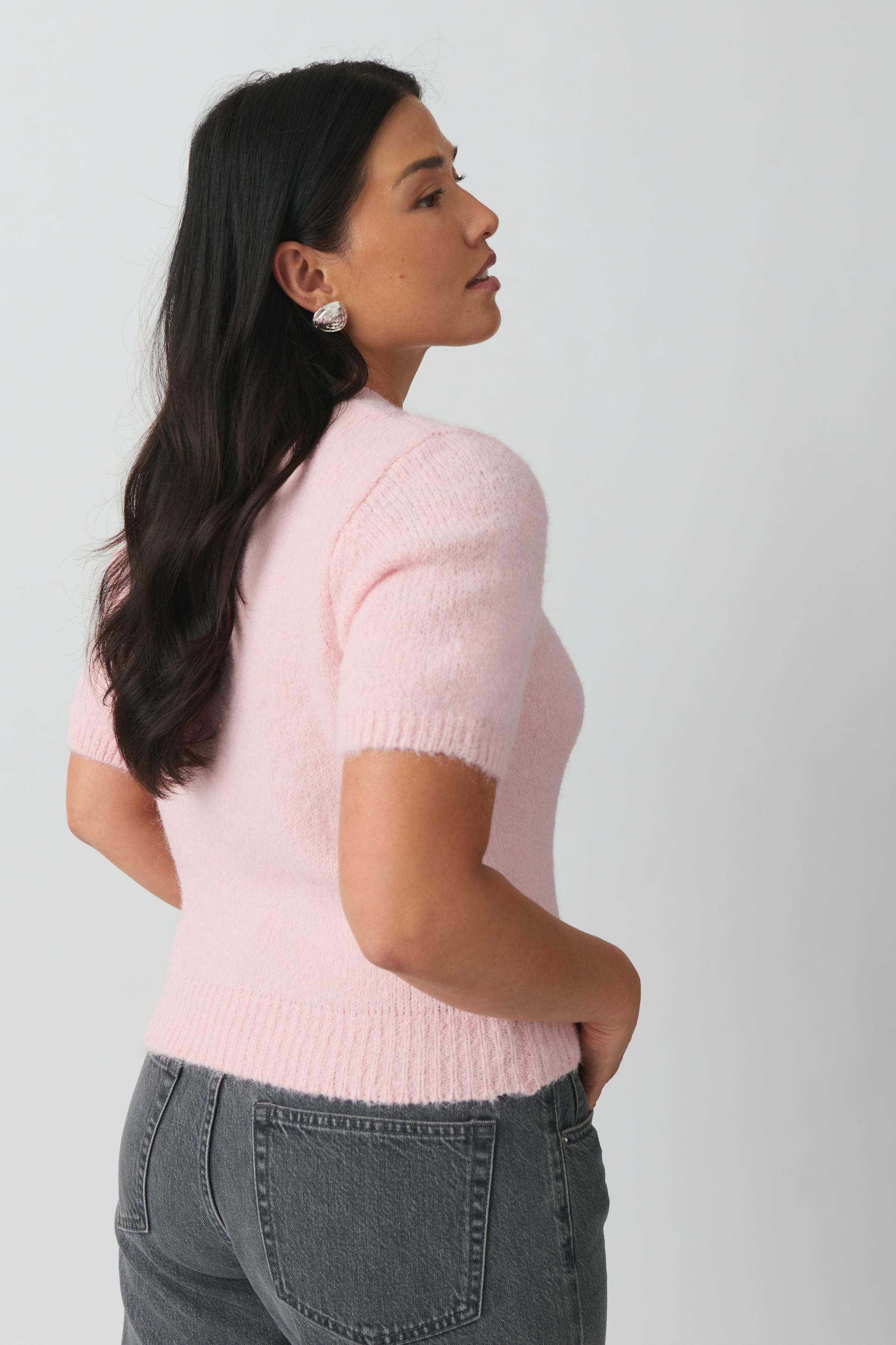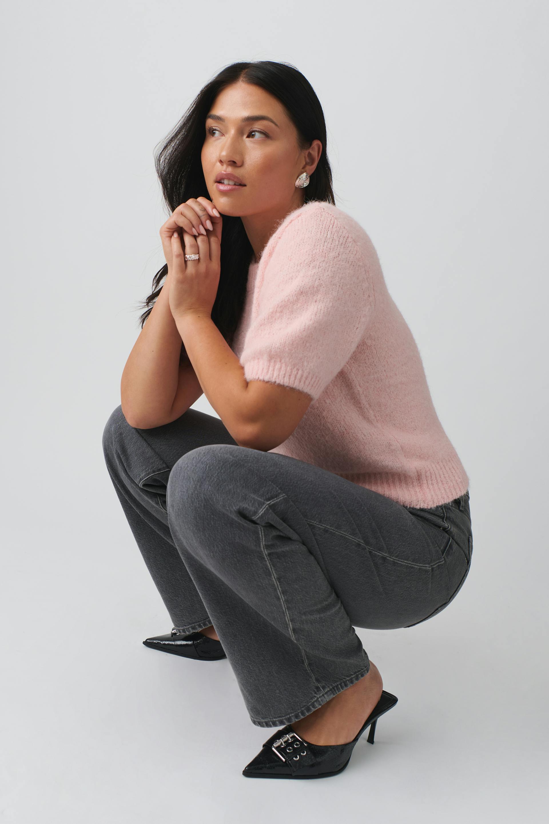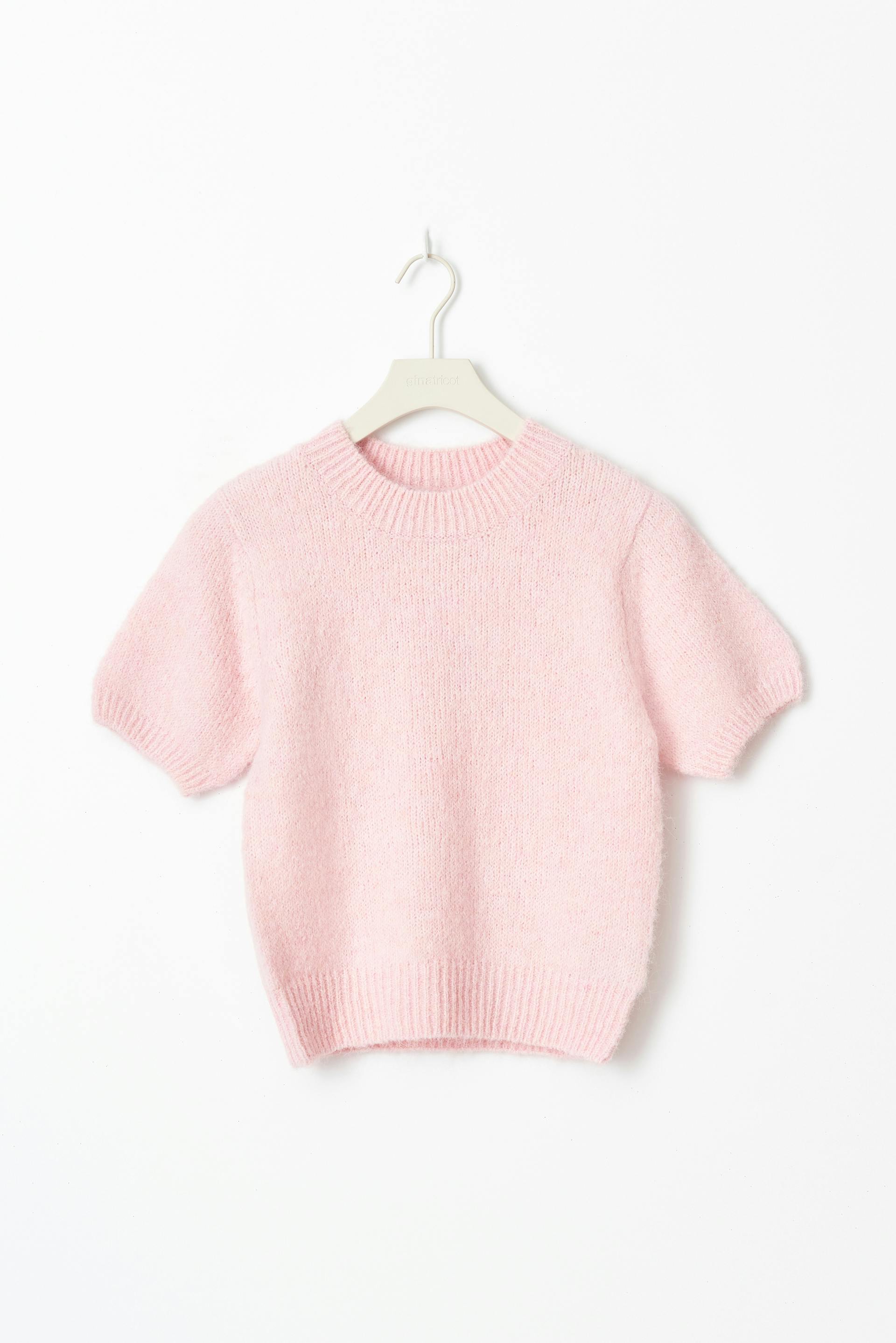 Short-sleeved knitted sweater with regular fit. The sweat is pink and has round neckline. It has rib knit at sleeve ends and at the bottom.