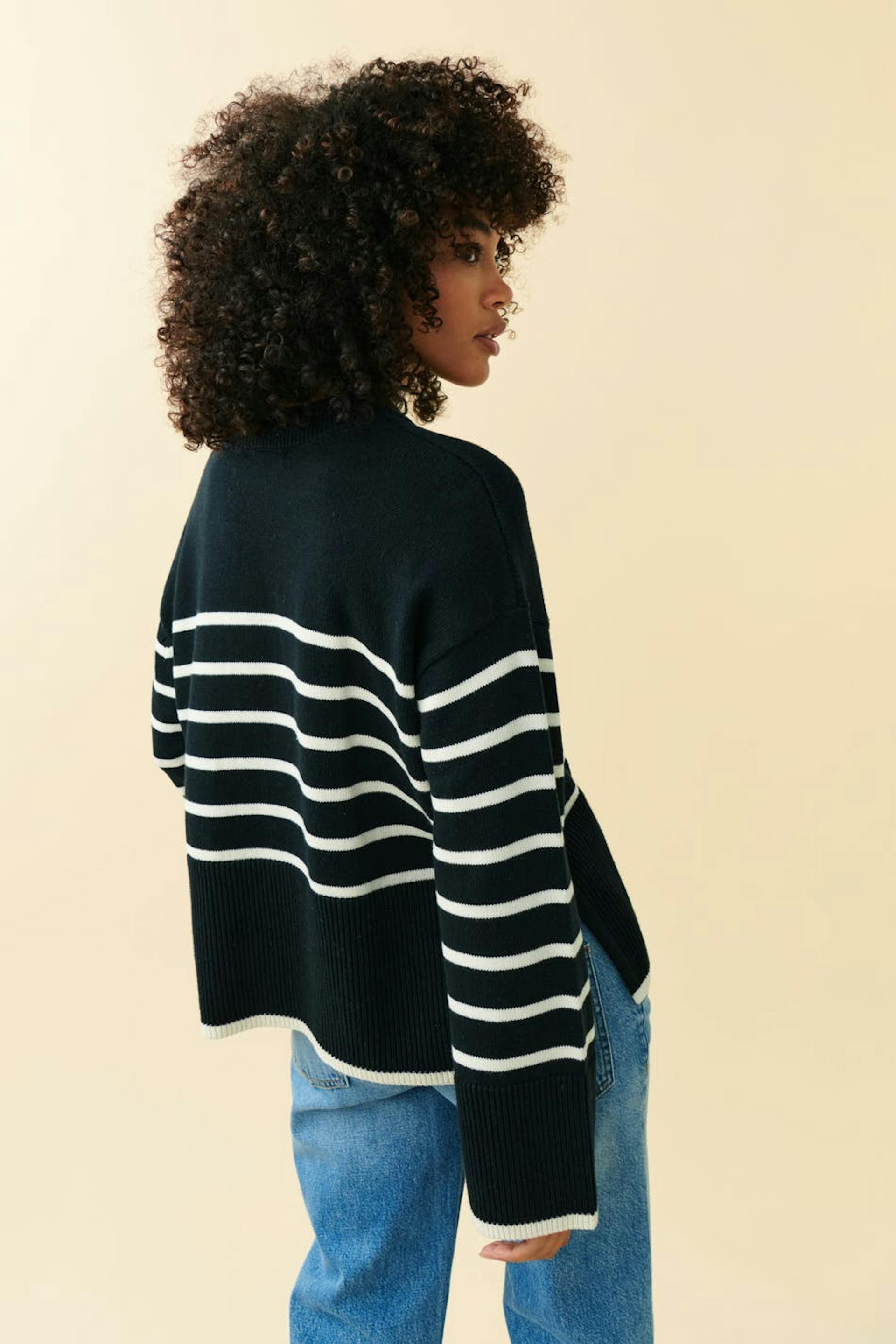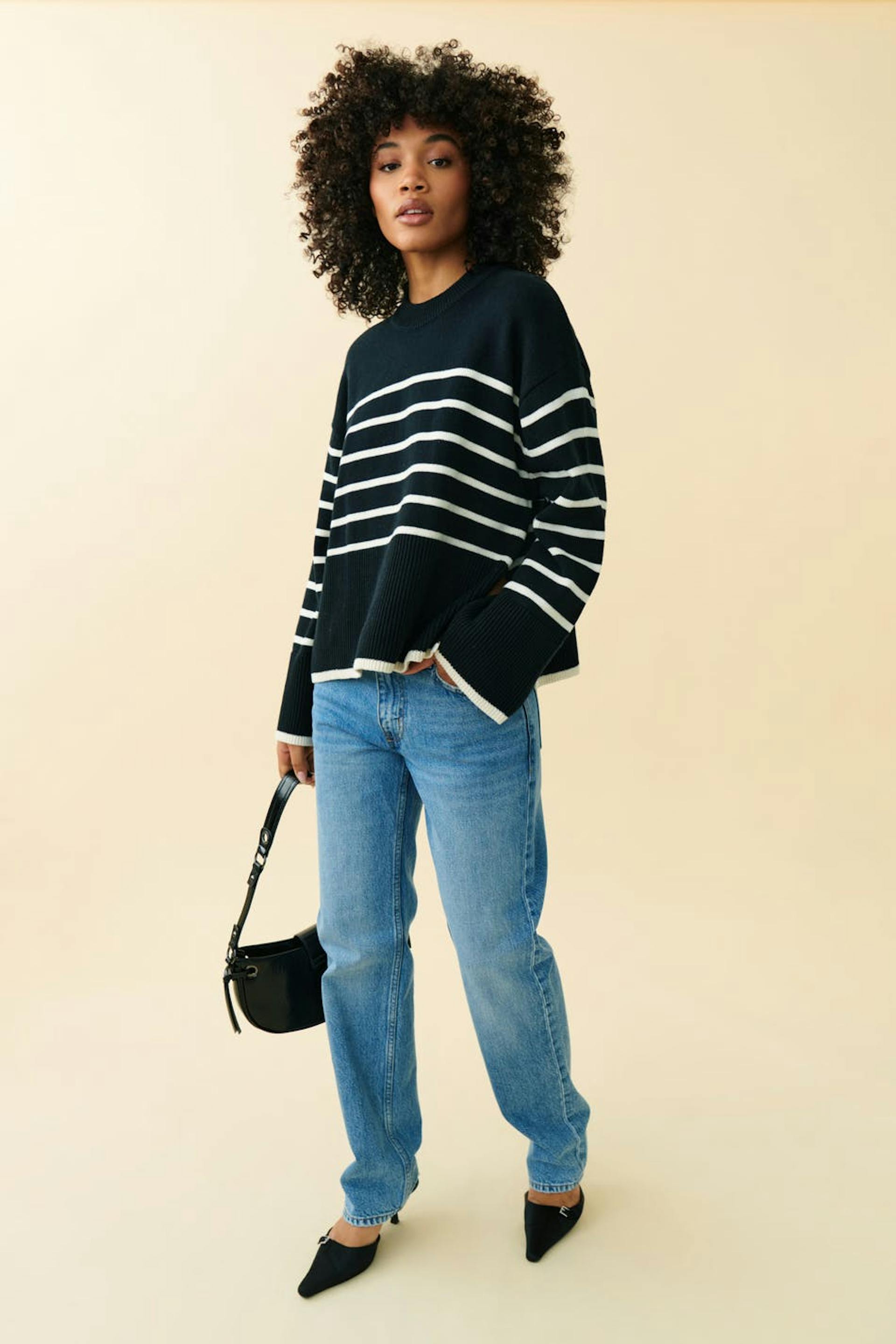 Striped knitted sweater with slit in the sides. The sweat is black and has round neckline. It has straight sleeves and wide ribbing at the bottom.