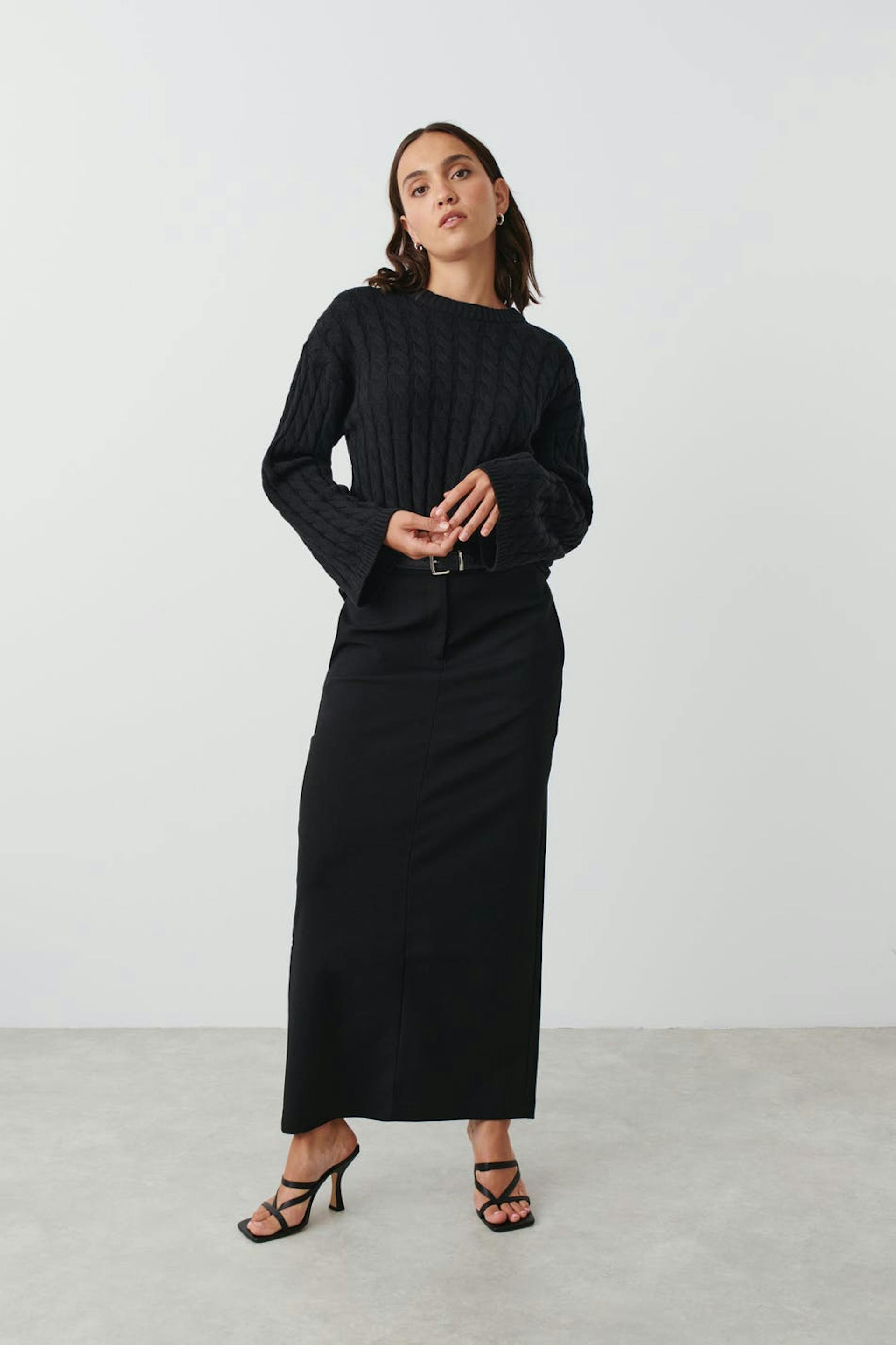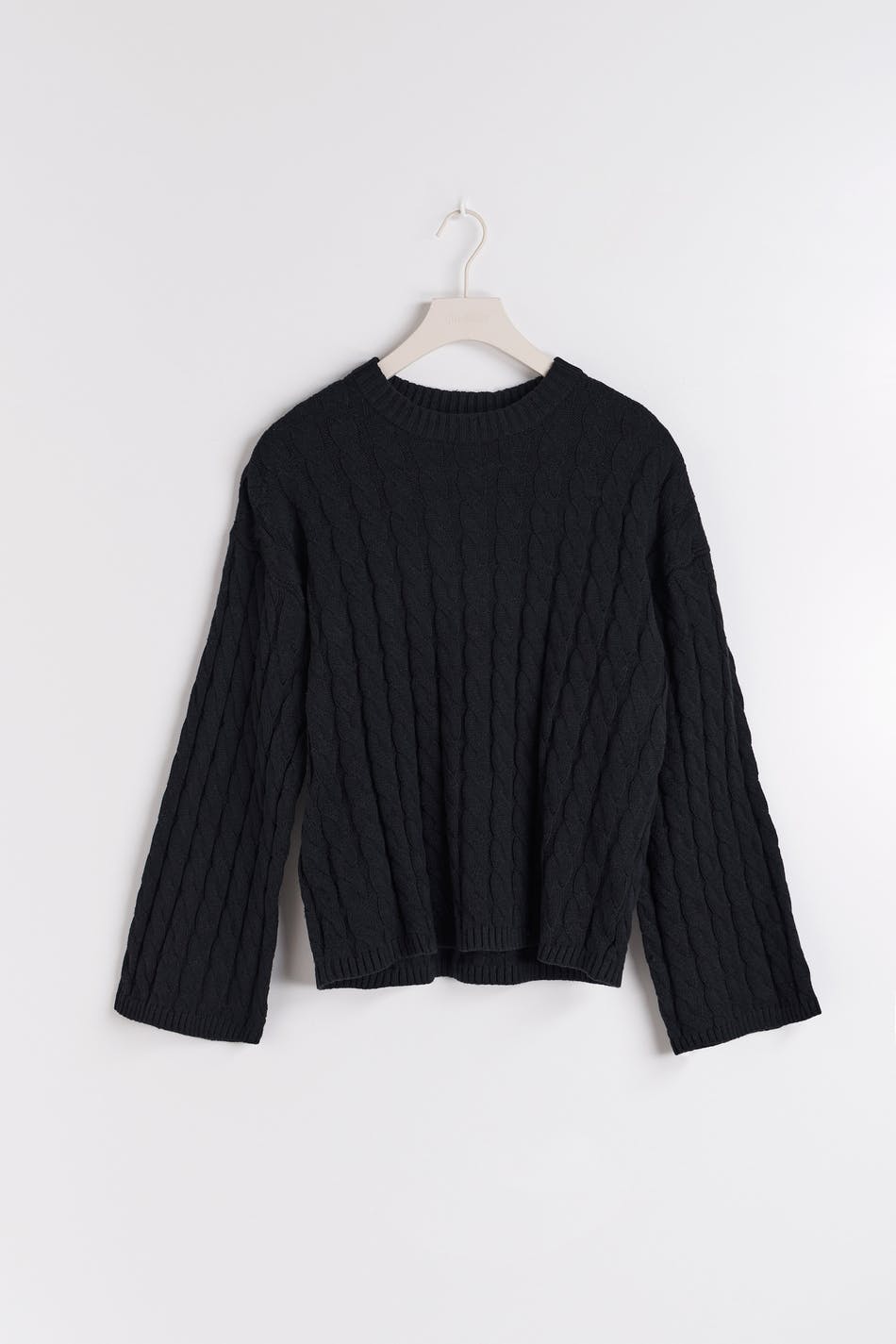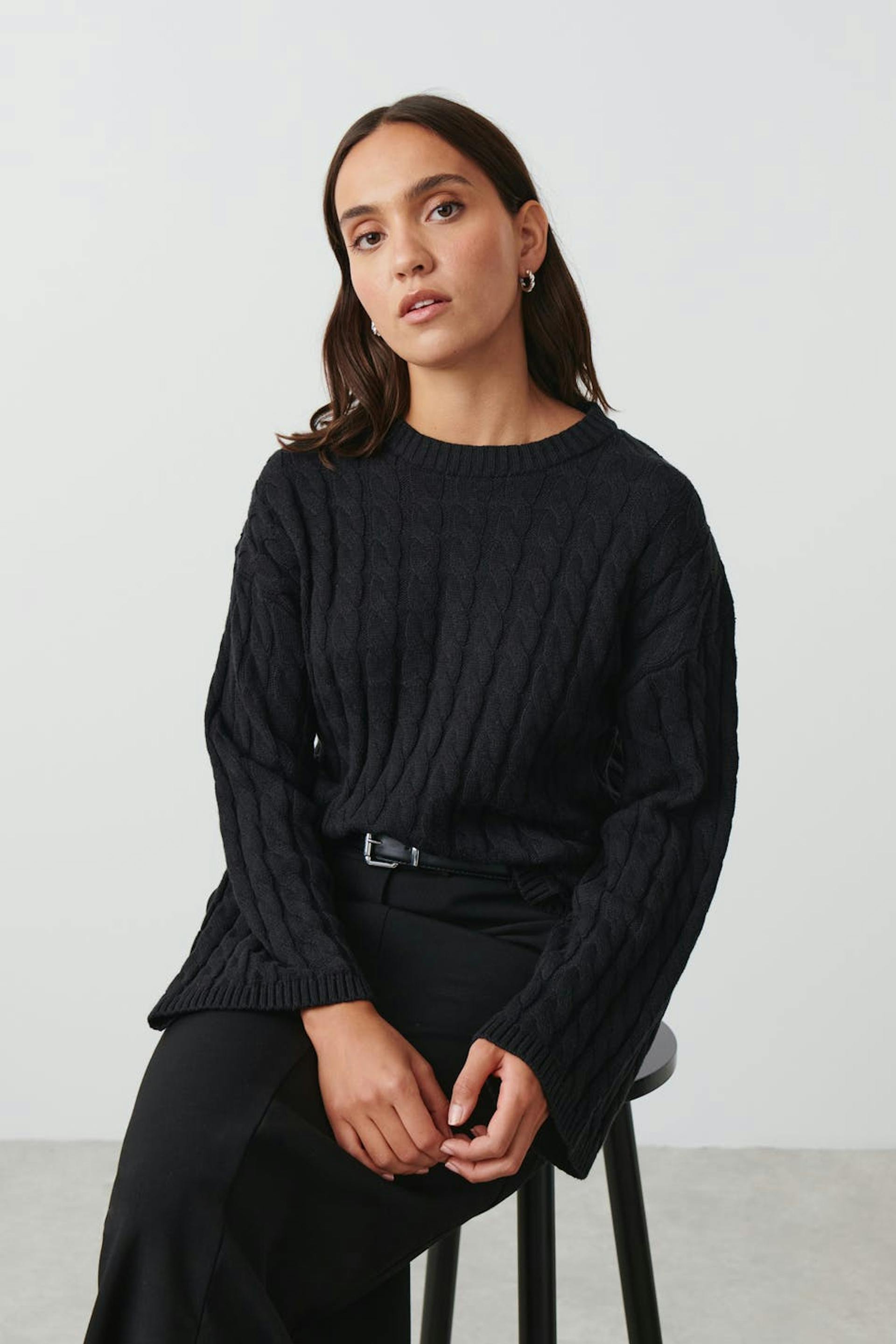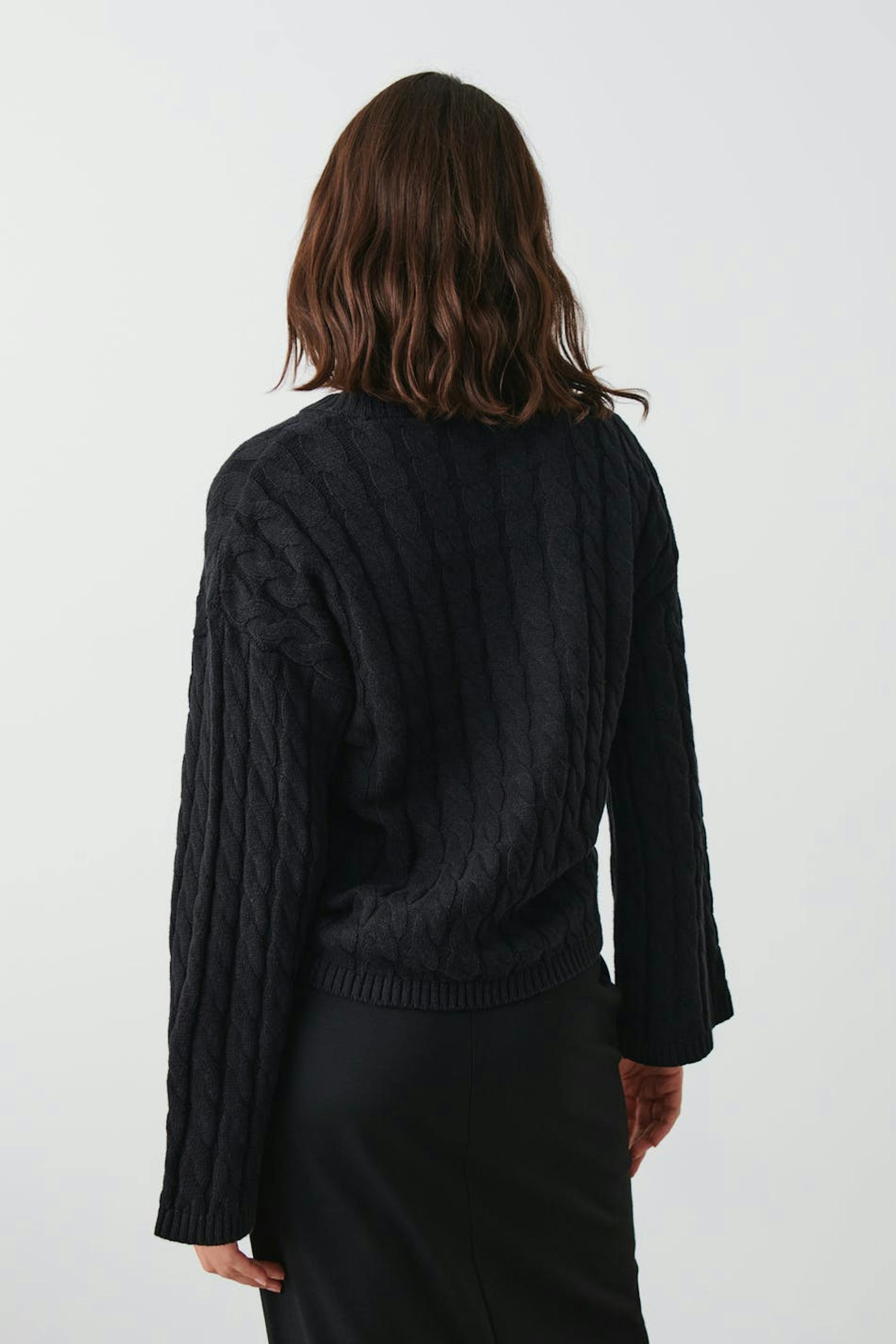 Cable-knit jumper with an oversize fit. The jumper is black and has round neckline.
