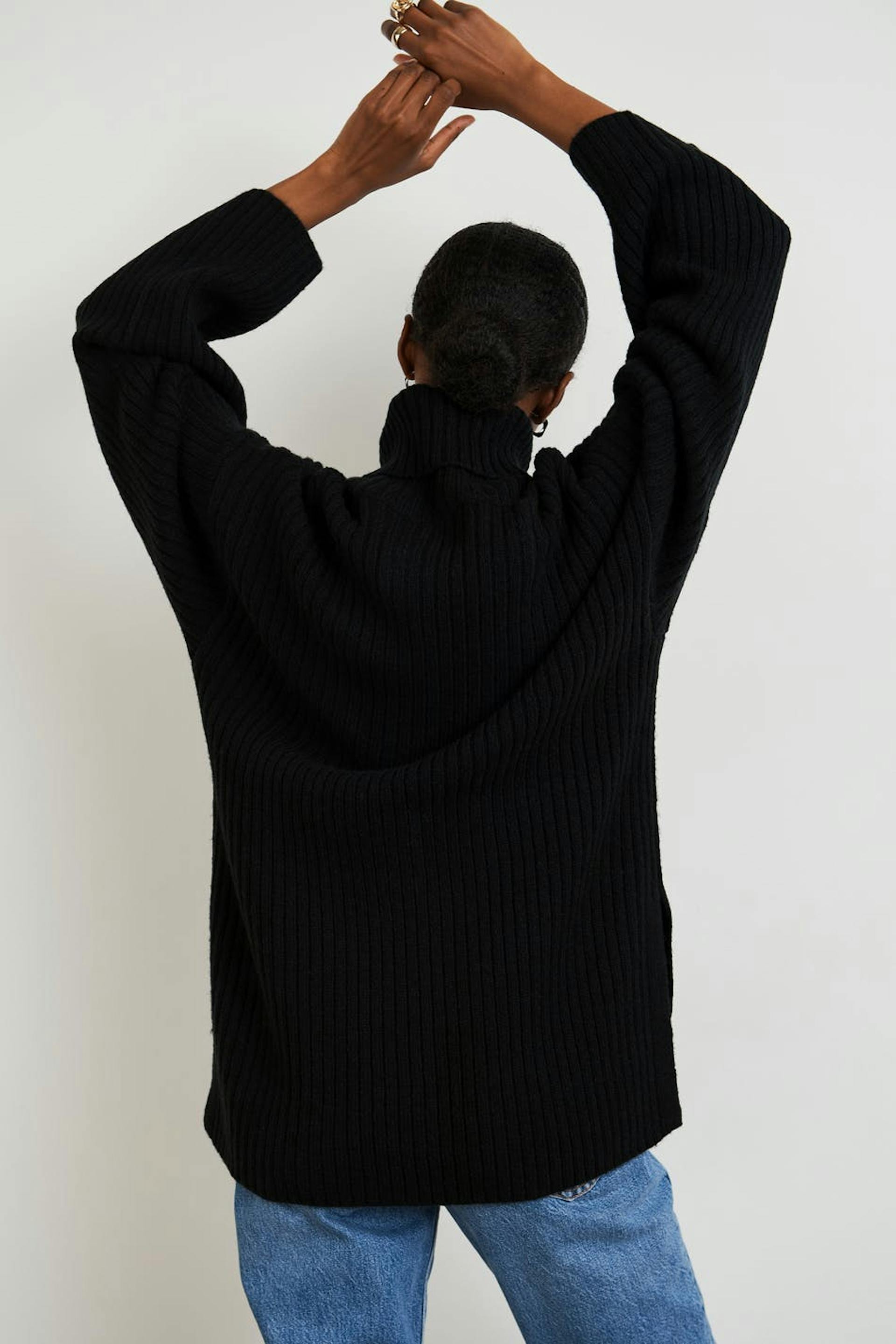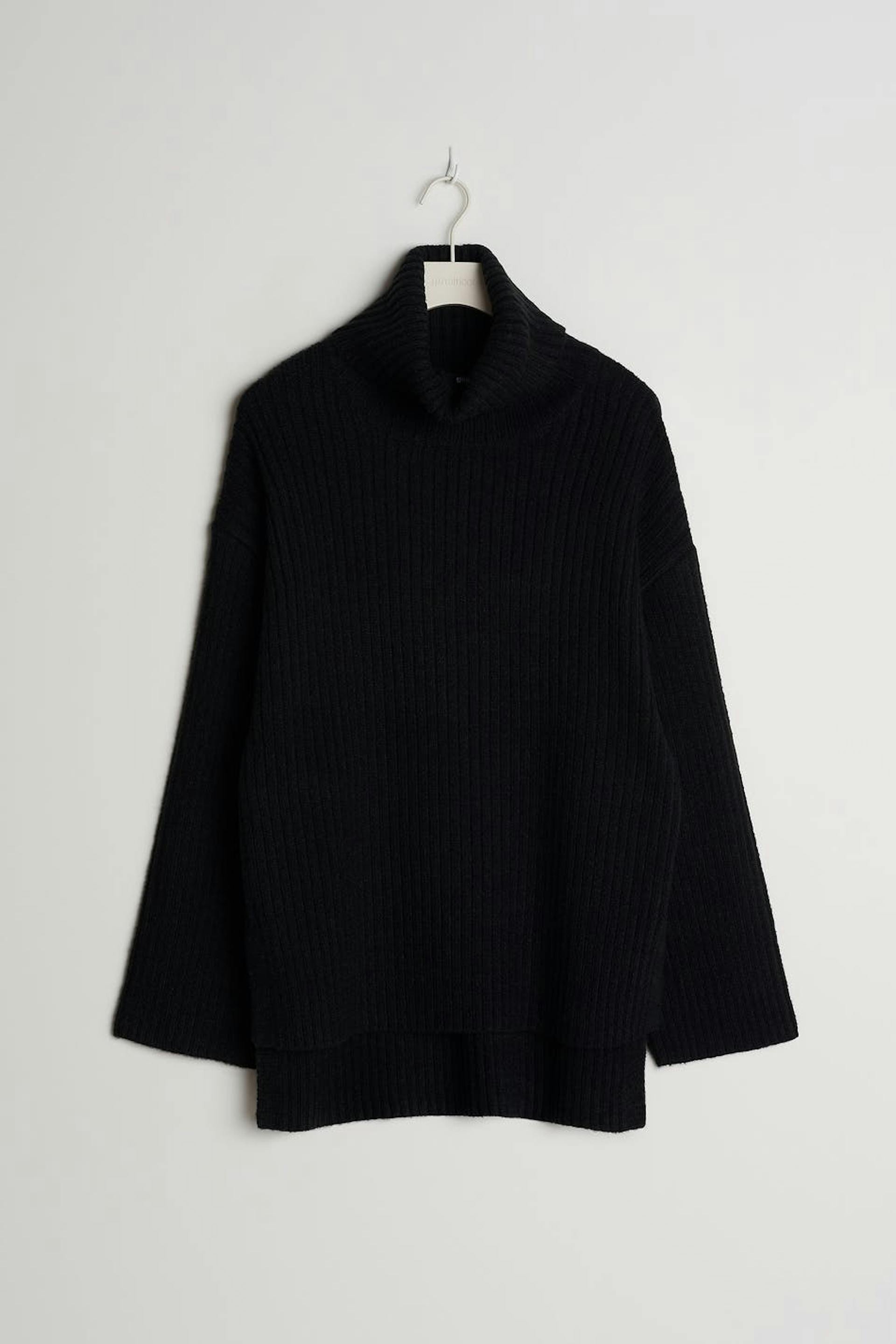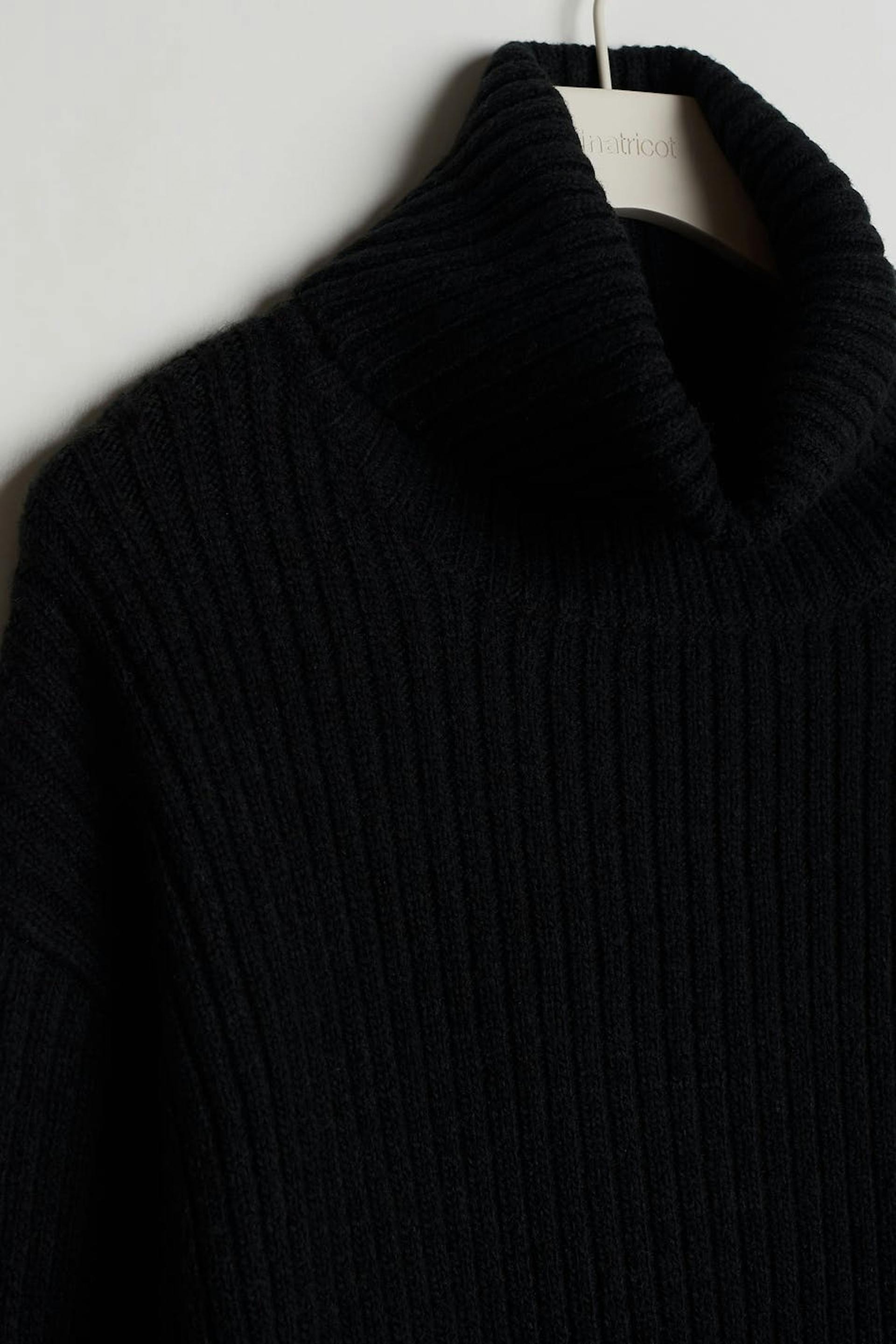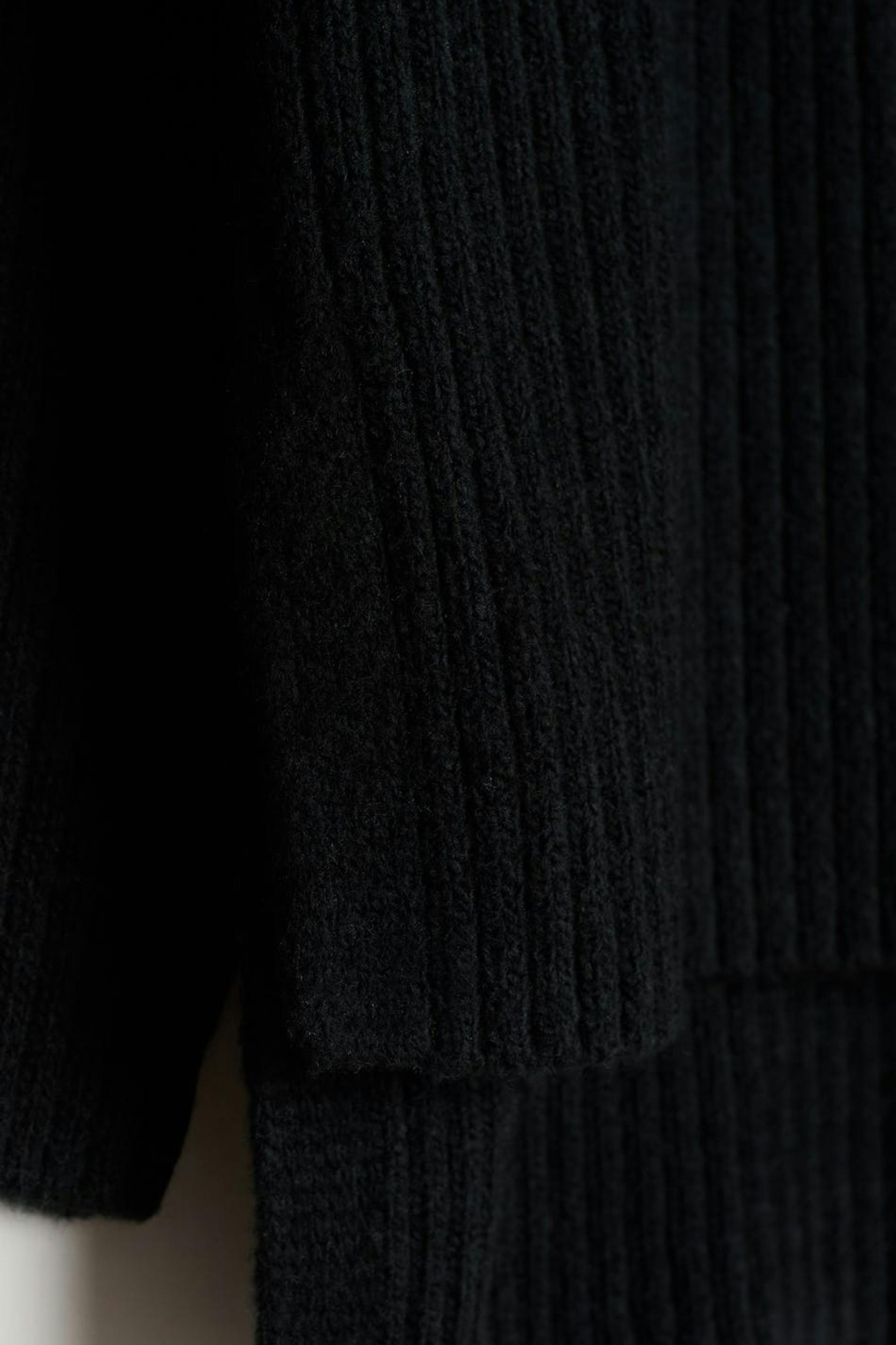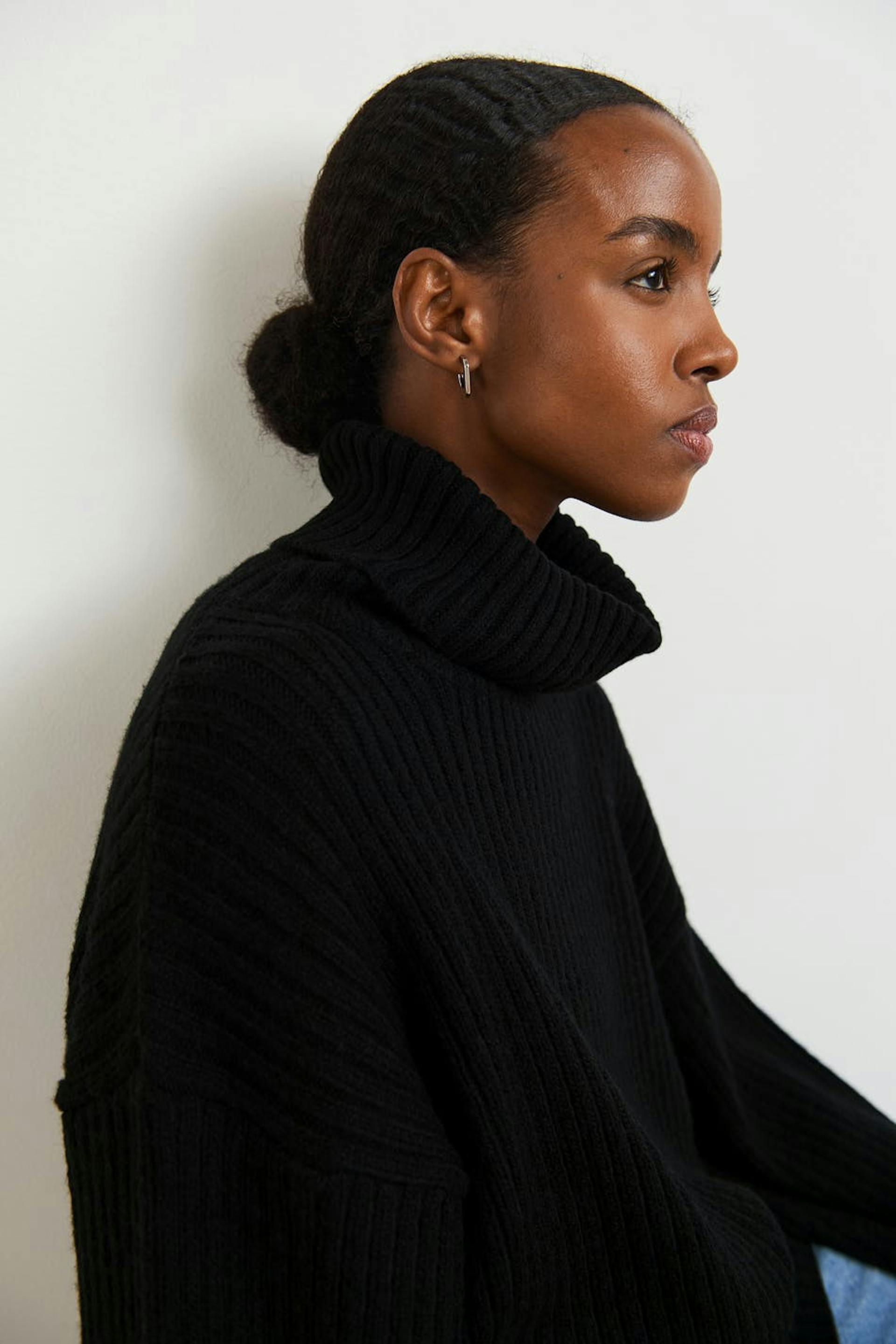 Knitted jumper with a regular fit. The jumper is black, long-sleeved and slightly longer at the back. It has a turtleneck, a slit on the sides and spacious sleeves.