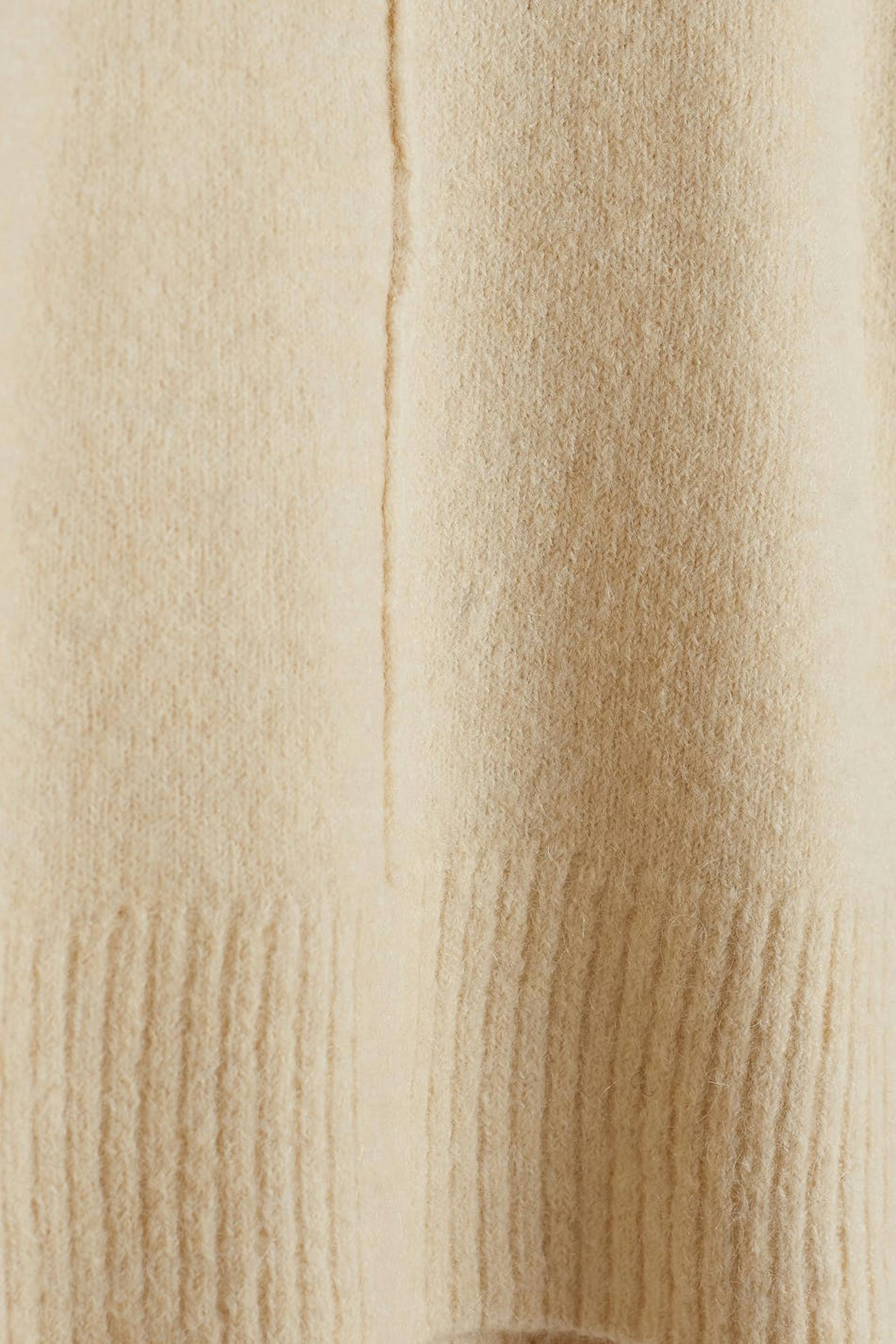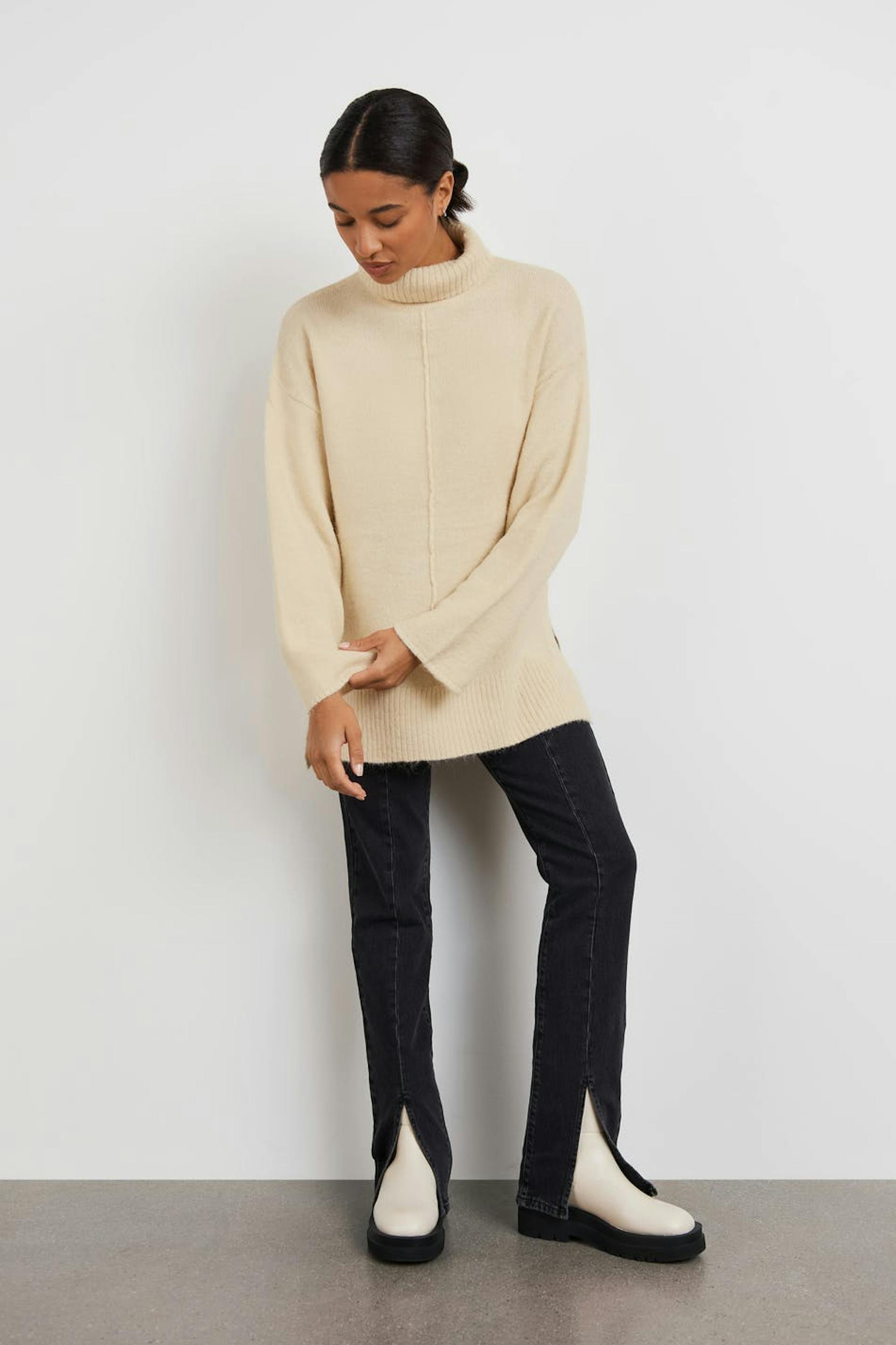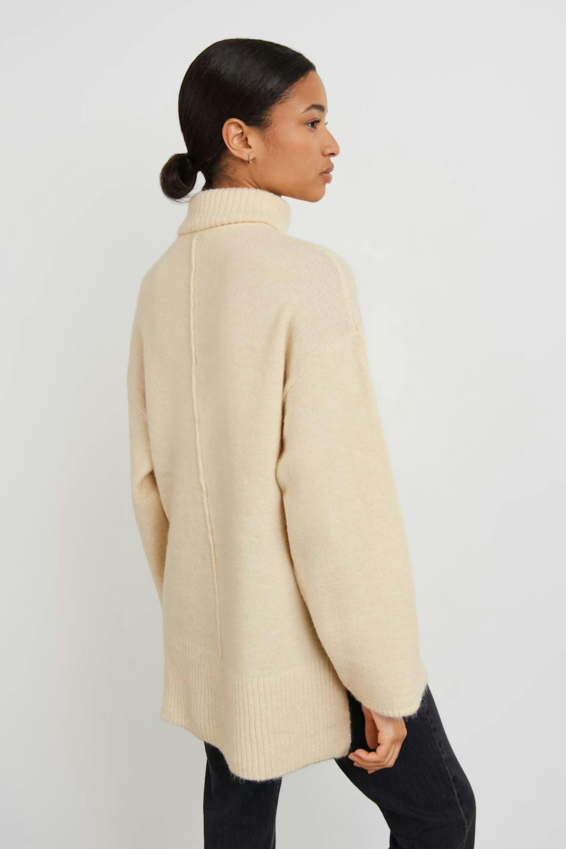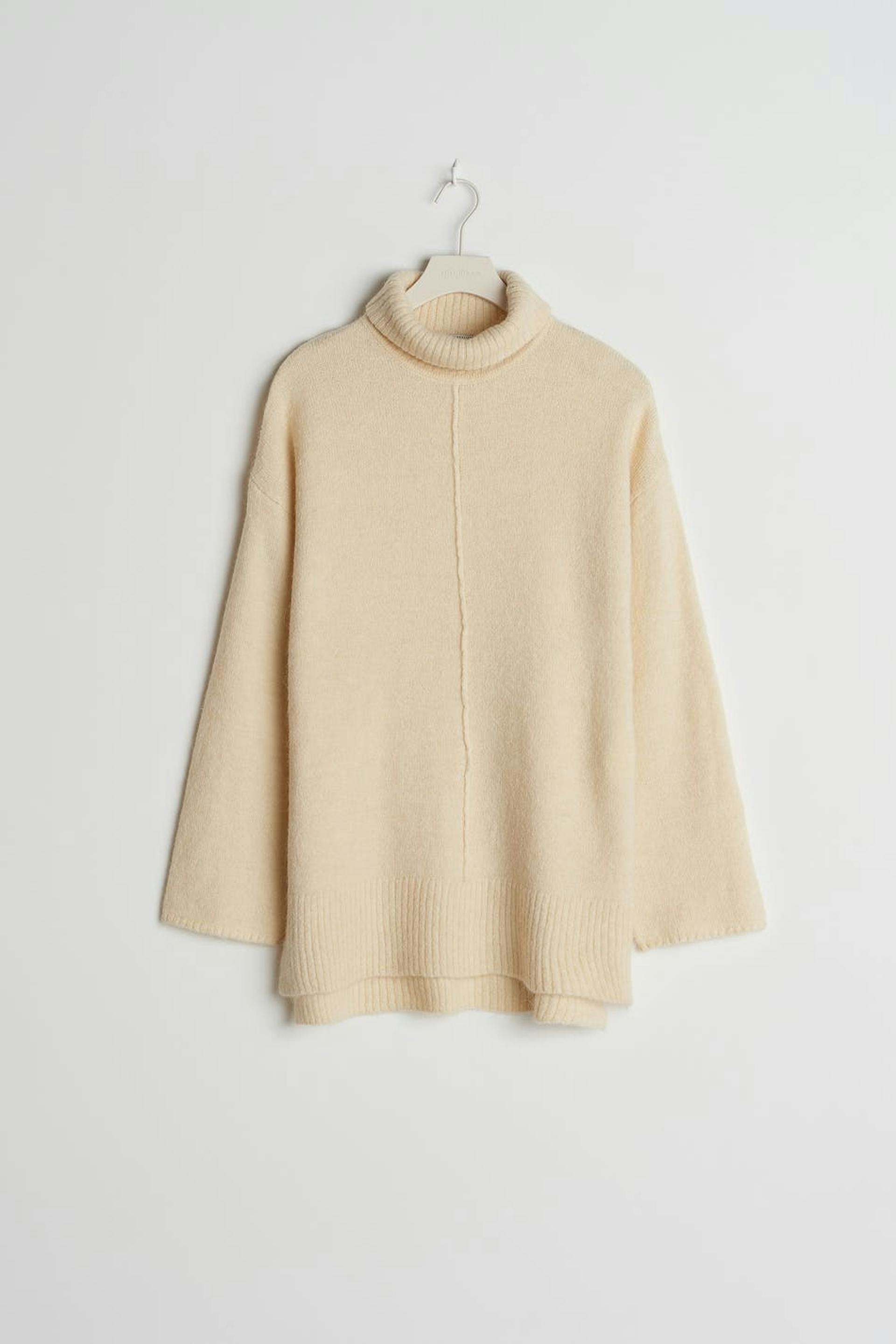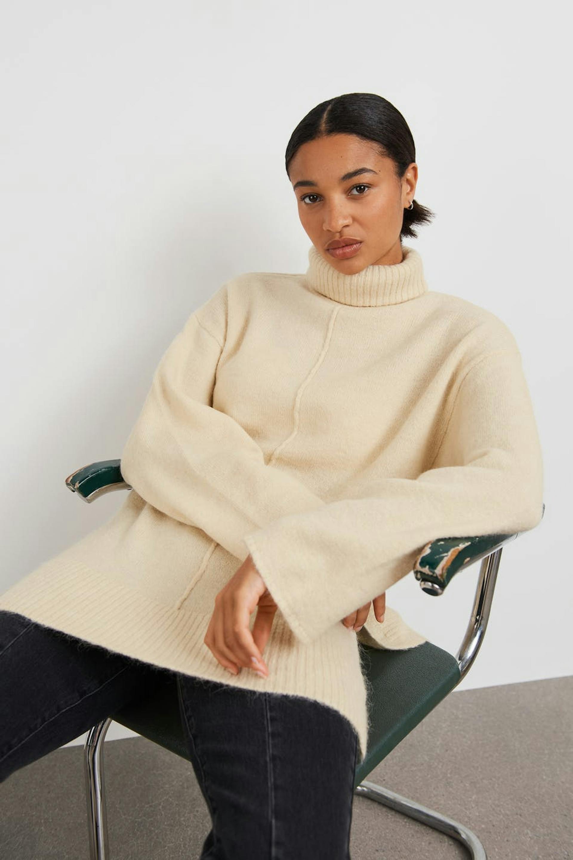 Knitted jumper with a loose fit. The jumper is beige and has a turtleneck. It has a slit on the sides, a seam detail at the front and a ribbed hem.