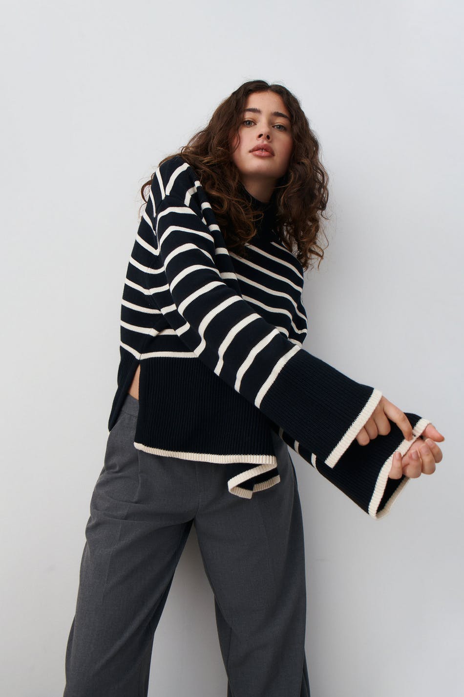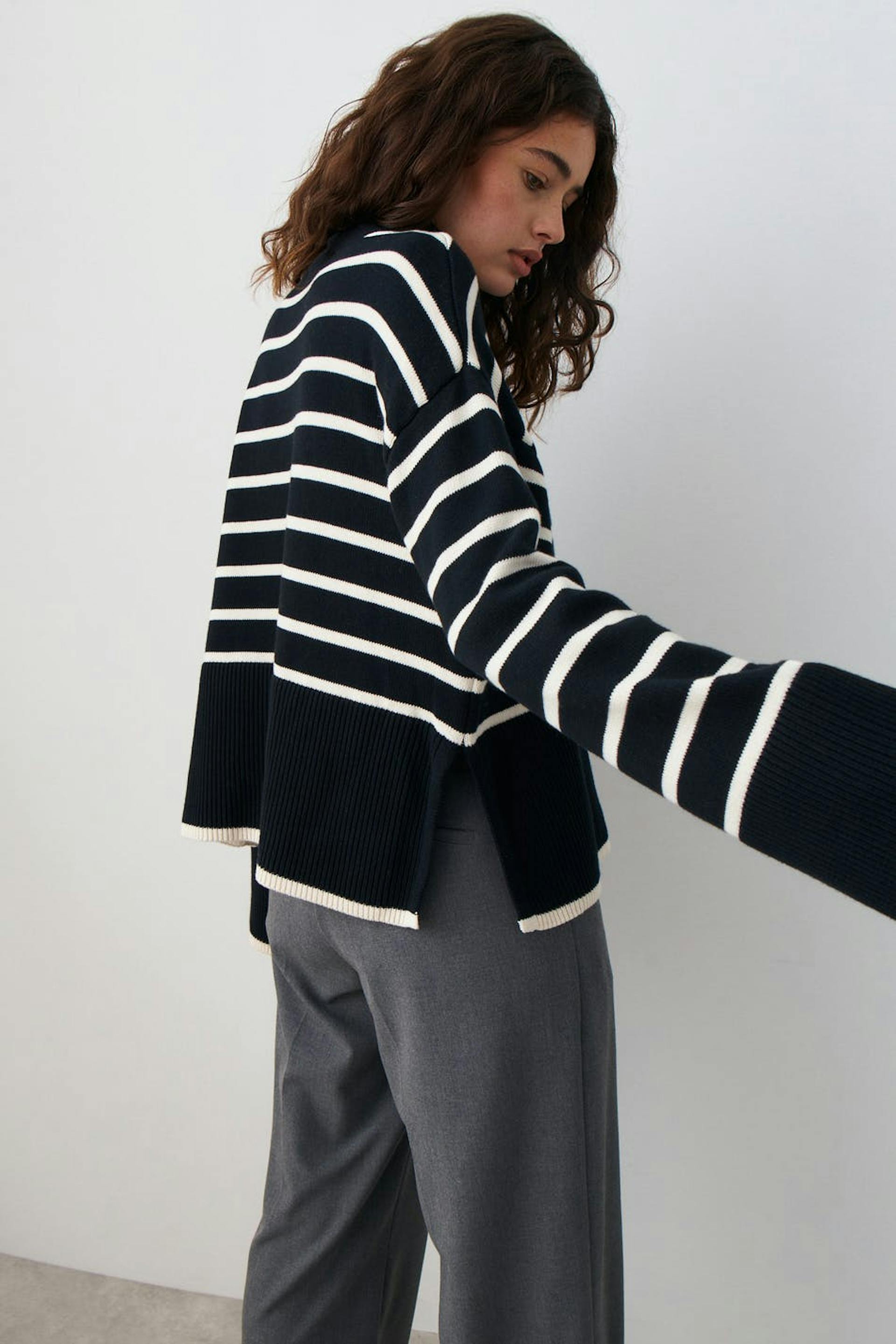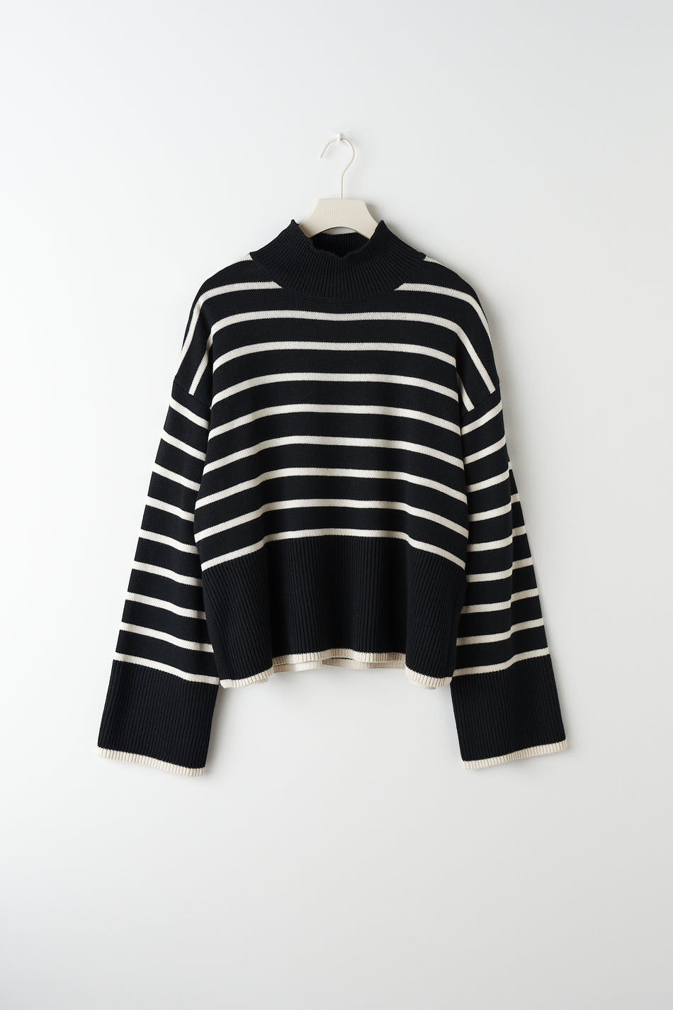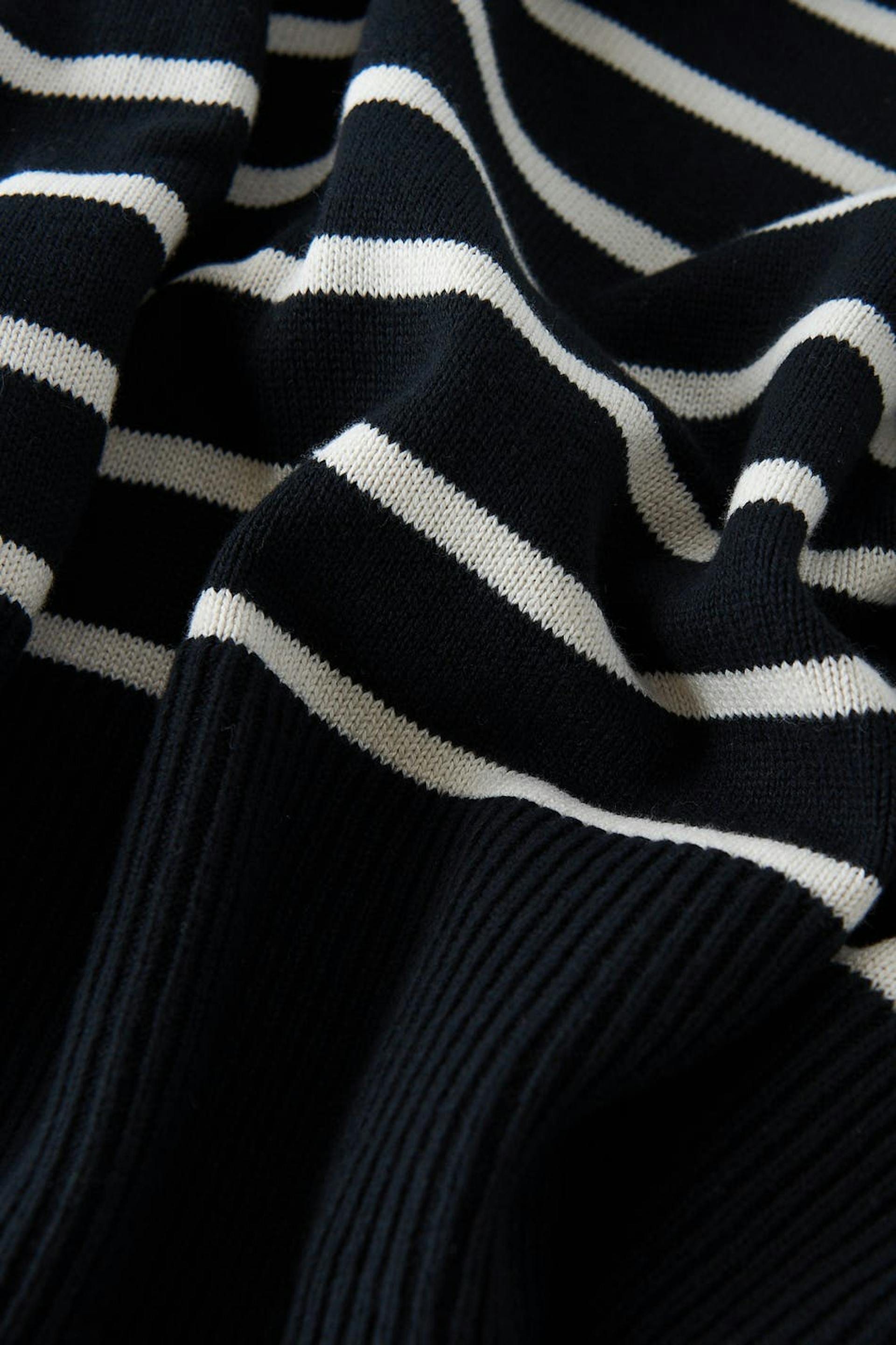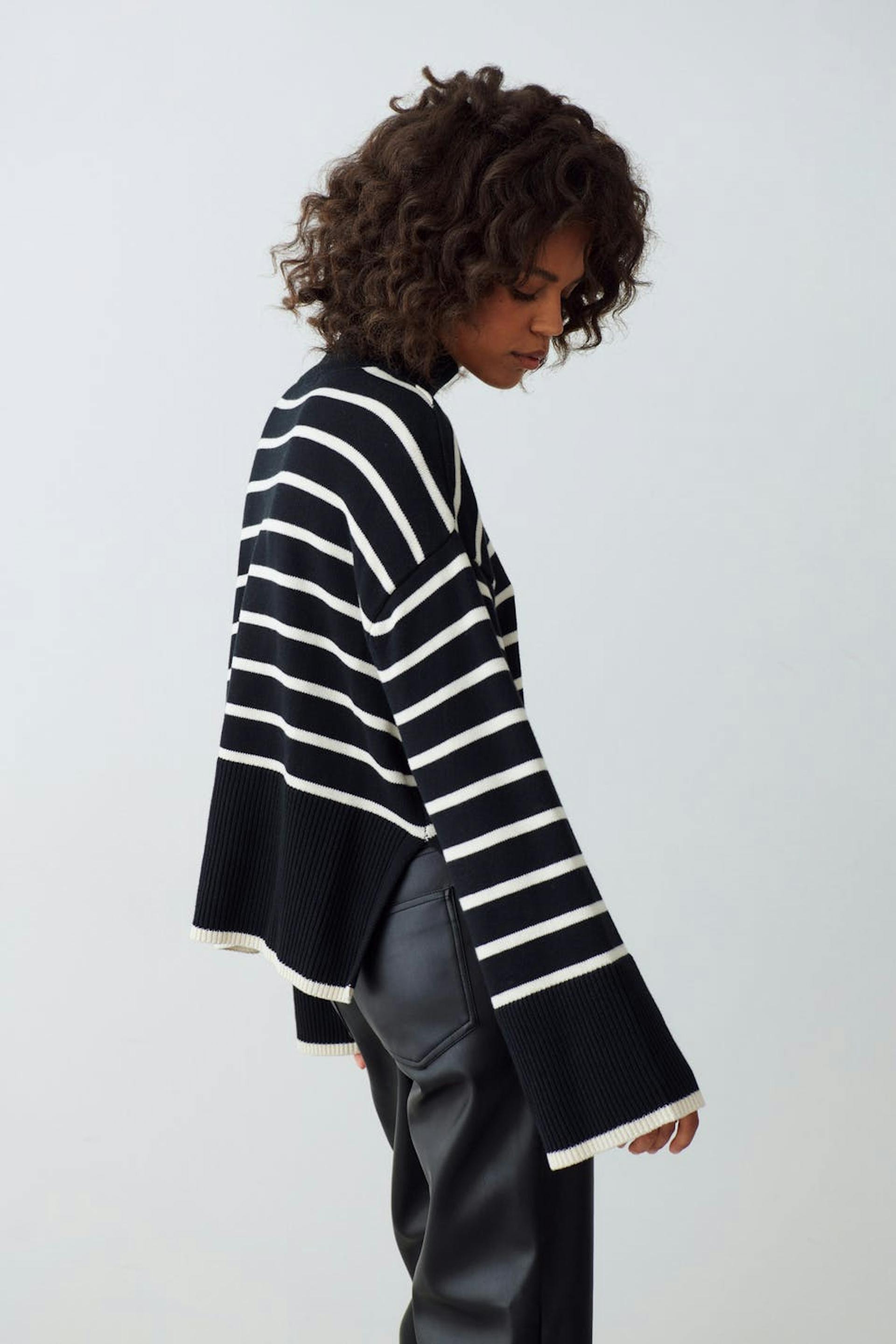 Striped knitted sweater with boxy fit. The sweat is black and has dropped shoulders. It has high neckline, slit in the sides and ribbed hem.