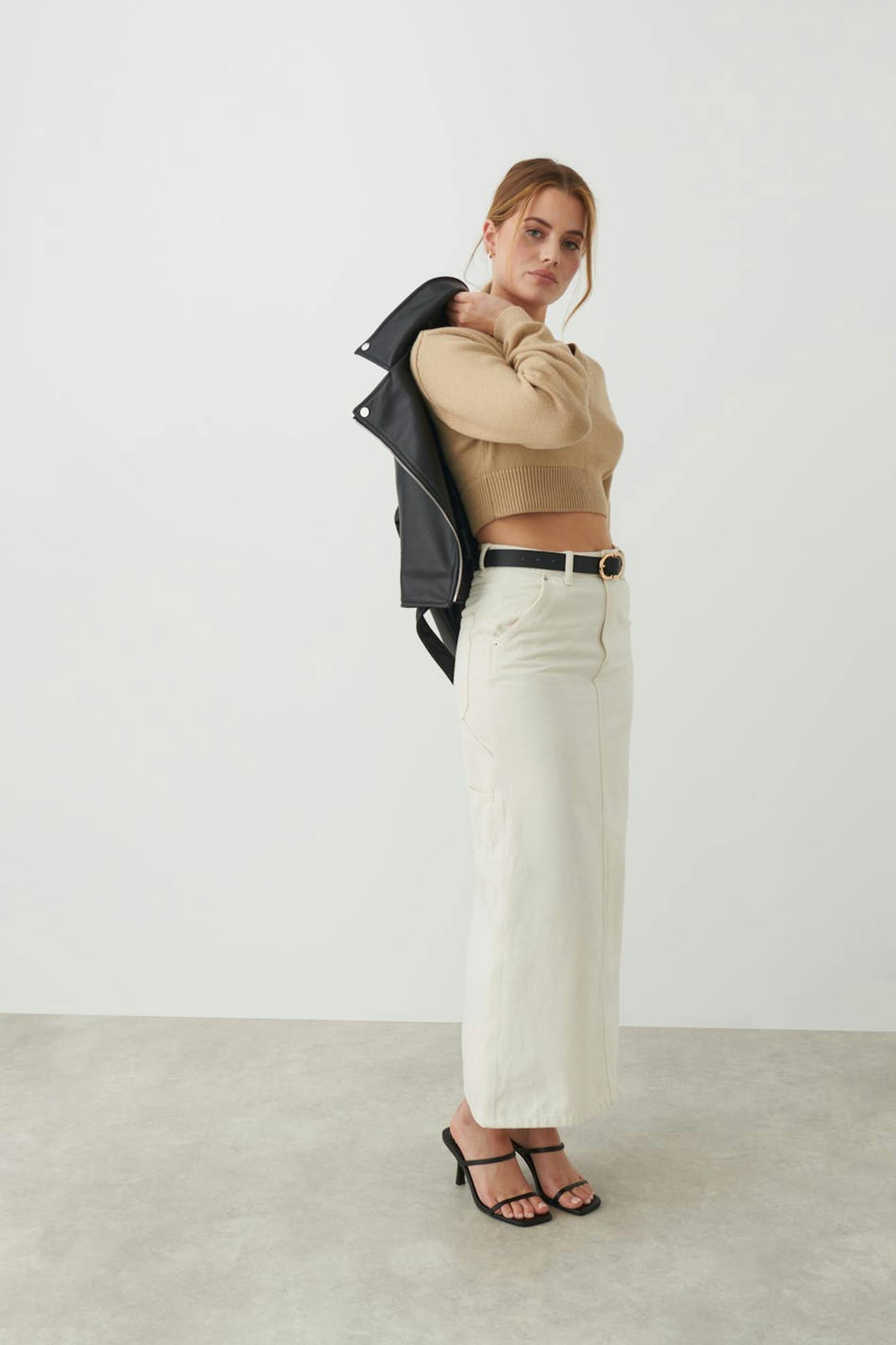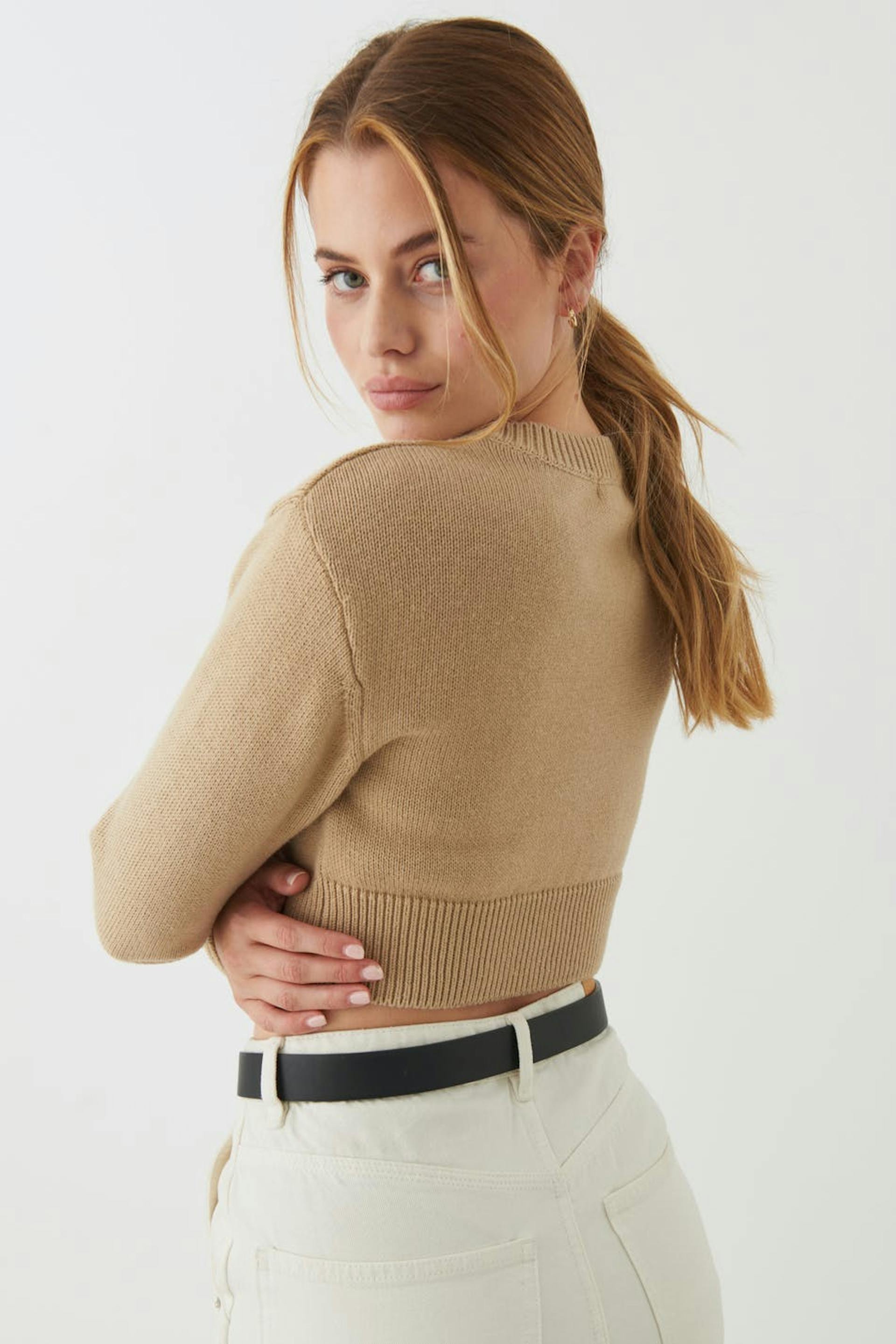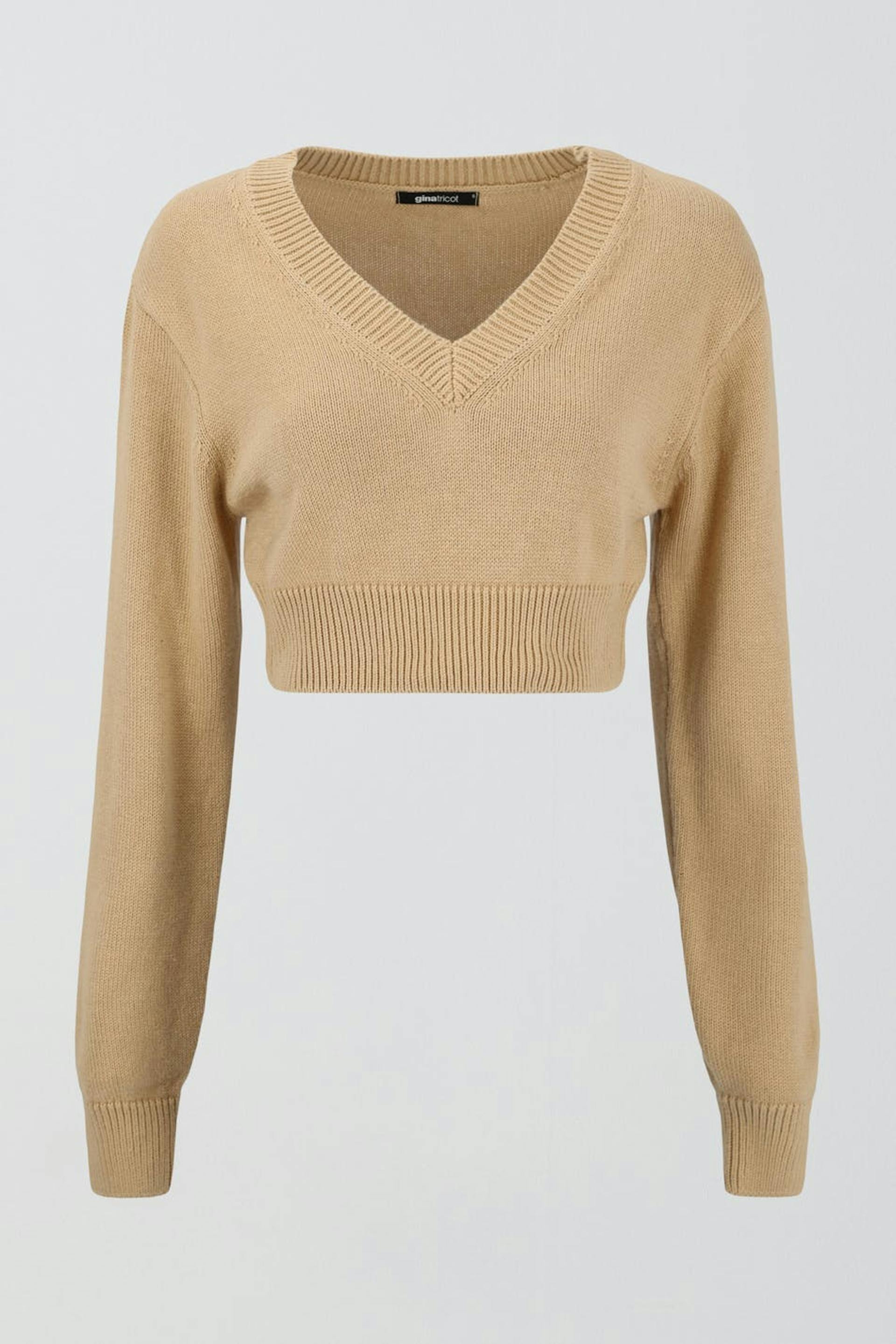 Cropped knitted sweater with V-neck. The sweat is beige and has normal fit. It has long sleeve and ribbing on the neckline and at the bottom.