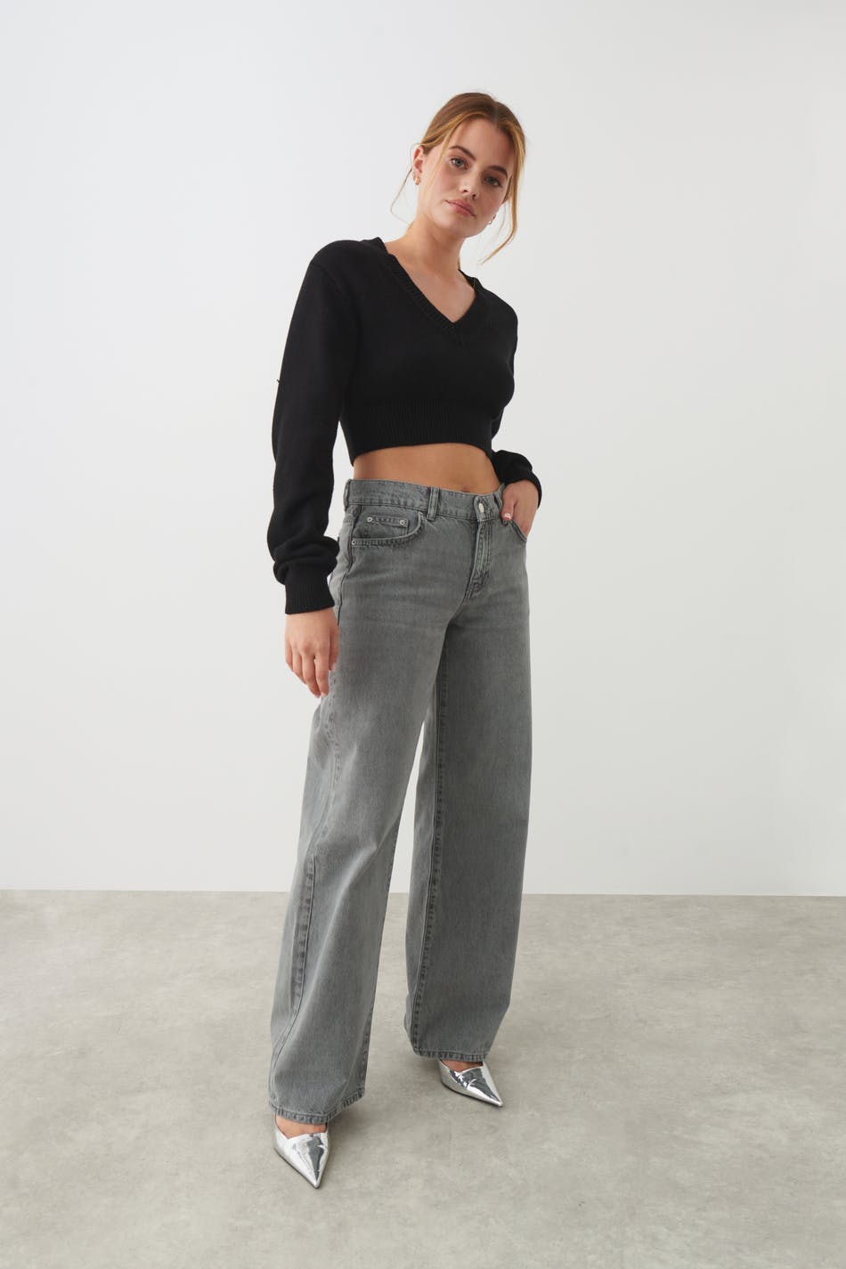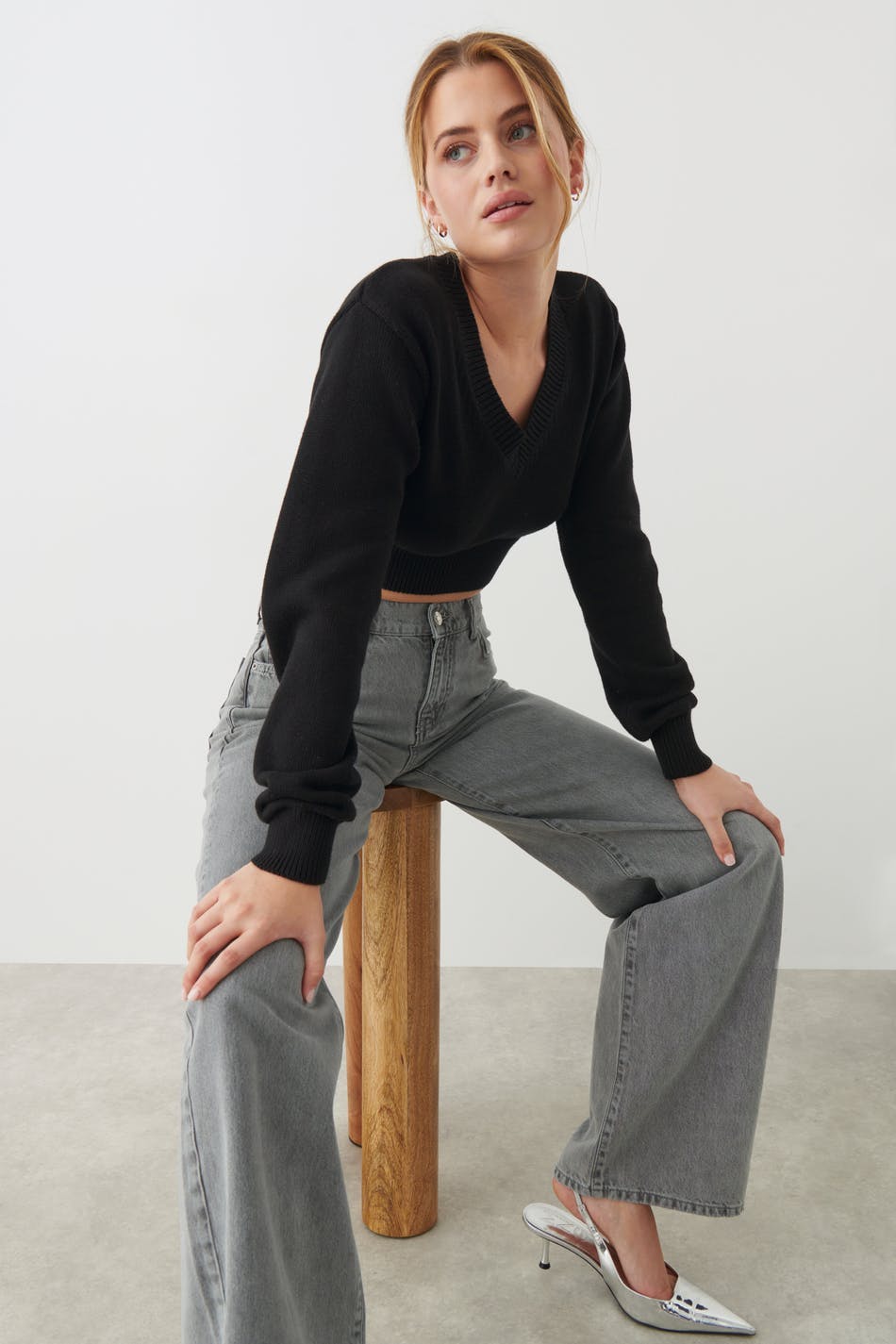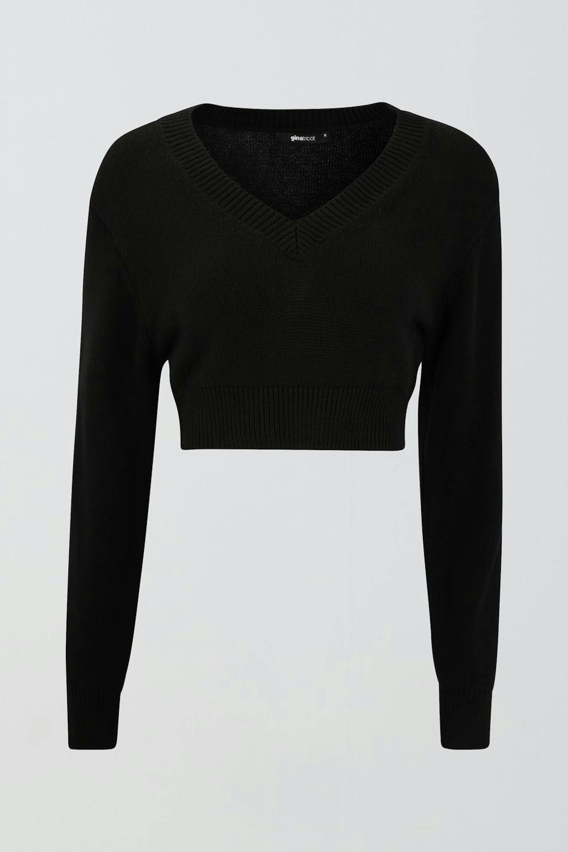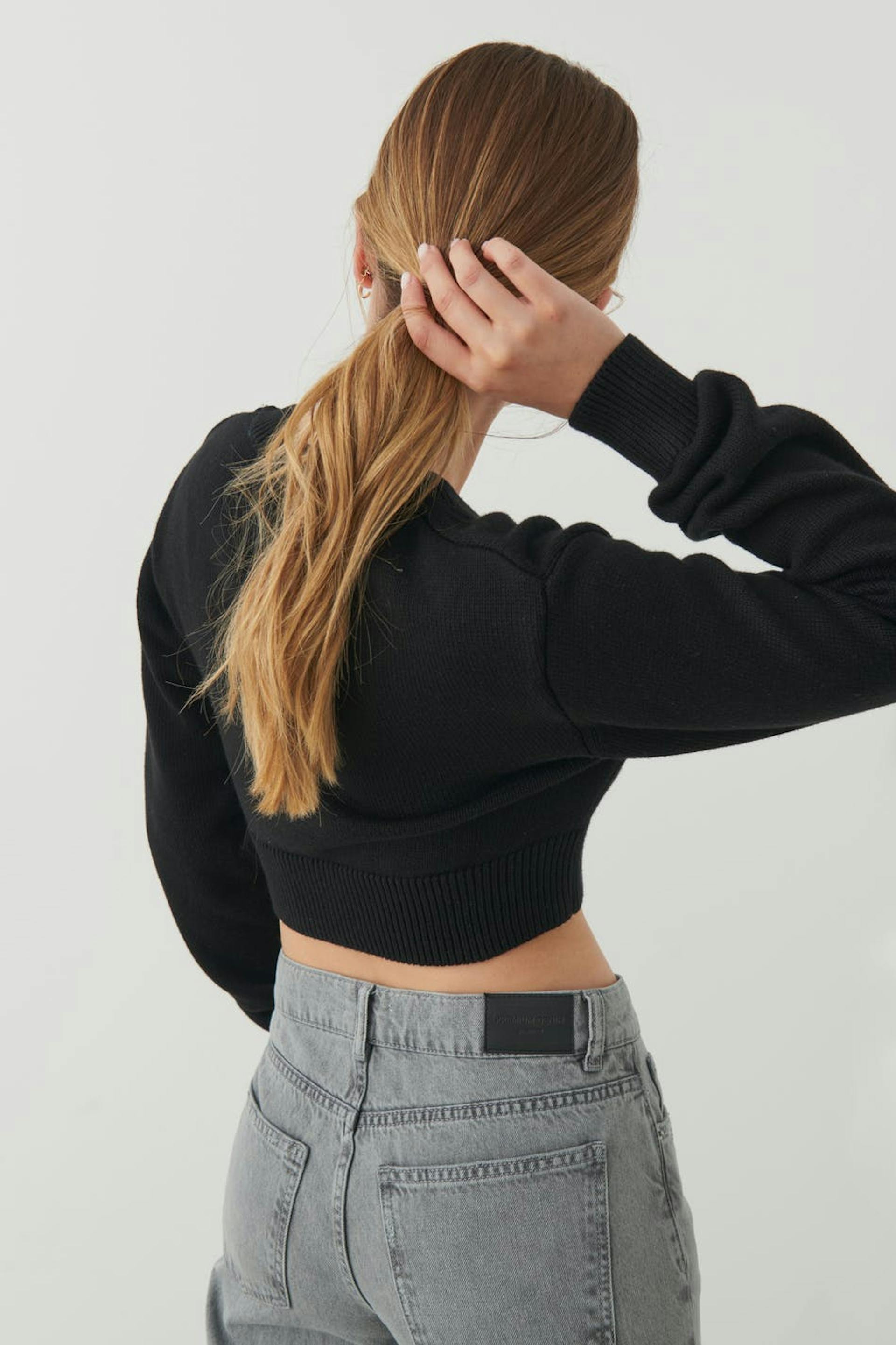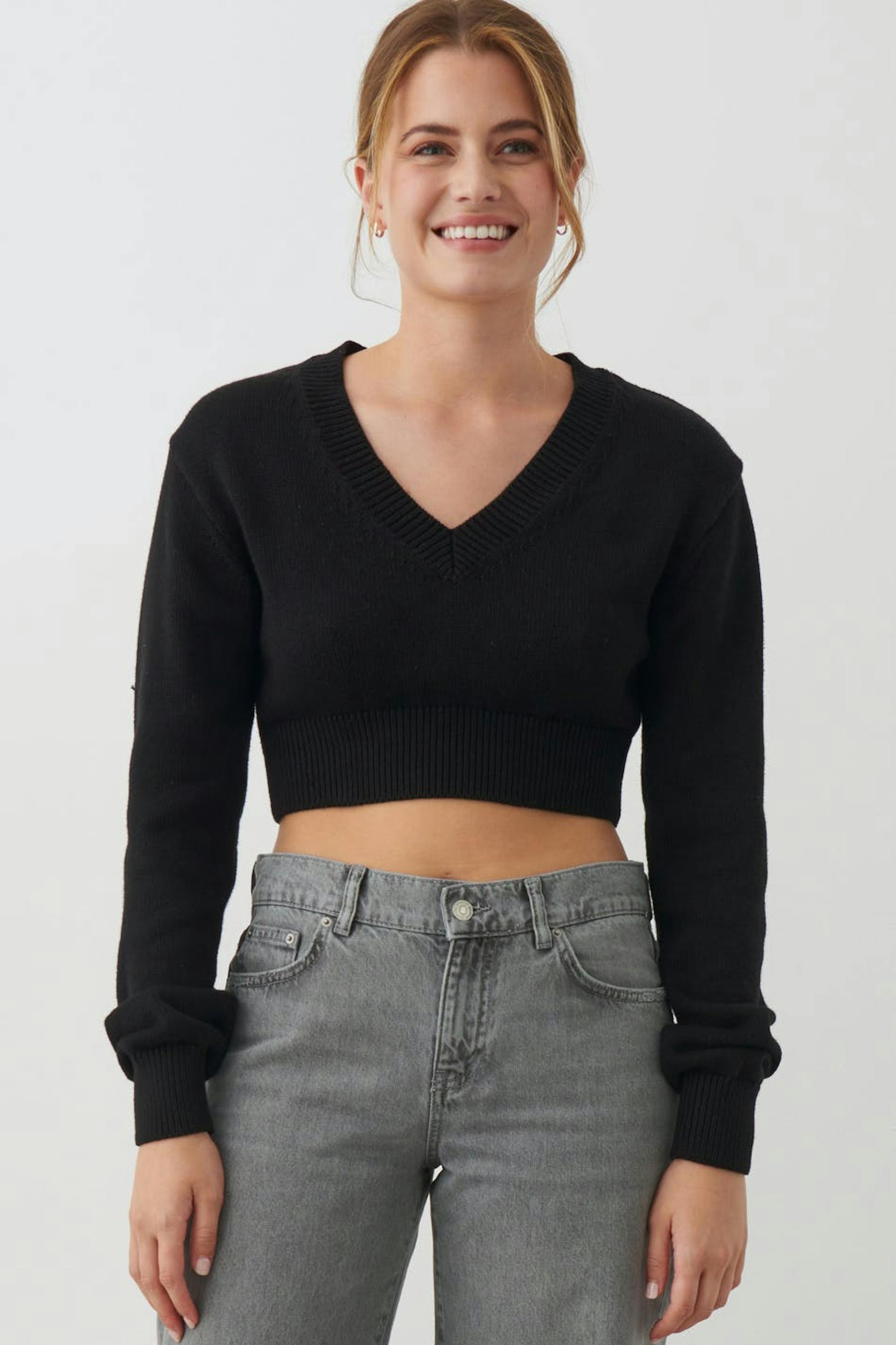 Cropped knitted sweater with V-neck. The sweat is black and has normal fit. It has long sleeve and ribbing on the neckline and at the bottom.