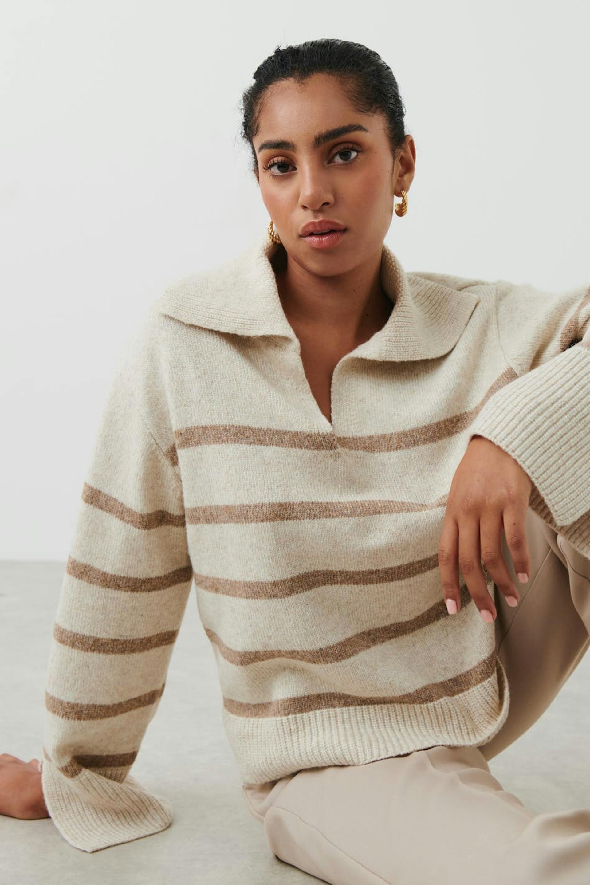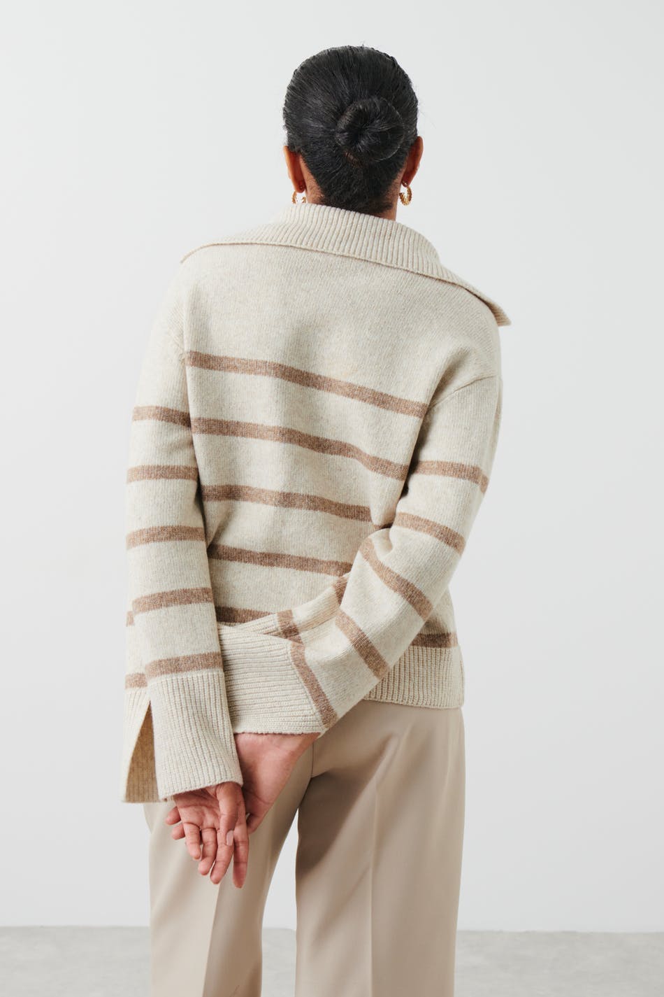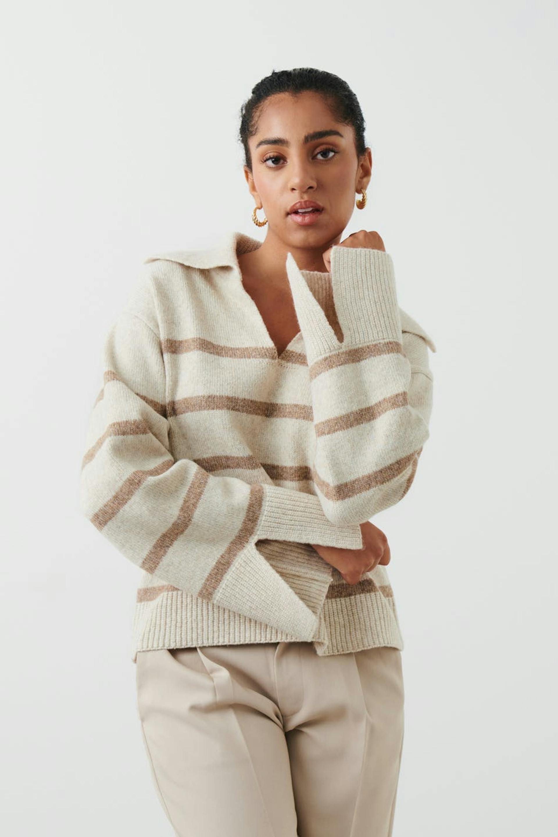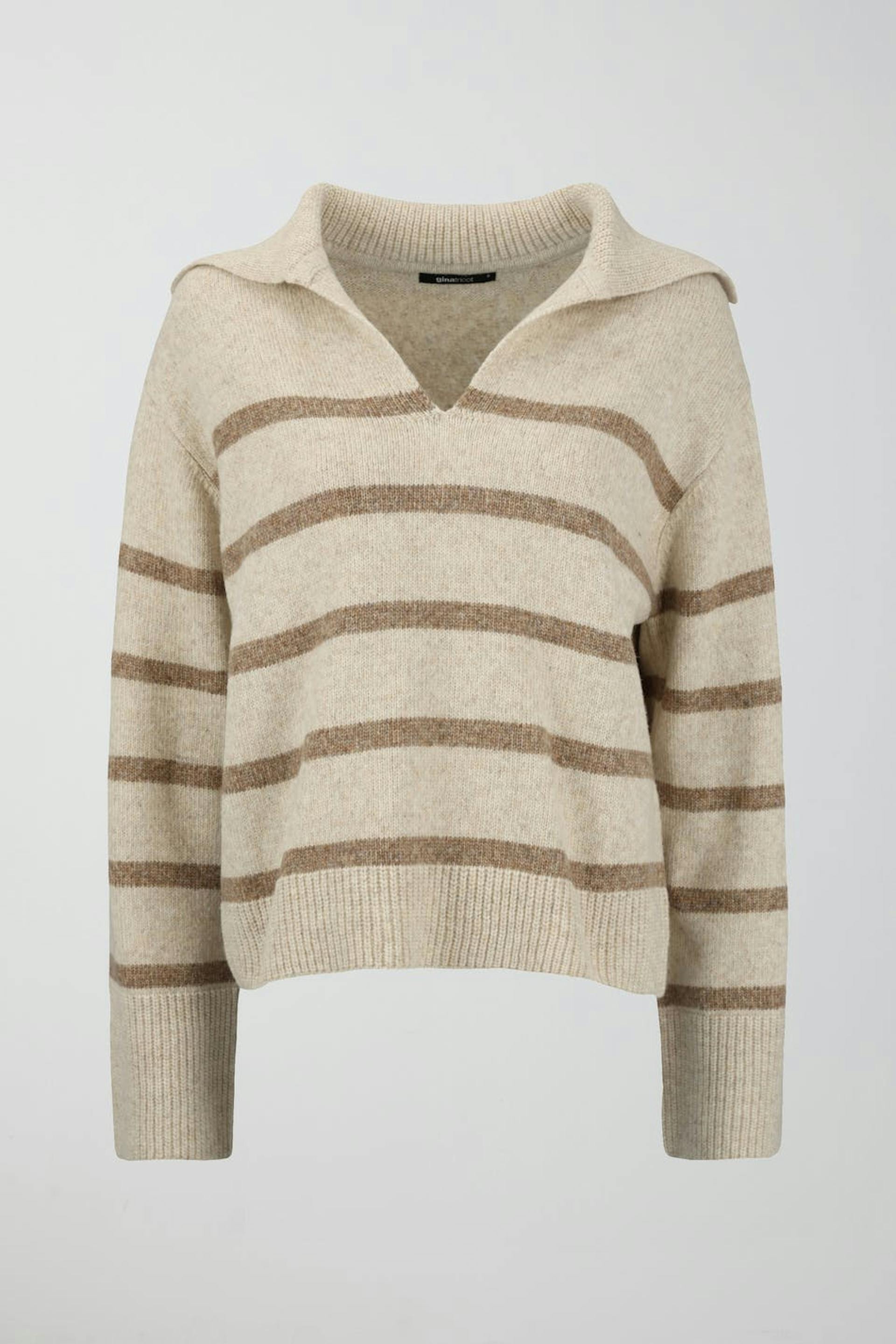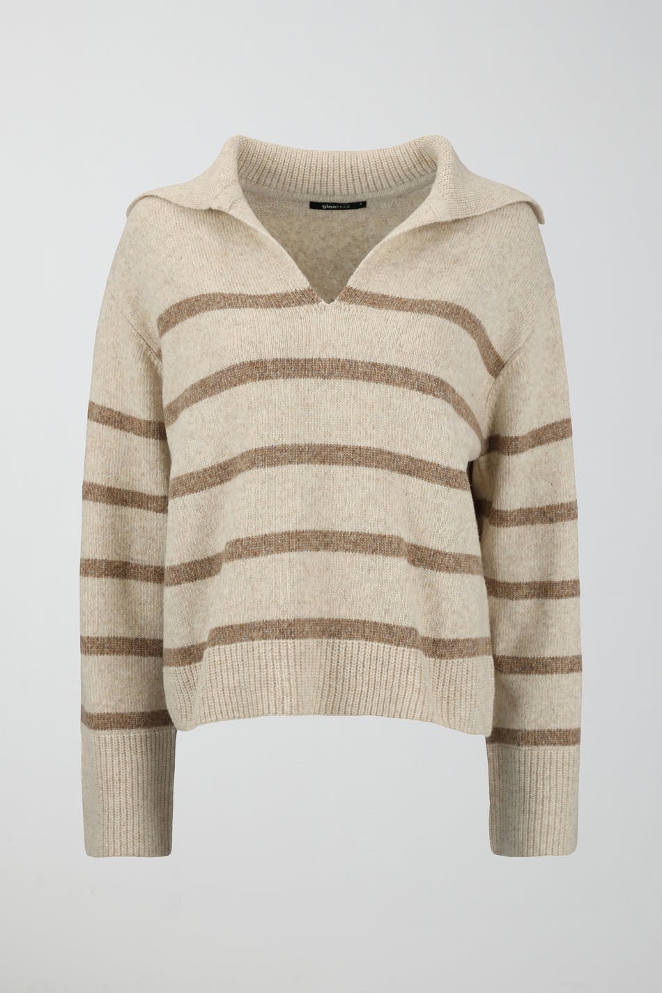 Knitted sweater with v-neck. The sweat is beige and has boxy fit. It has collar and long sleeve.