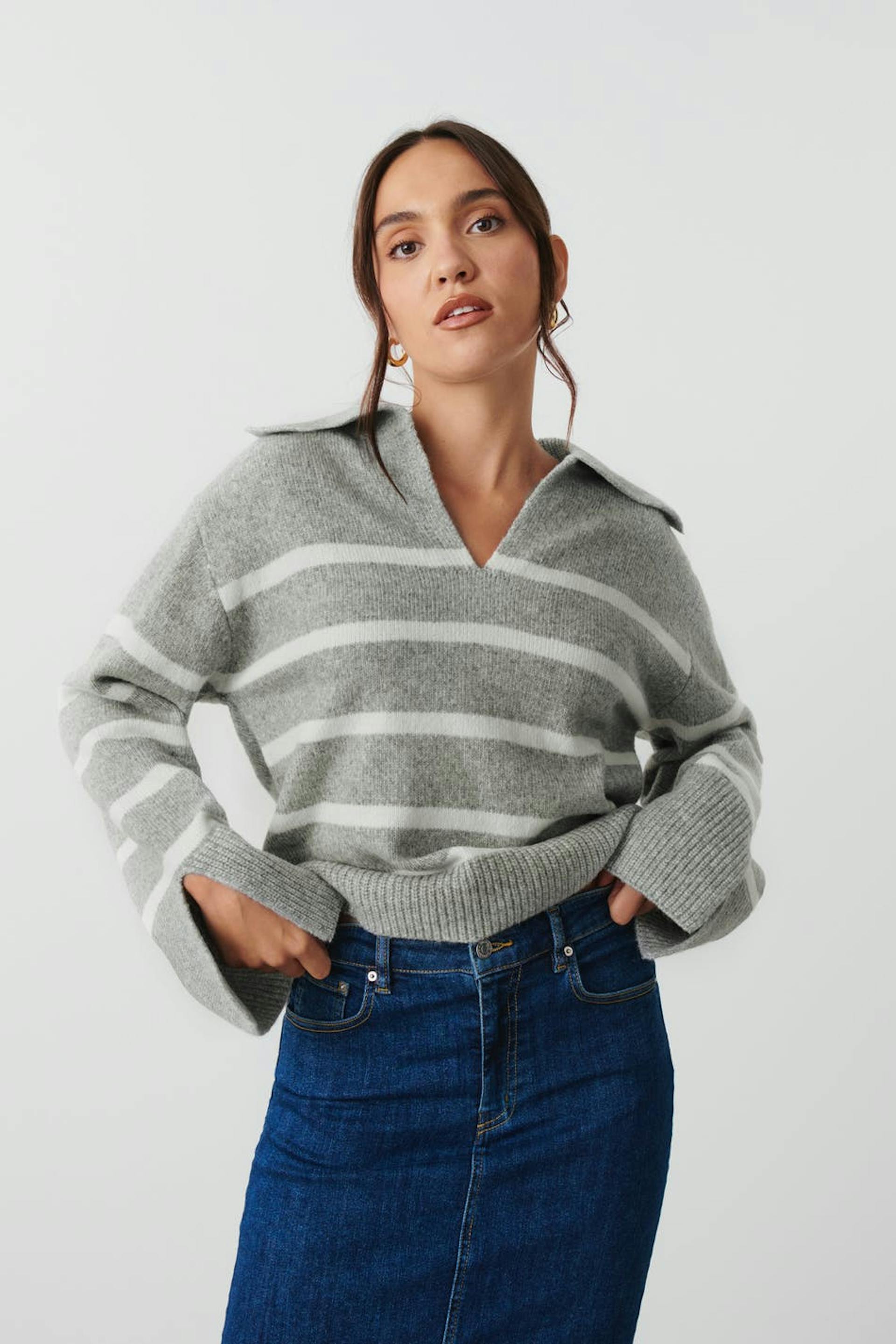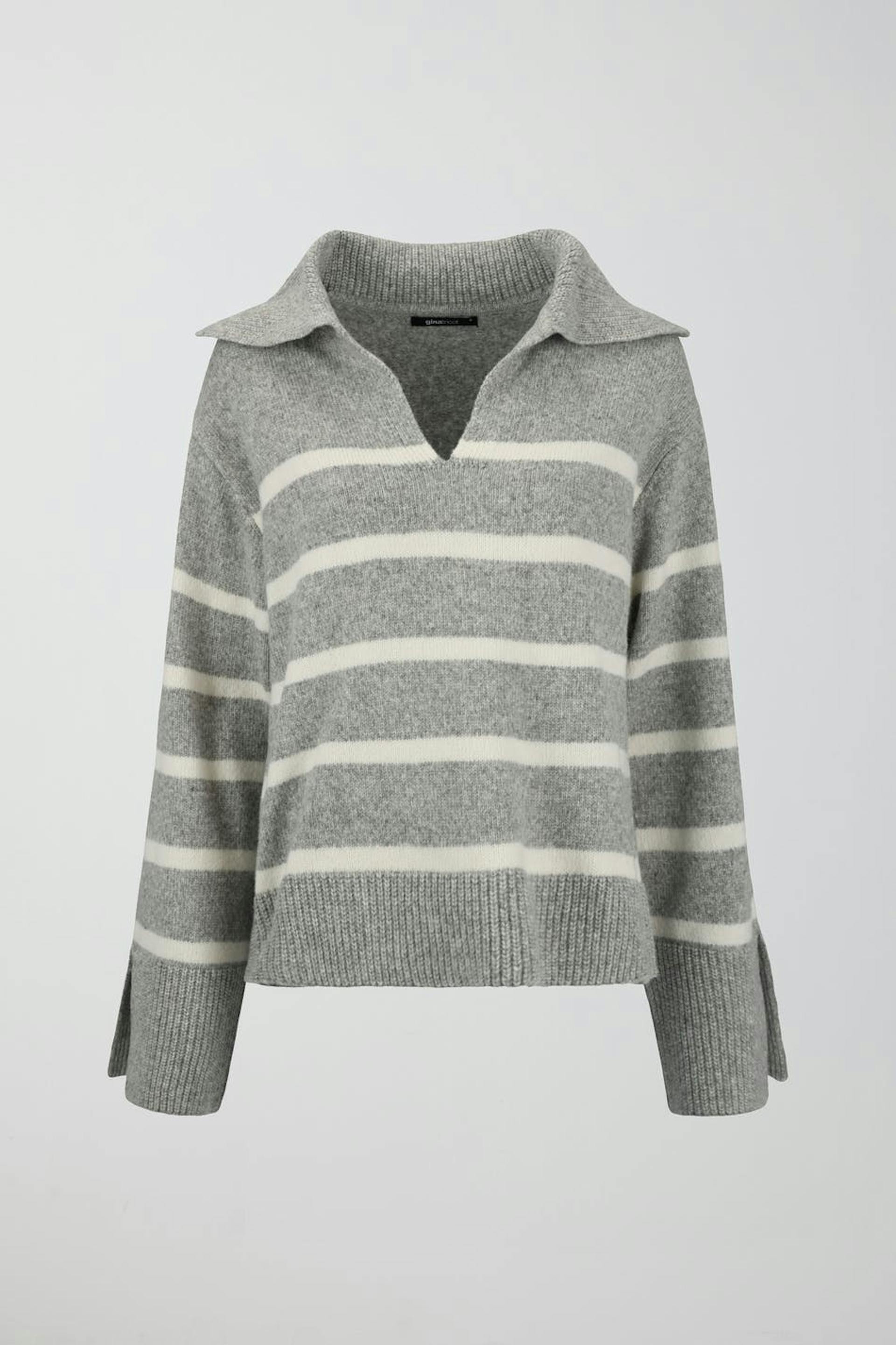 Striped knitted sweater with v-neck. The sweat is grey and has boxy fit. It has collar and long sleeve.
