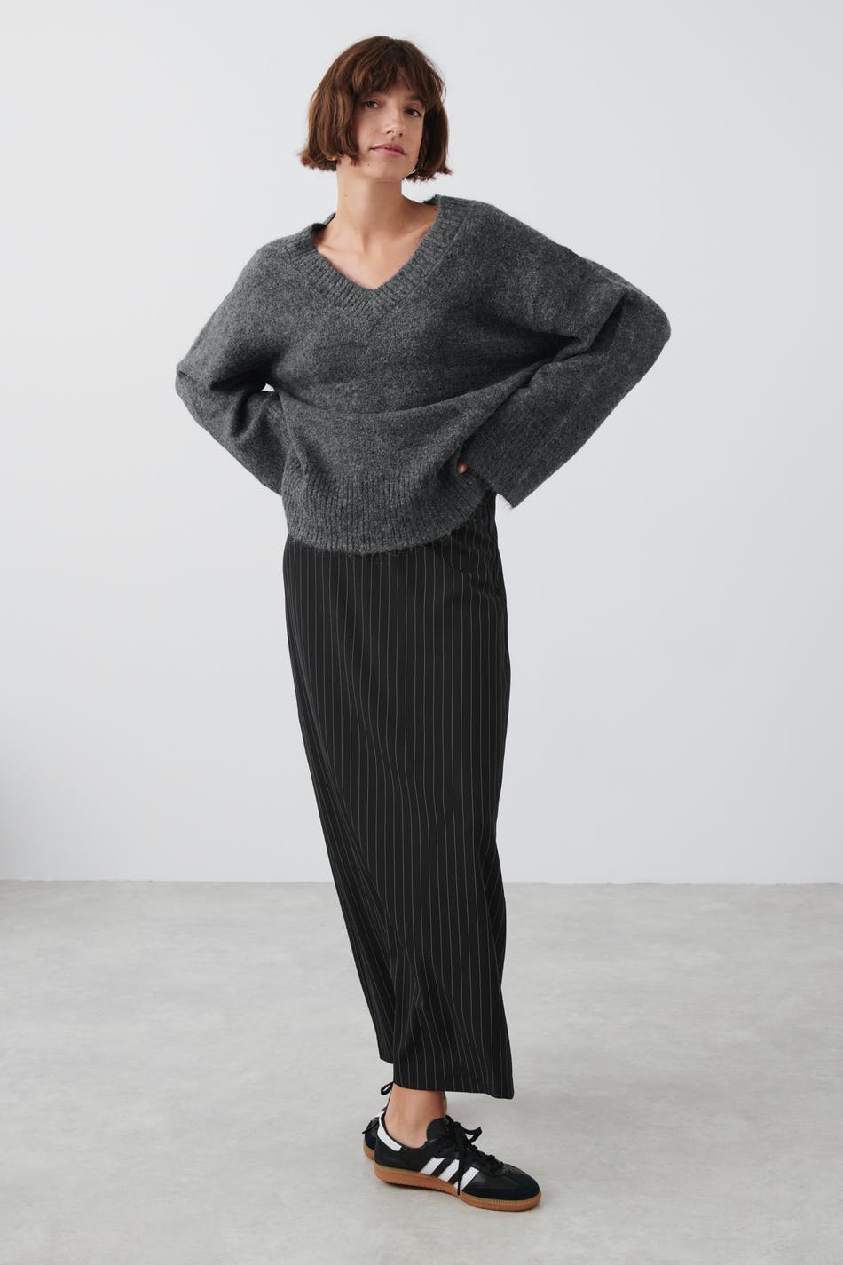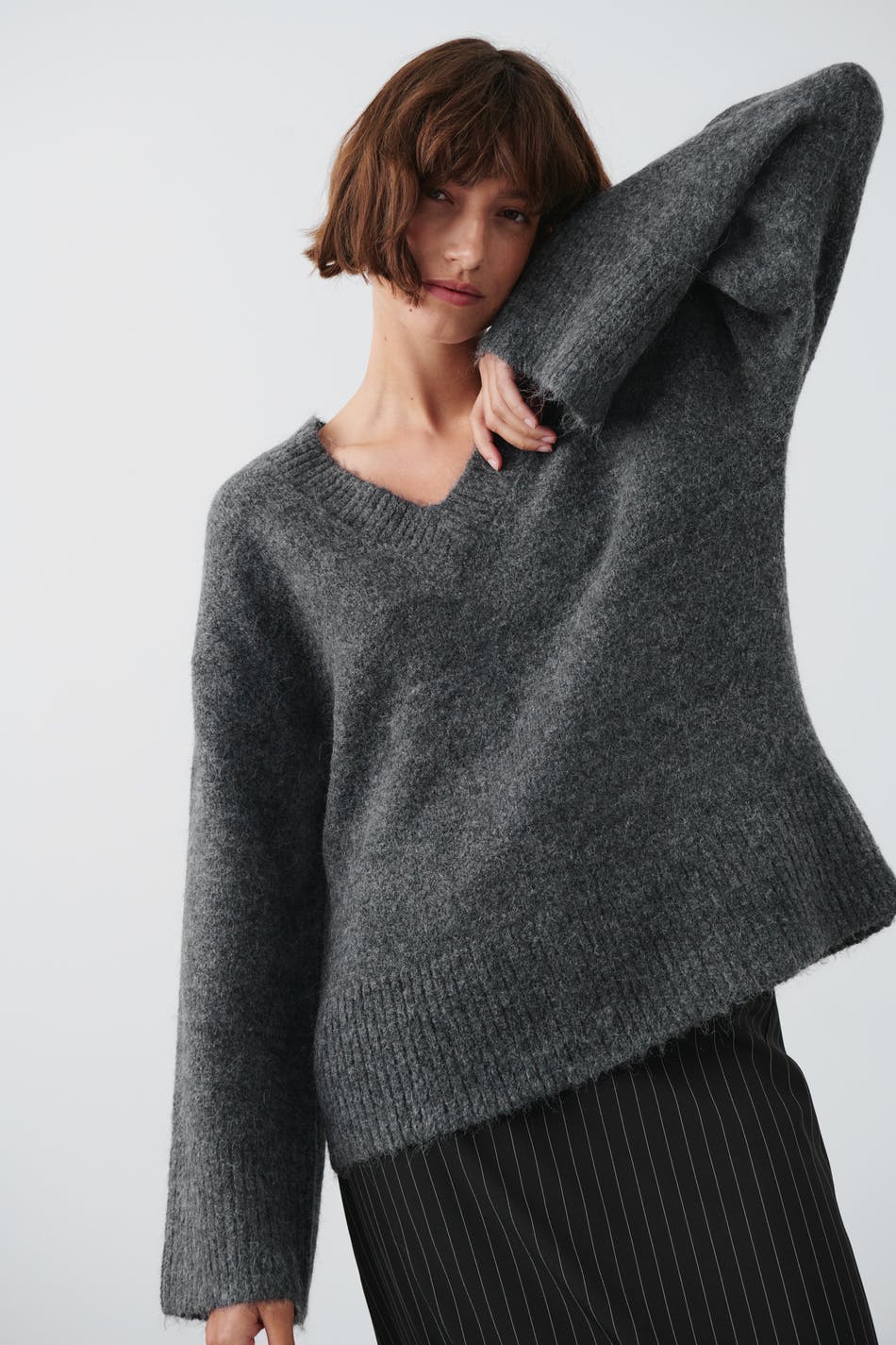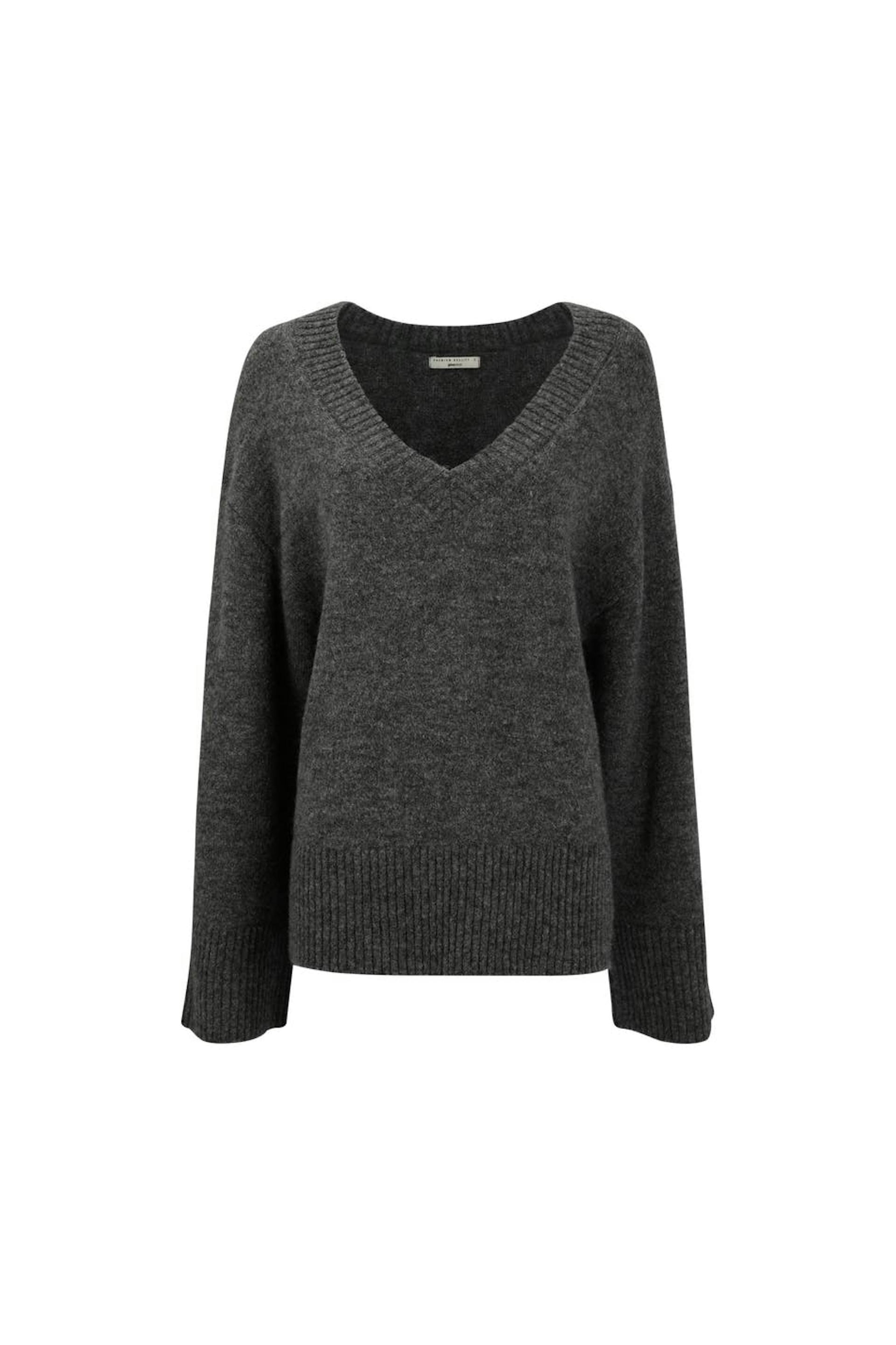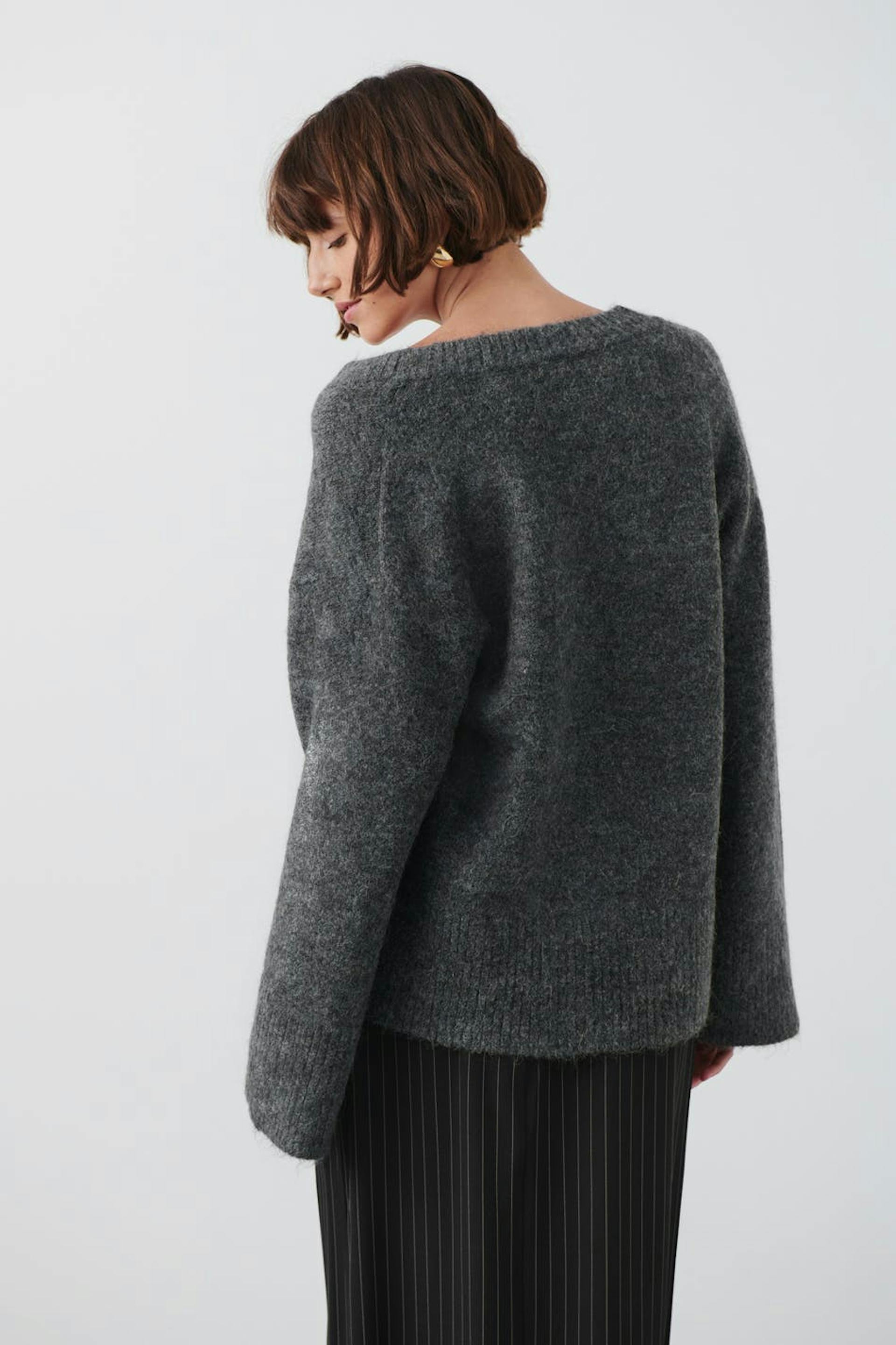Soft knit jumper with an oversize fit. The jumper is grey and has v-neck. It has straight sleeve and rib knit at sleeve ends and at the bottom.