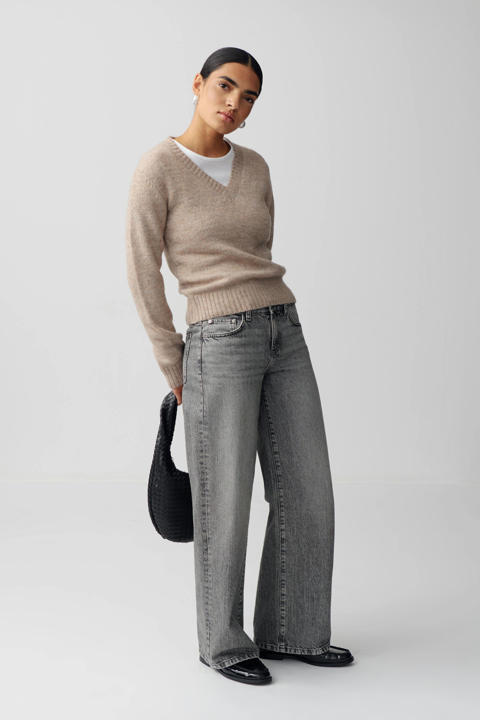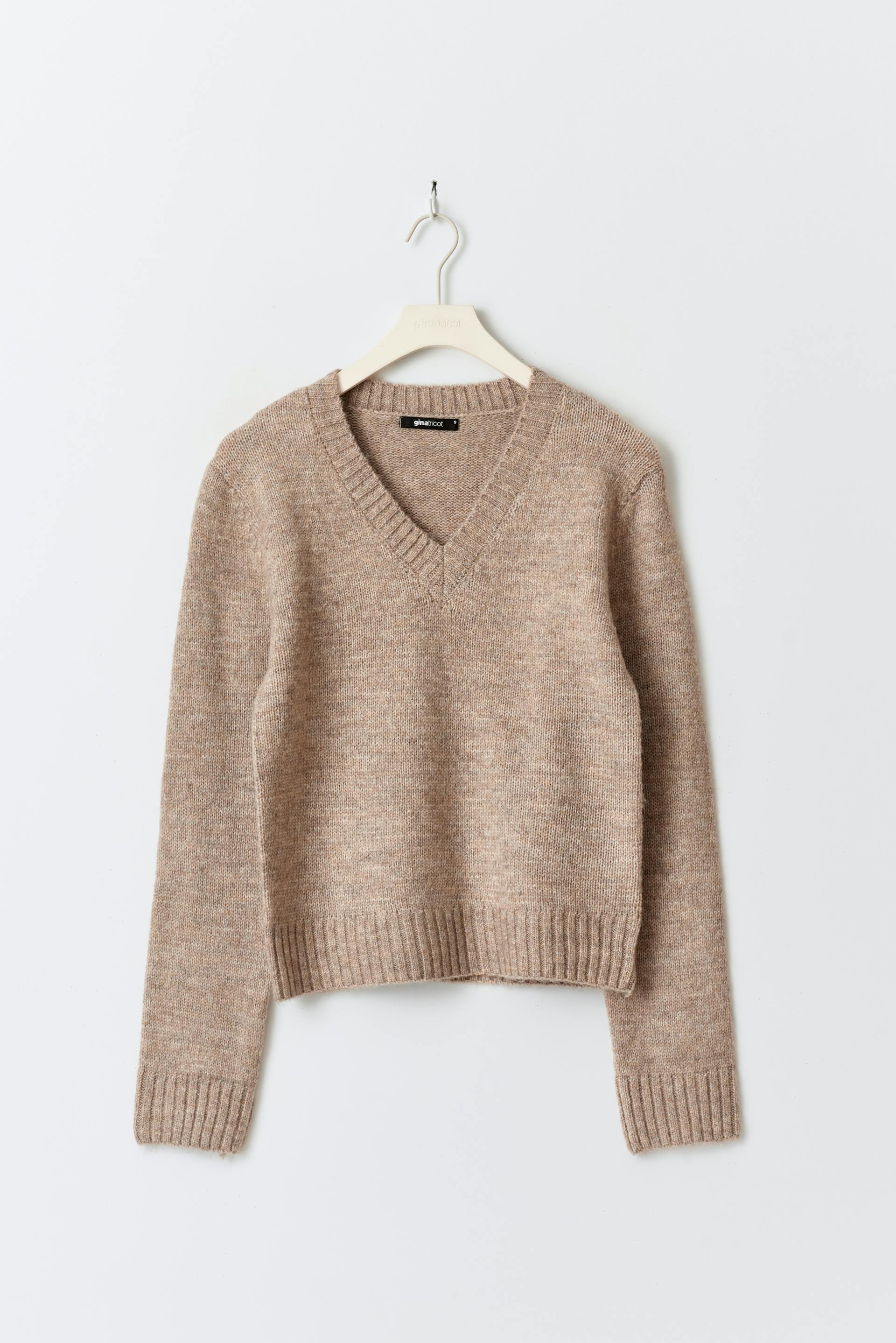Knitted sweater with v-neck. The sweat is beige and has long sleeve. It has regular fit and rib knit at sleeve ends and at the bottom.
