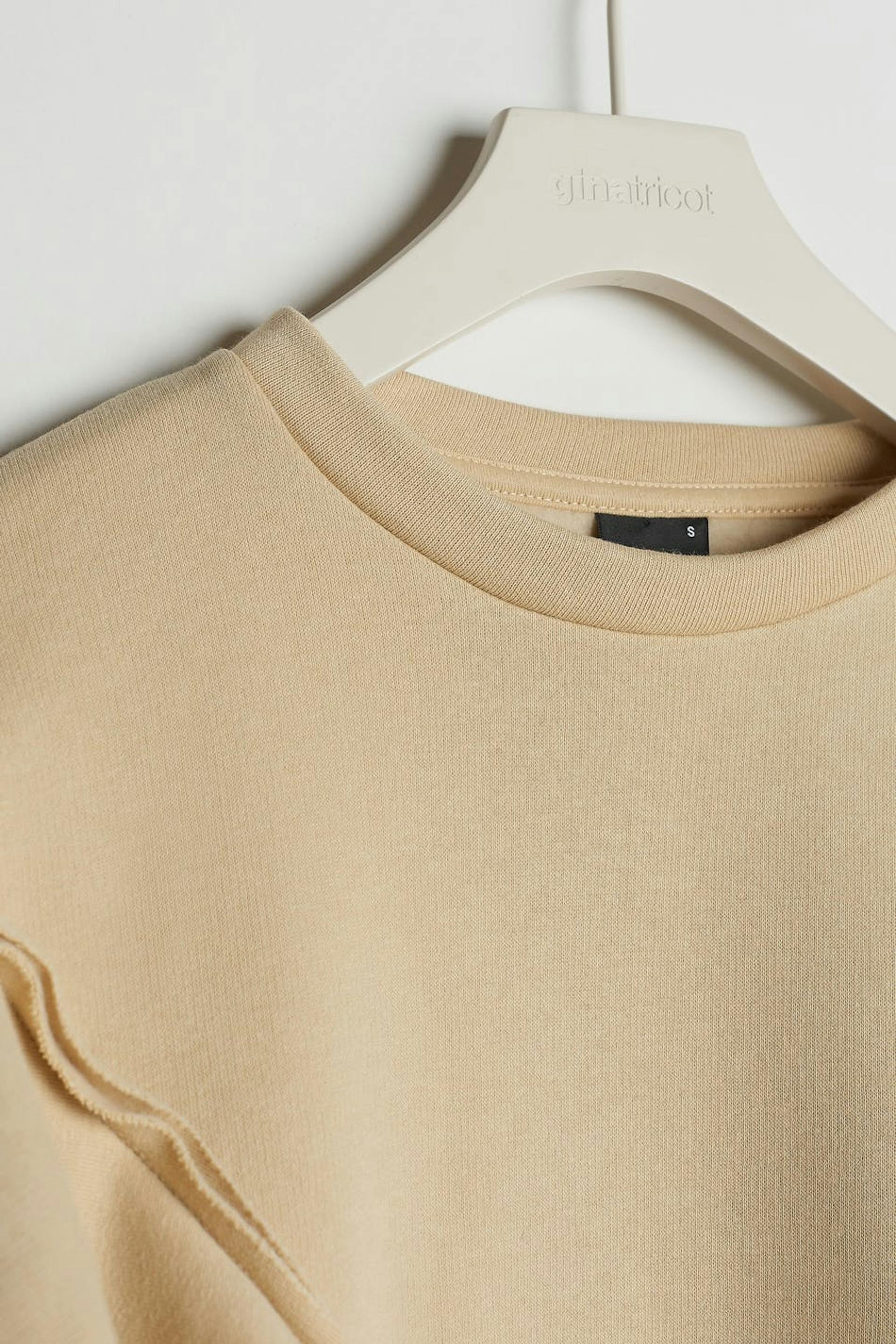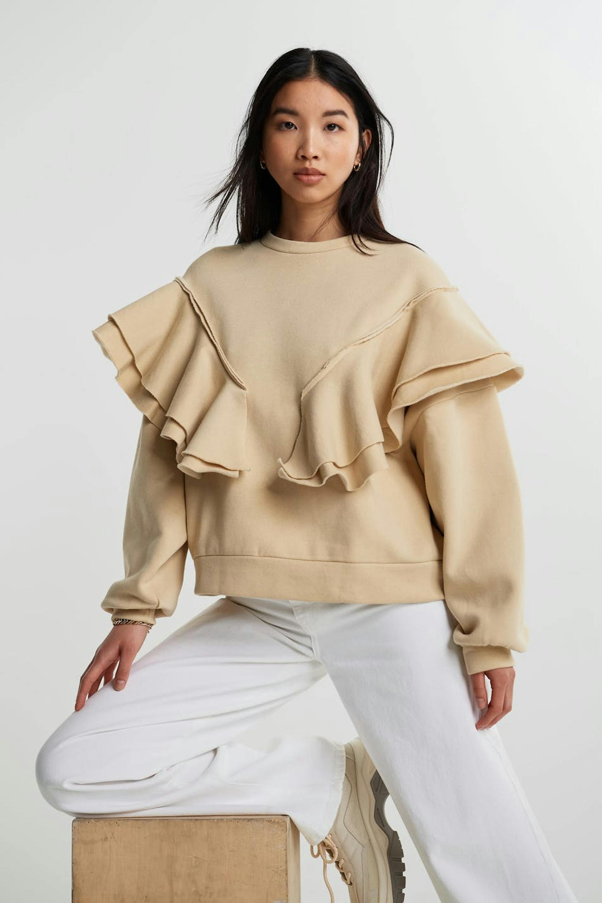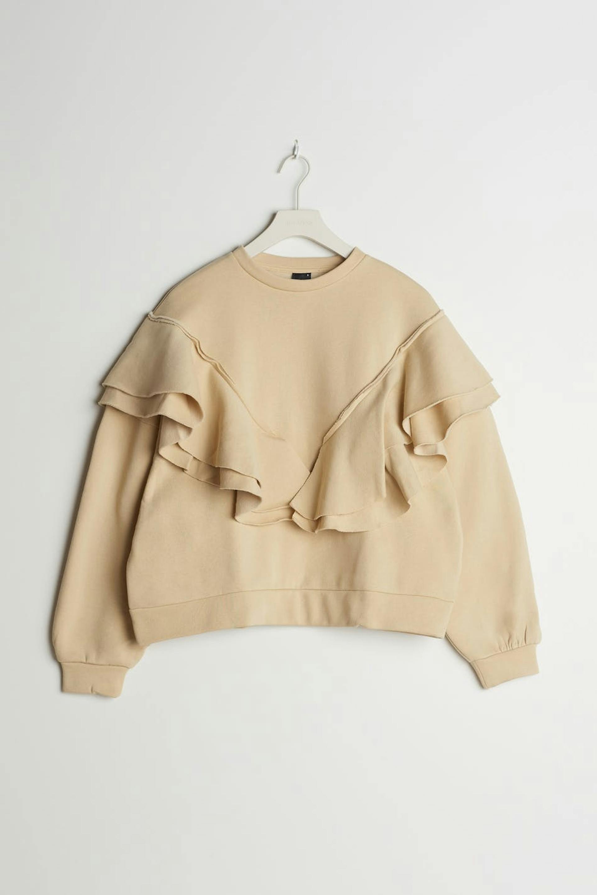 Jumper with an oversize fit. The jumper is beige and has ruffle details at the front and at the back.