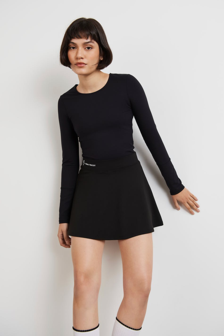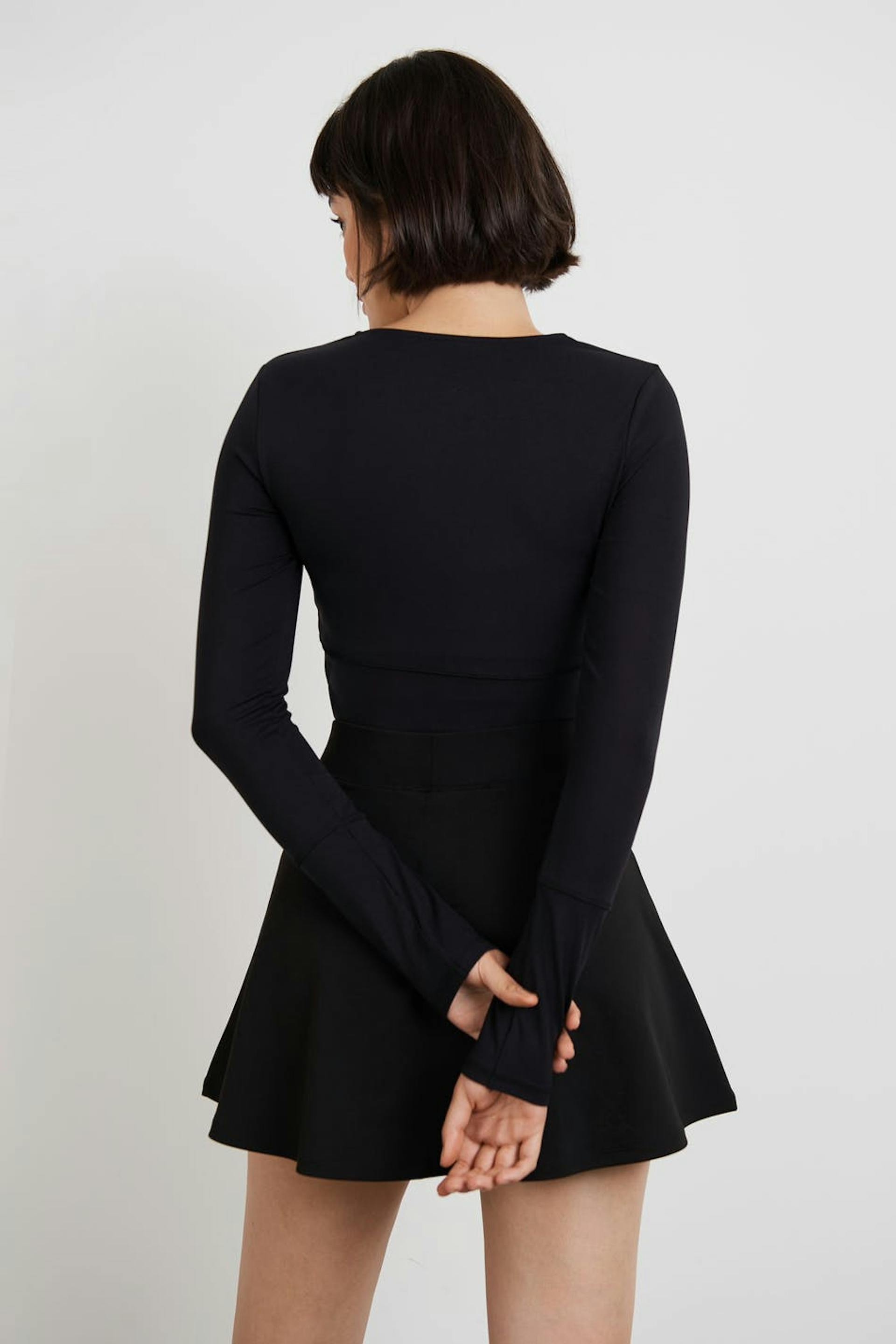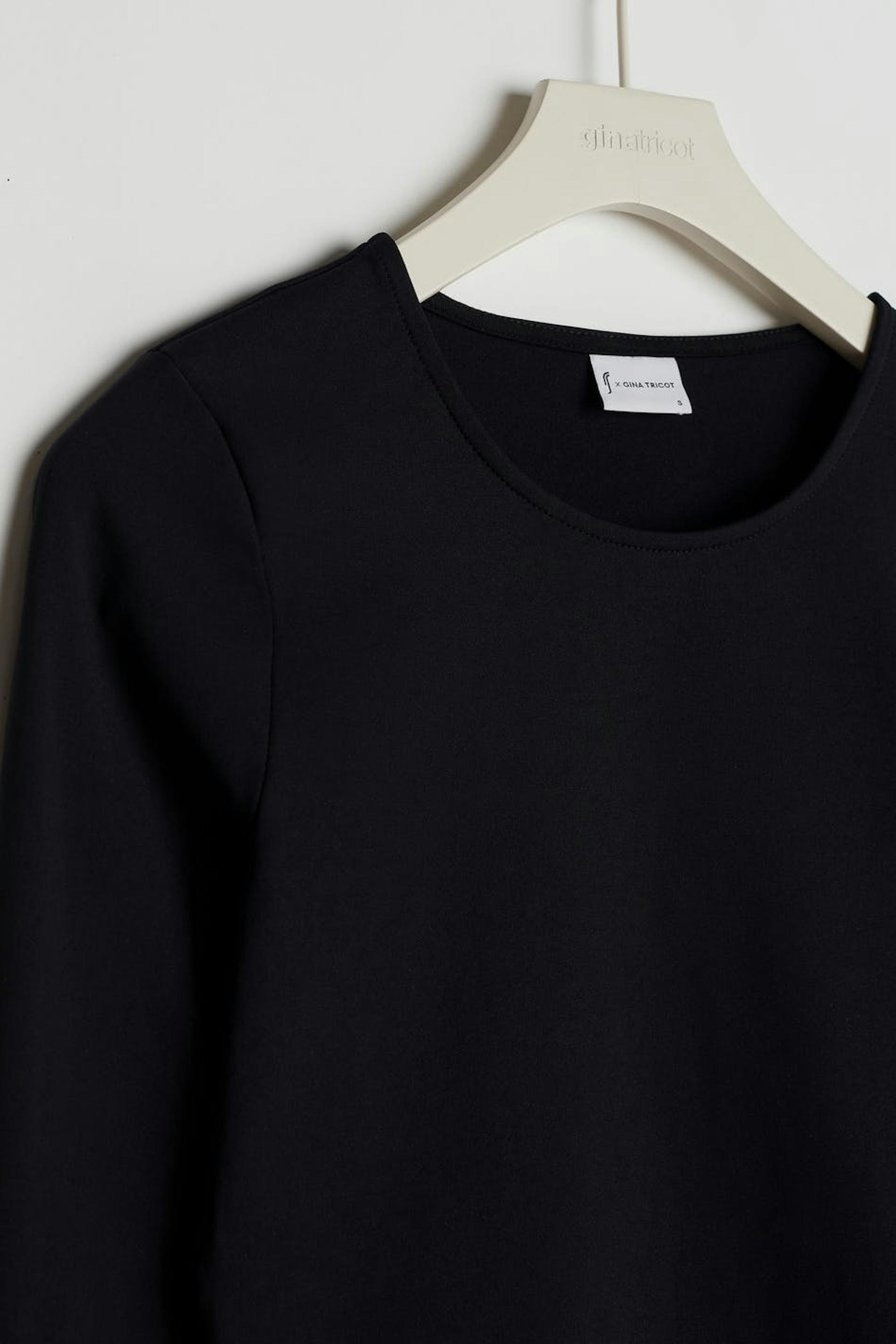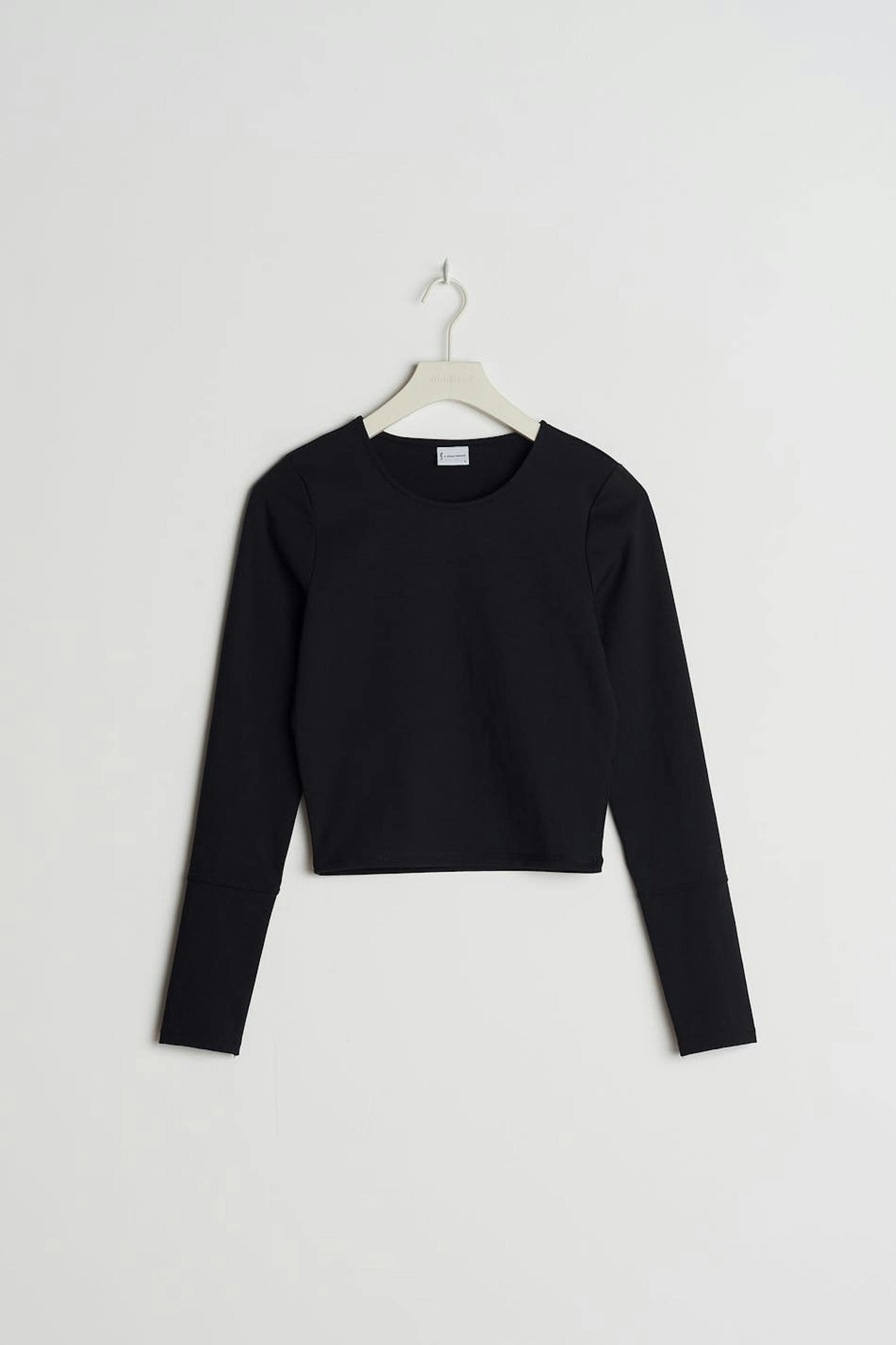 RS X Gina Tricot. Long-sleeved workout top with a fitted fit. The top is black and has a rounded neckline.