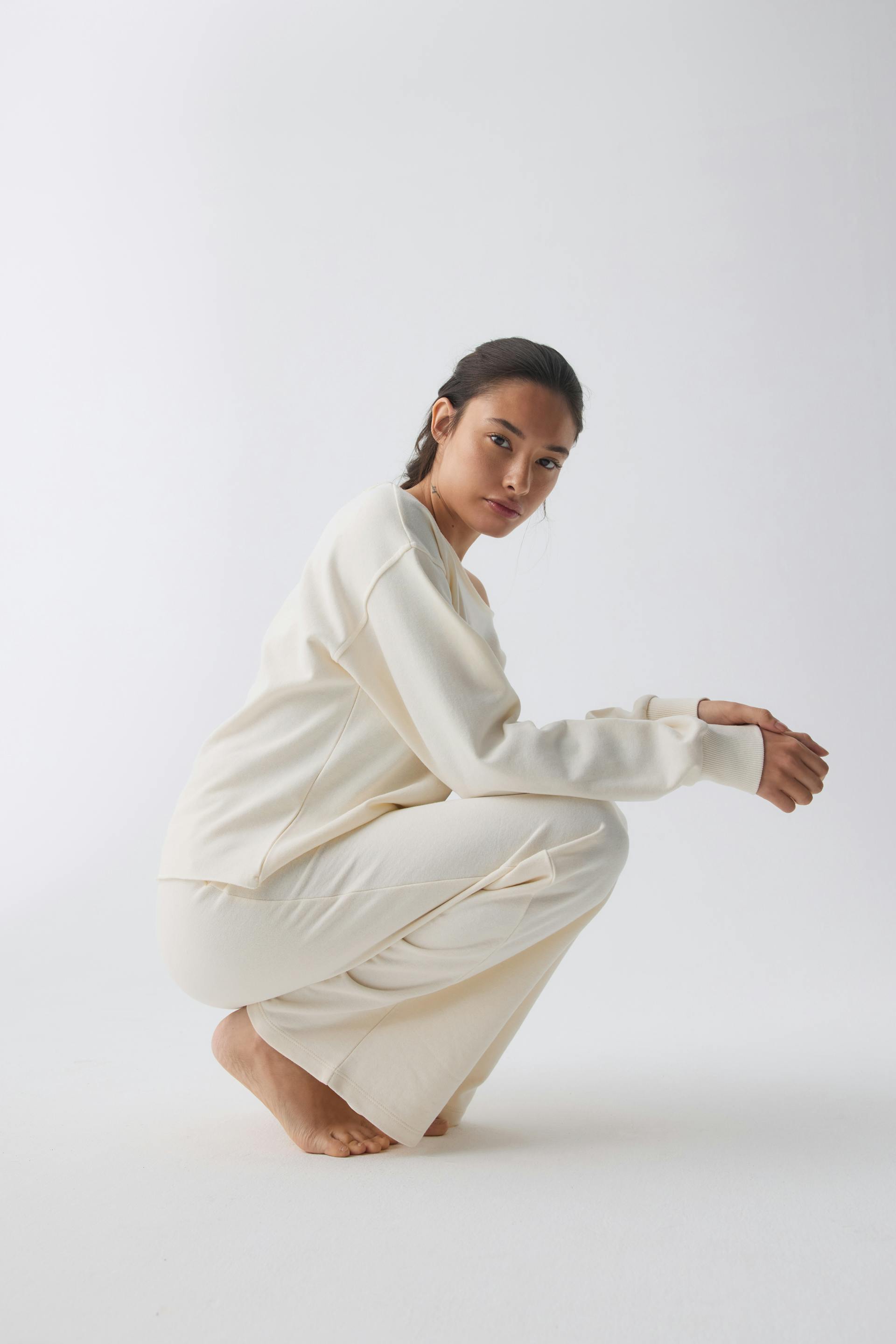 Sweat with one shoulder design. The sweat is white and has oversize fit. It has boat neckline, raw edges and ribbing at sleeve ends.
