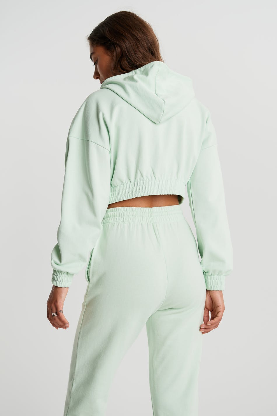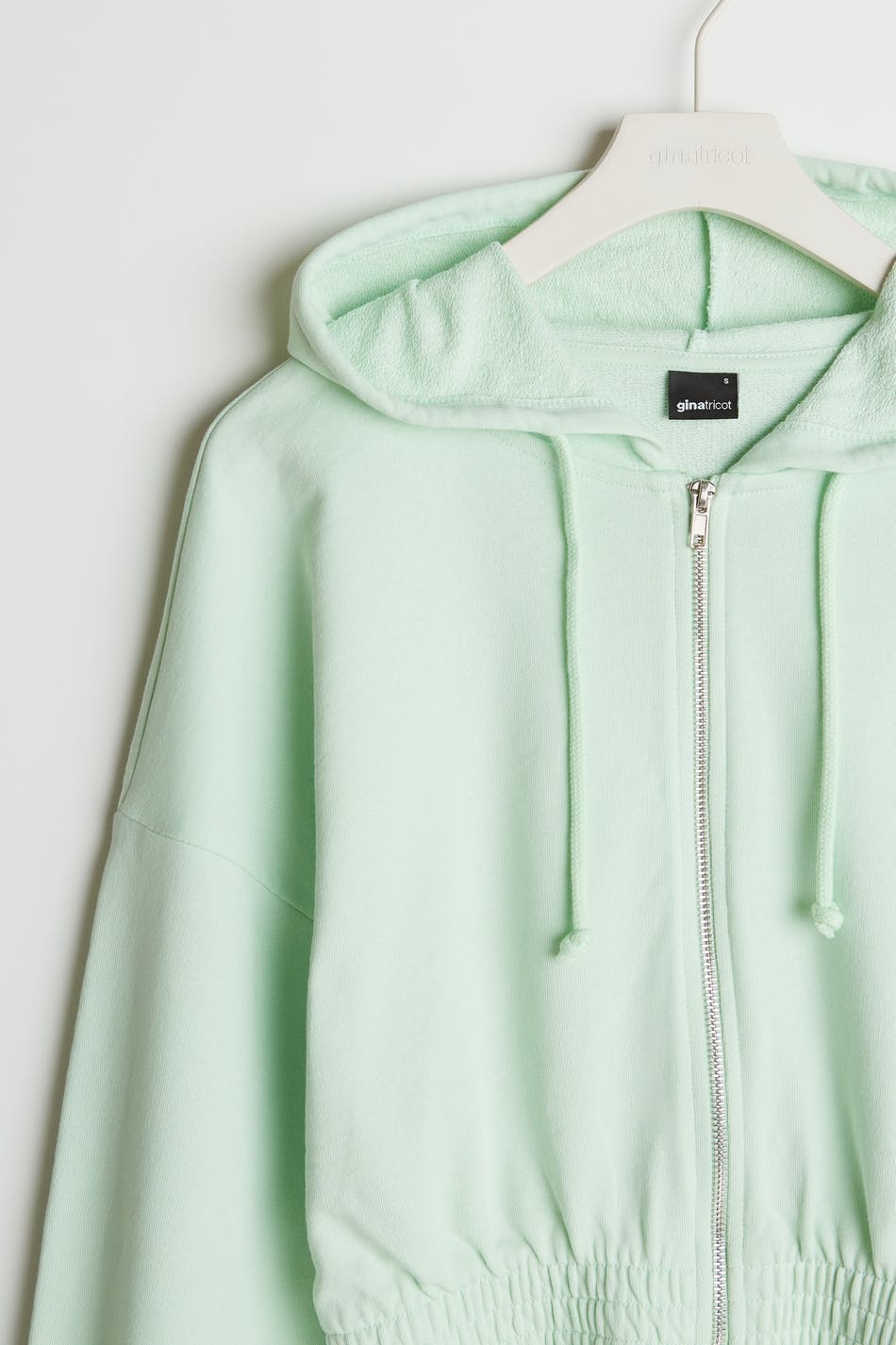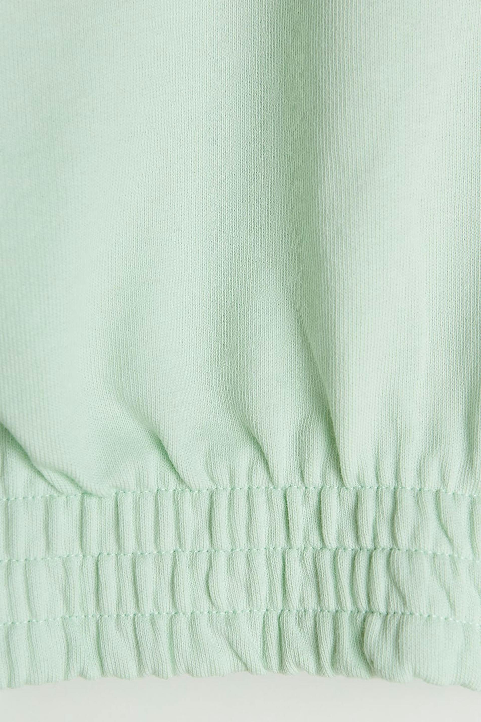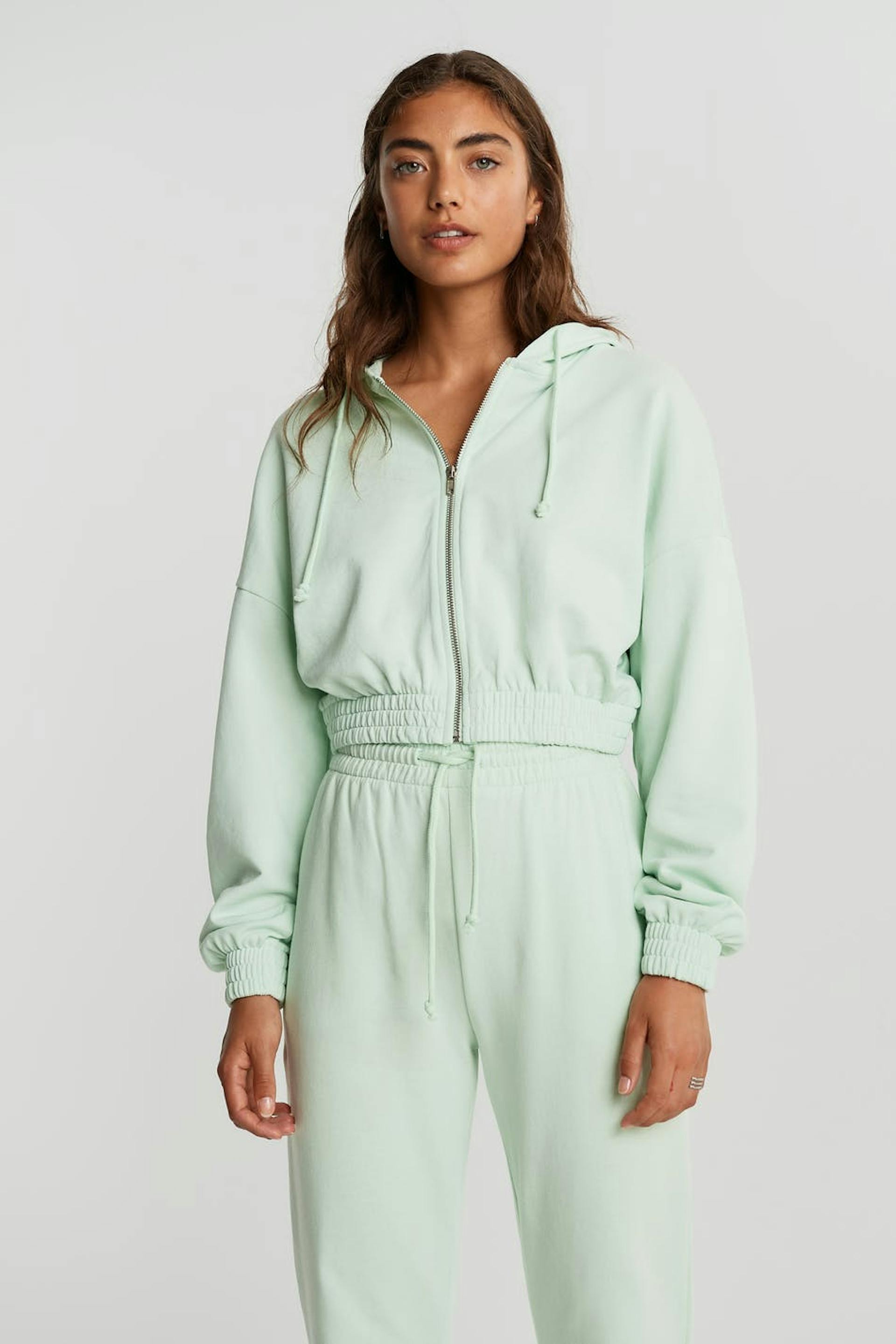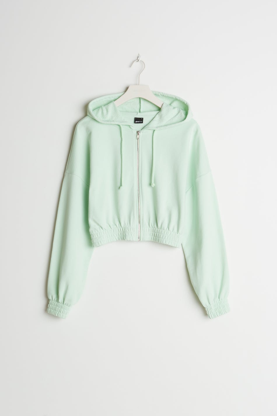 Cropped sweatshirt with a regular fit. The sweatshirt is mint green and has a hood with a drawstring. It has a zip on the front and a cuff in elastic at the hem and on the sleeve ends.