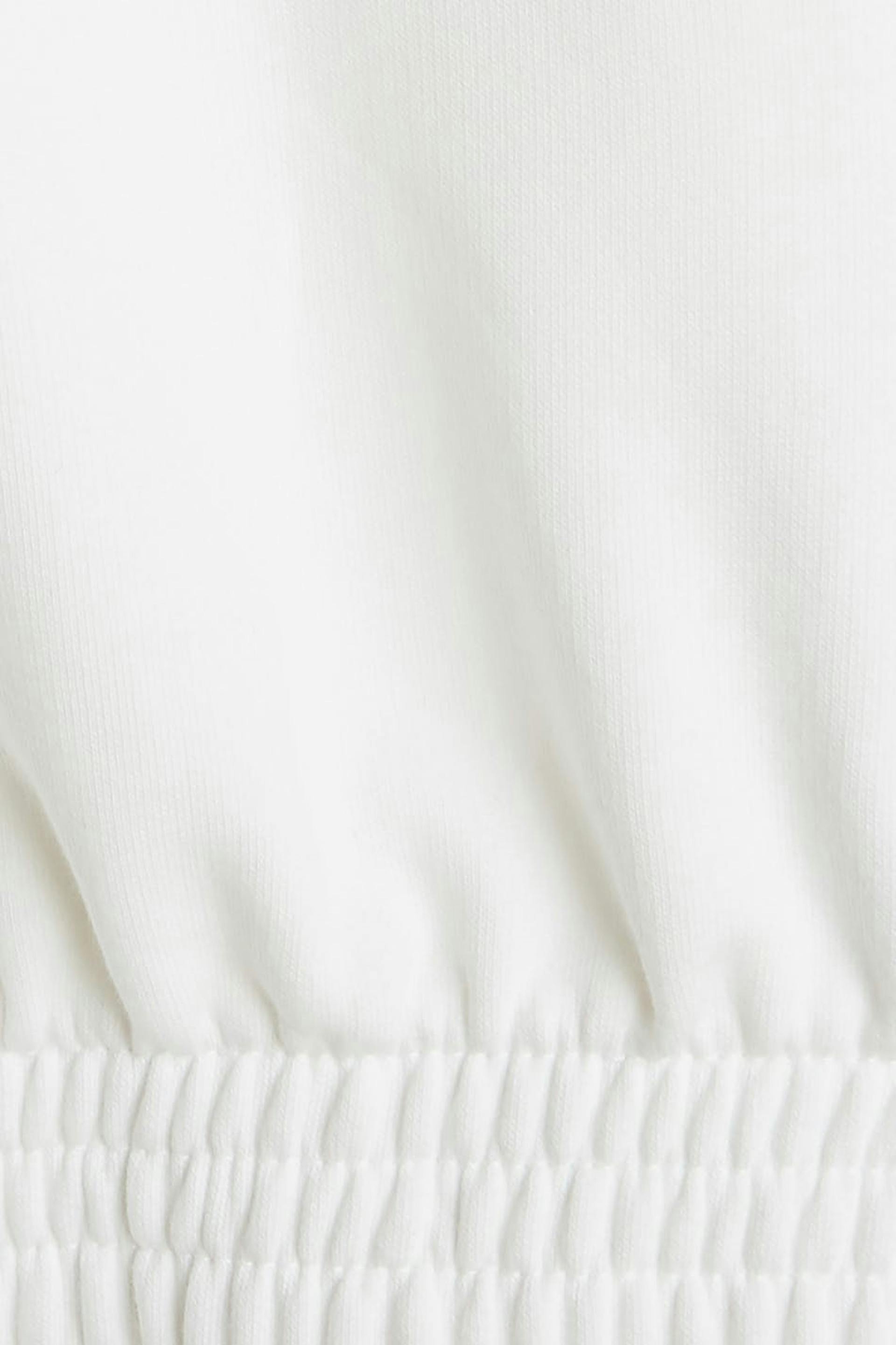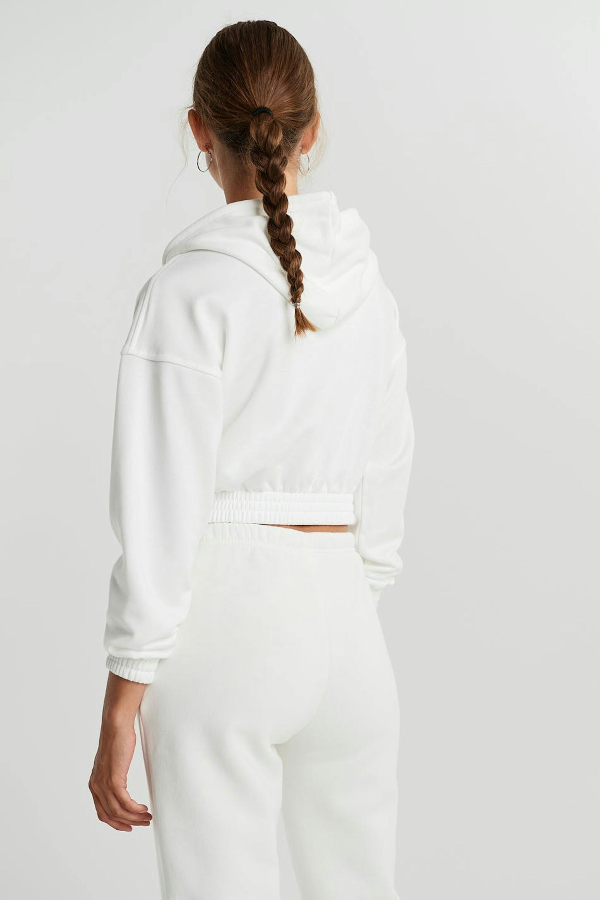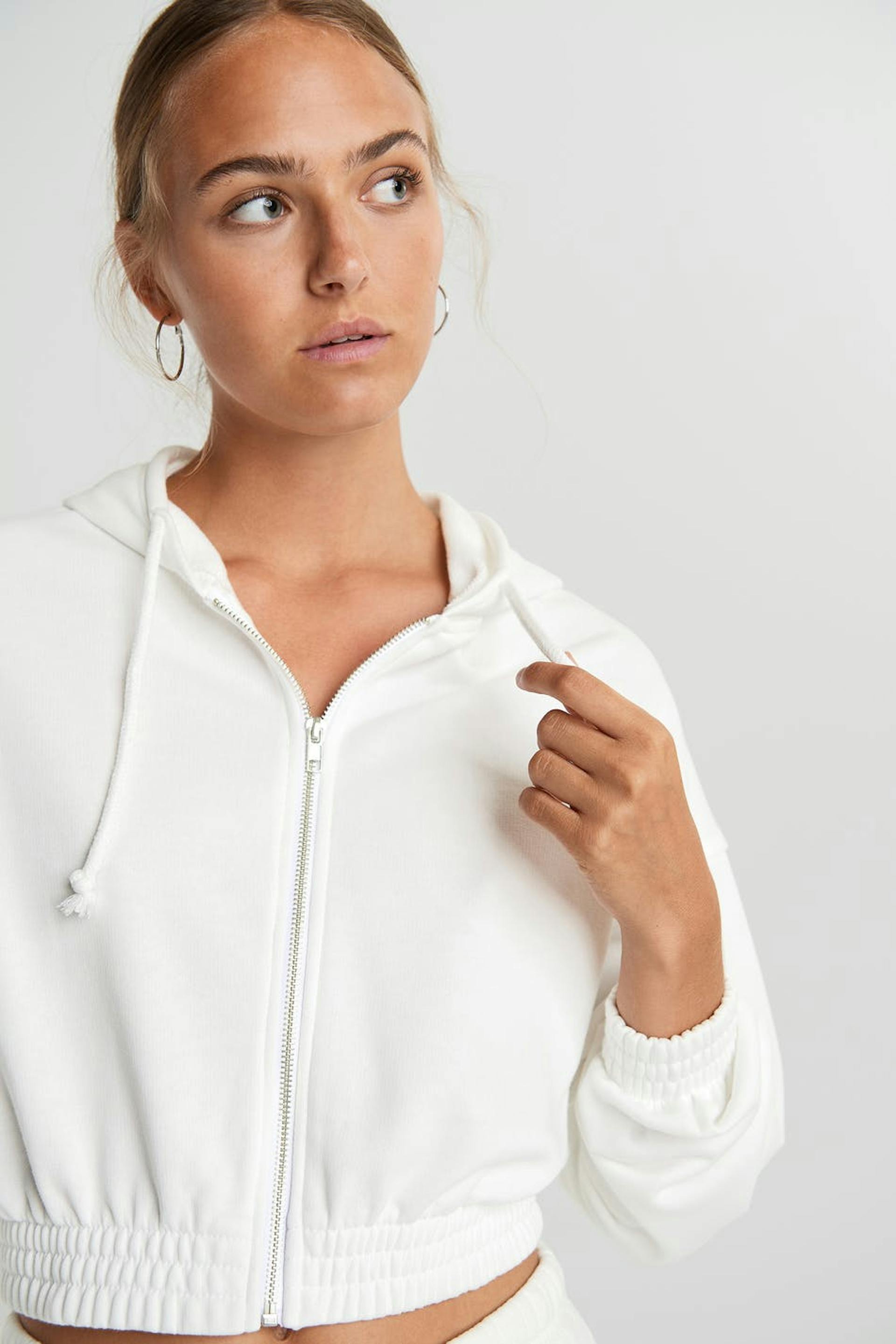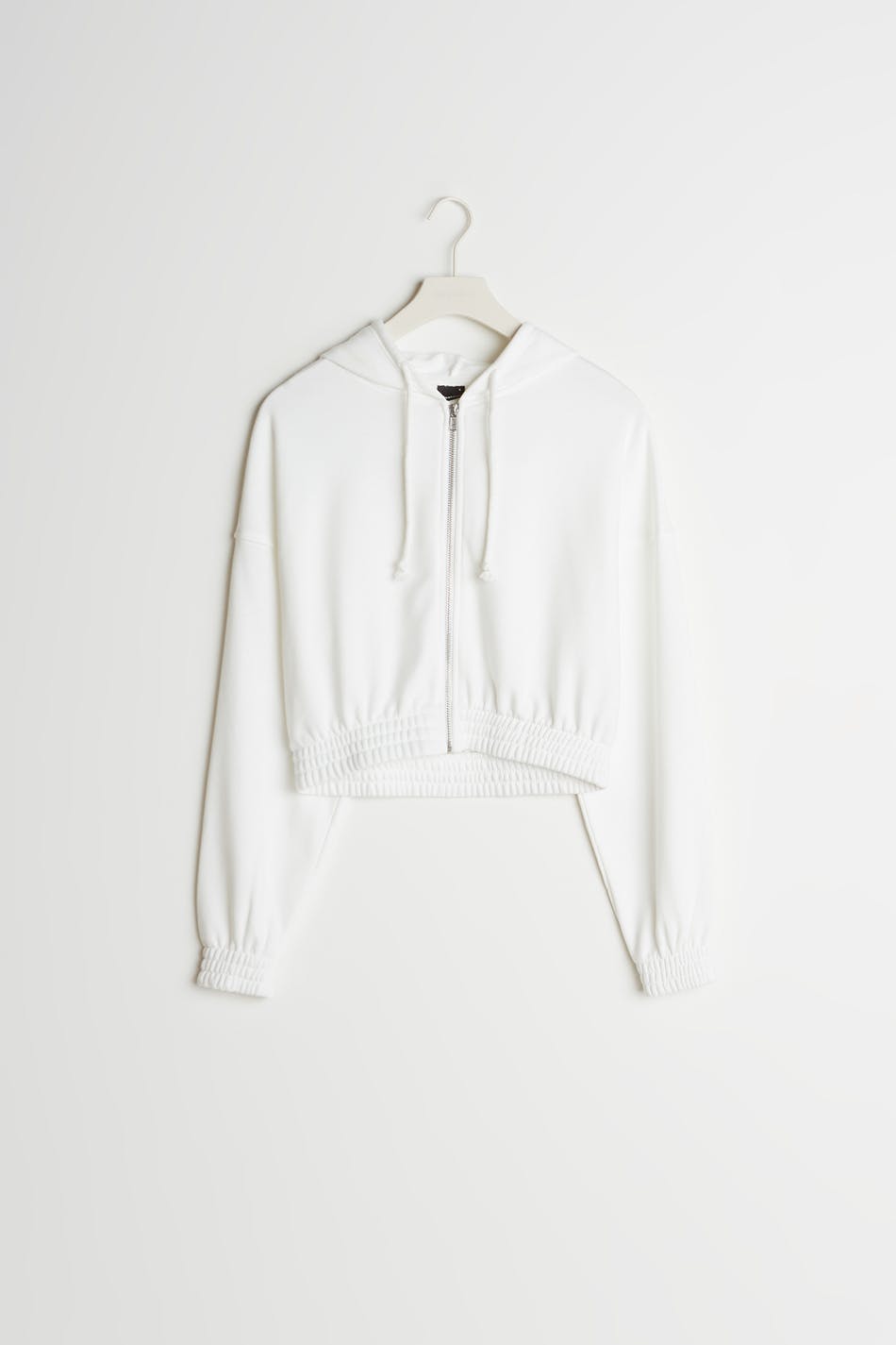 Short sweatshirt with a regular fit. The sweatshirt is white and has a zip on the front. It has a hood with a drawstring.