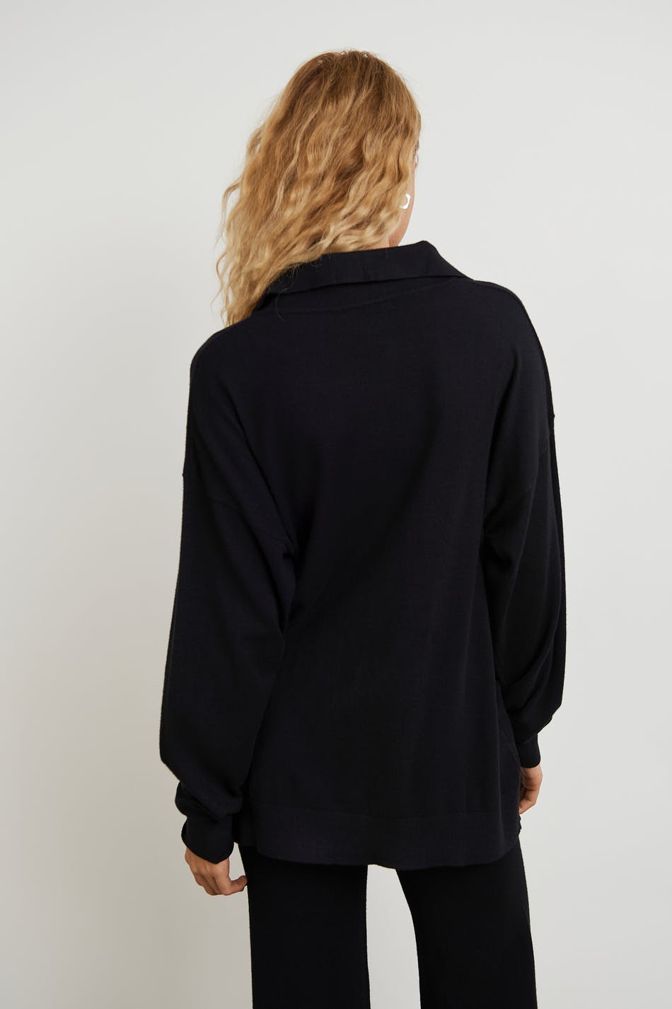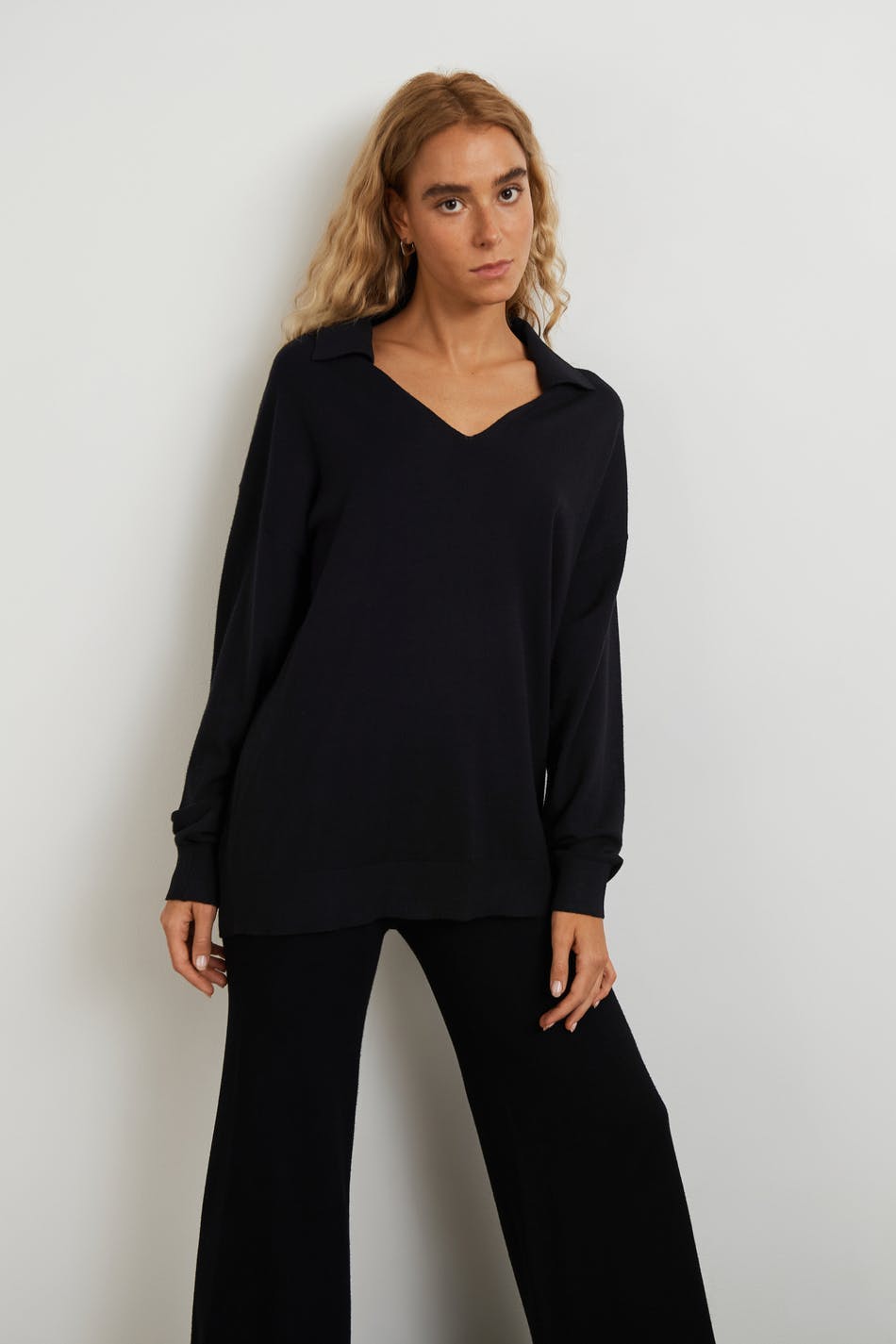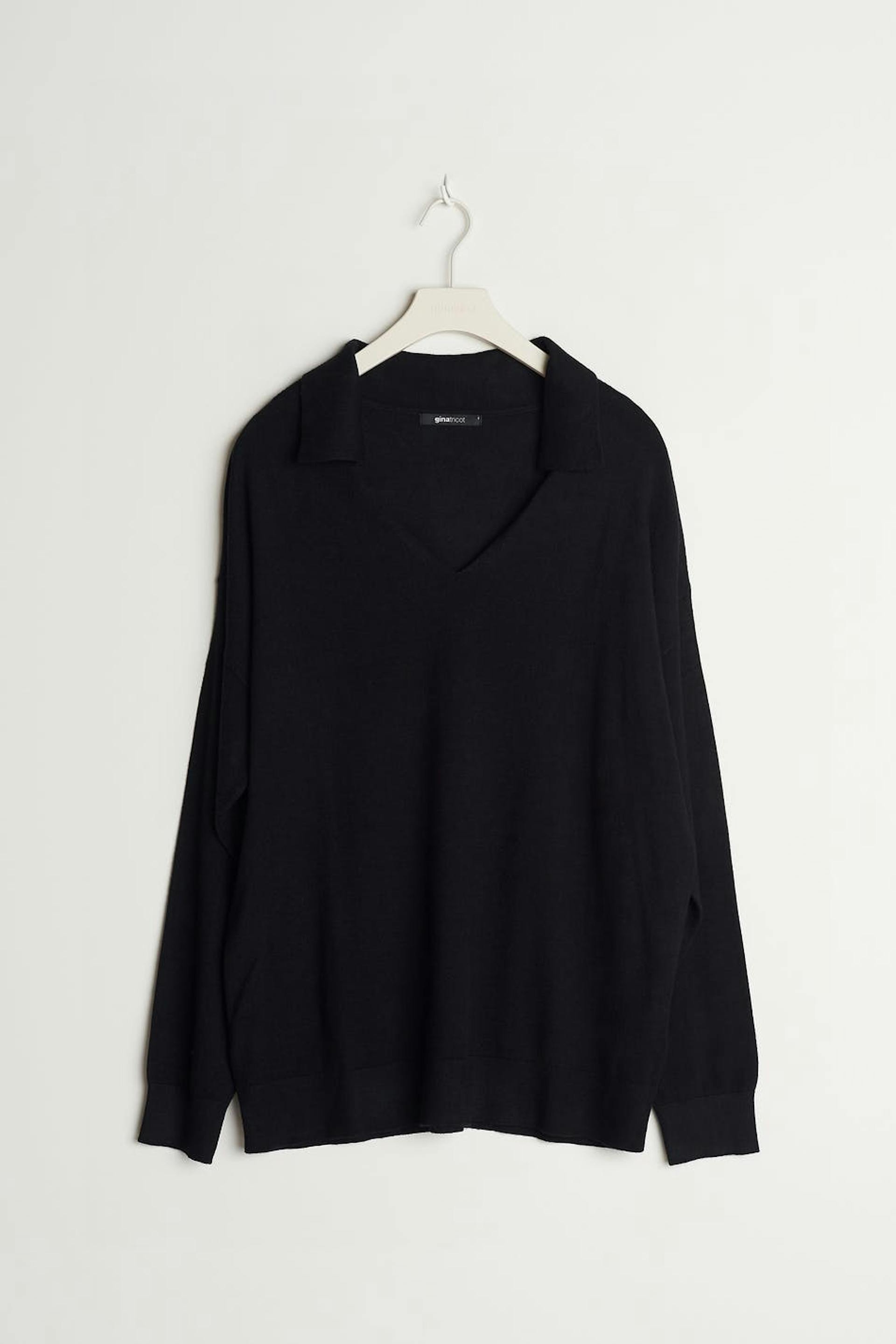 Fine-knitted jumper with loose-fitting style. The jumper is black and has a V-neck. It has a collar, dropped shoulders and a ribbed cuff on the sleeve ends and at the bottom hem.