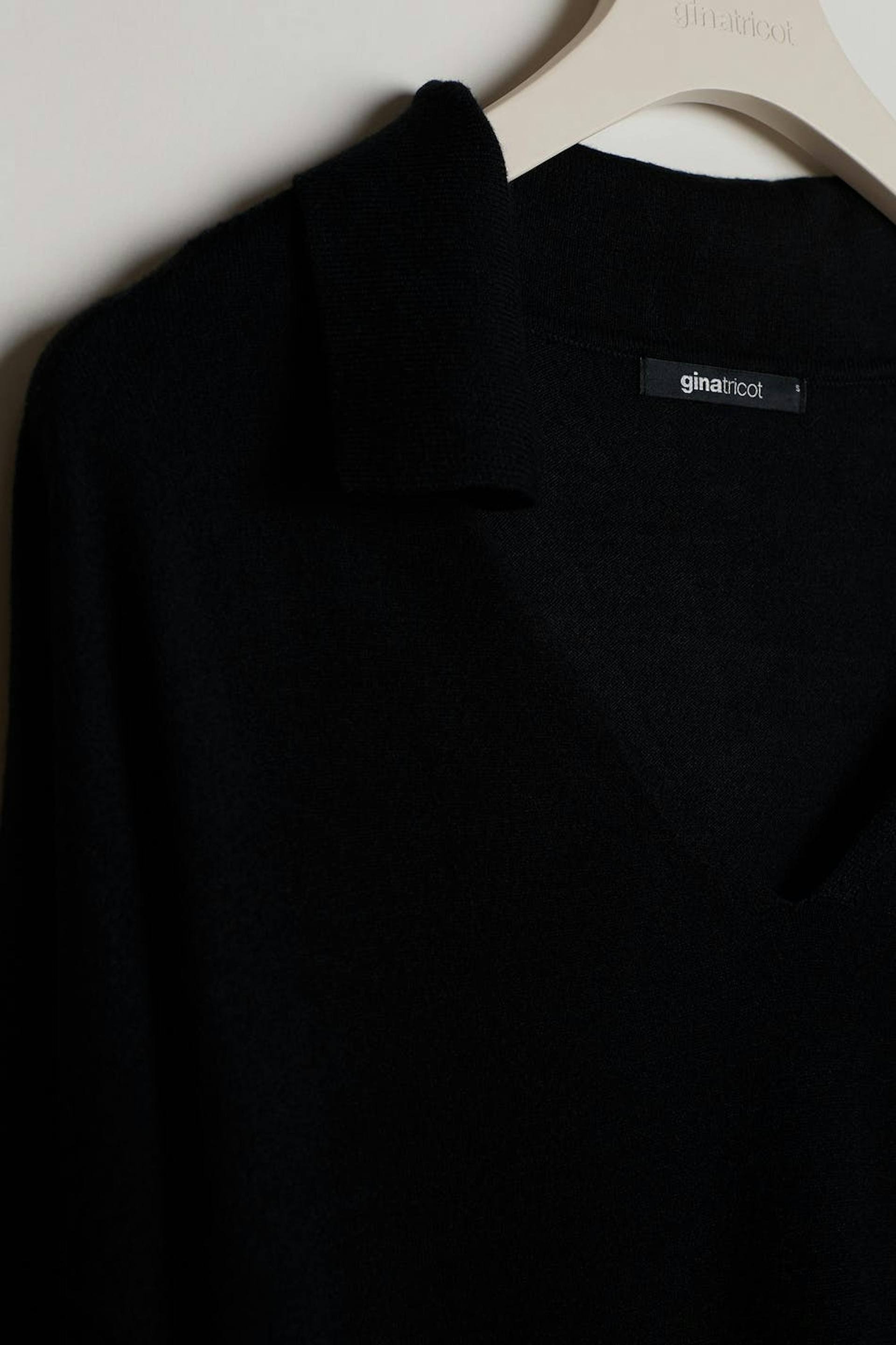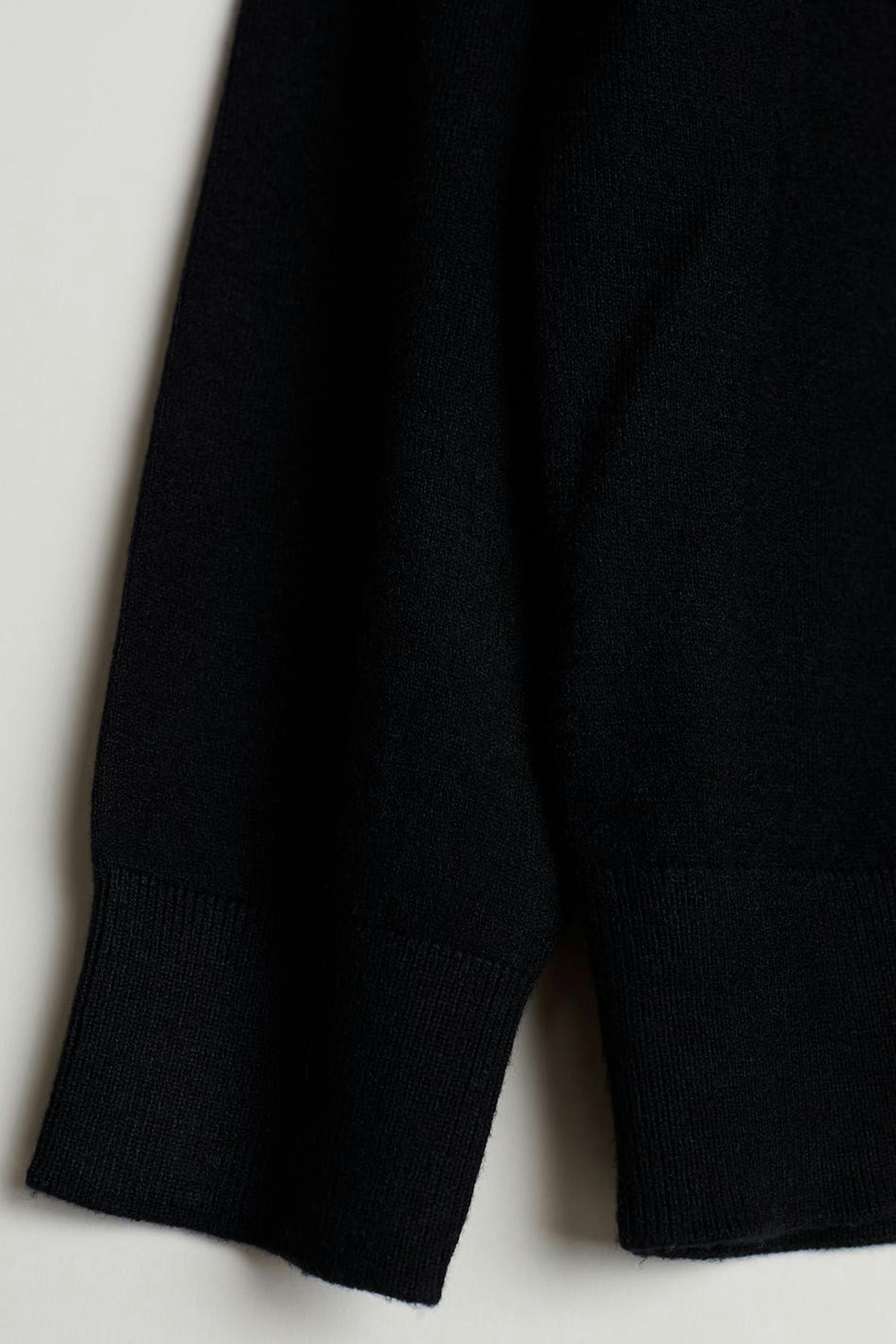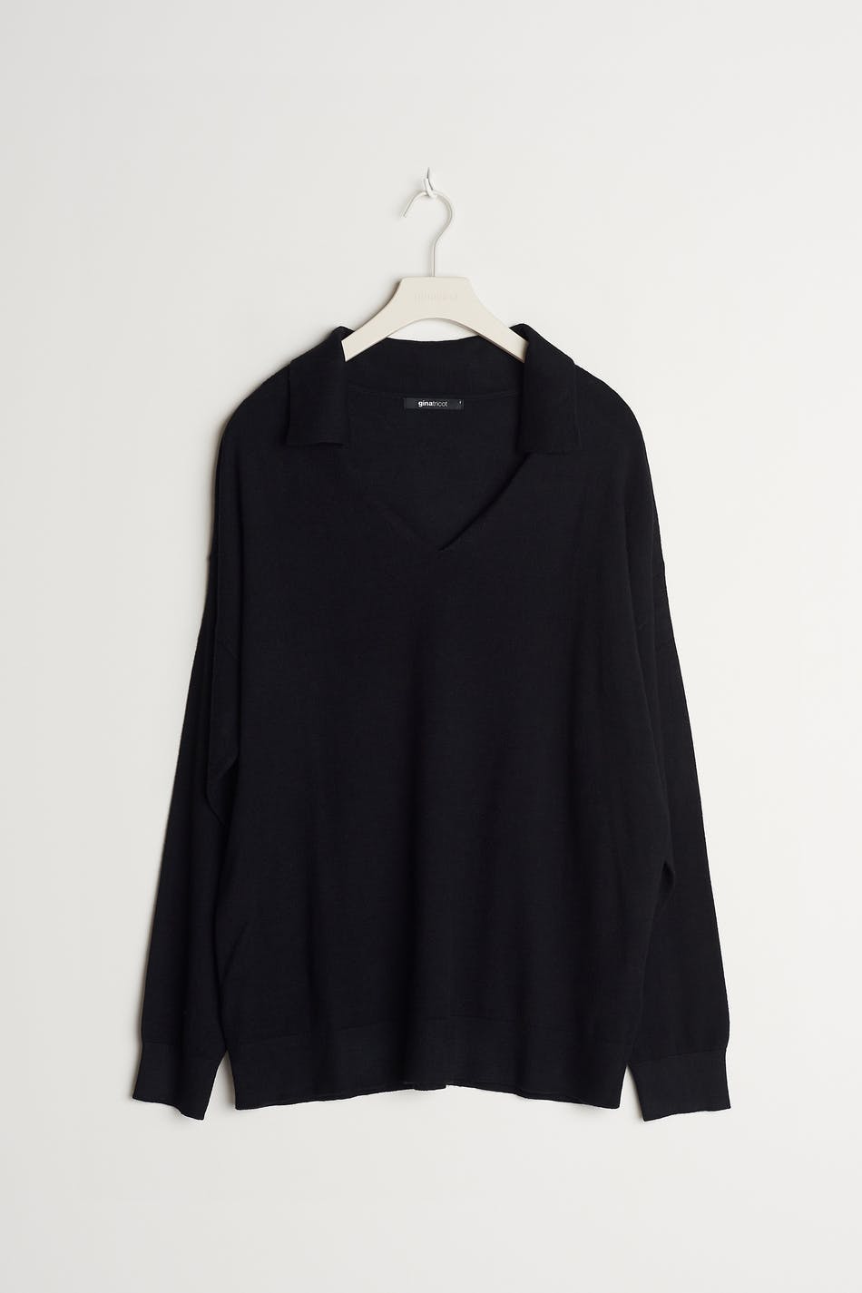 Fine-knitted jumper with loose-fitting style. The jumper is black and has a V-neck. It has a collar, dropped shoulders and a ribbed cuff on the sleeve ends and at the bottom hem.