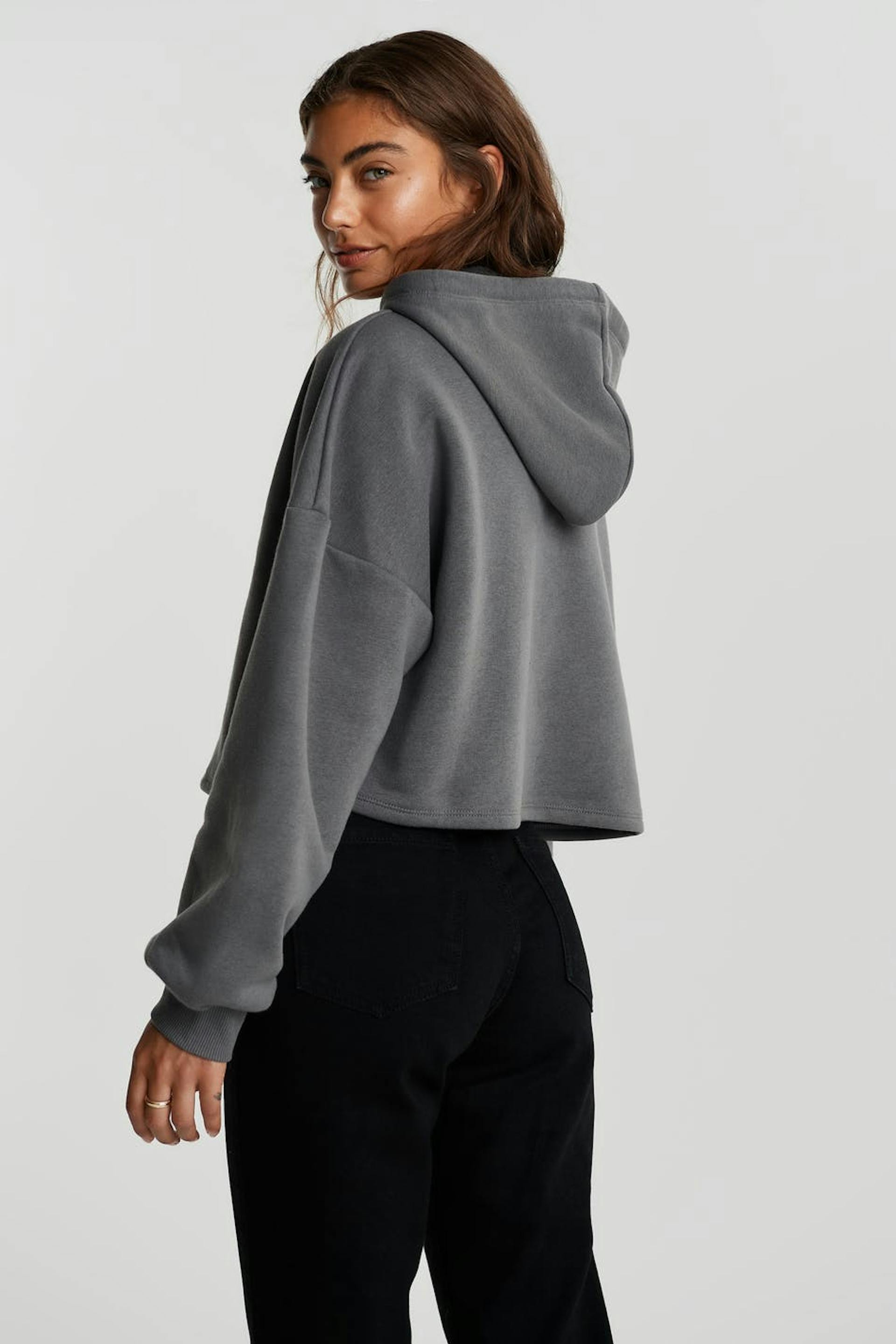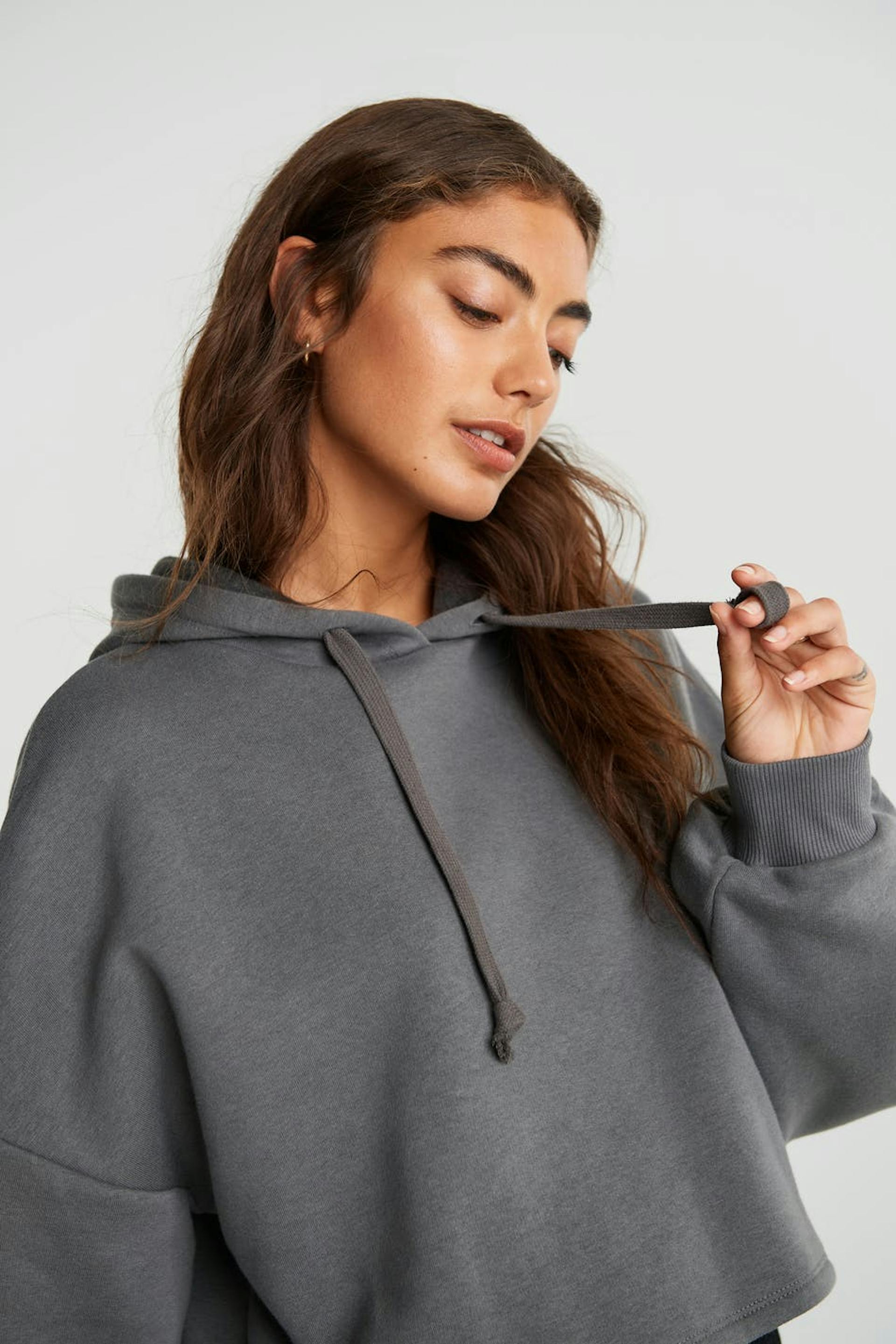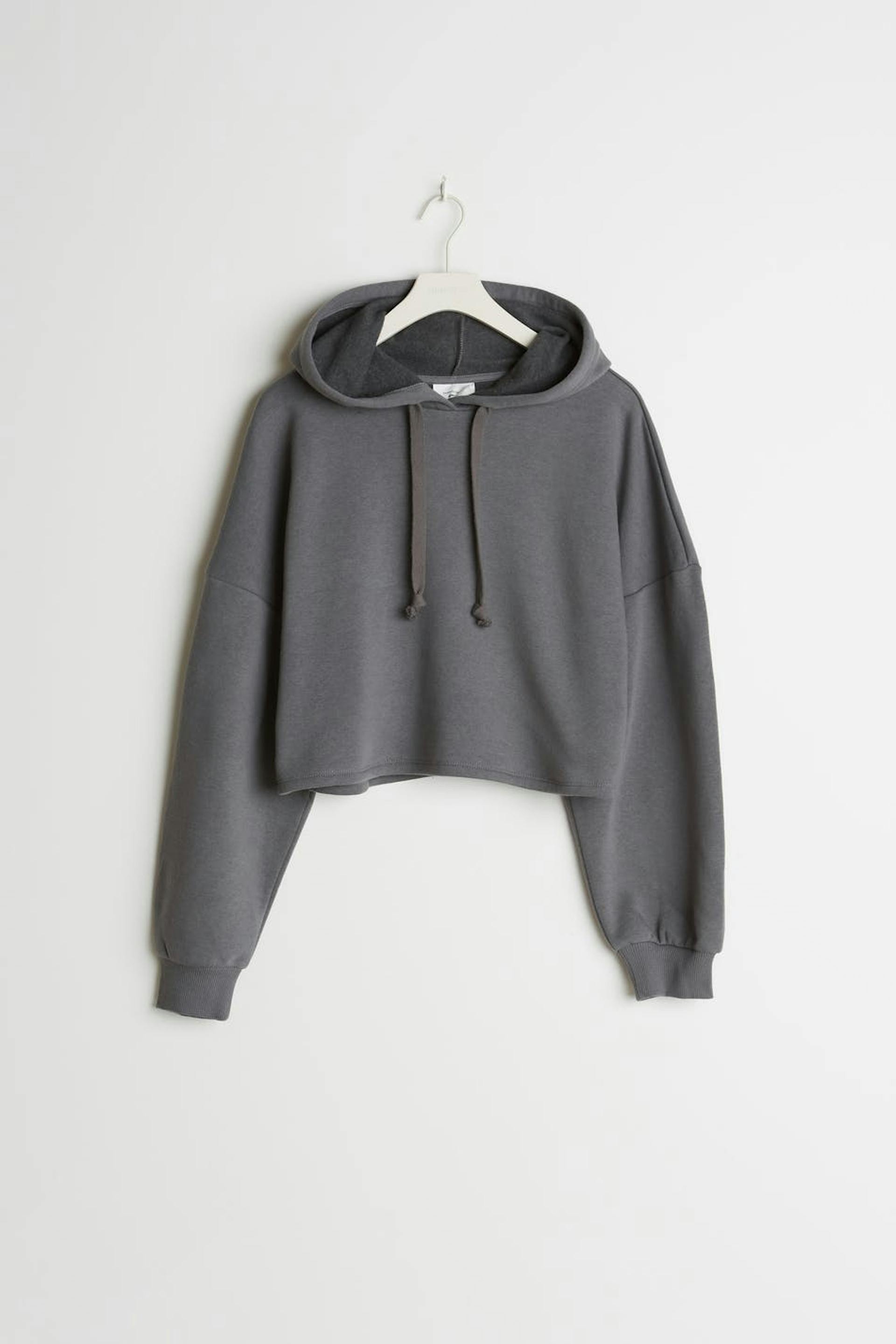 Short sweatshirt with a generous fit. The sweatshirt is grey and has hood with lacing. It has a ribbed cuff on the sleeve ends.