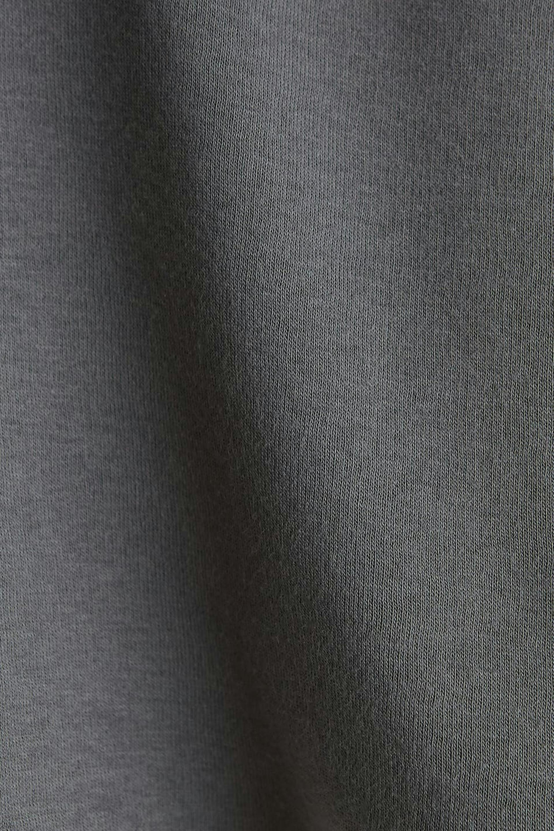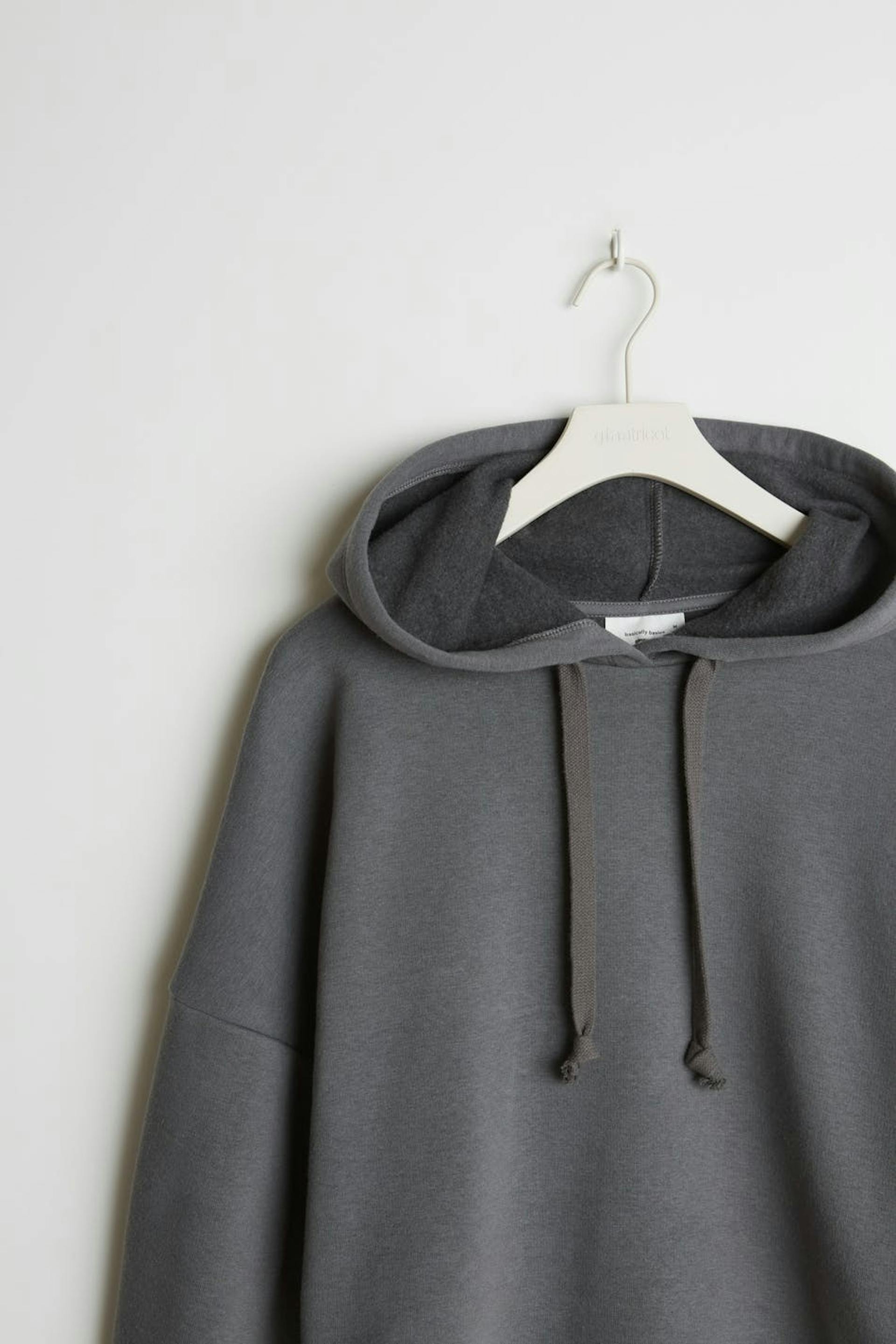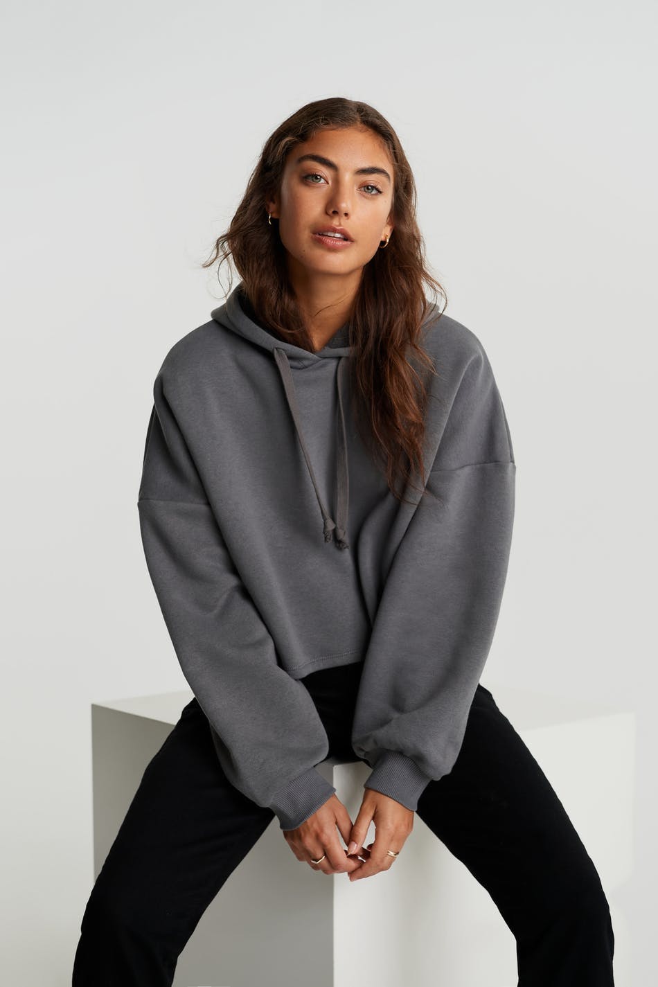 Short sweatshirt with a generous fit. The sweatshirt is grey and has hood with lacing. It has a ribbed cuff on the sleeve ends.