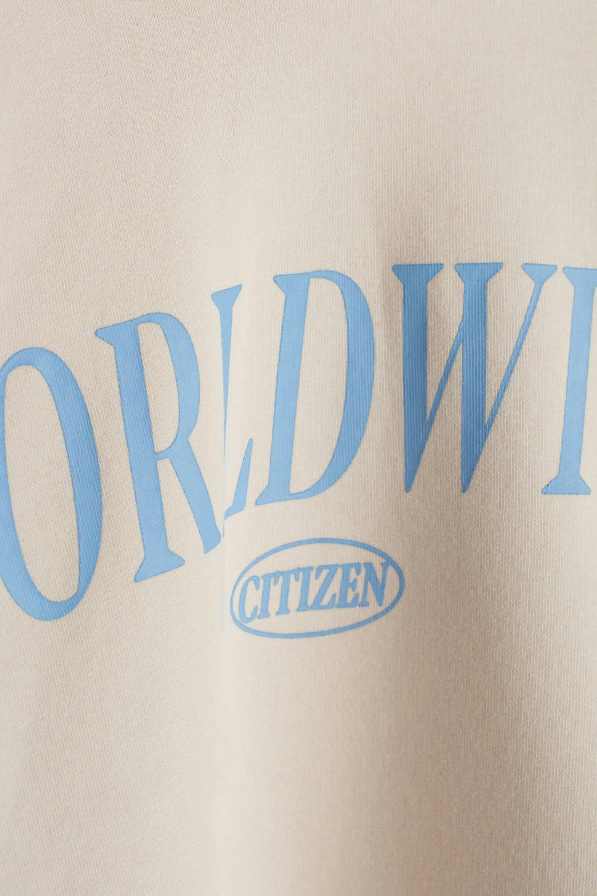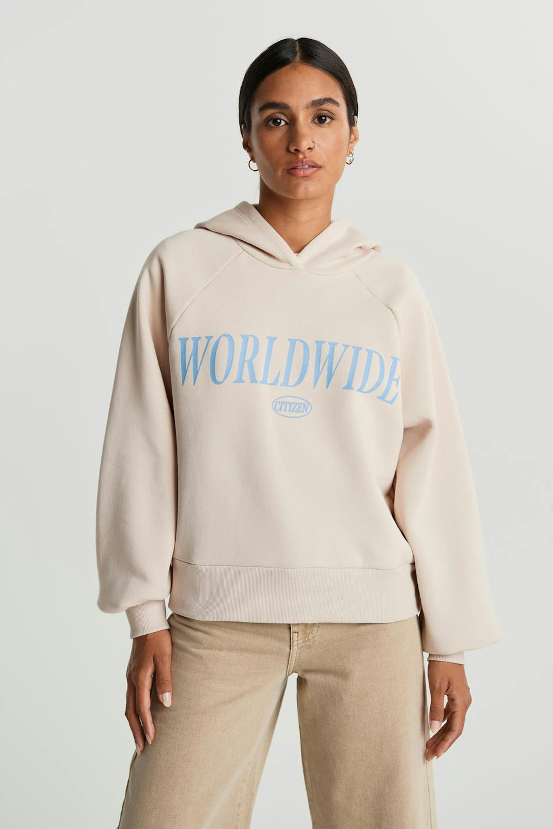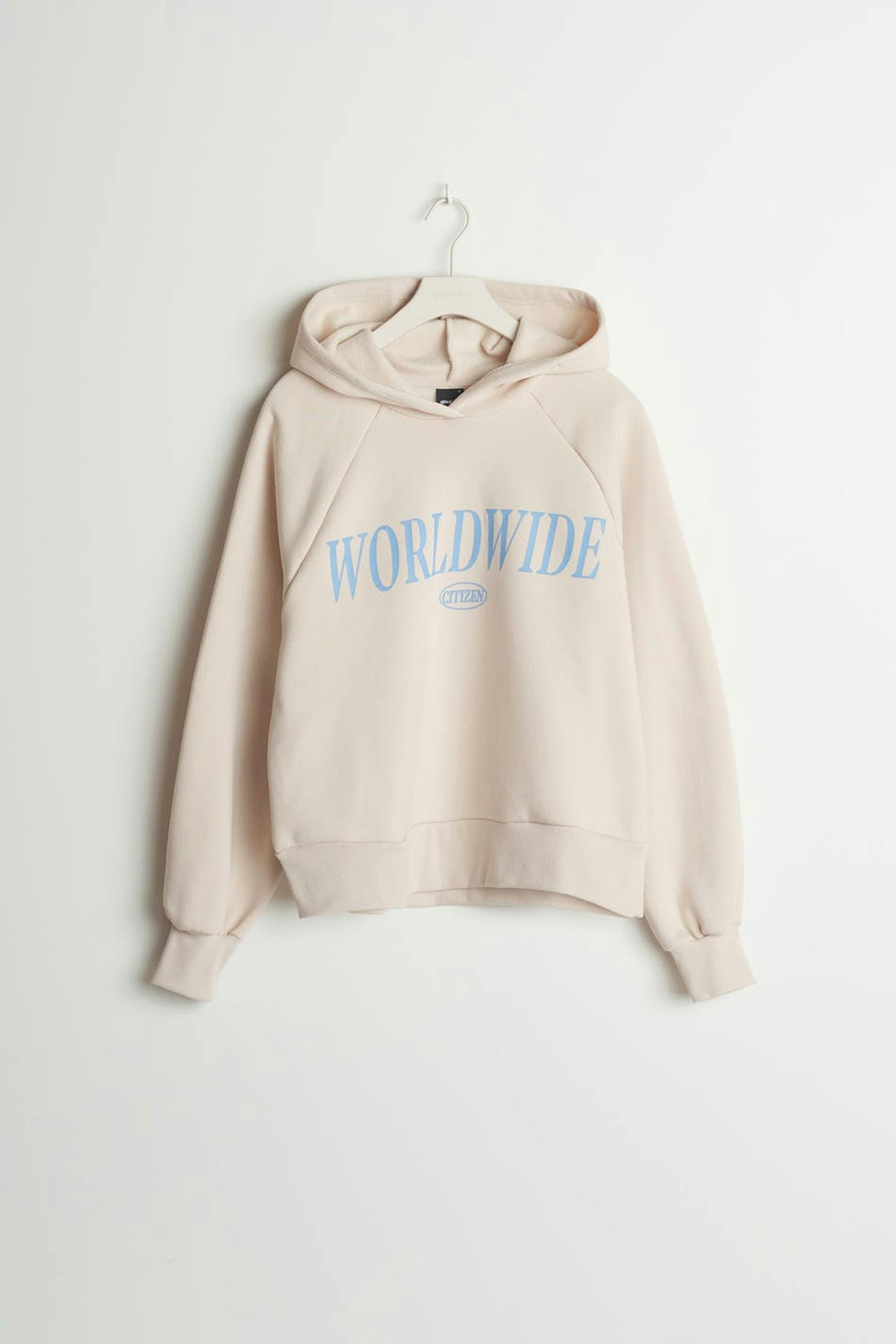 Sweatshirt with a generous fit. The sweatshirt is white and has a hood. It has a print at the front and an elastic band on the sleeve ends and at the hem.