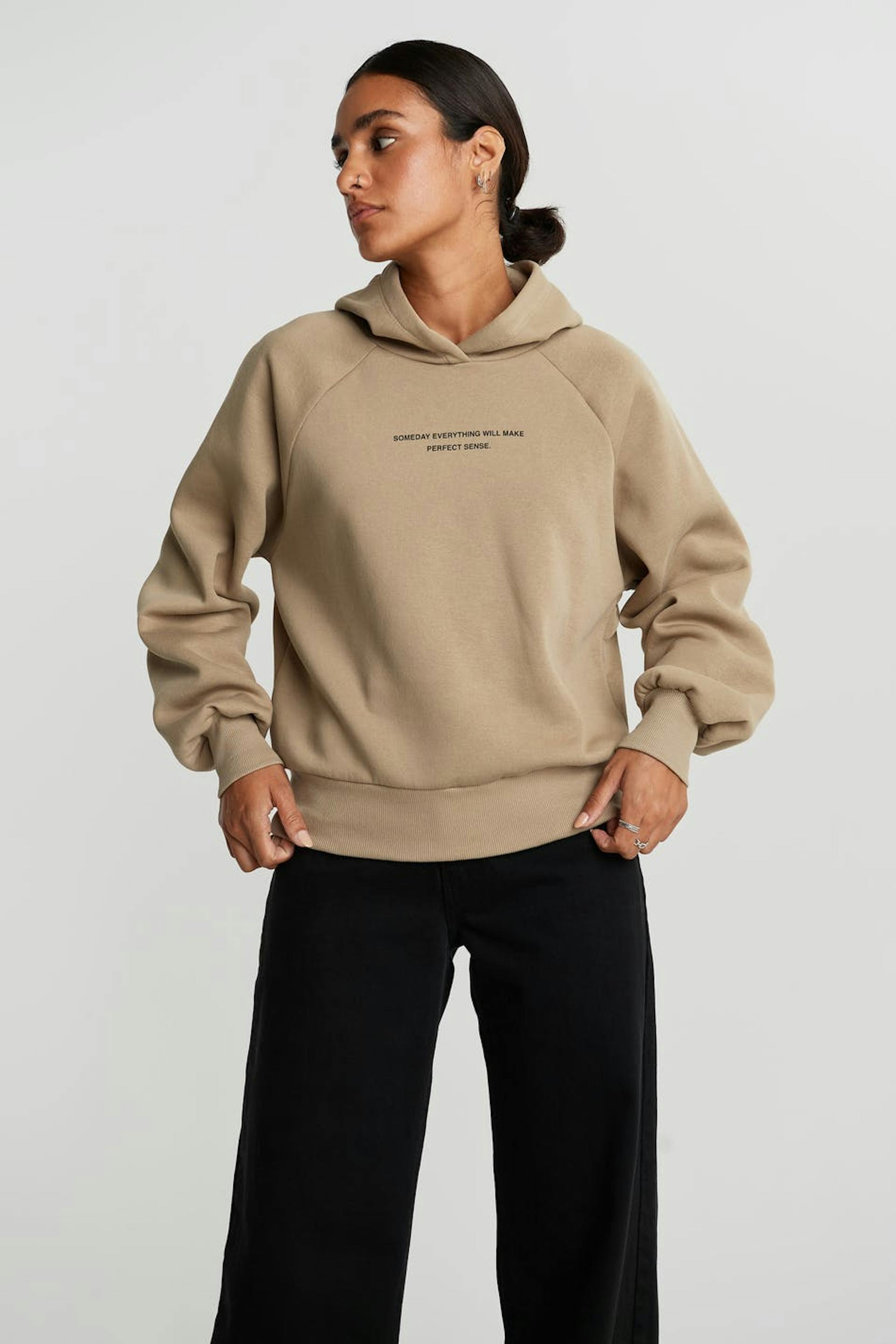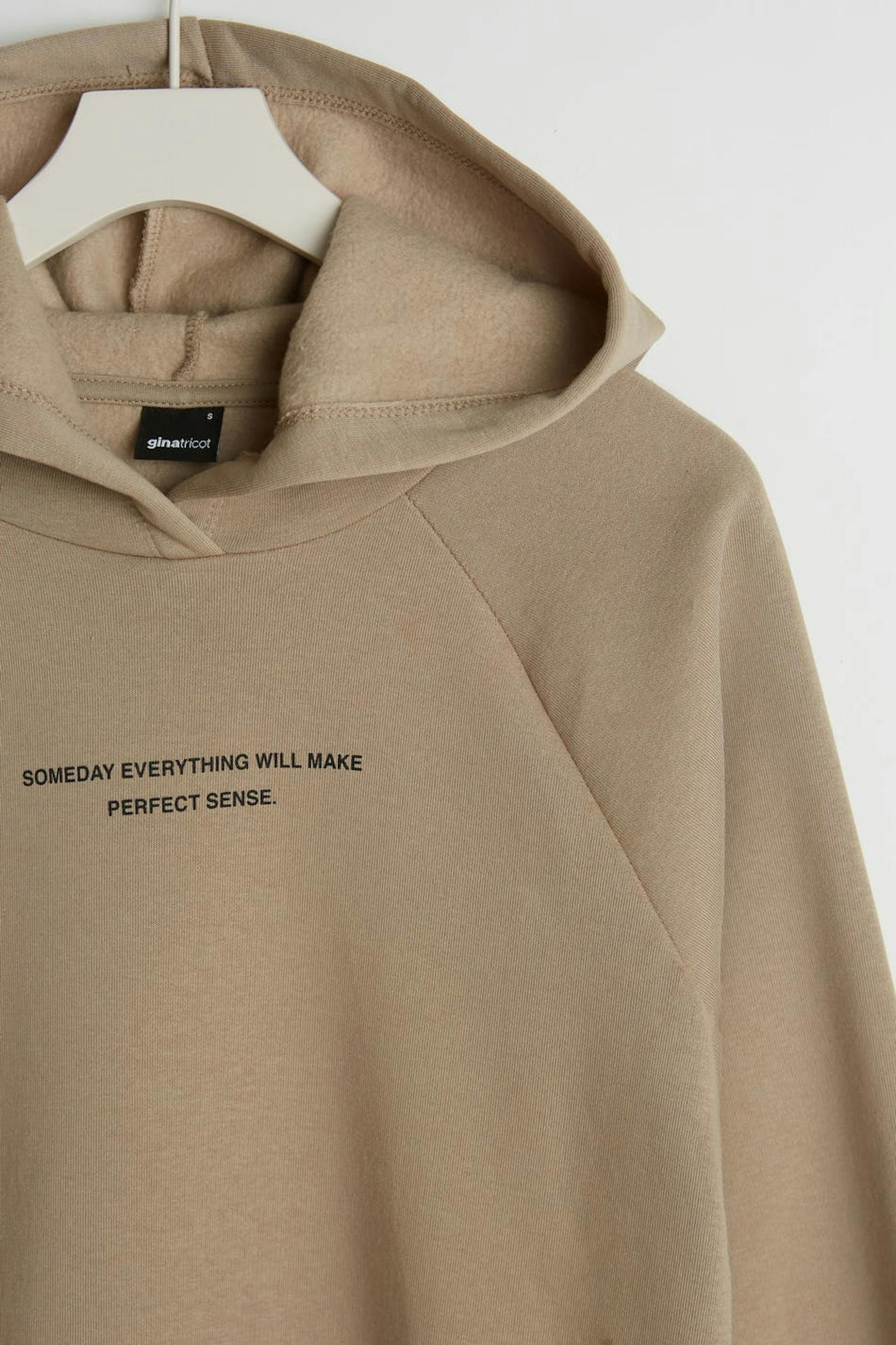 Sweatshirt with a generous fit. The sweatshirt is beige and has a hood. It has a print at the front and an elastic band on the sleeve ends and at the hem.