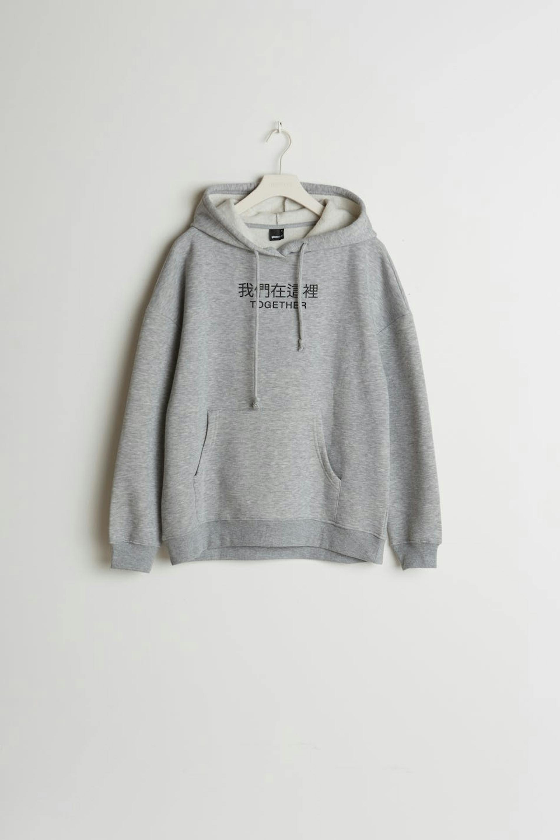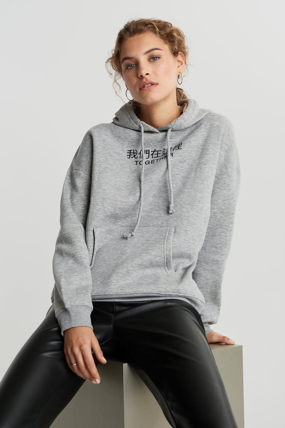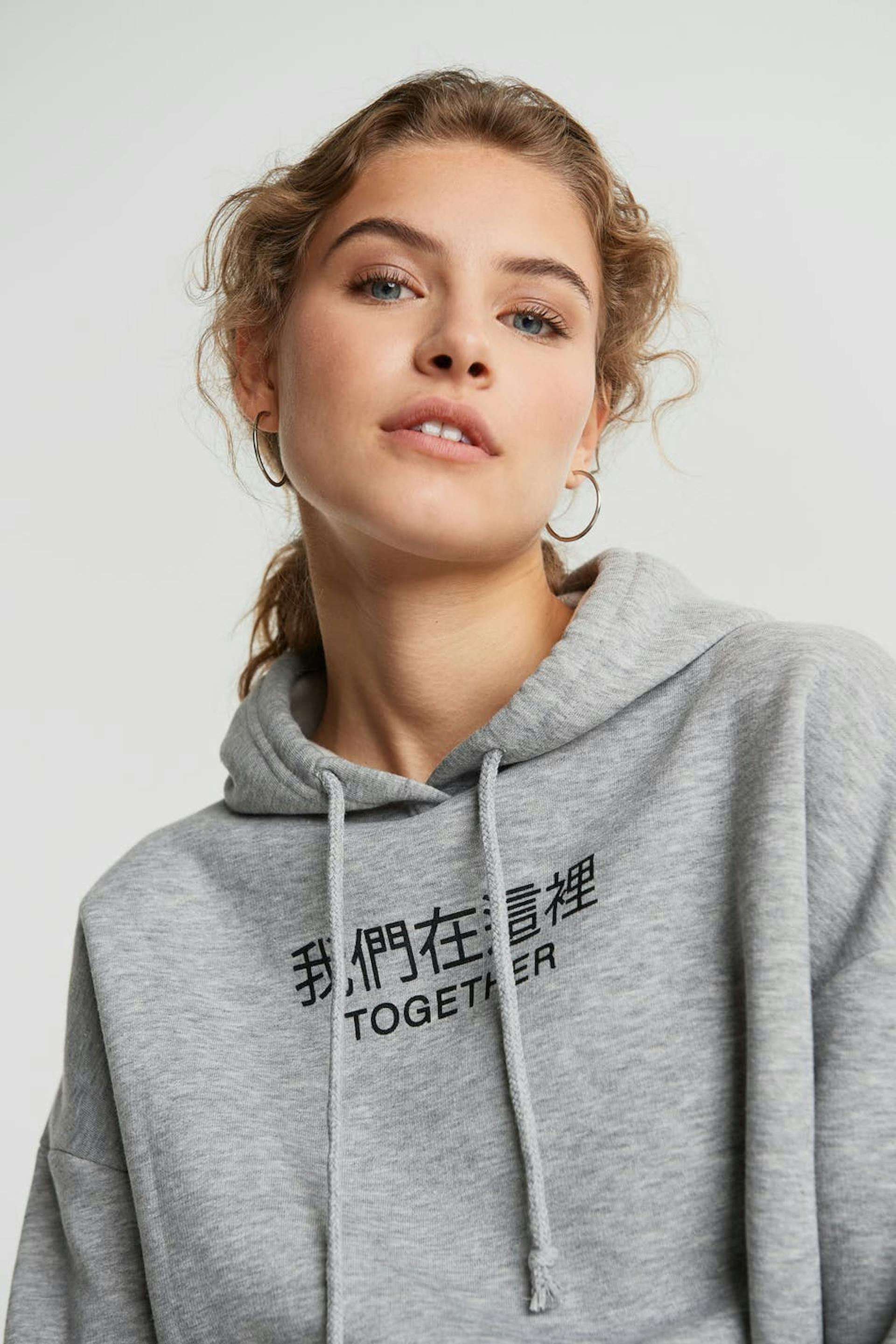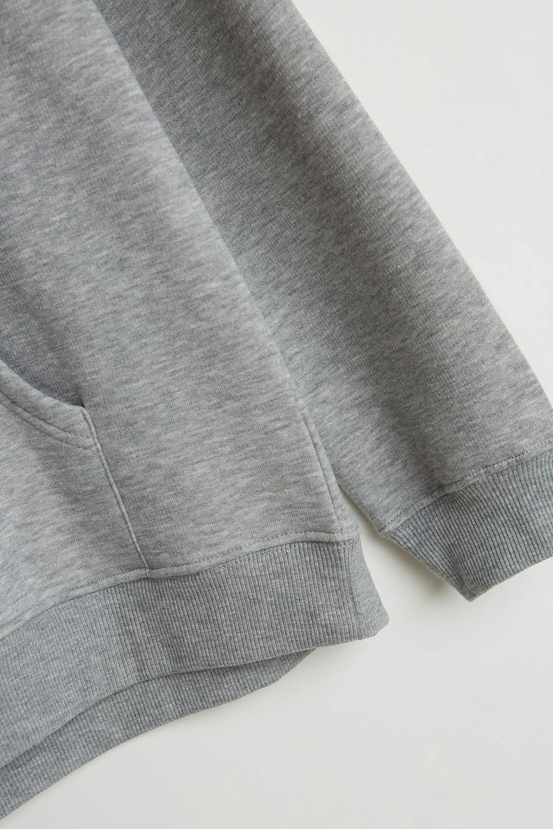 Sweatshirt with a generous fit. The sweatshirt is grey and has a pocket on the front. It has a hood with a tie string.