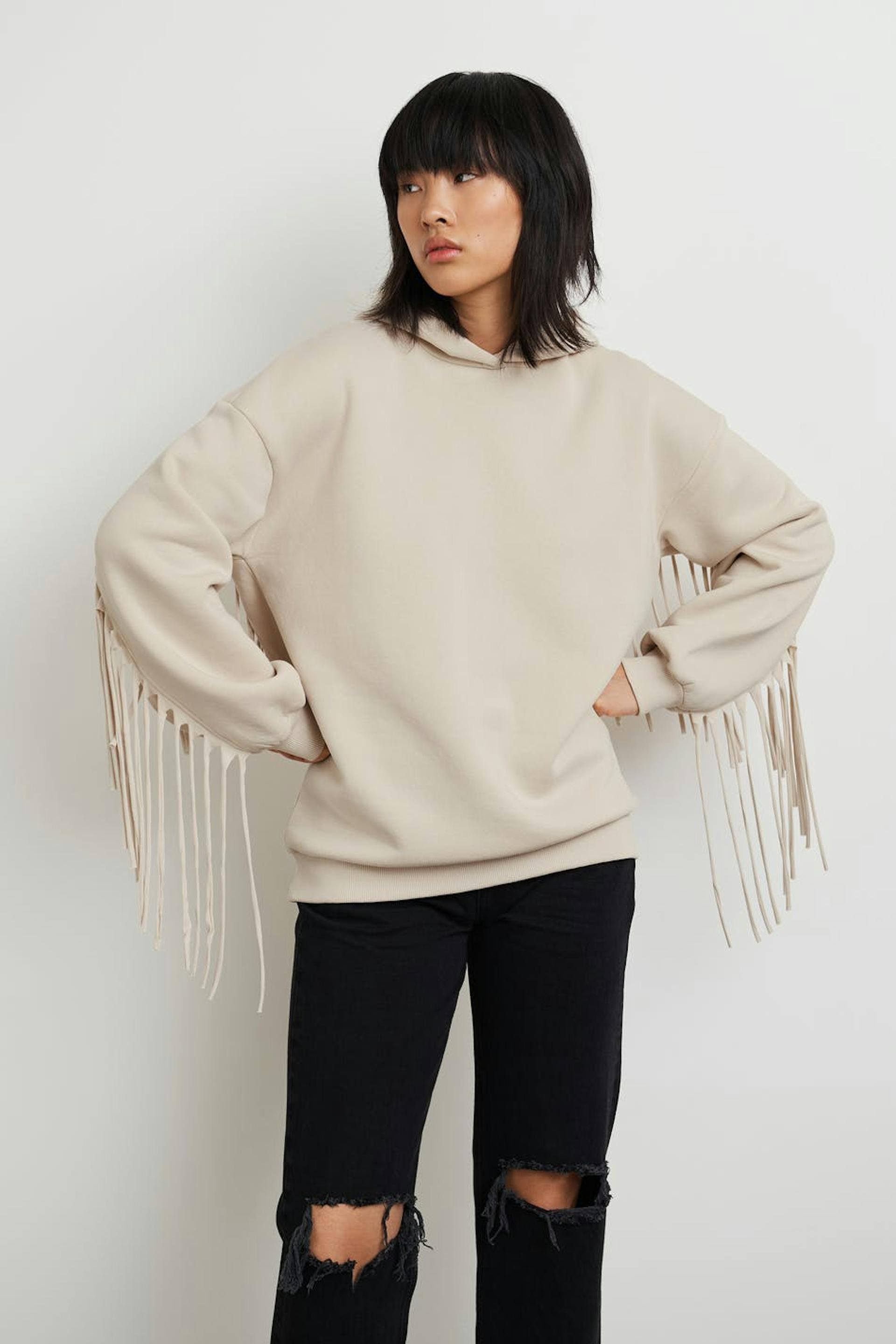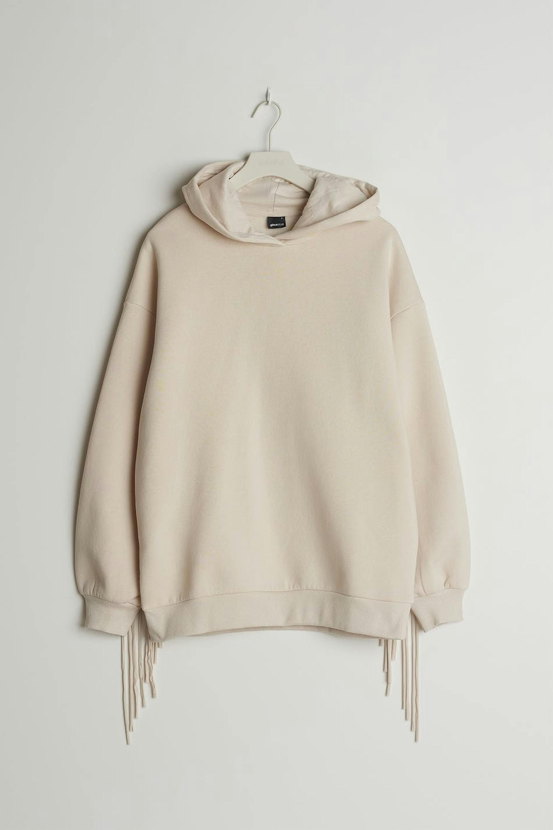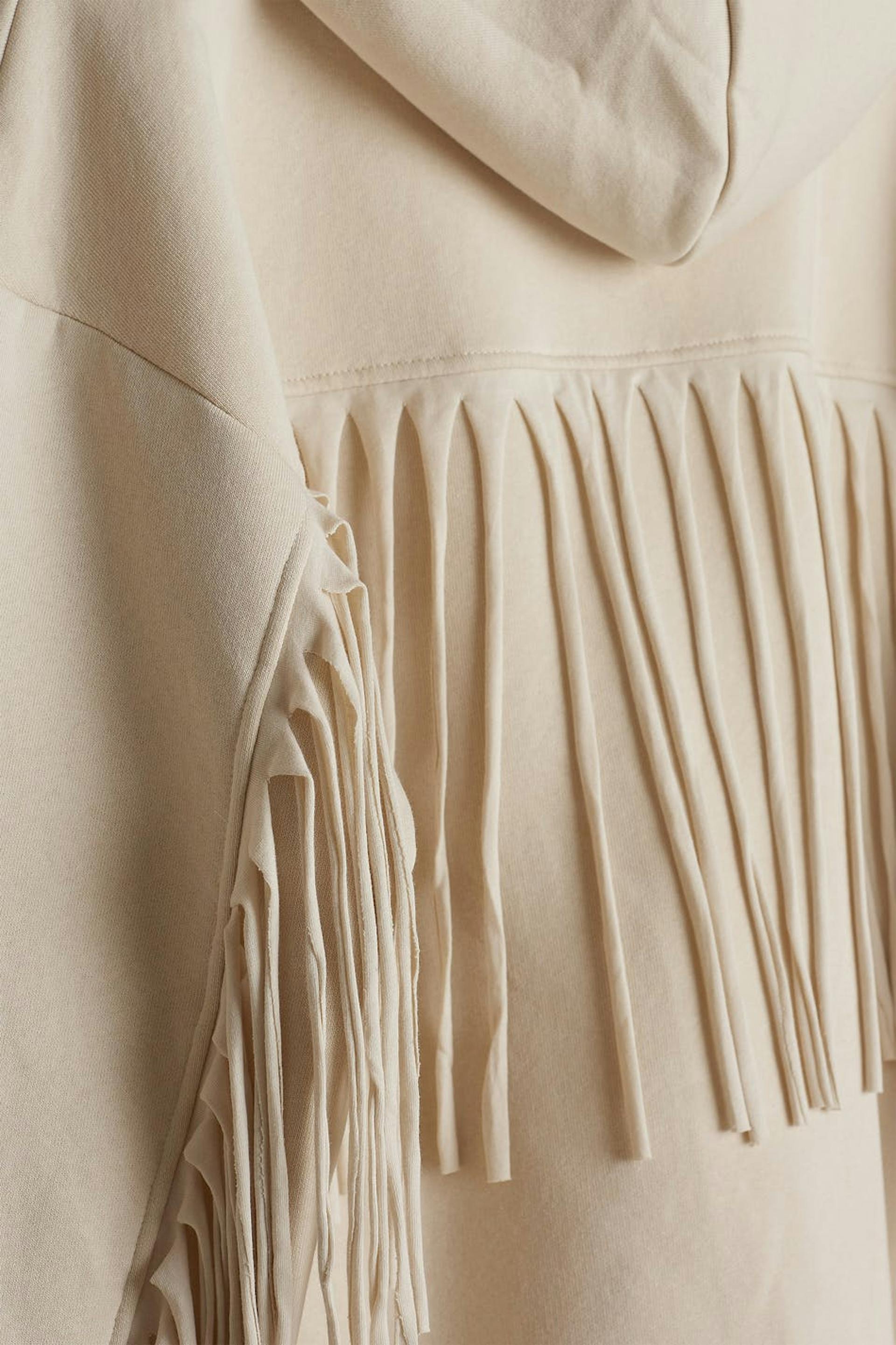Hoodie with an oversize fit. The hoodie is beige and has detail with long fringes in the back and on the sleeves. It has a ribbed cuff on the sleeve ends and at the bottom.