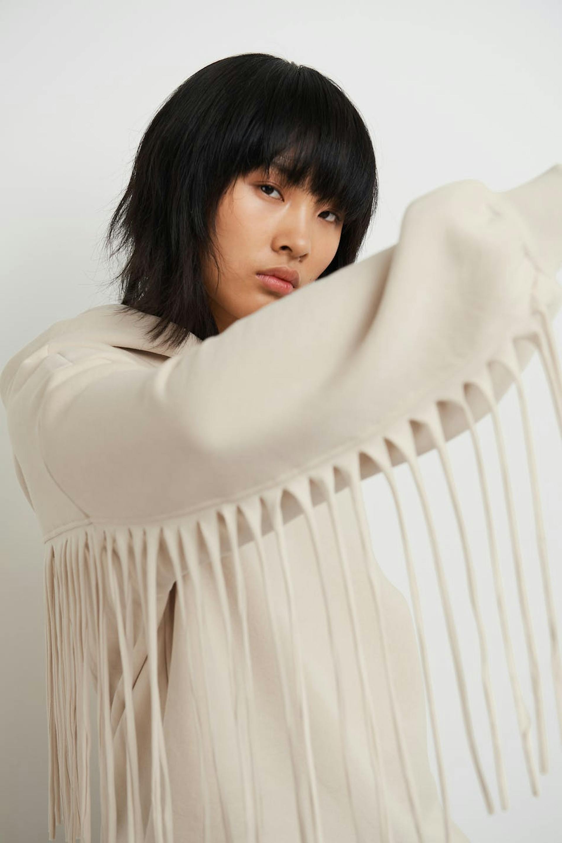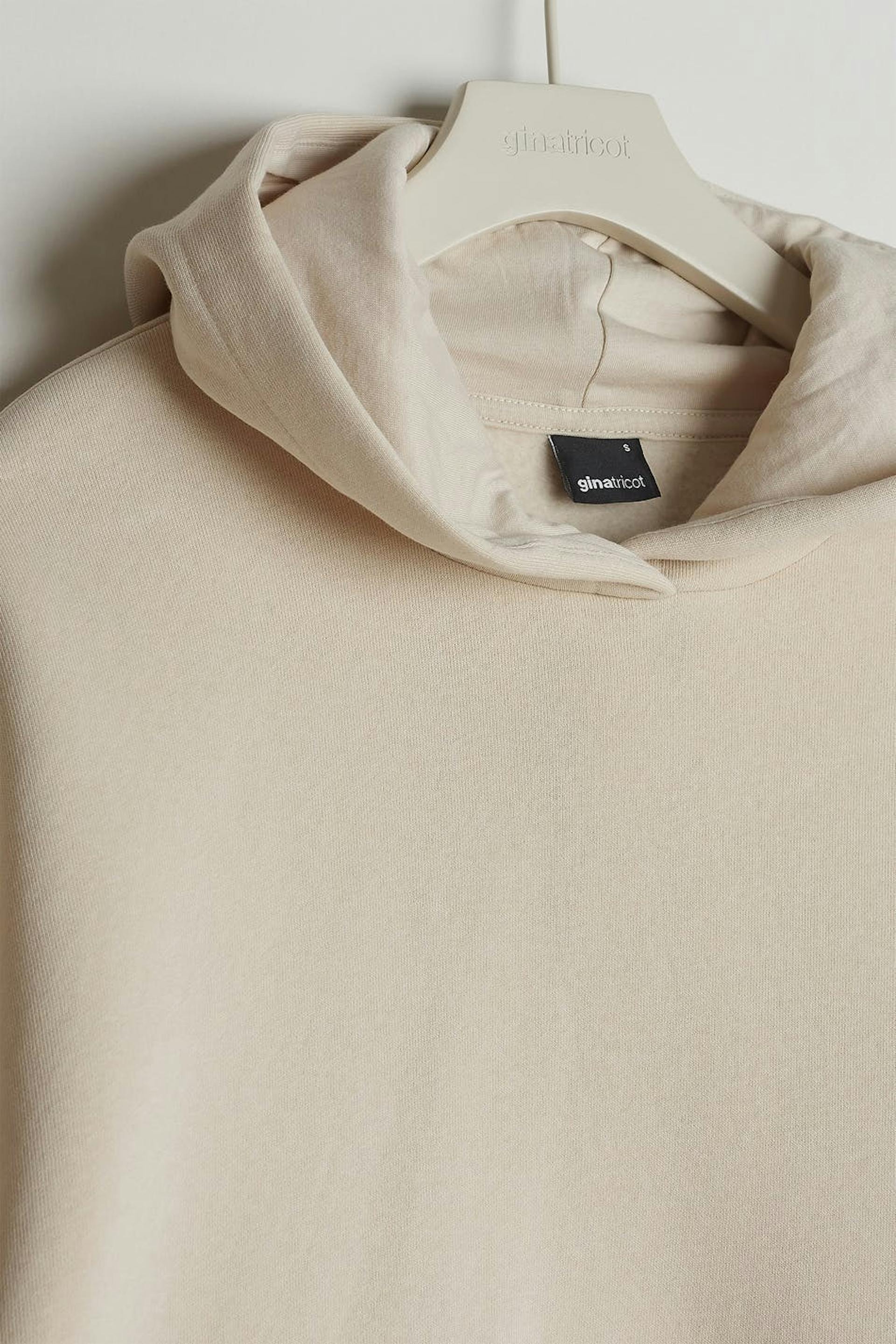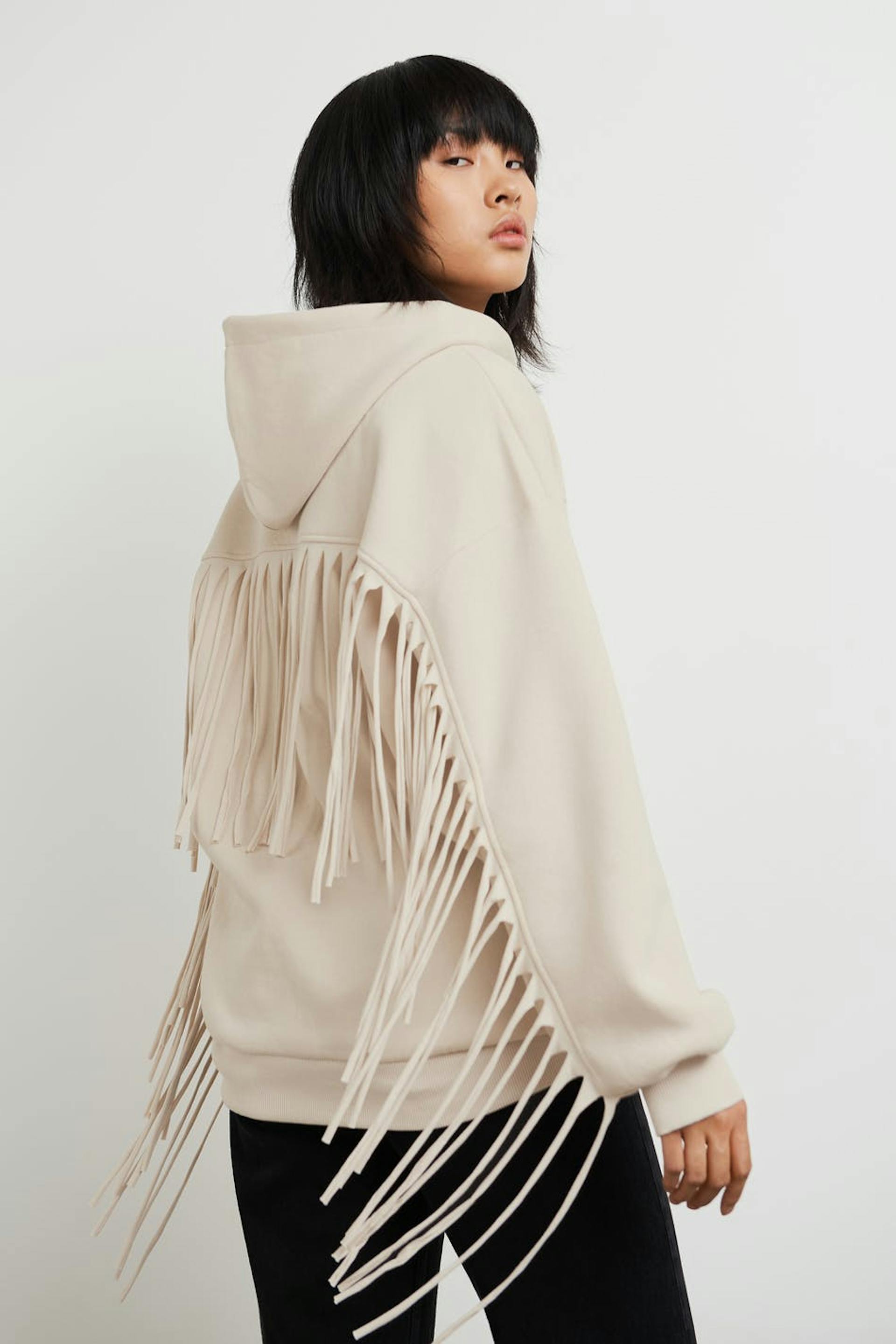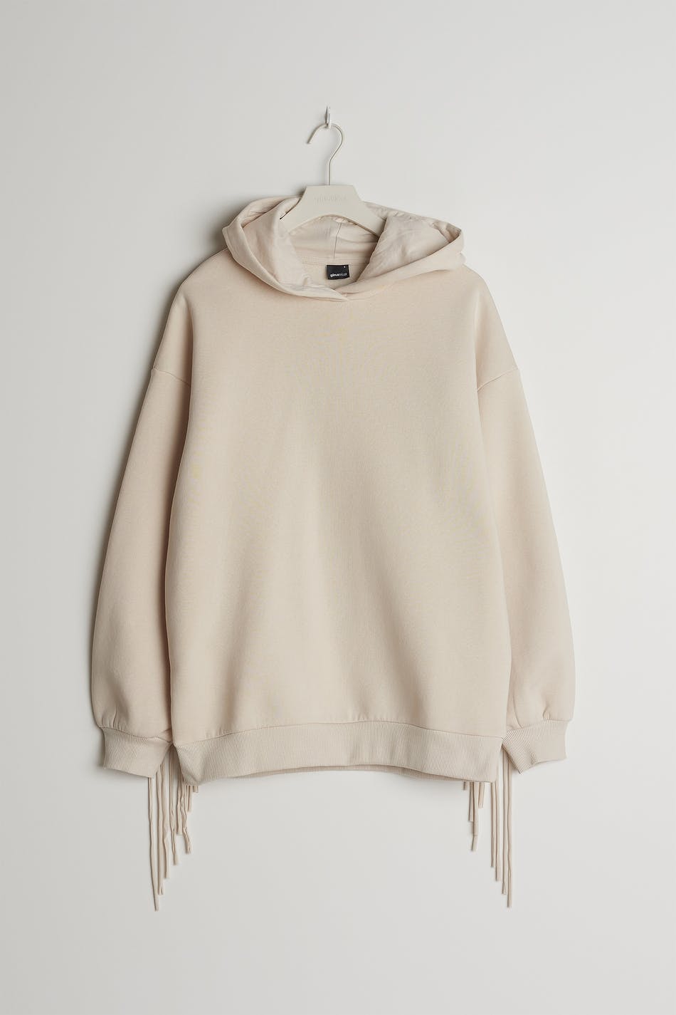 Hoodie with an oversize fit. The hoodie is beige and has detail with long fringes in the back and on the sleeves. It has a ribbed cuff on the sleeve ends and at the bottom.