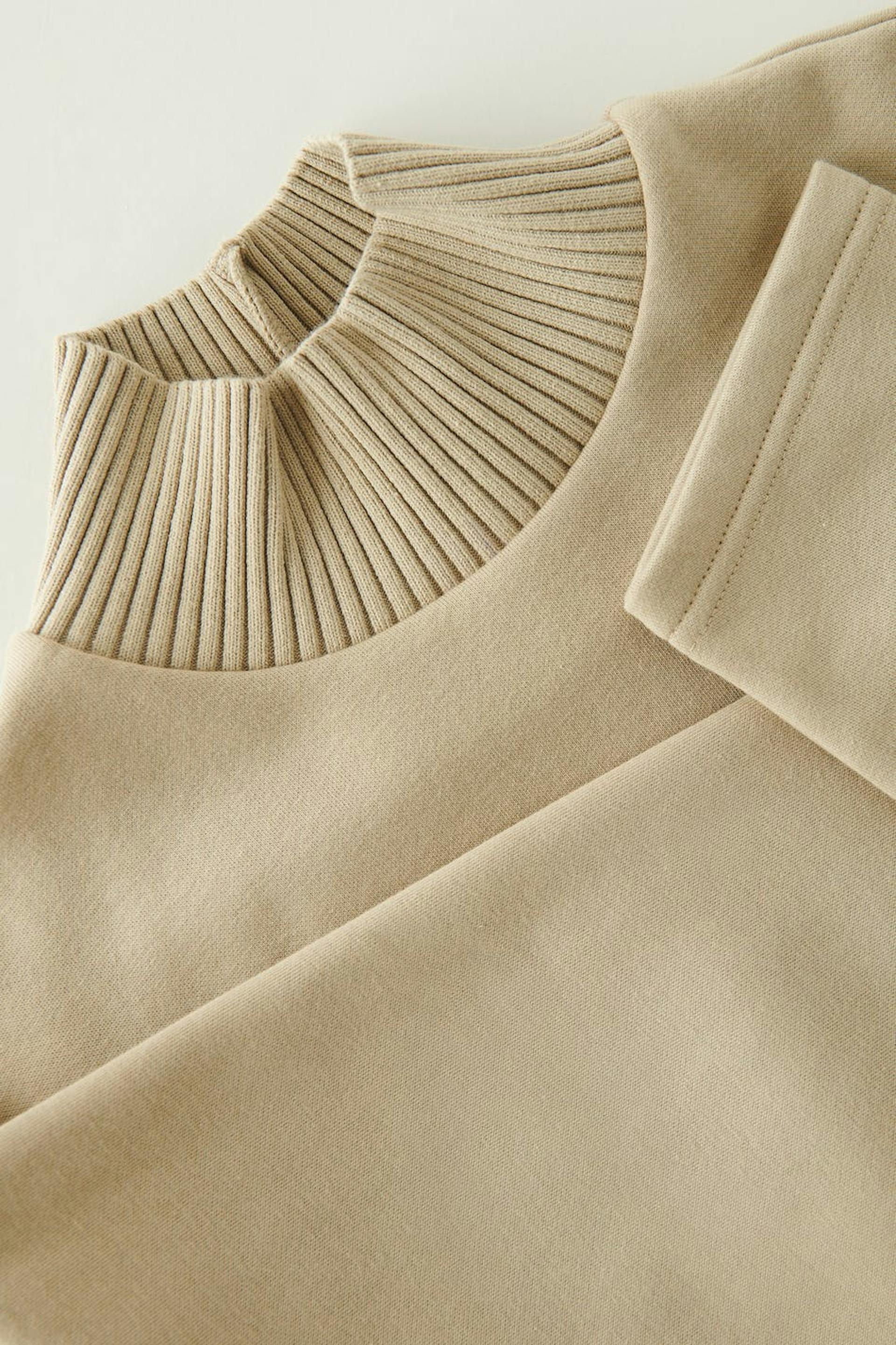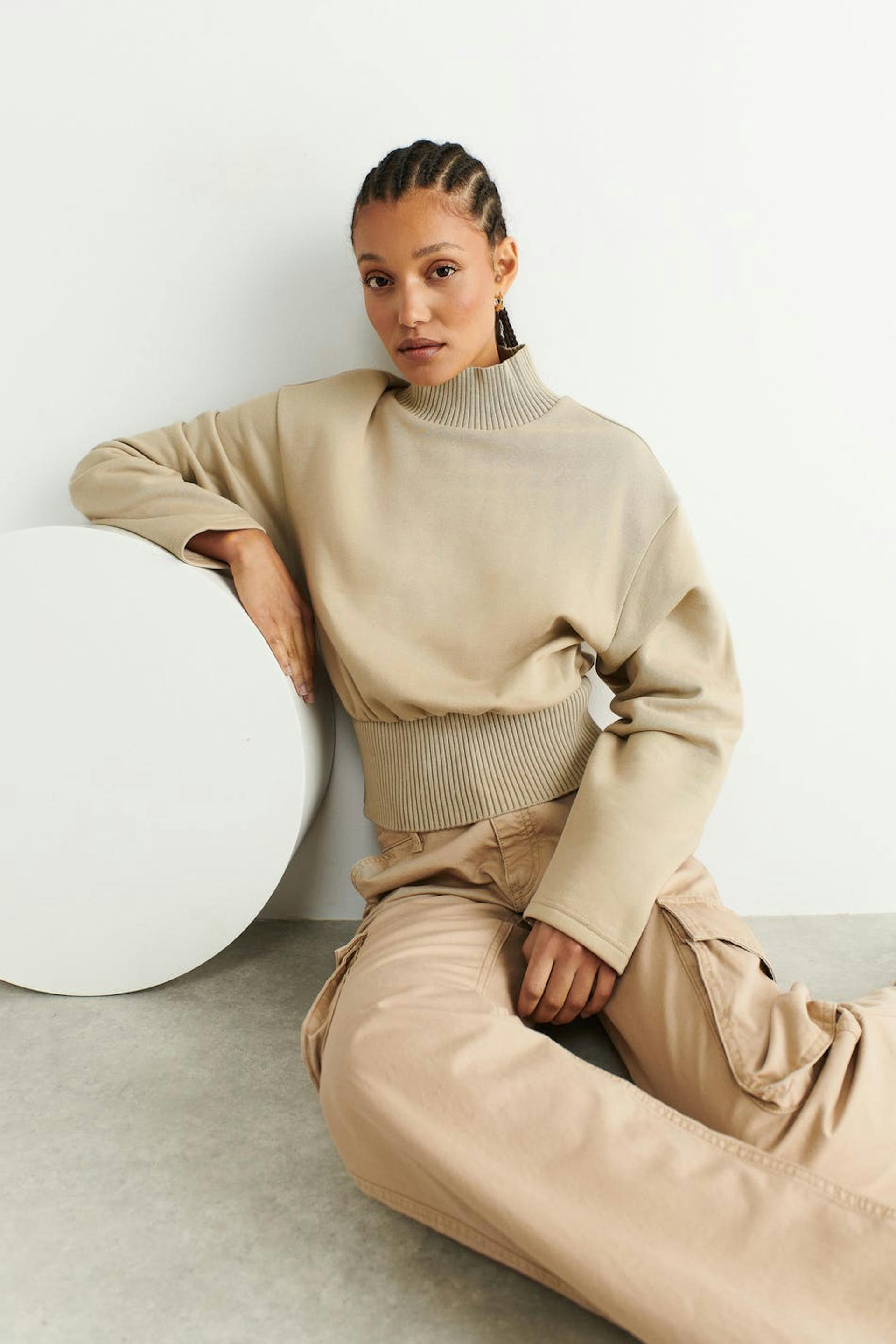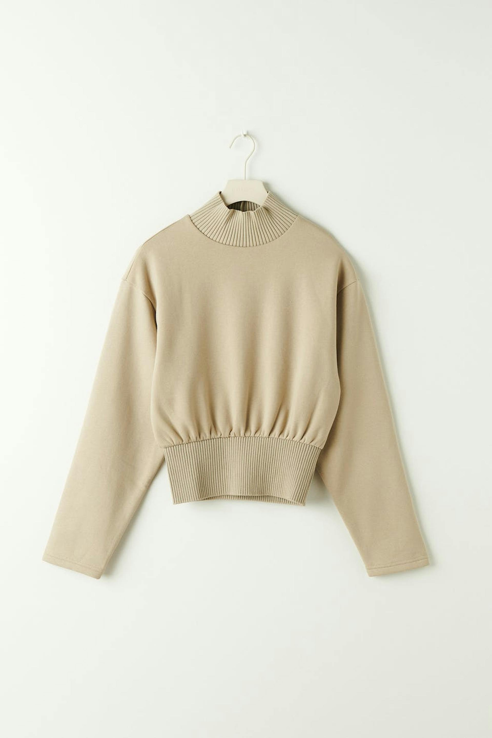 Roll-neck in jersey with relaxed fit. The jumper is beige and has ribbed collar. It has a cropped length and a wide, ribbed cuff at the bottom.