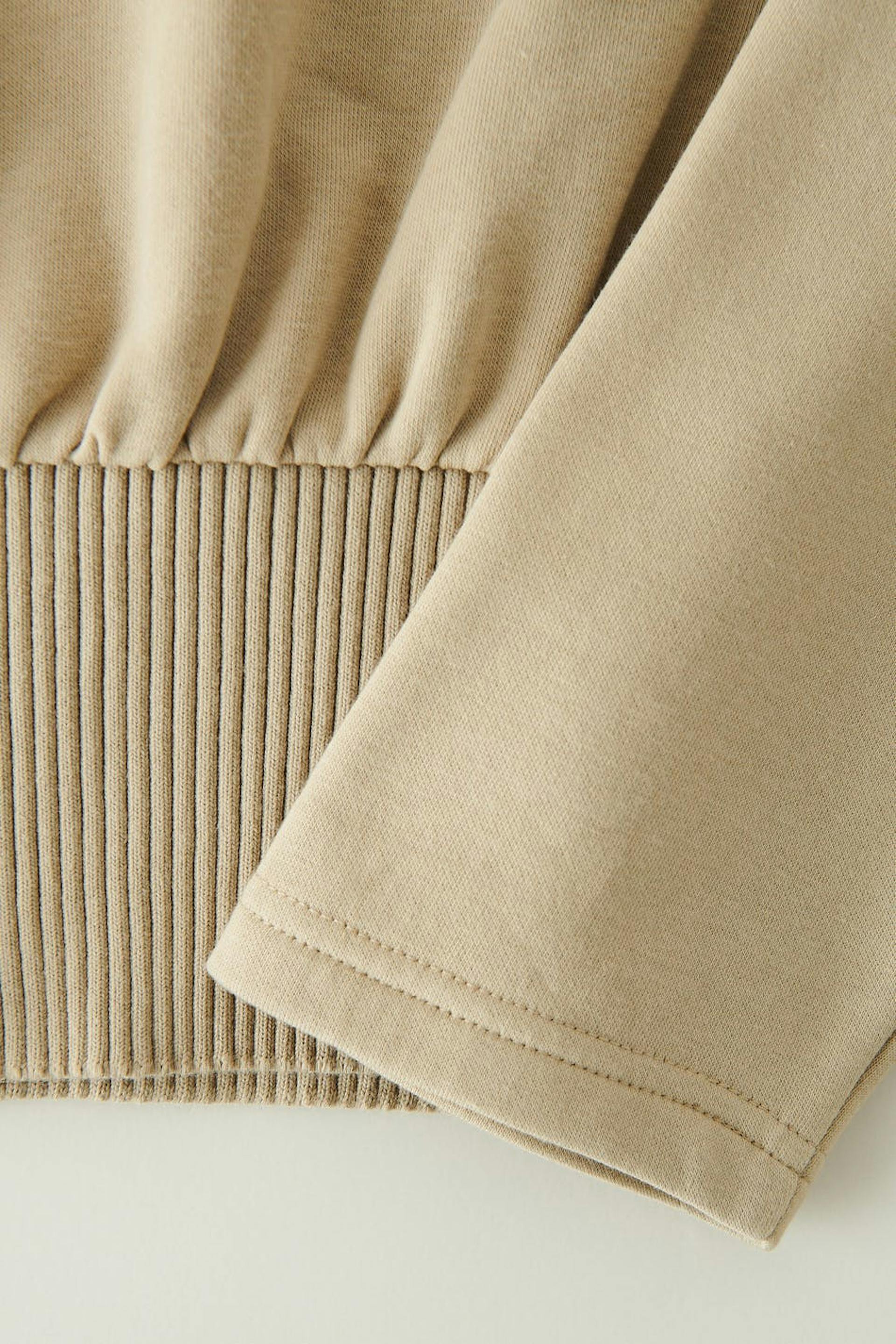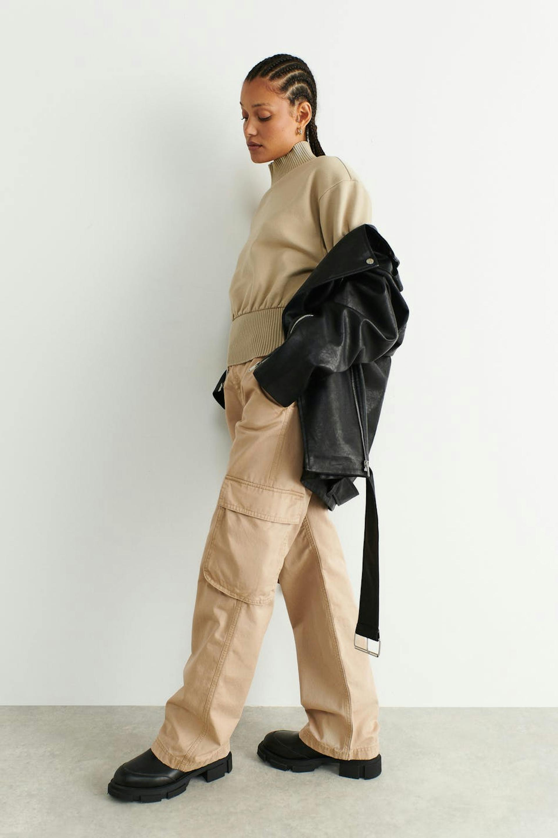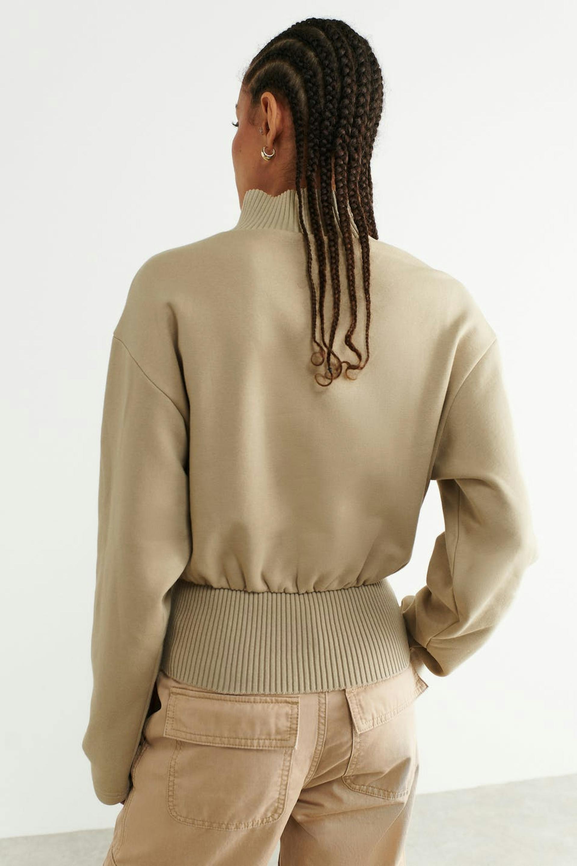 Roll-neck in jersey with relaxed fit. The jumper is beige and has ribbed collar. It has a cropped length and a wide, ribbed cuff at the bottom.