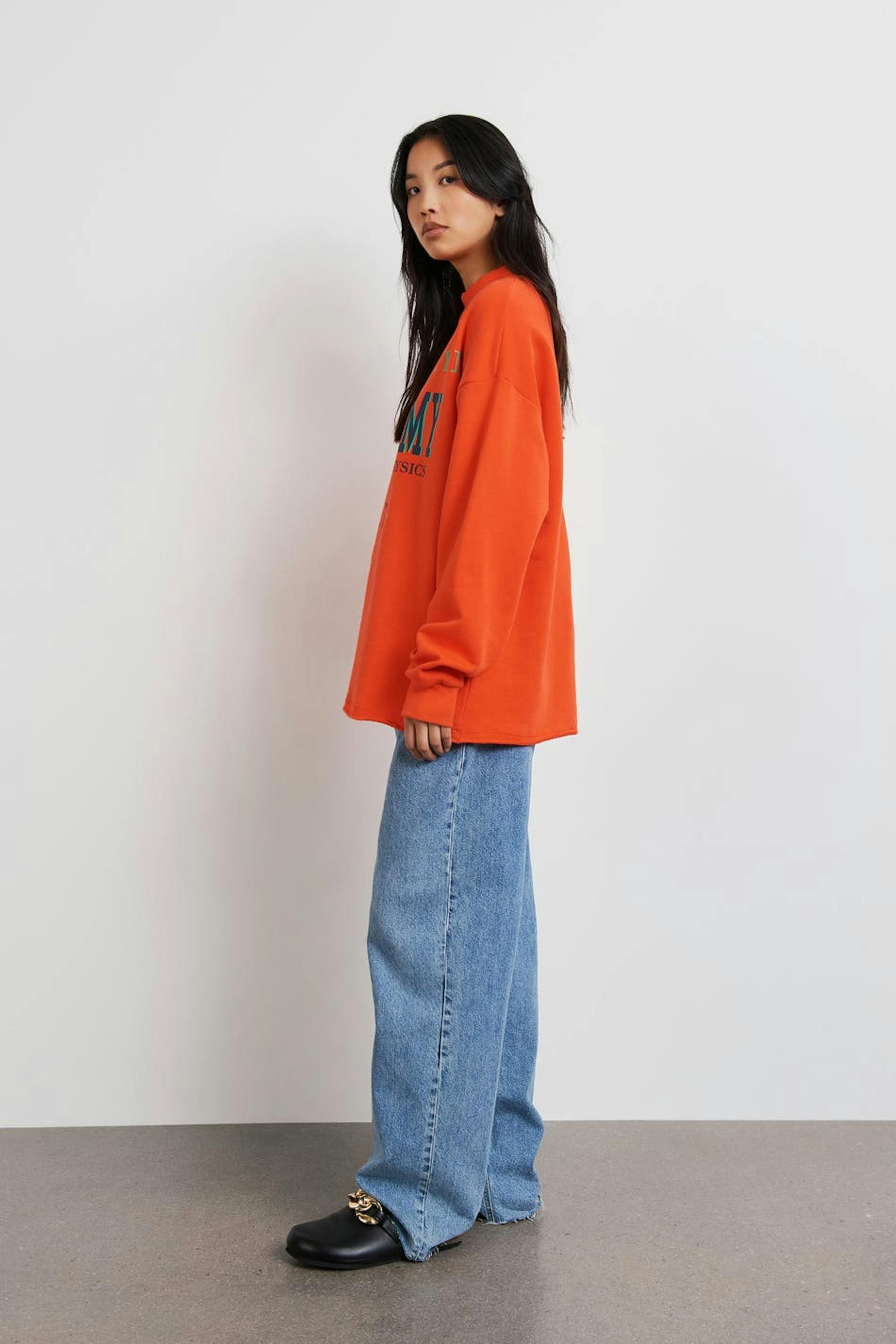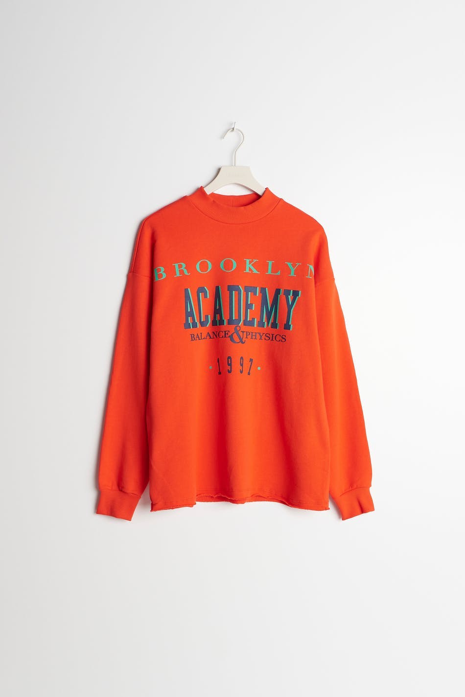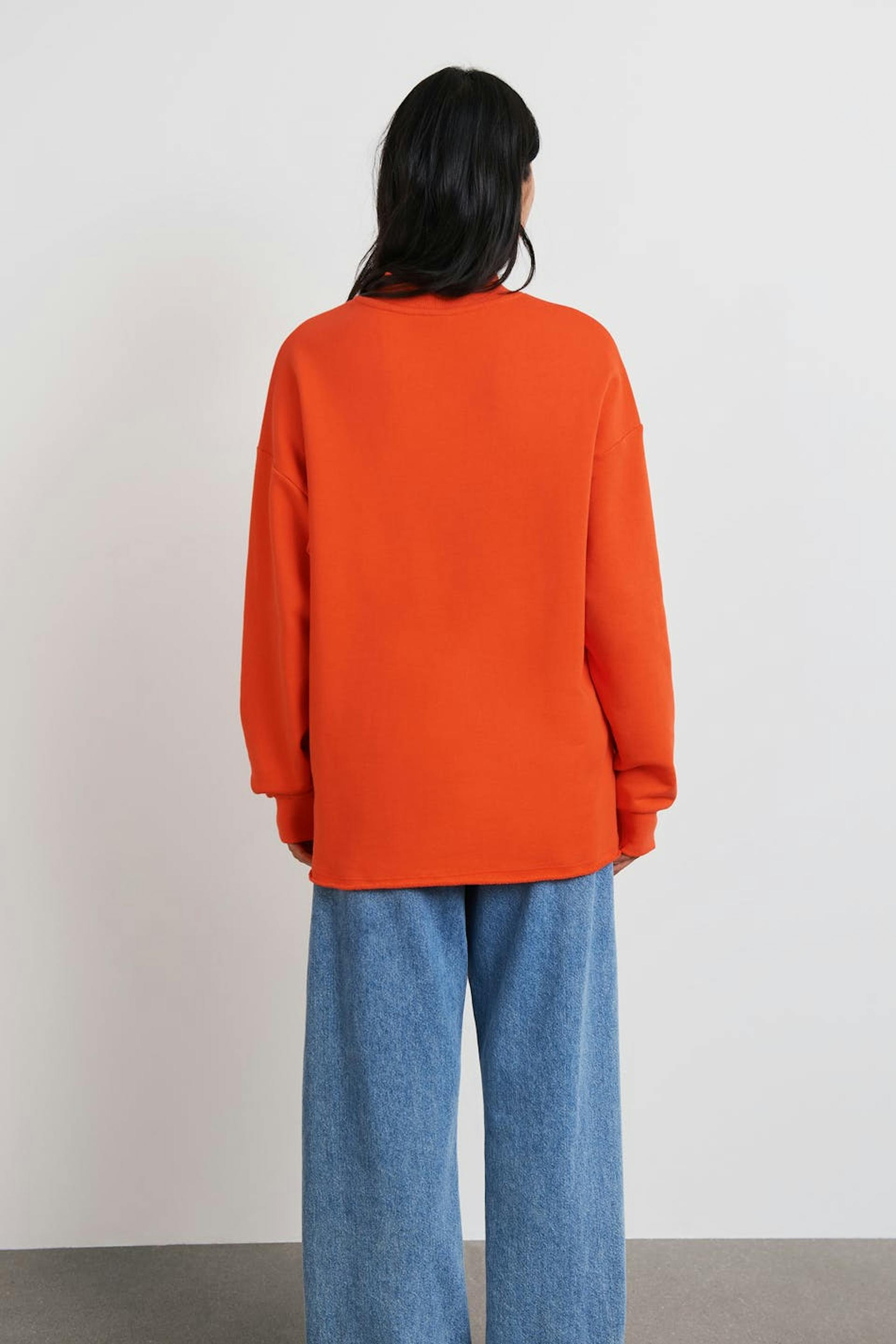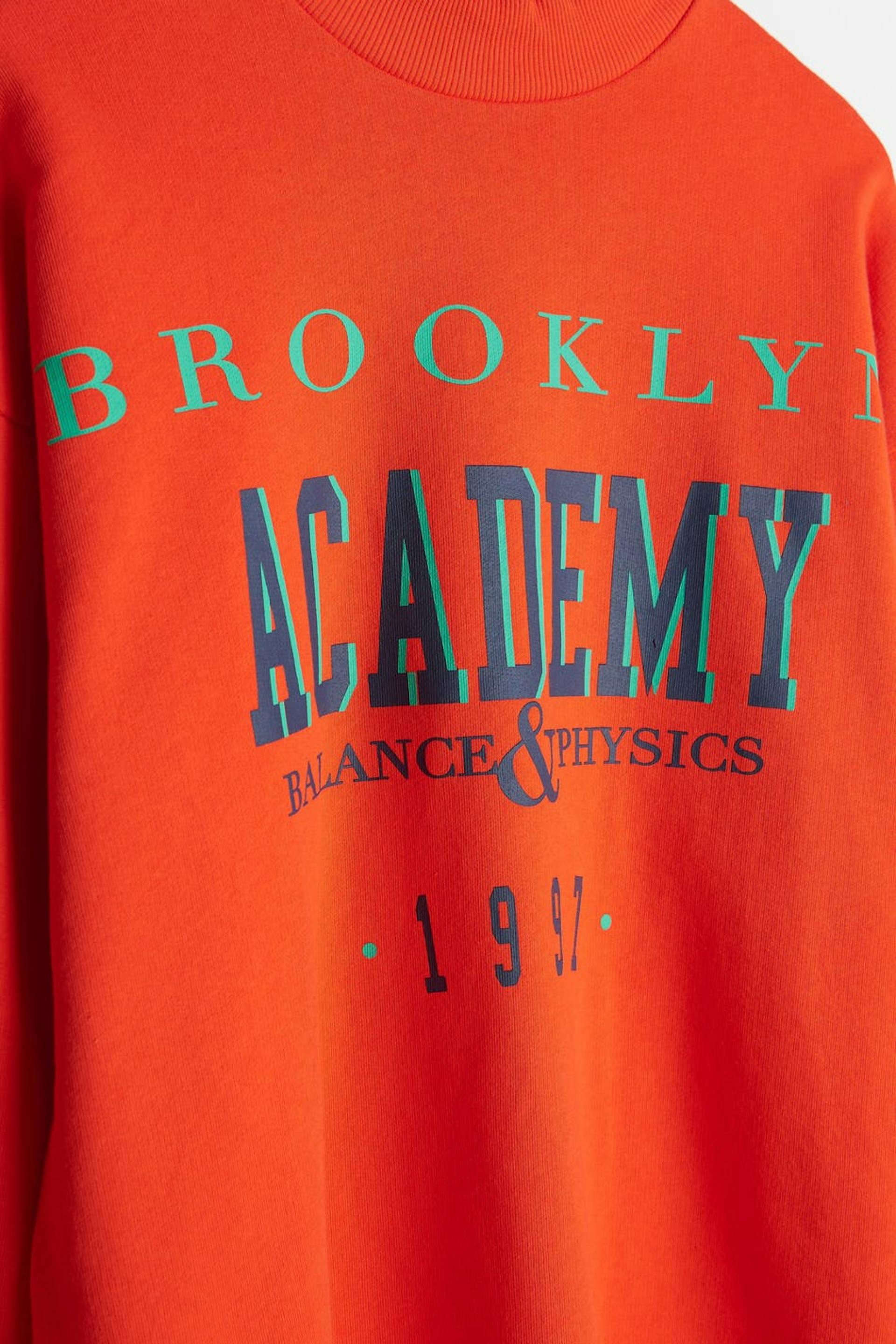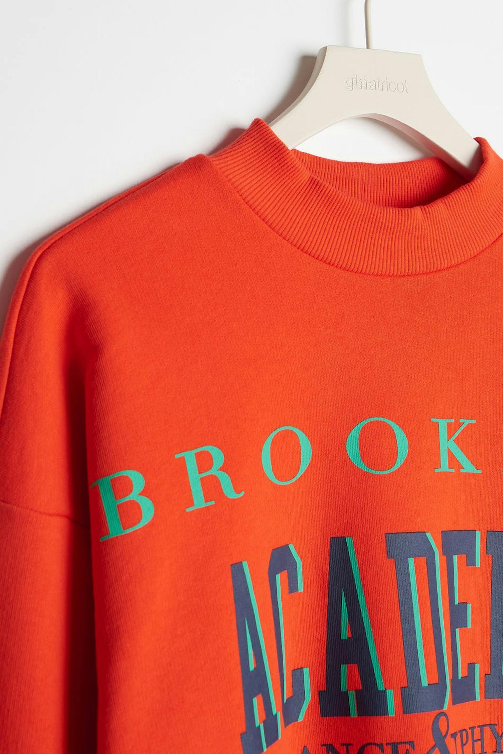 Long-sleeved sweatshirt with print. The sweatshirt is red and has an oversize fit. It is made of jersey and has a high neckline and dropped shoulders.
