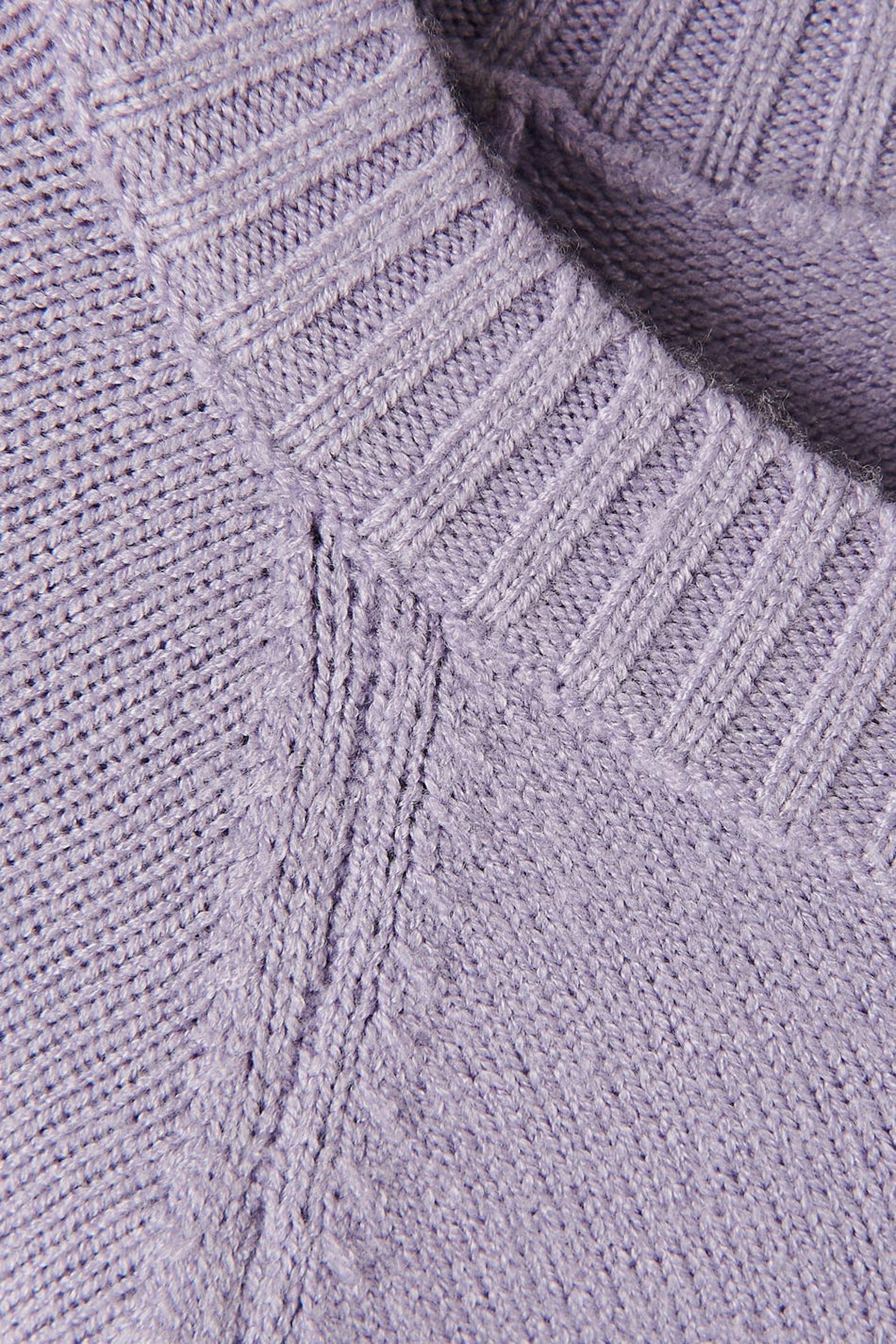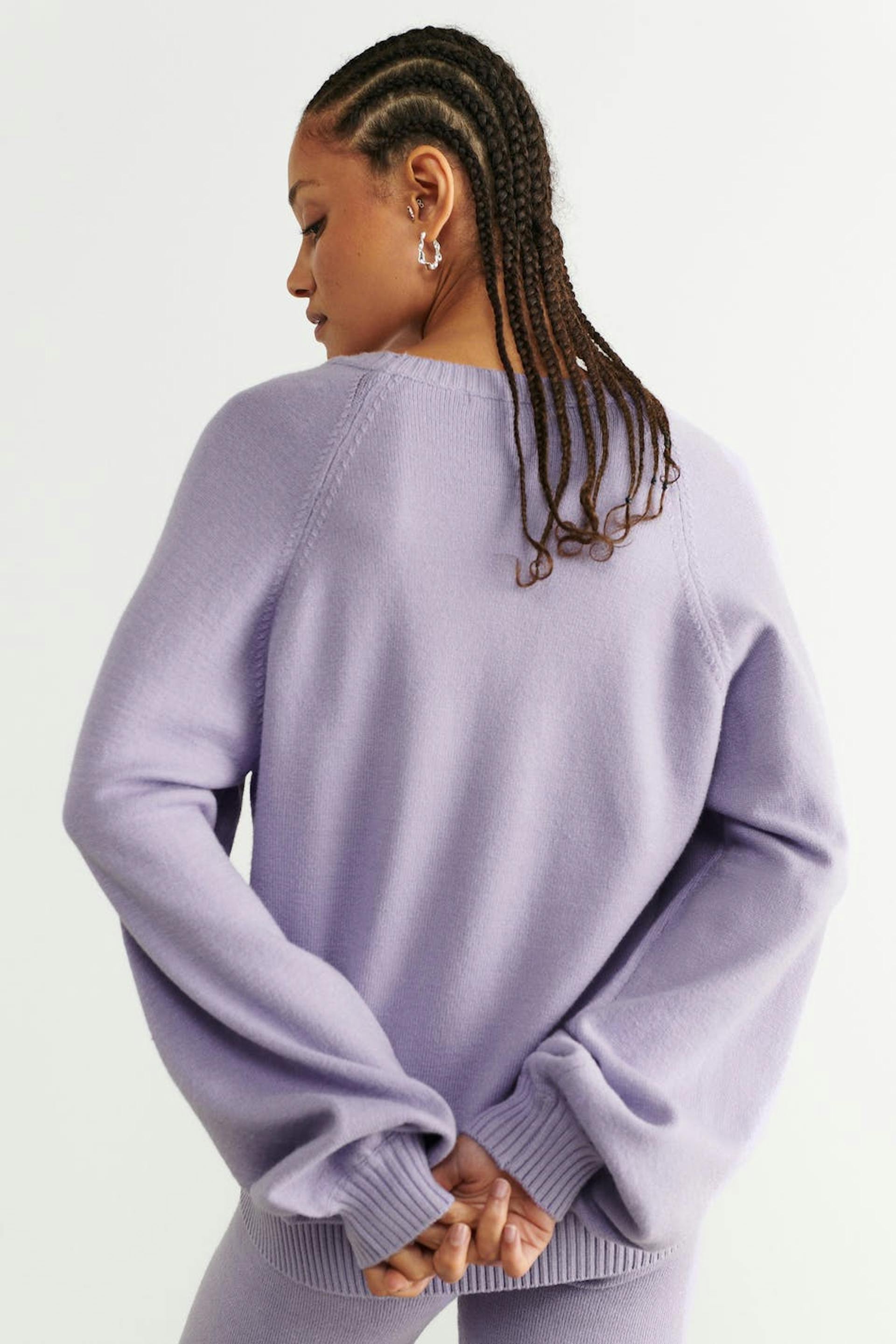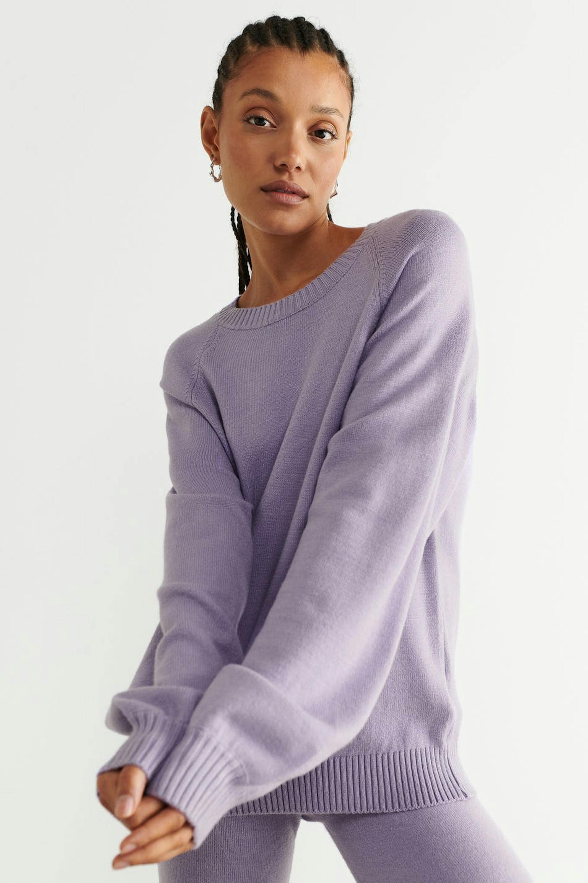 Knitted jumper with loose-fitting style. The jumper is purple and has rib knit on the neckline, at the bottom and on the sleeve ends.