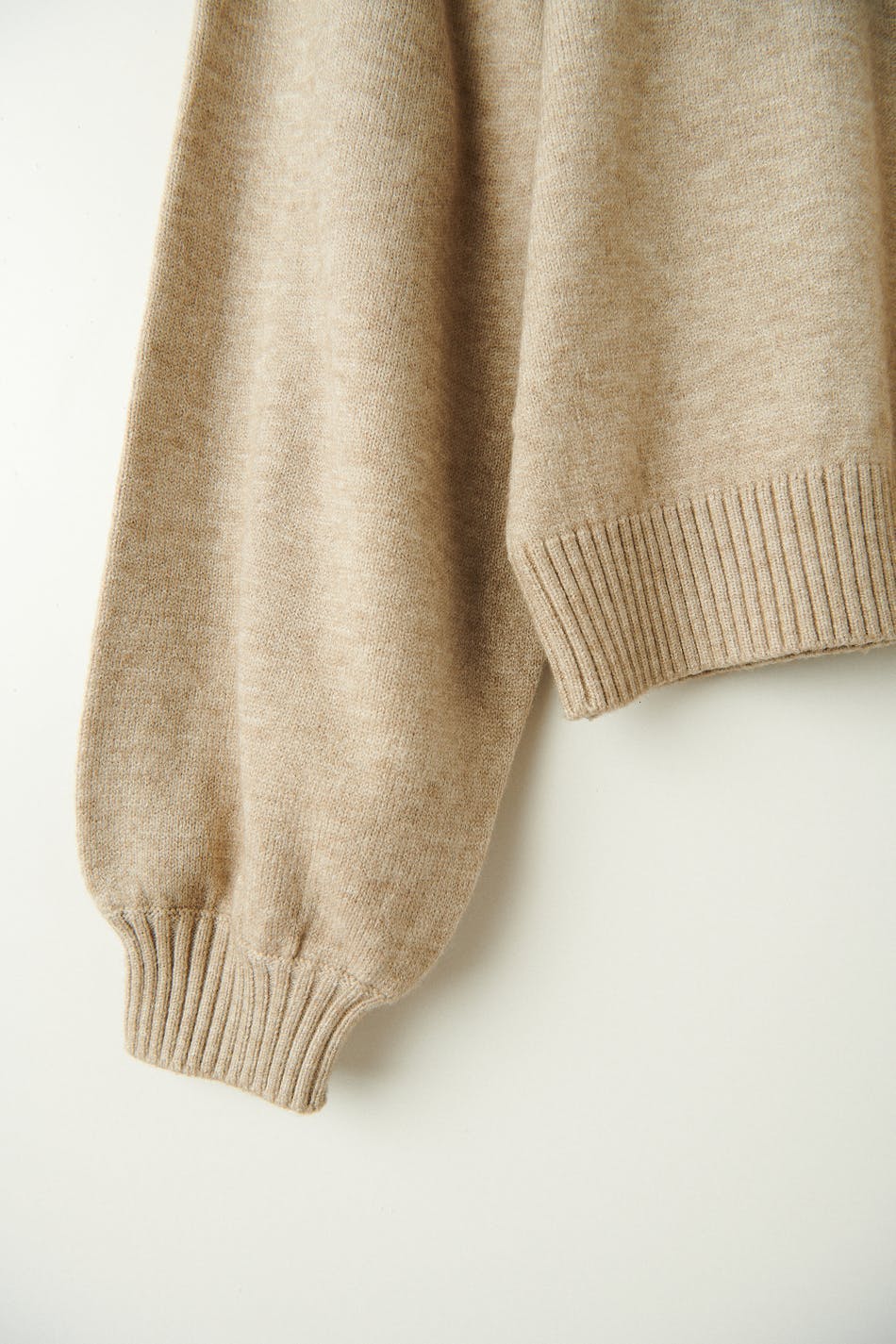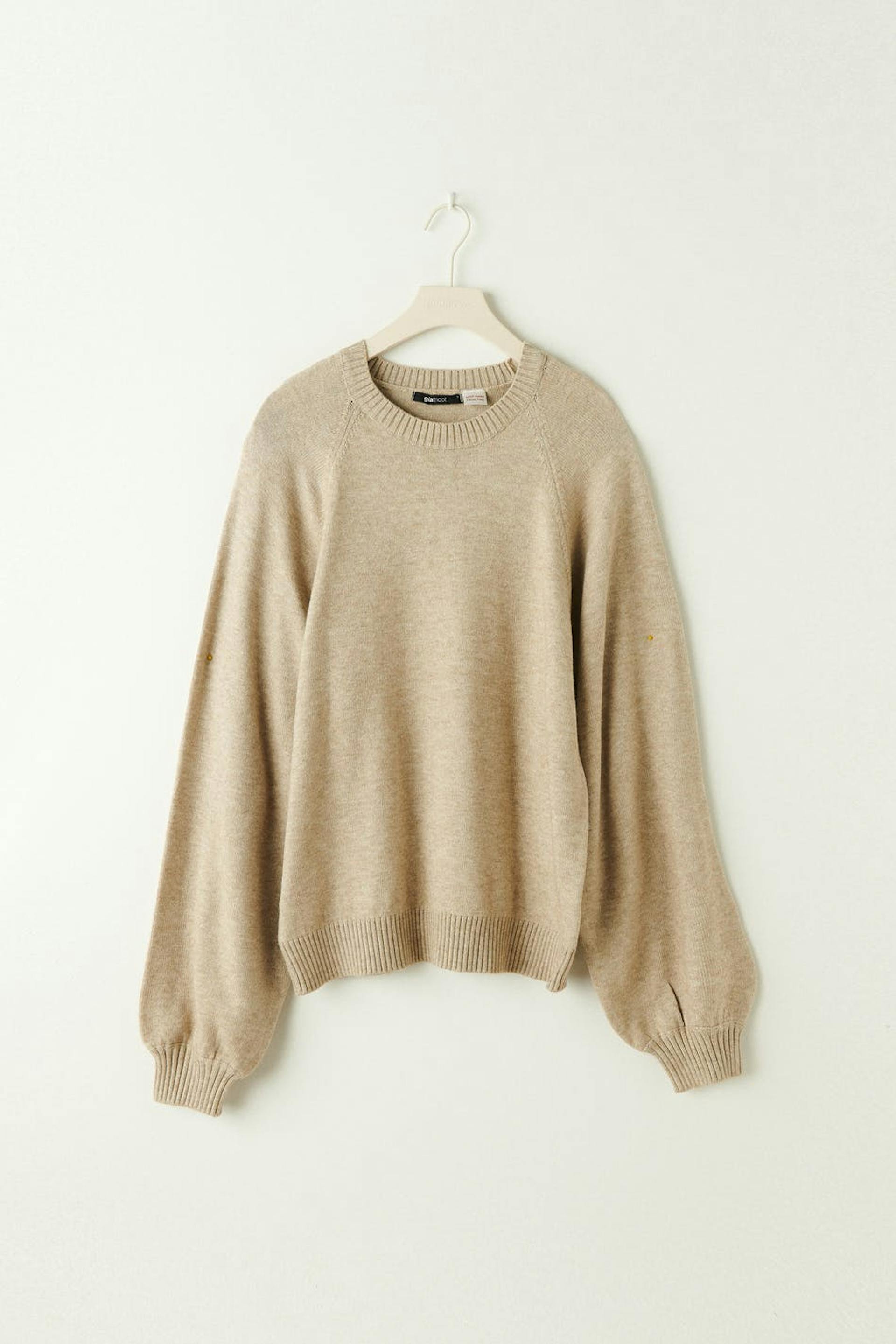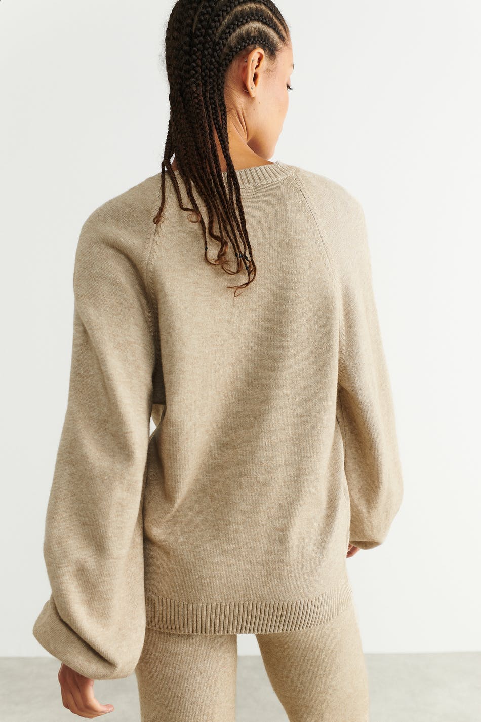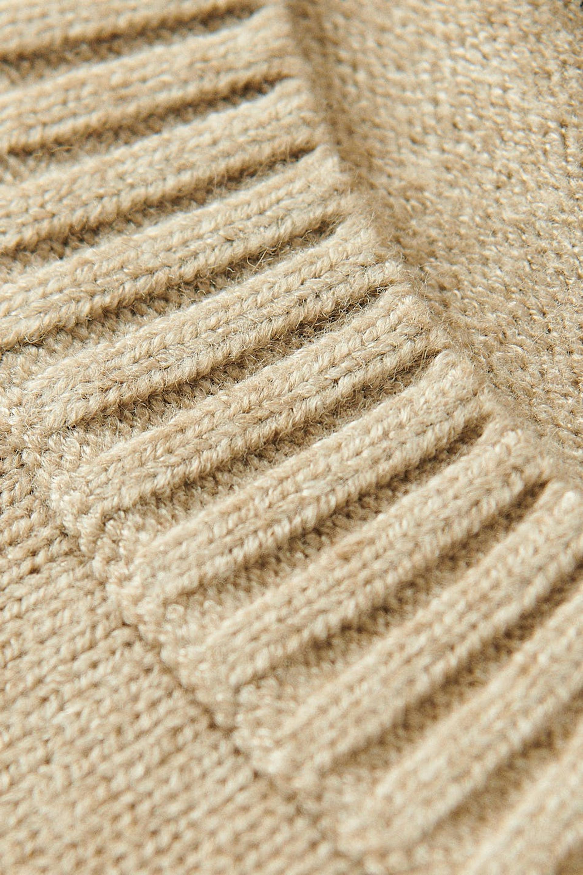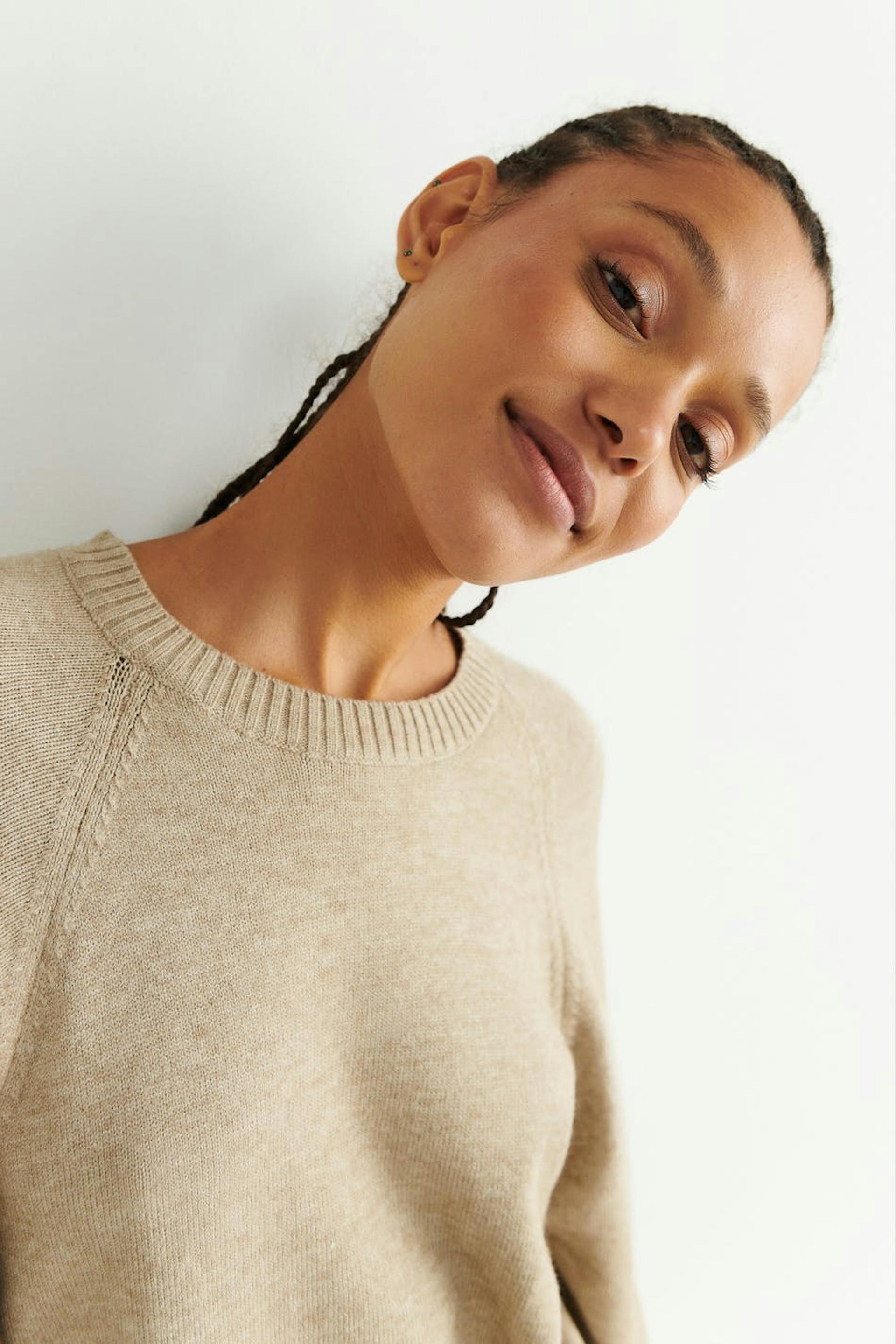 Knitted jumper with loose-fitting style. The jumper is beige and has rib knit on the neckline, at the bottom and on the sleeve ends.