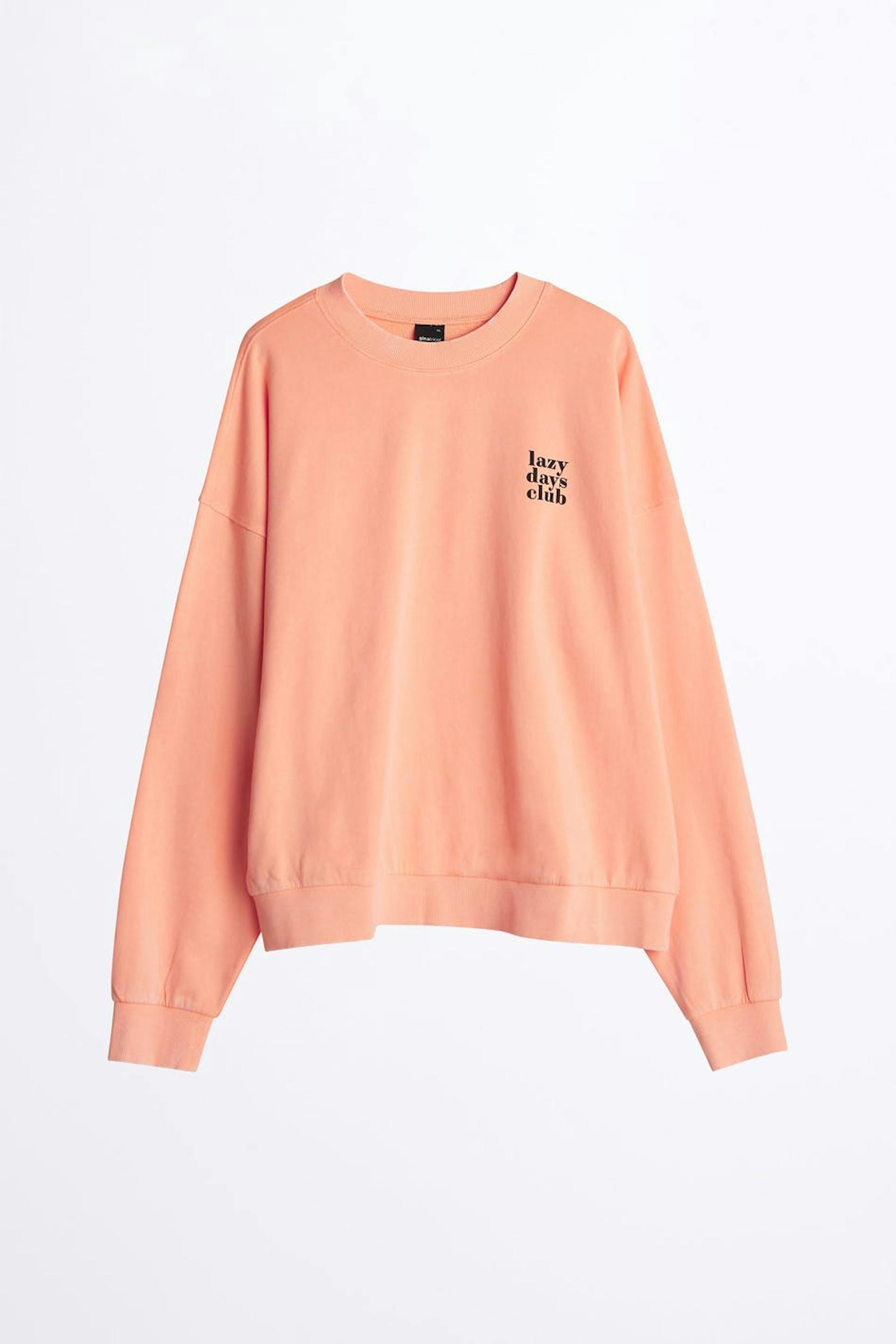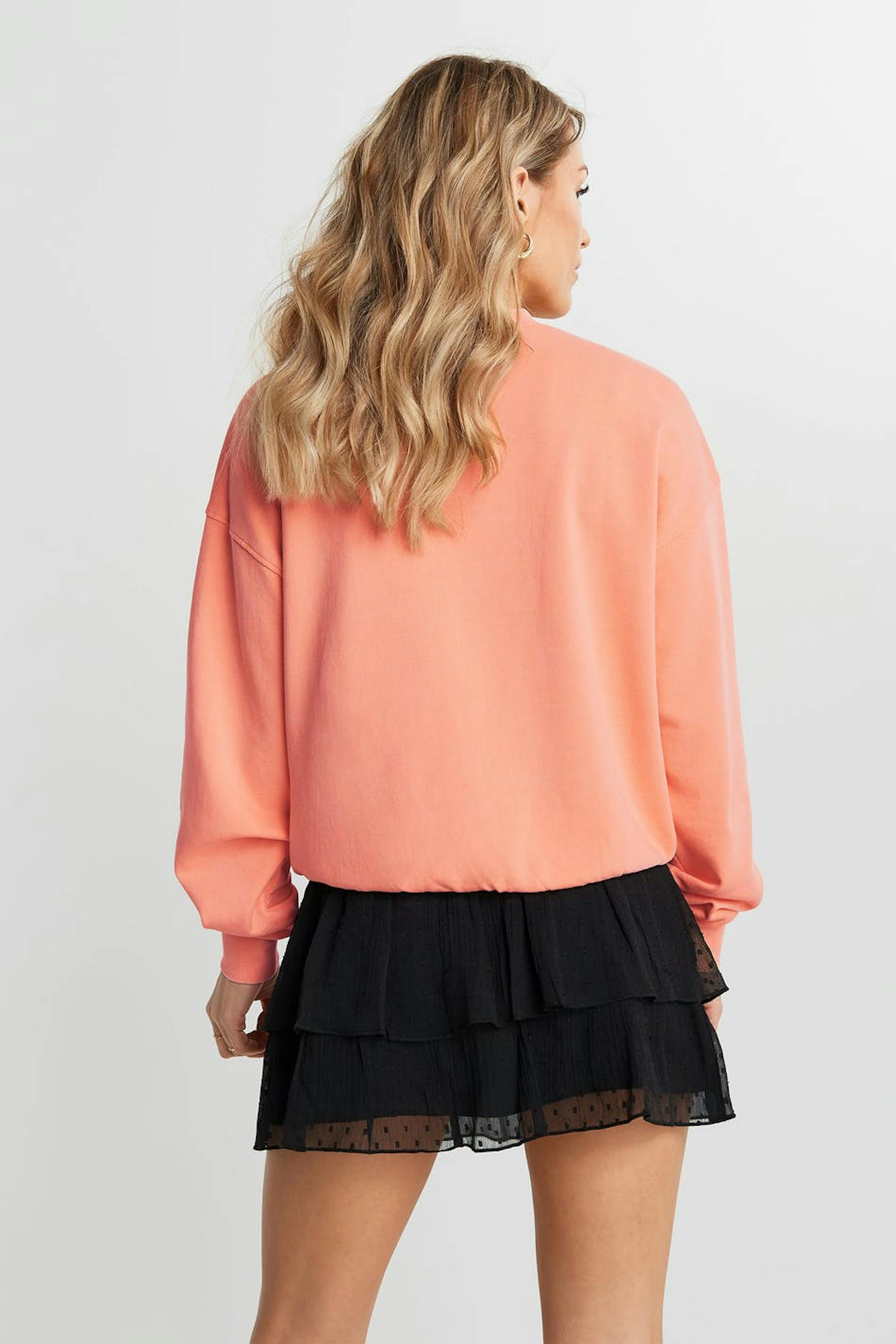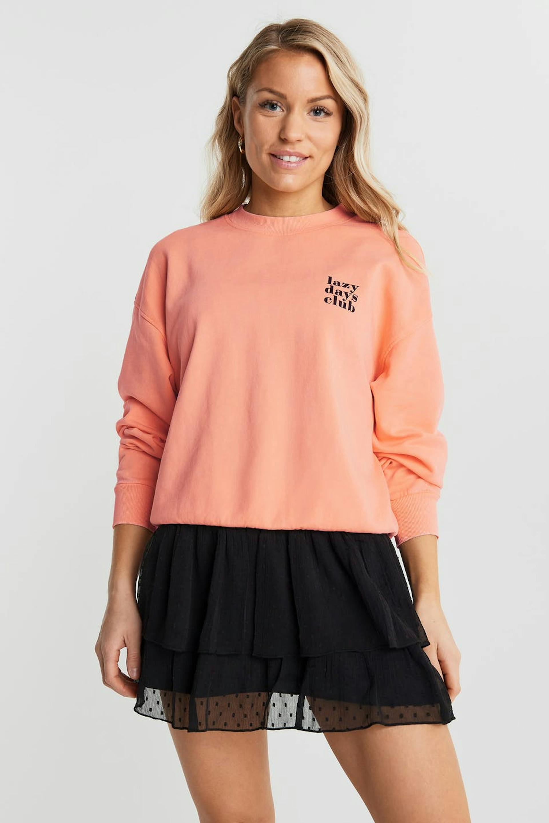 Long-sleeved sweatshirt with a print with a text on the left chest. The sweatshirt is orange and has ribbed cuff on the sleeve ends, on the neckline and at the hem.