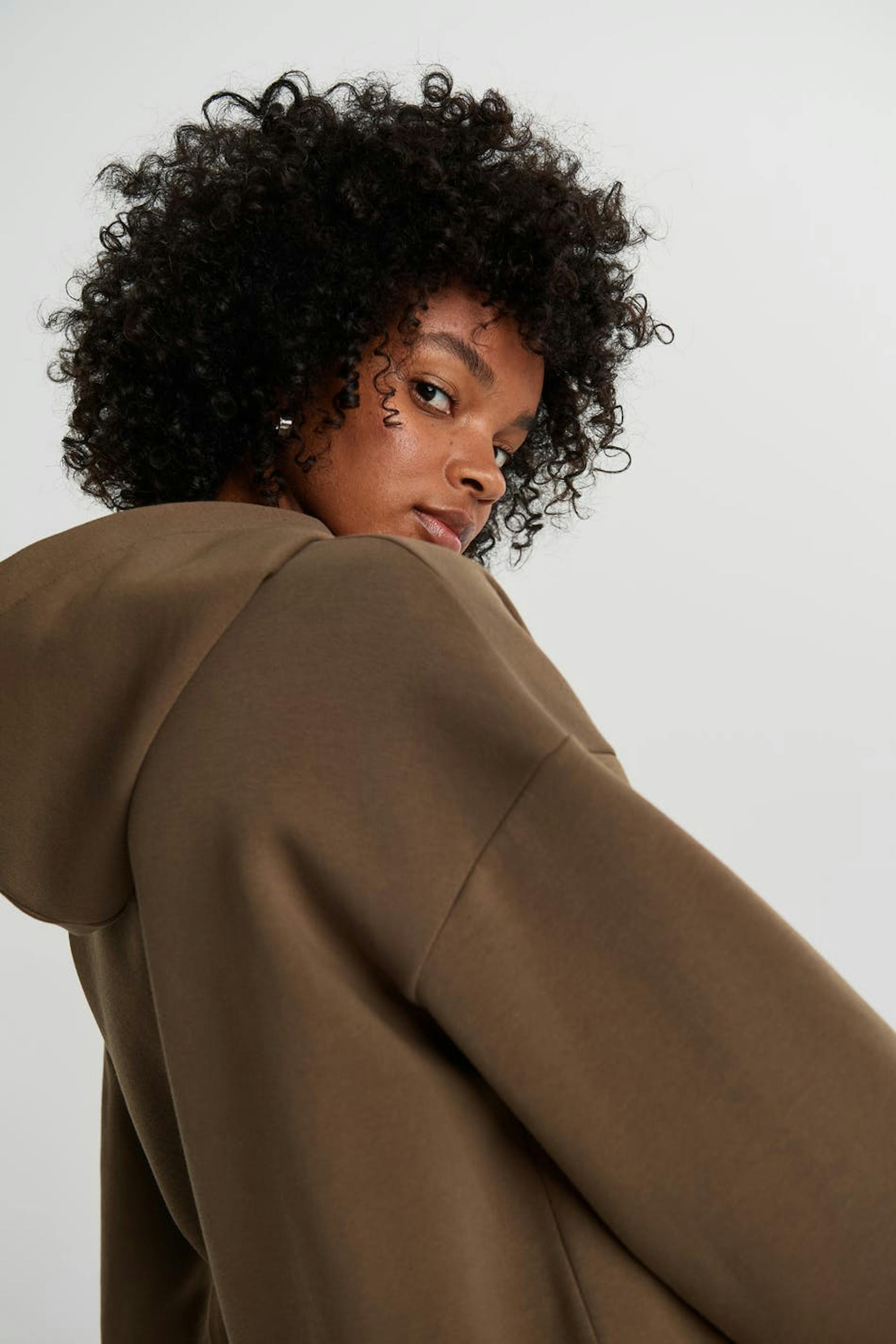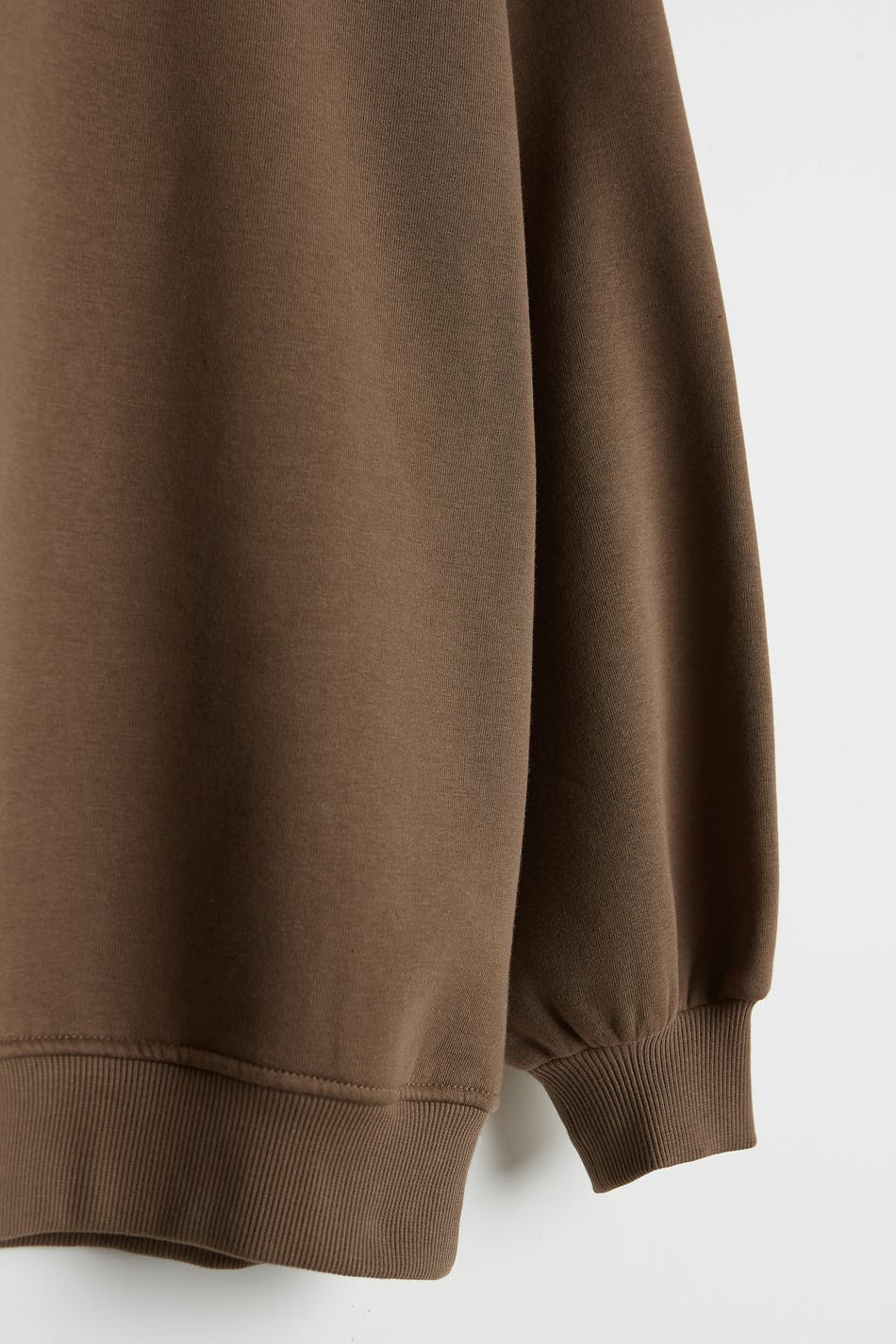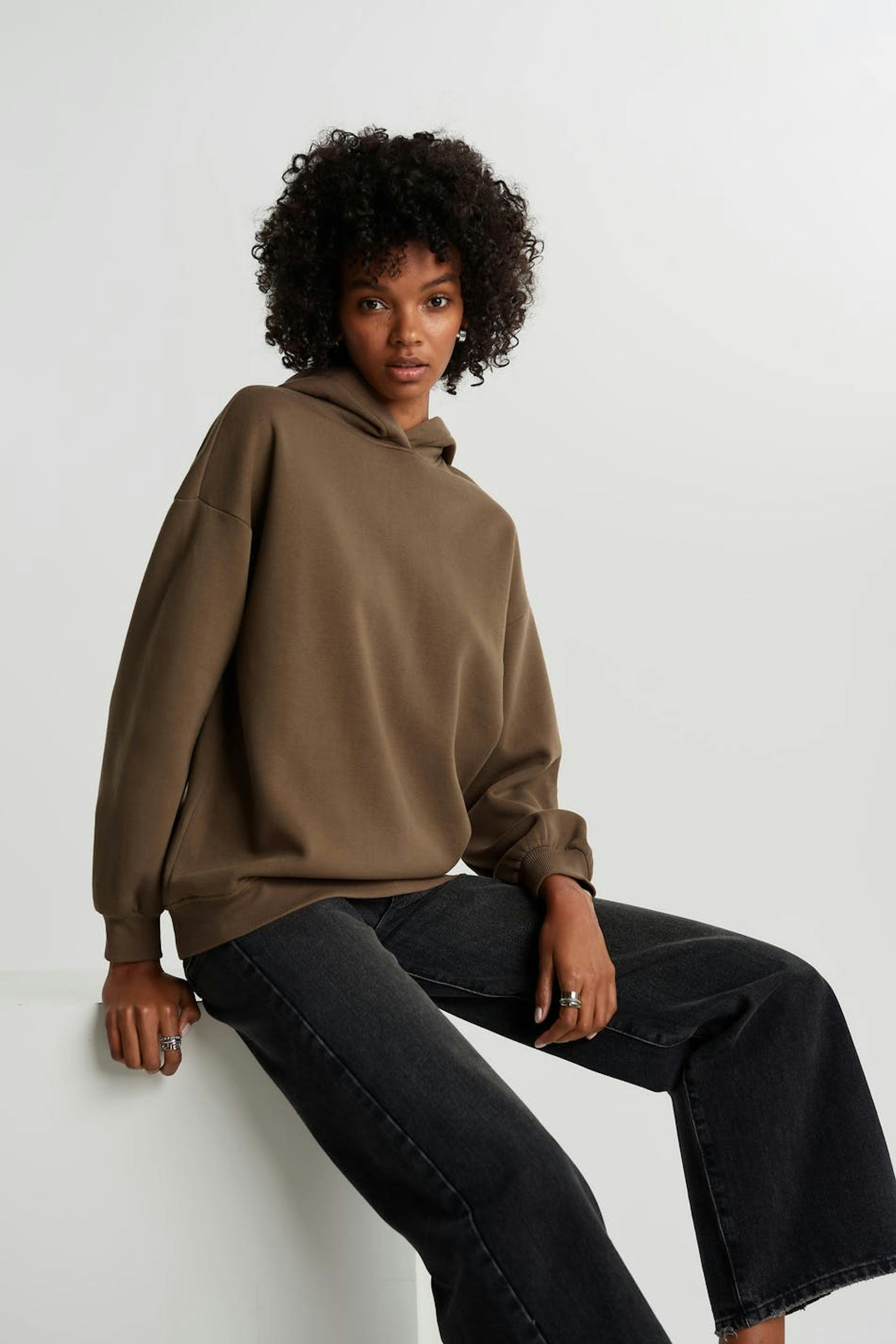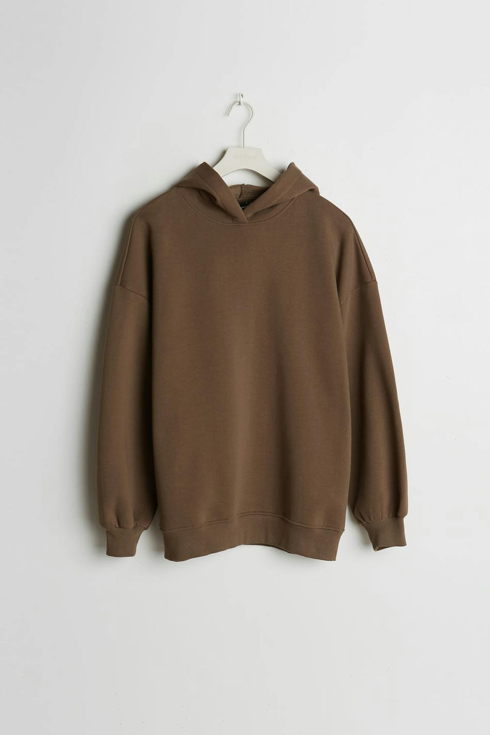 Sweatshirt with an oversize fit. The sweatshirt is brown and has a hood. It has elastic band on the sleeve ends and at the hem and dropped shoulders.
