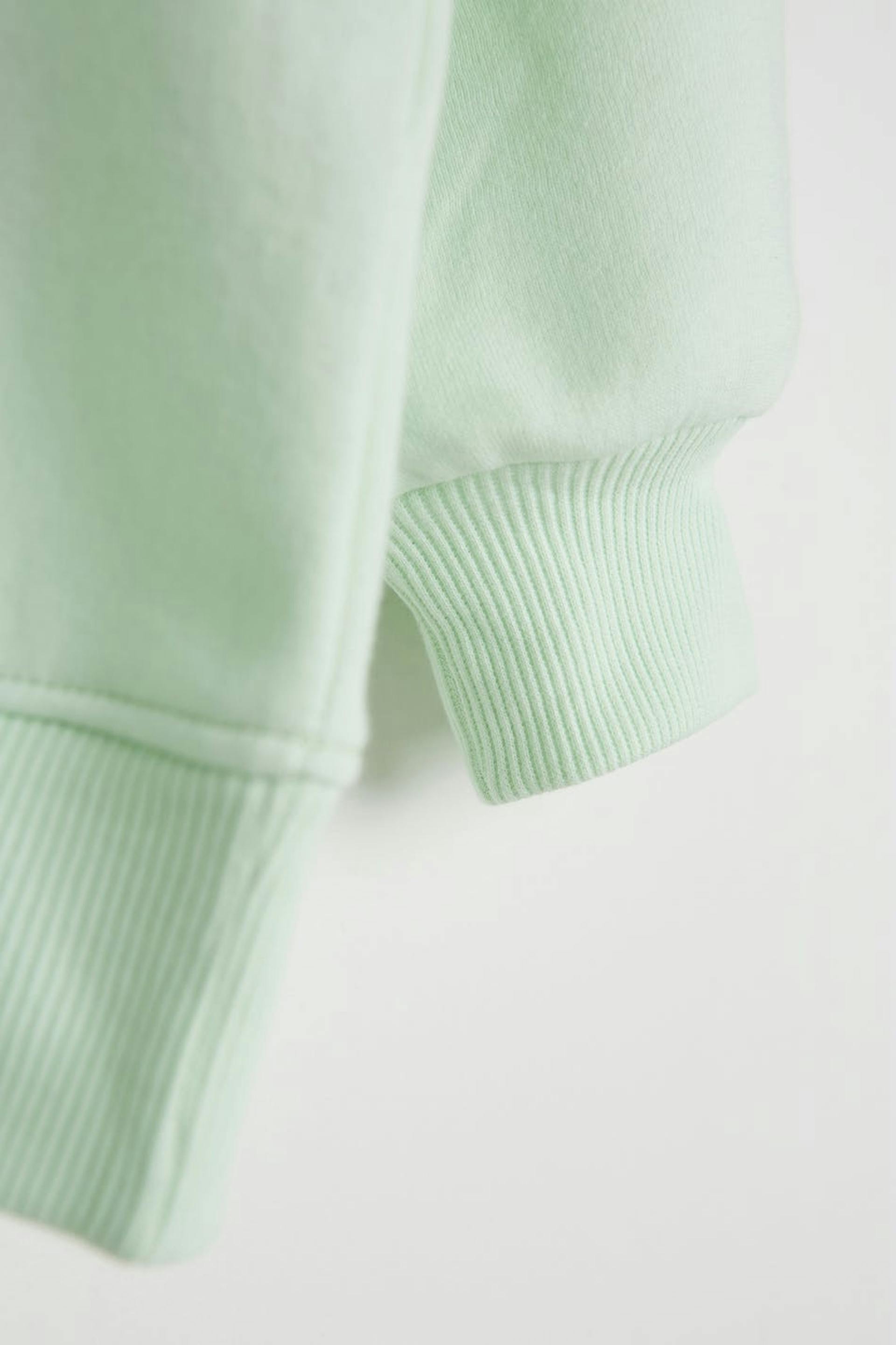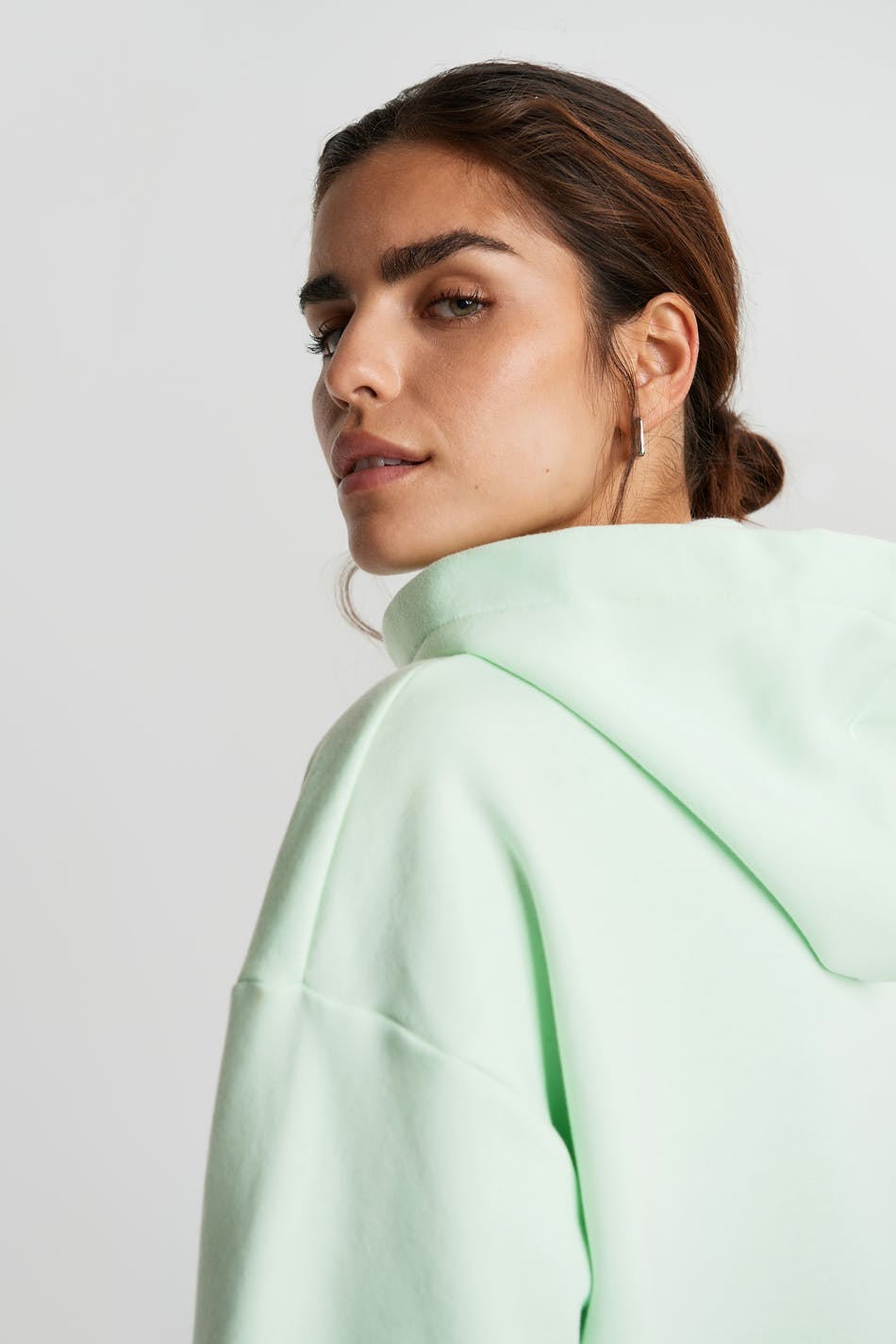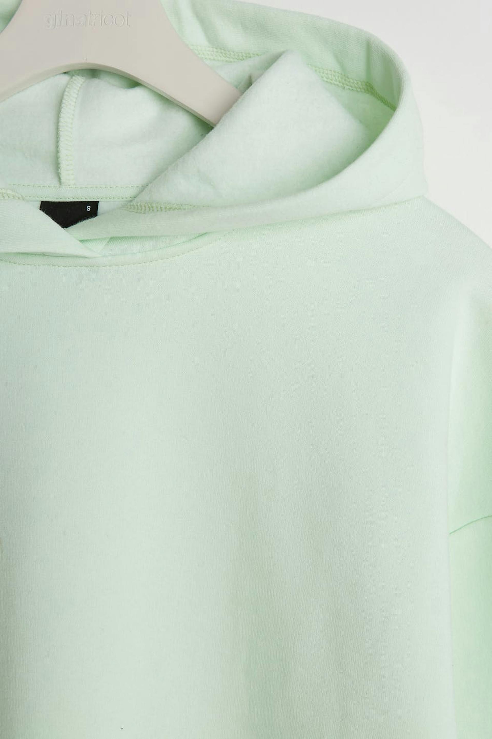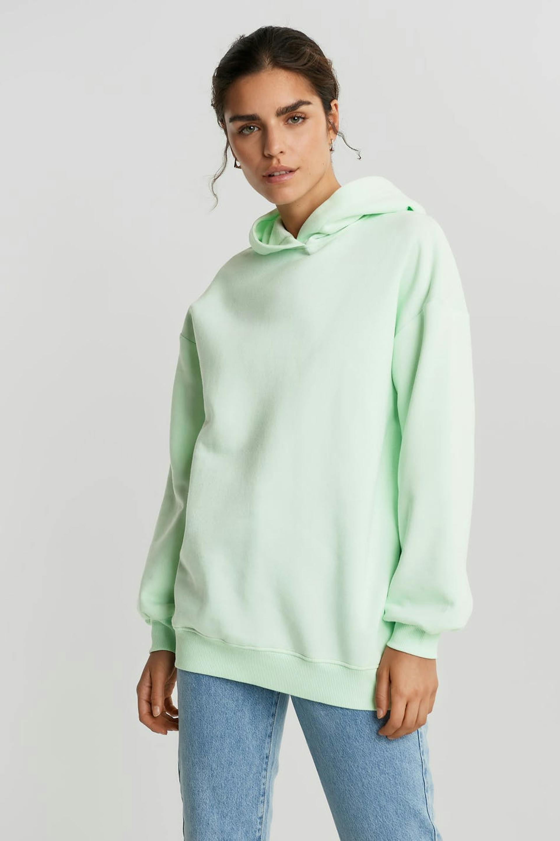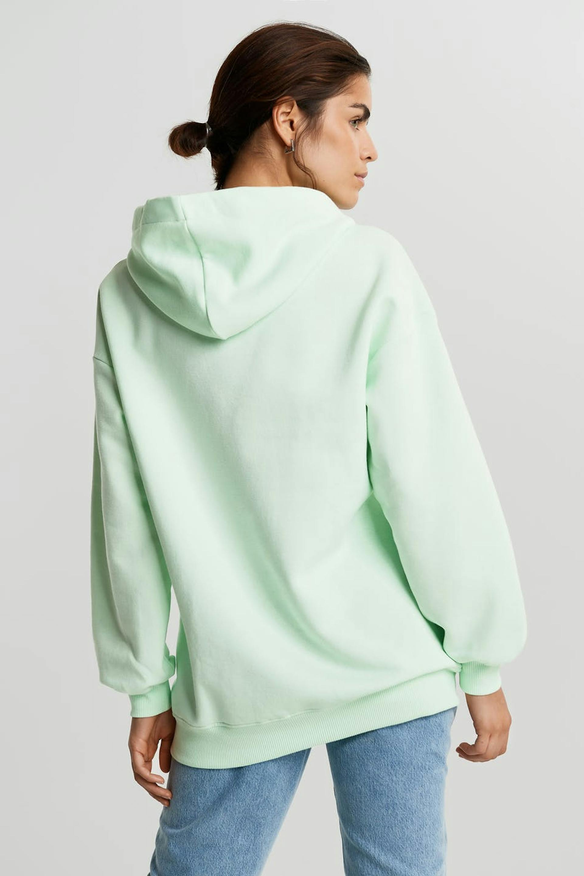 Sweatshirt with a generous fit. The sweatshirt is mint green and has a hood. It has elastic band on the sleeve ends and at the hem and dropped shoulders.