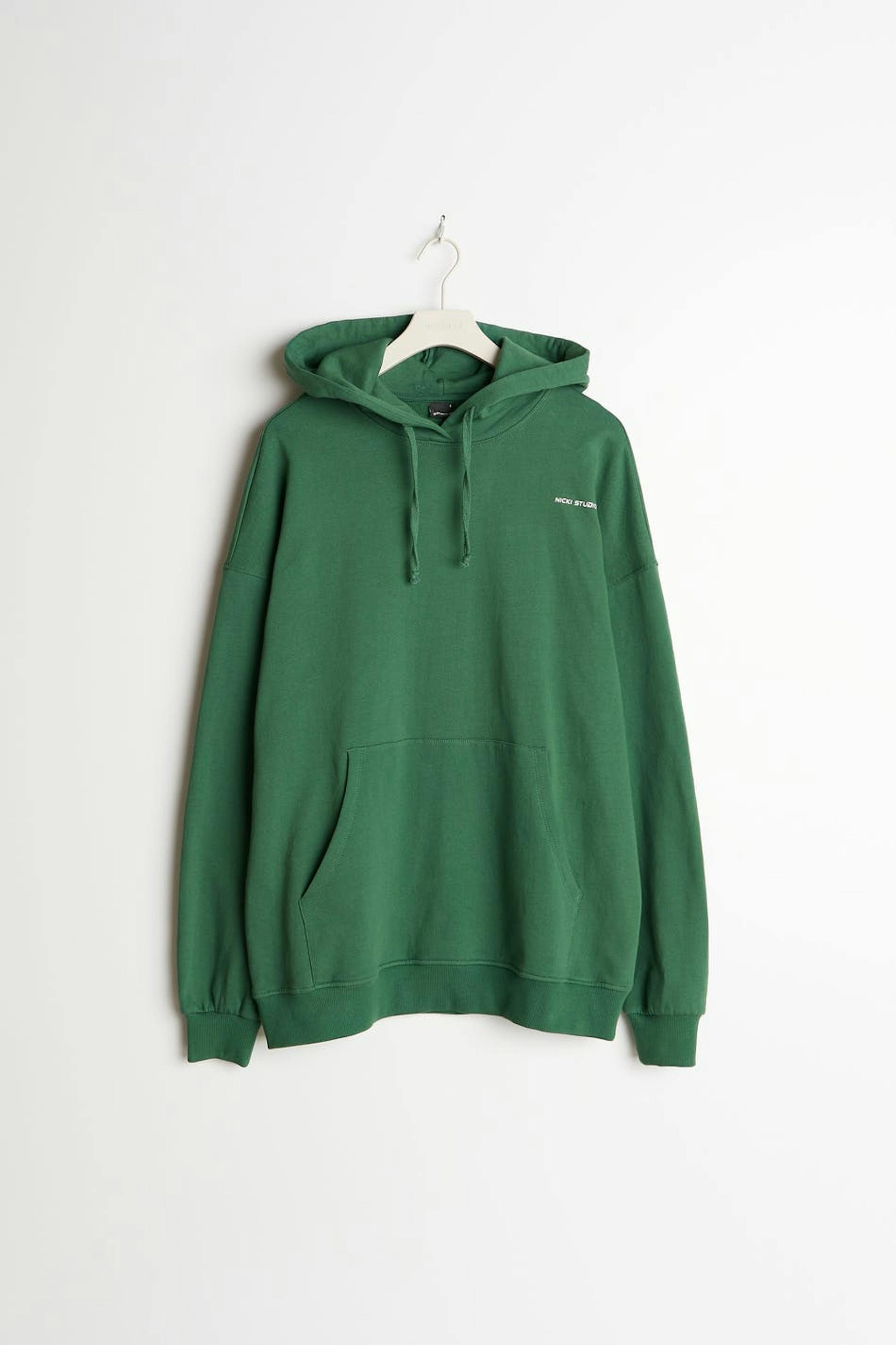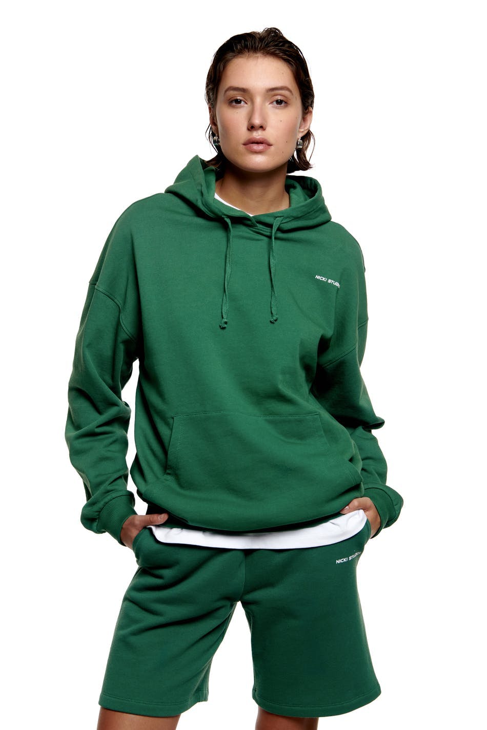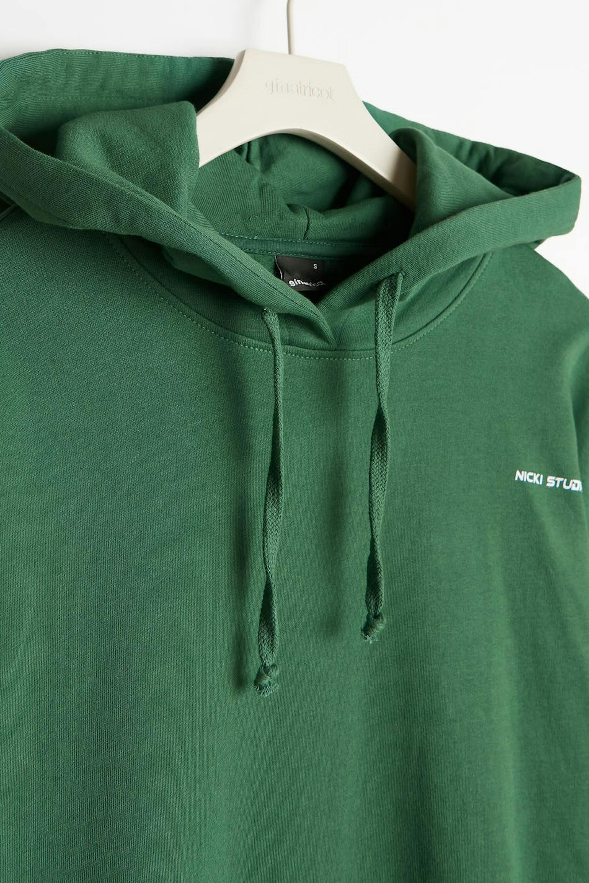 Nicki Studios X Gina Tricot. Hoodie with an oversize fit. The hoodie is green and has a pouch pocket. It has a logo print at the front, a hood with drawstring and a ribbed cuff at the bottom and on the sleeve ends.