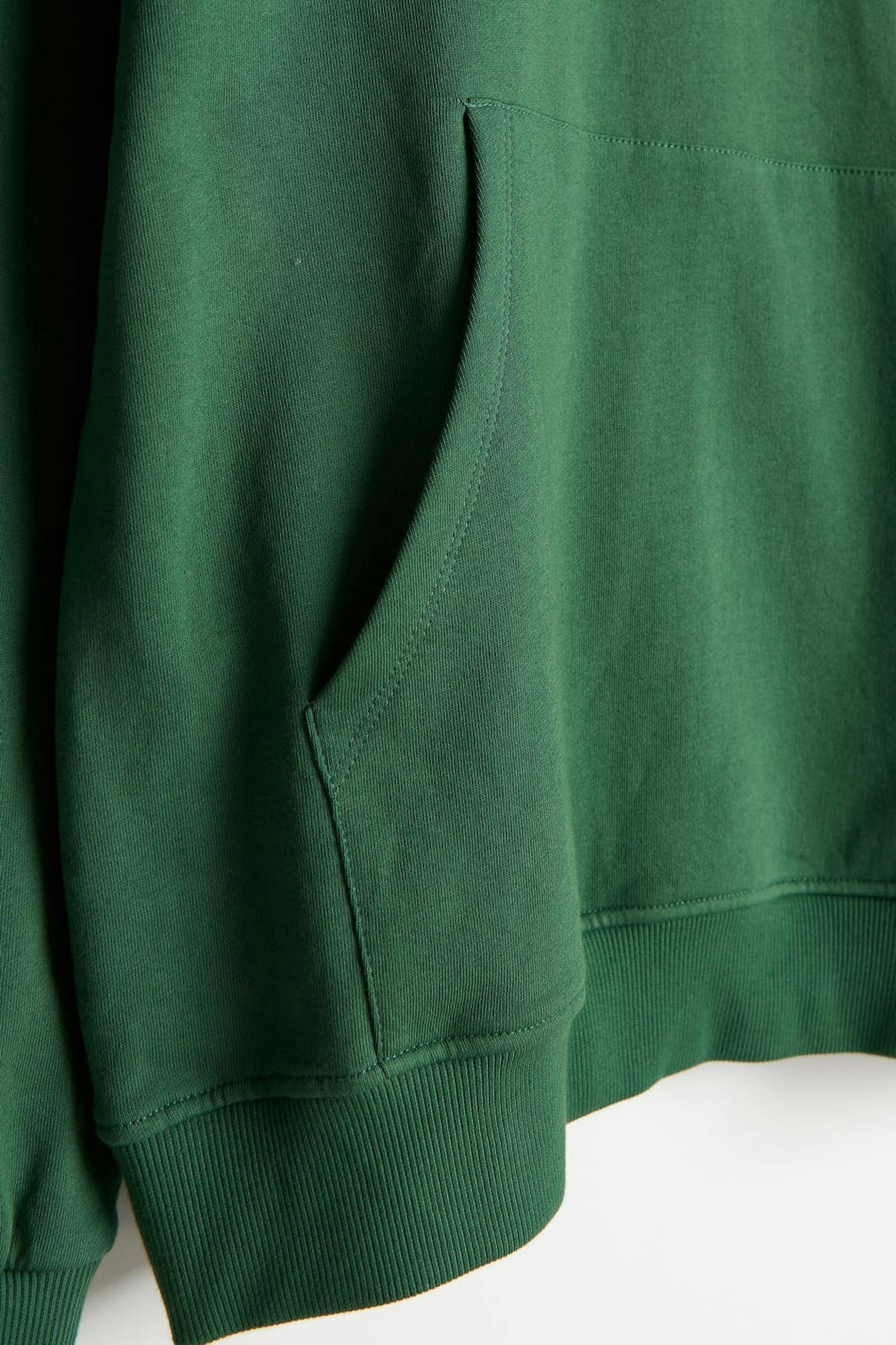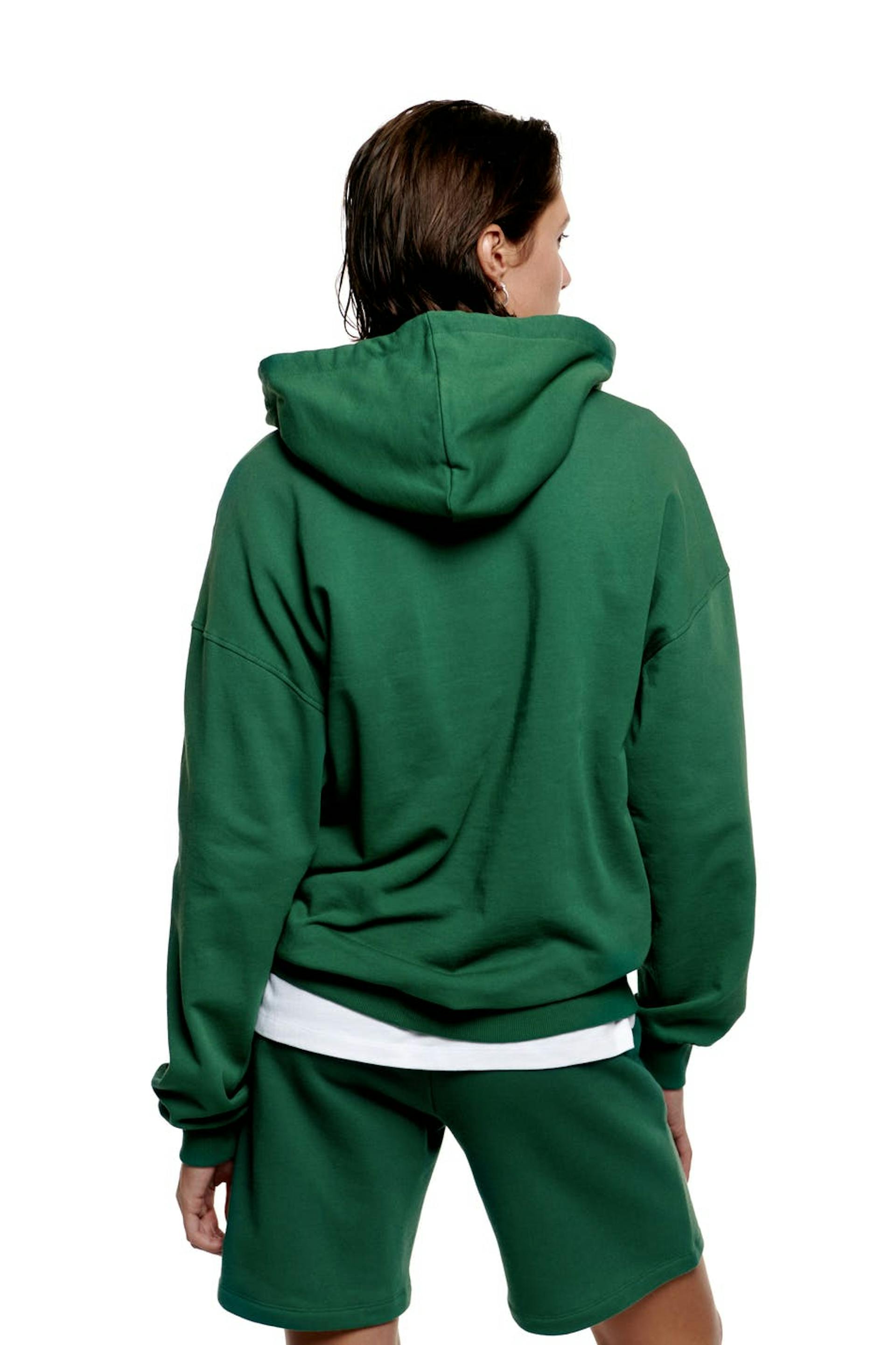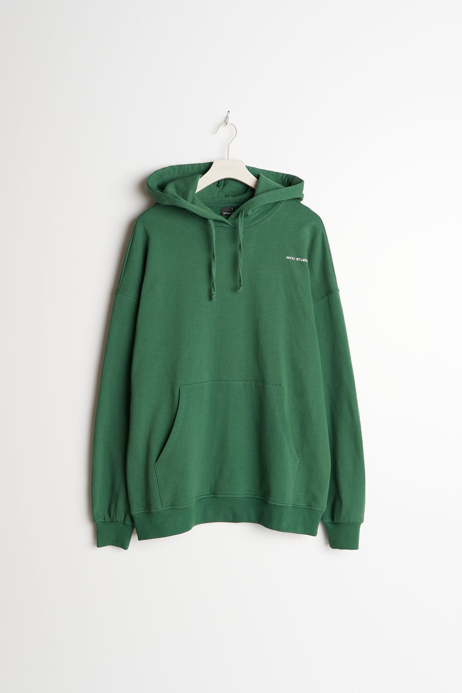 Nicki Studios X Gina Tricot. Hoodie with an oversize fit. The hoodie is green and has a pouch pocket. It has a logo print at the front, a hood with drawstring and a ribbed cuff at the bottom and on the sleeve ends.