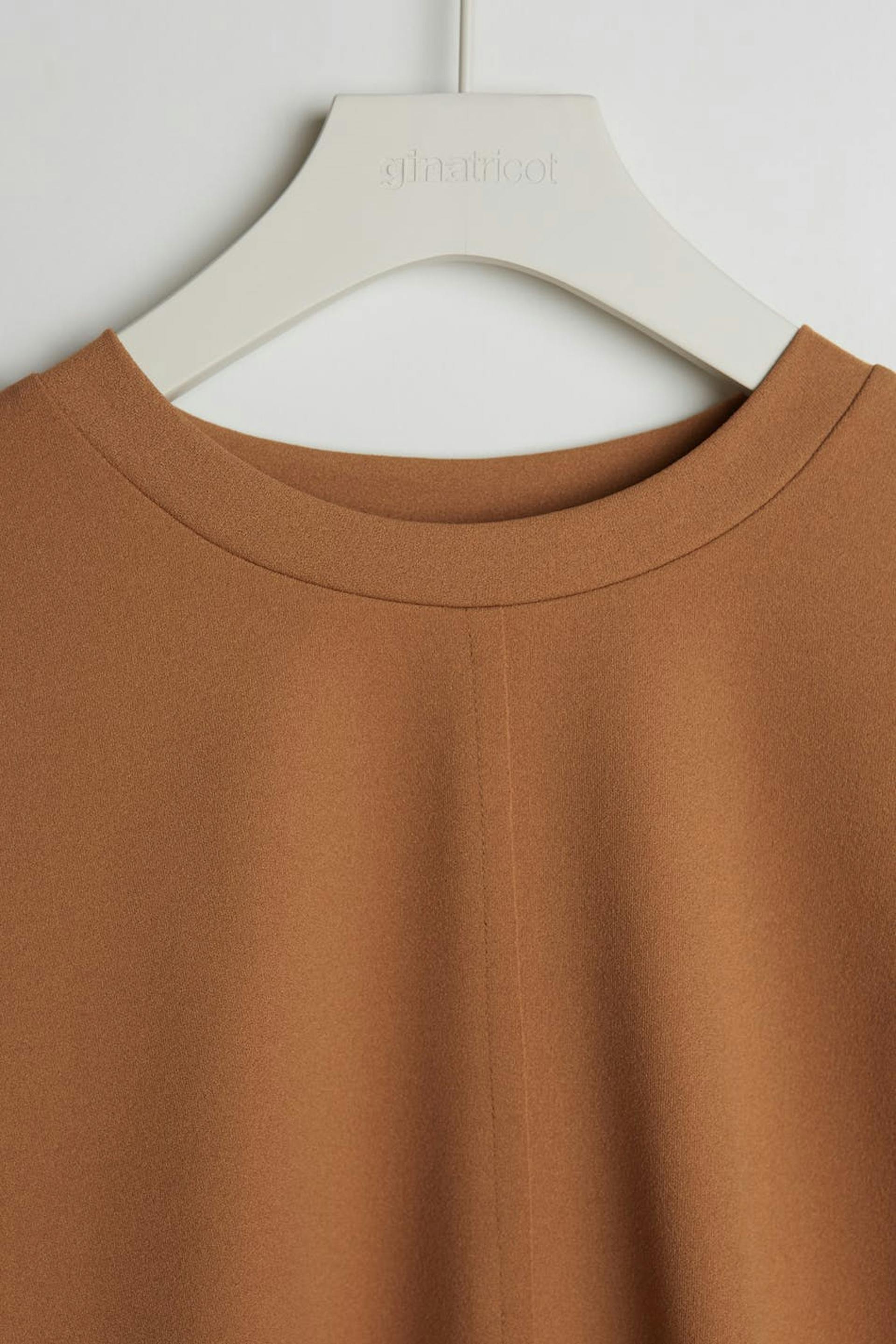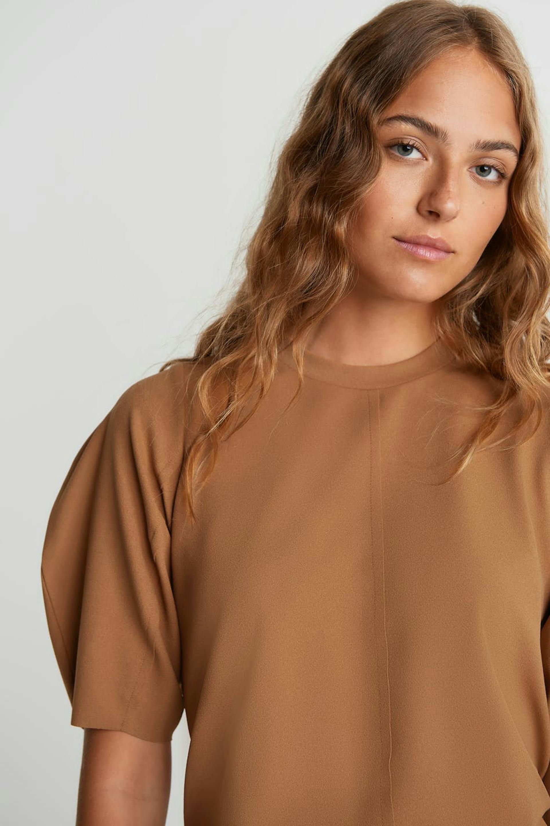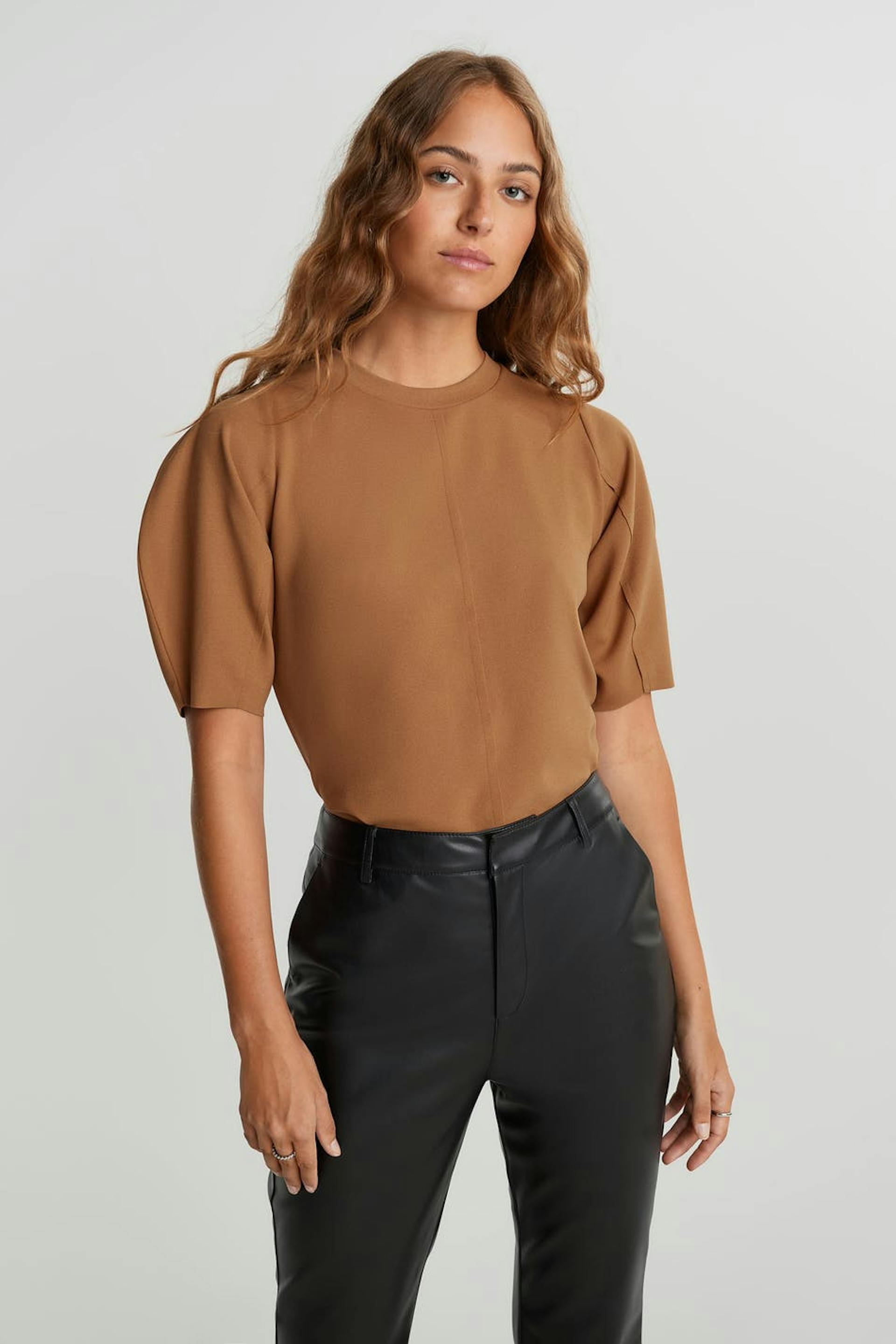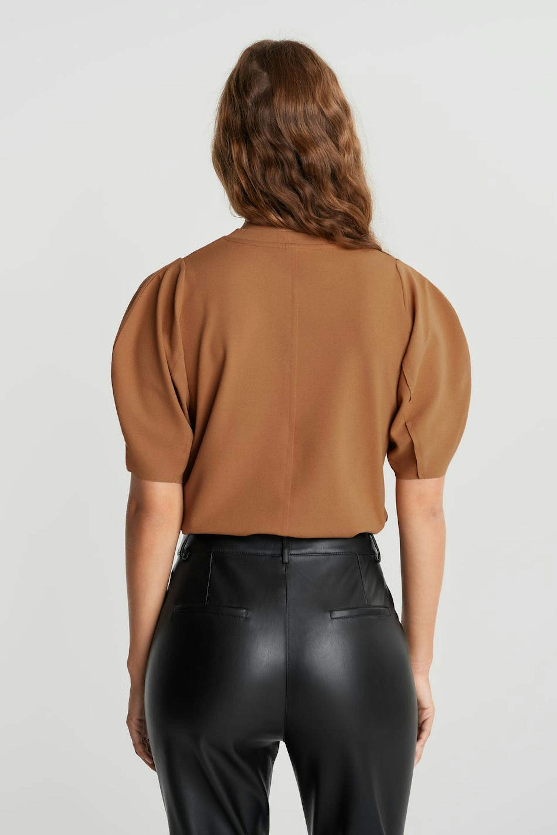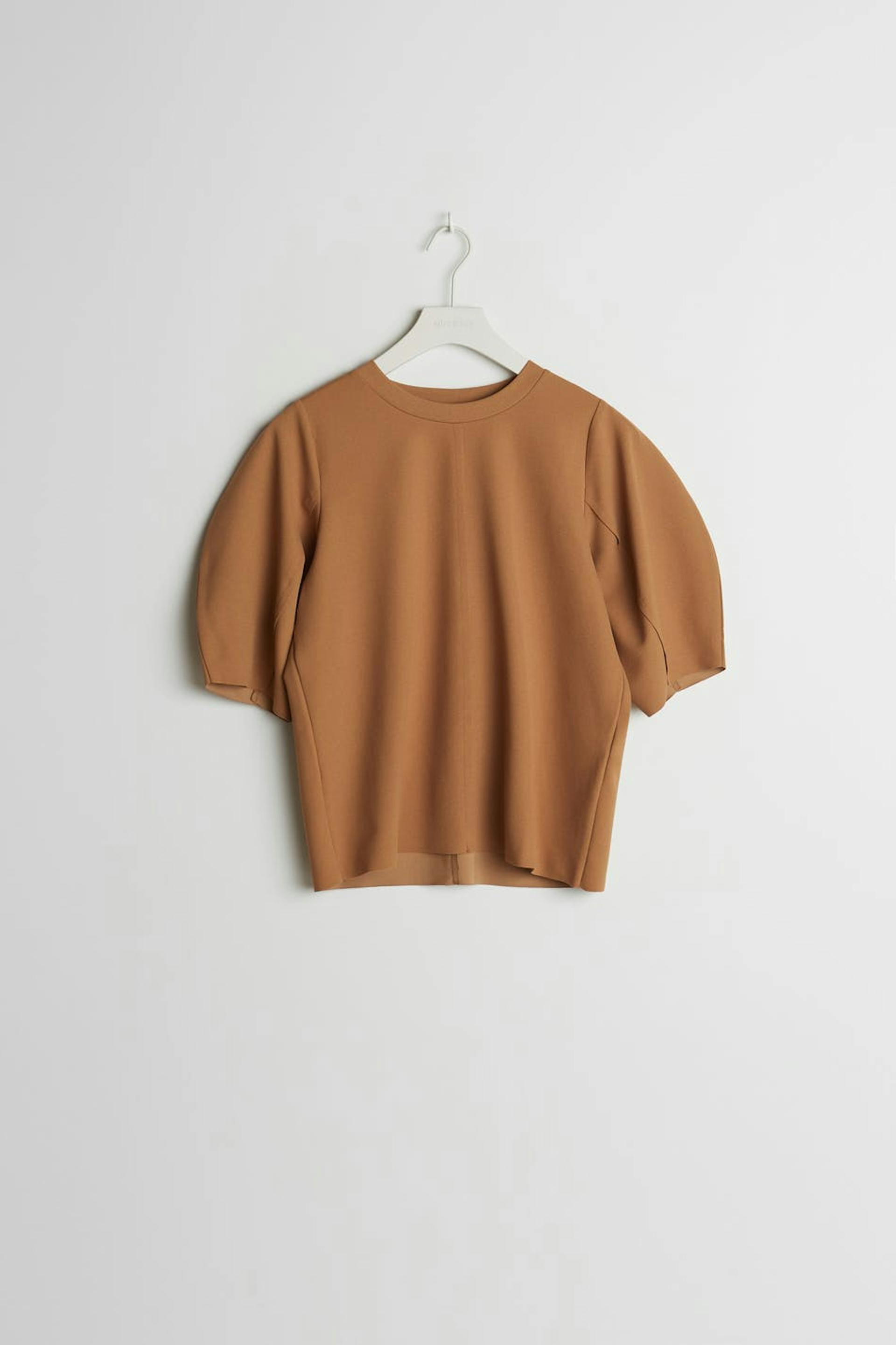 Short-sleeved sweatshirt with puff sleeves. The sweatshirt is brown and has seam detail on the front and on the back.