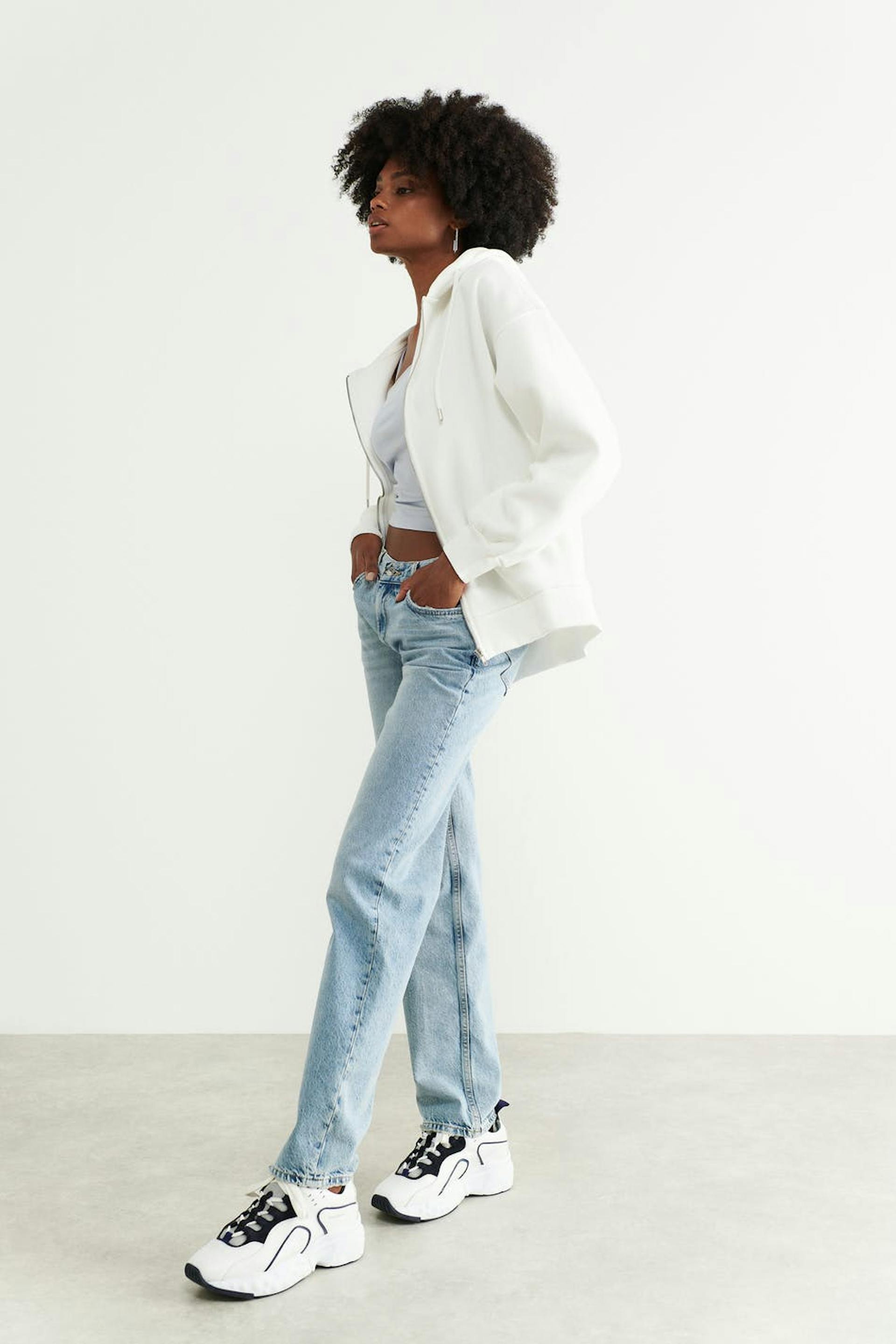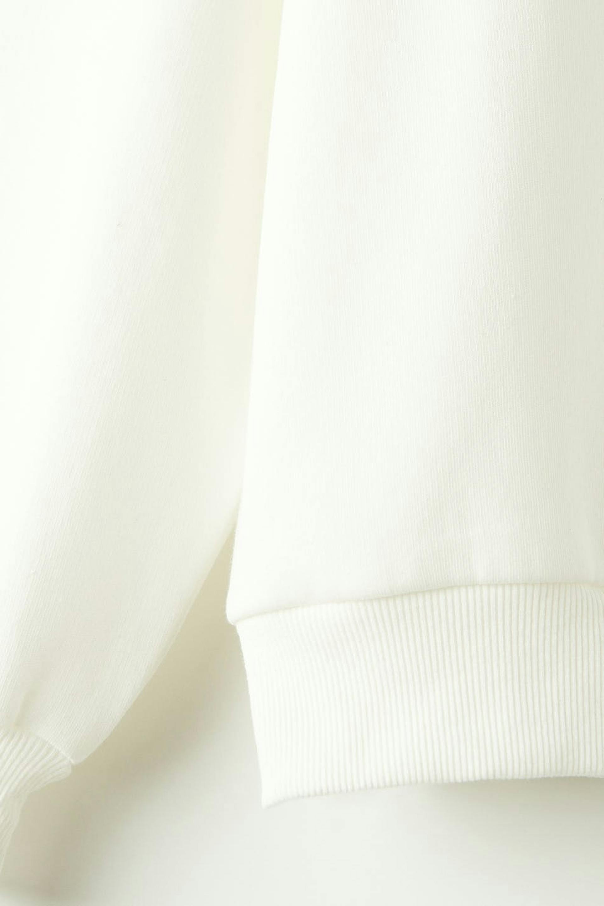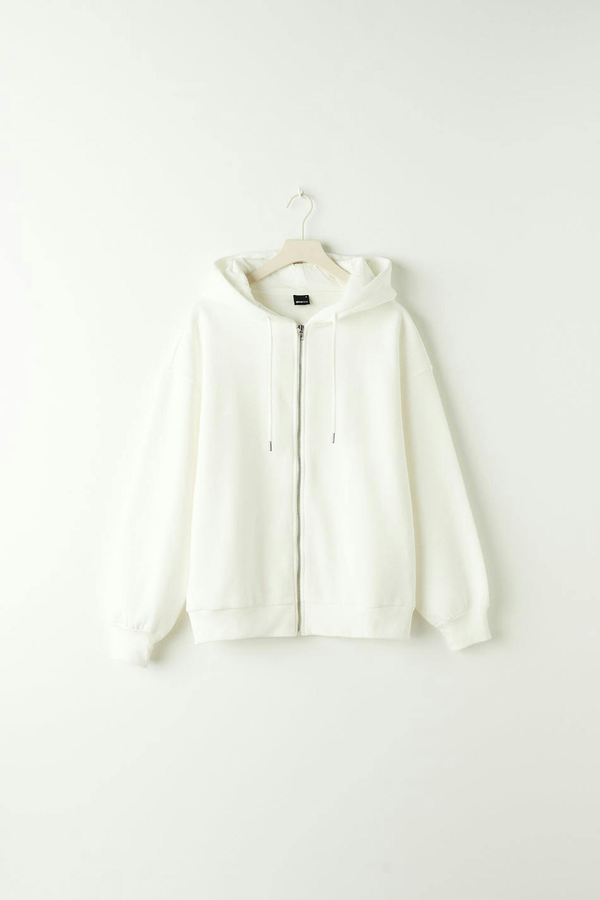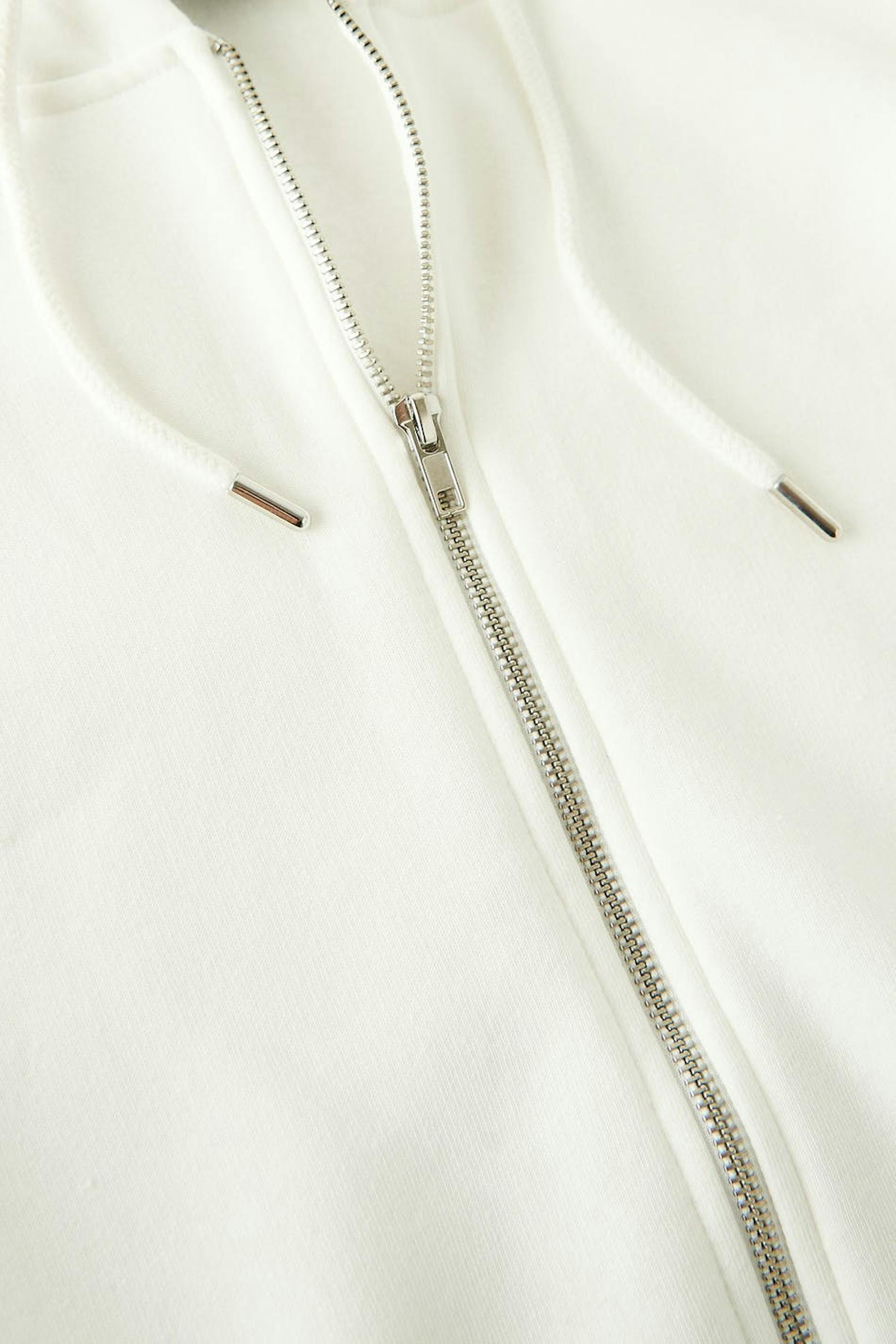 Hoodie in jersey with an oversize fit. The hoodie is white and has zip closure in front. It has drawstrings at the hood and ribbed sleeve ends.