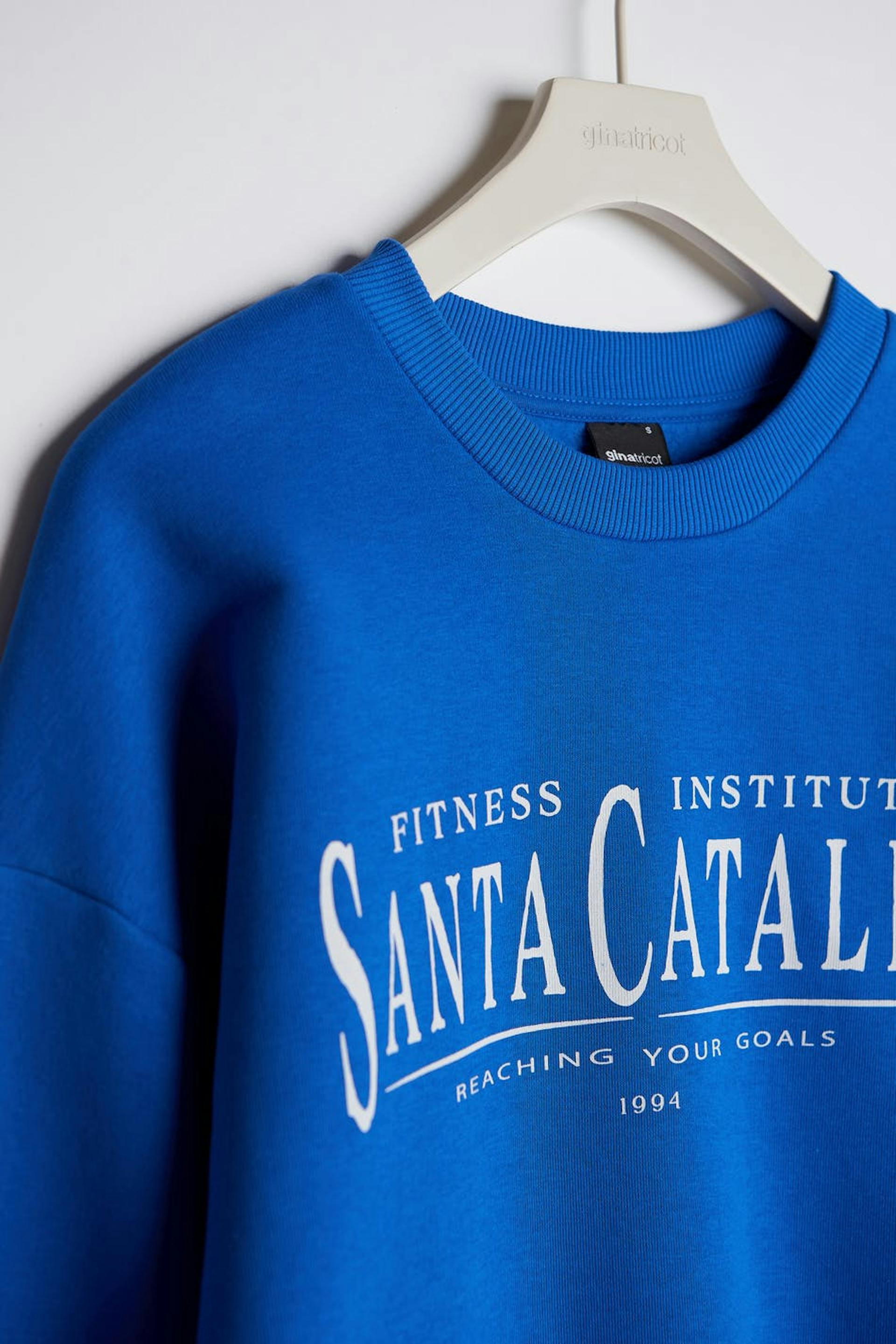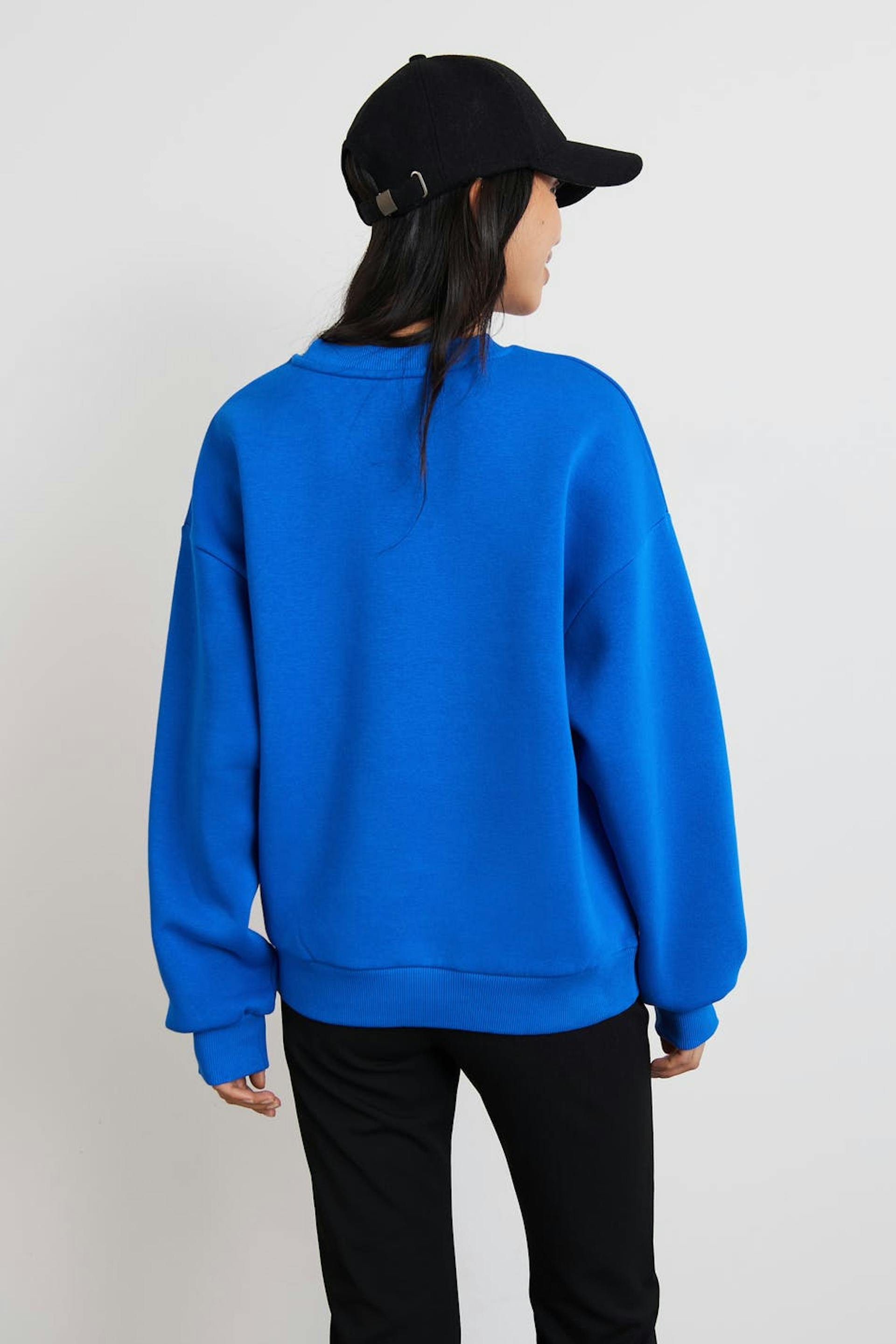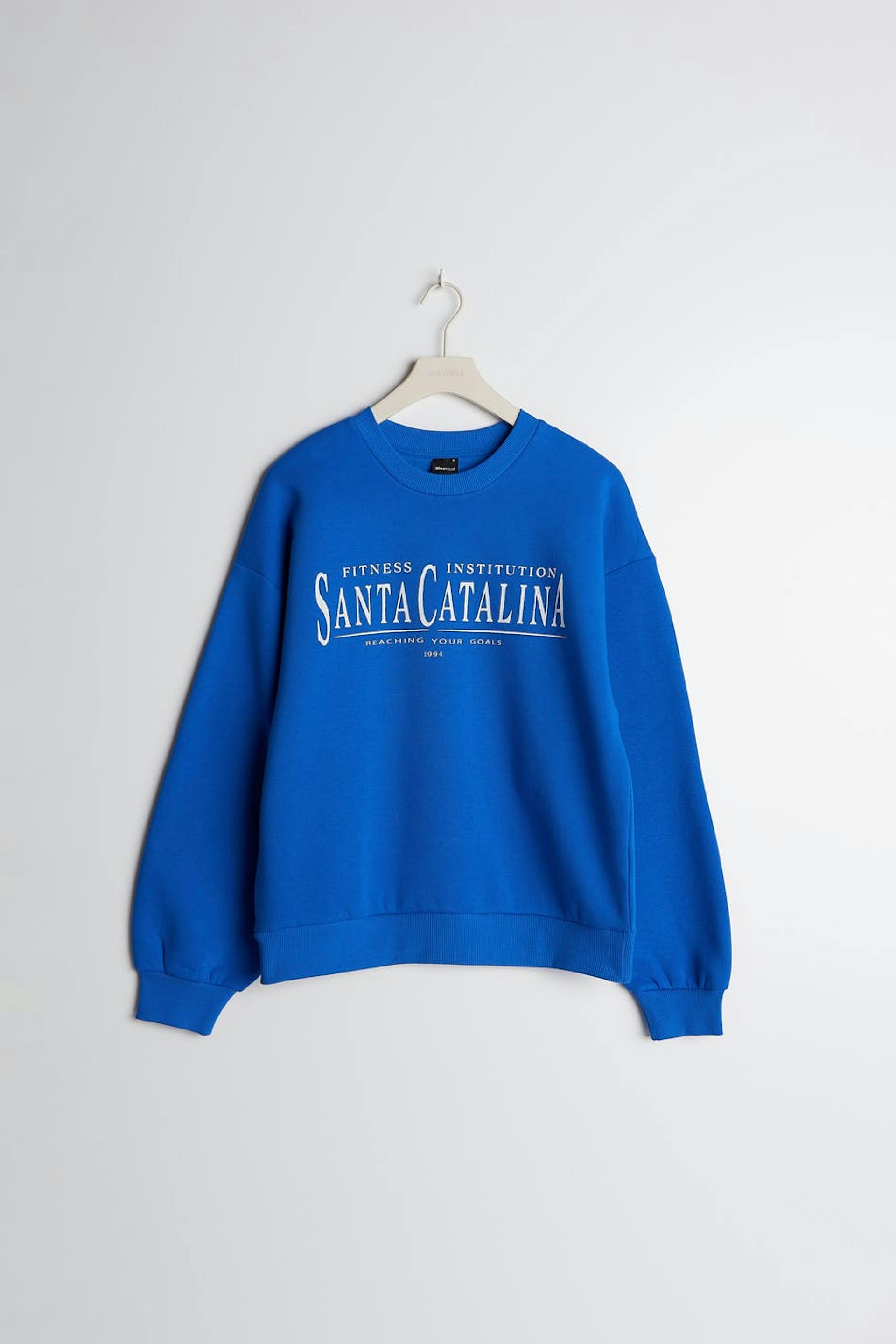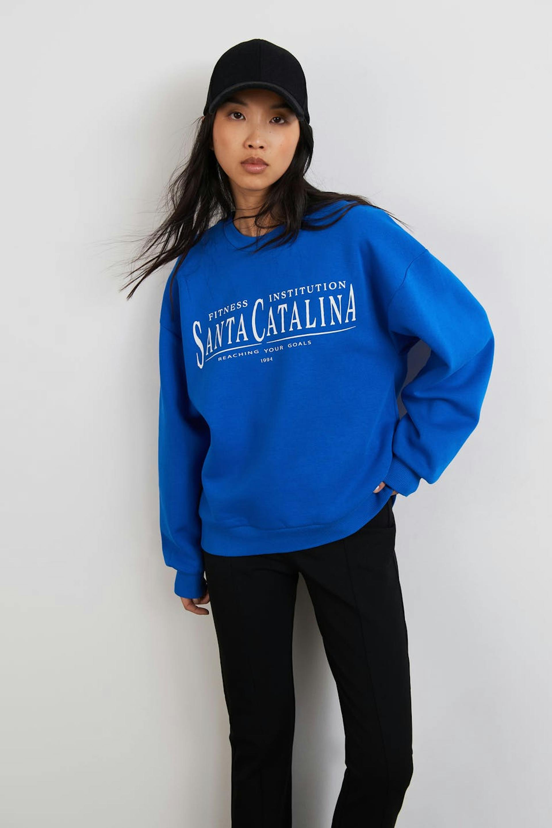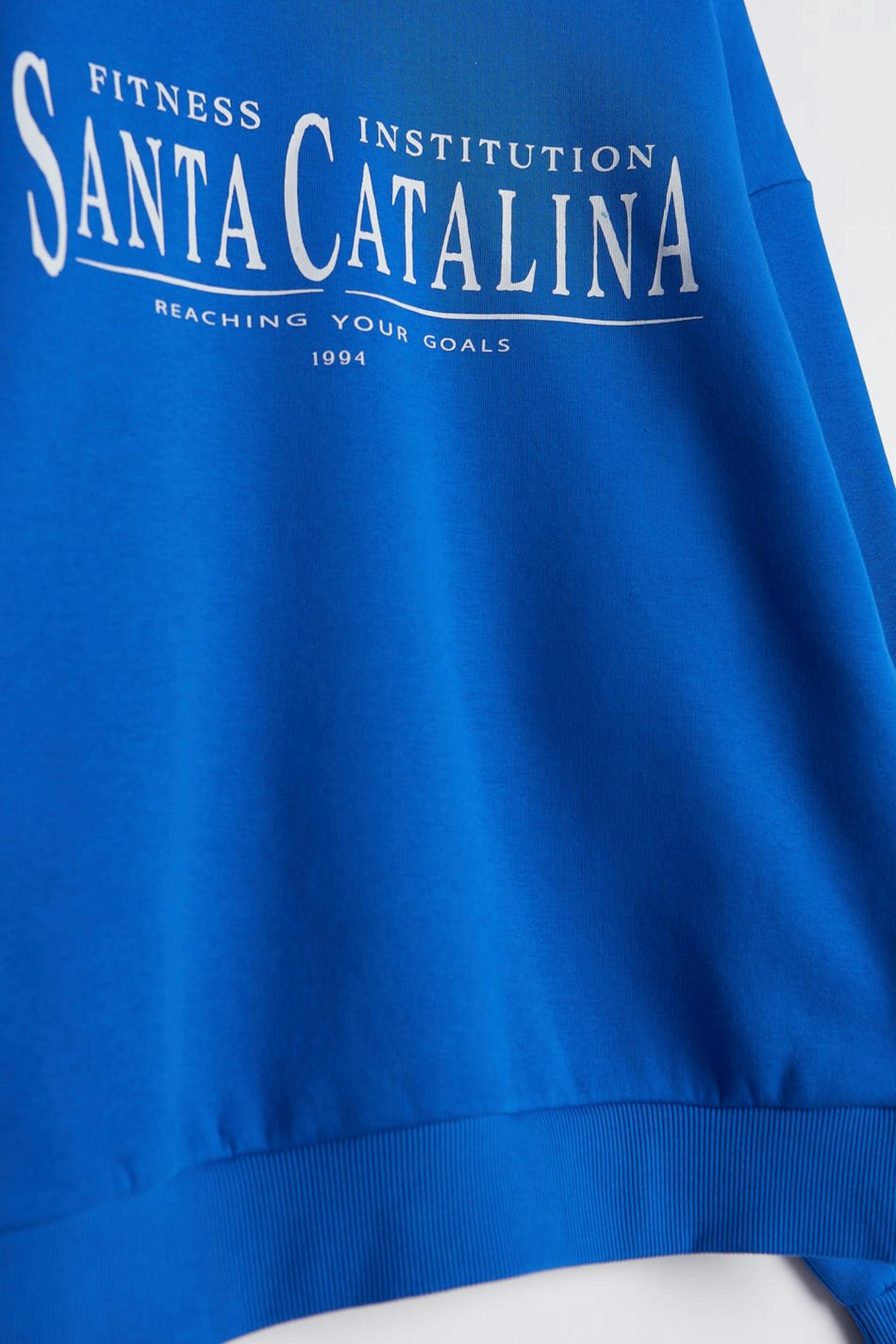 Sweatshirt with print. The sweatshirt is blue and has an oversize fit. It has a rounded neckline and a ribbed cuff on the sleeve ends and at the bottom hem.
