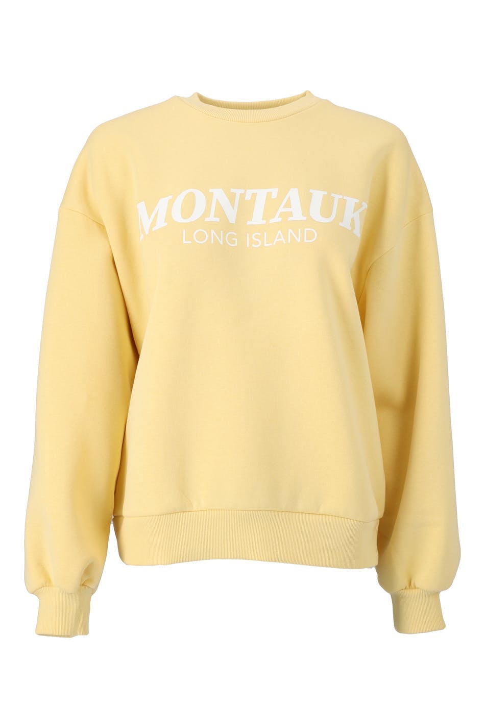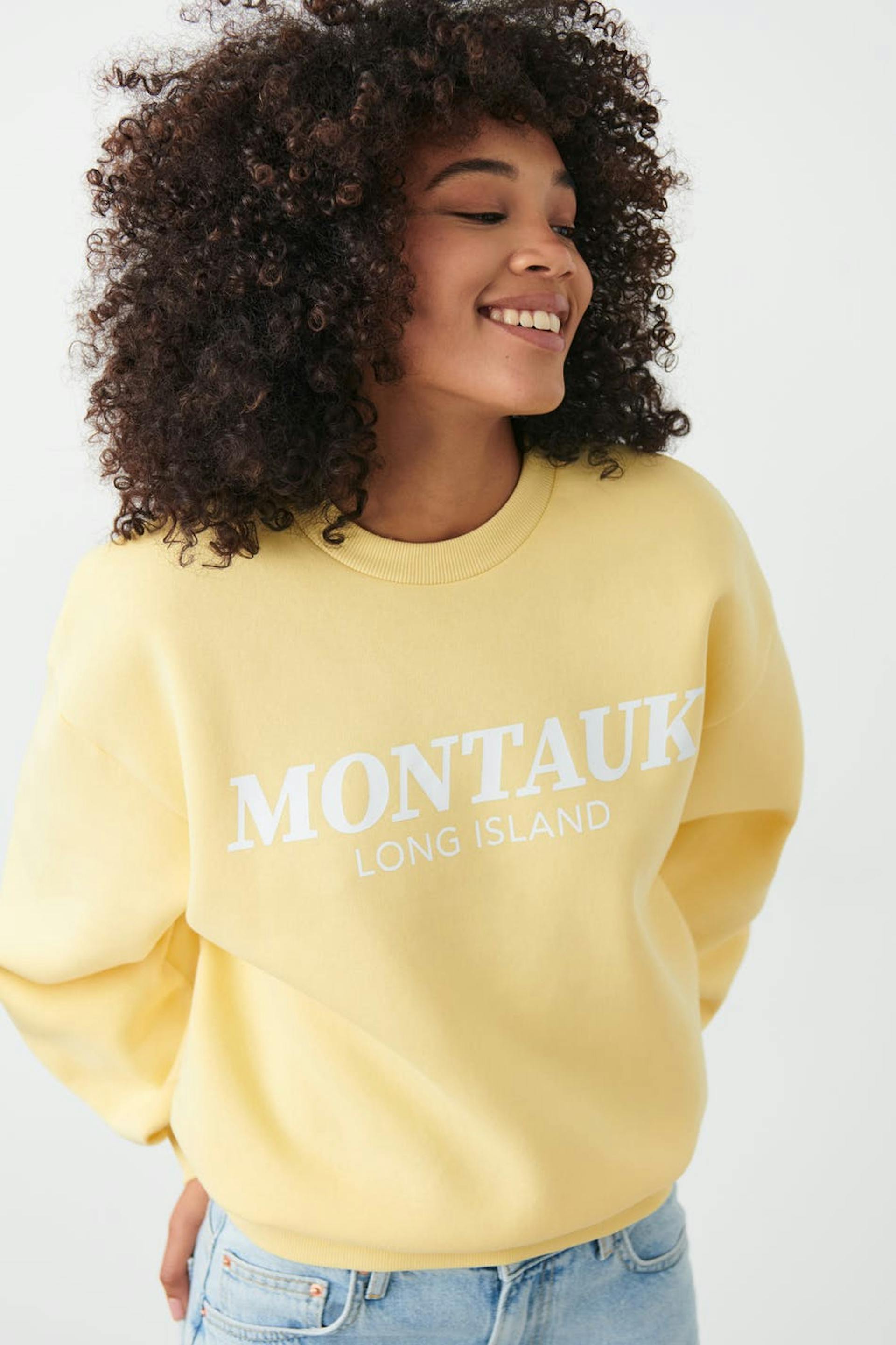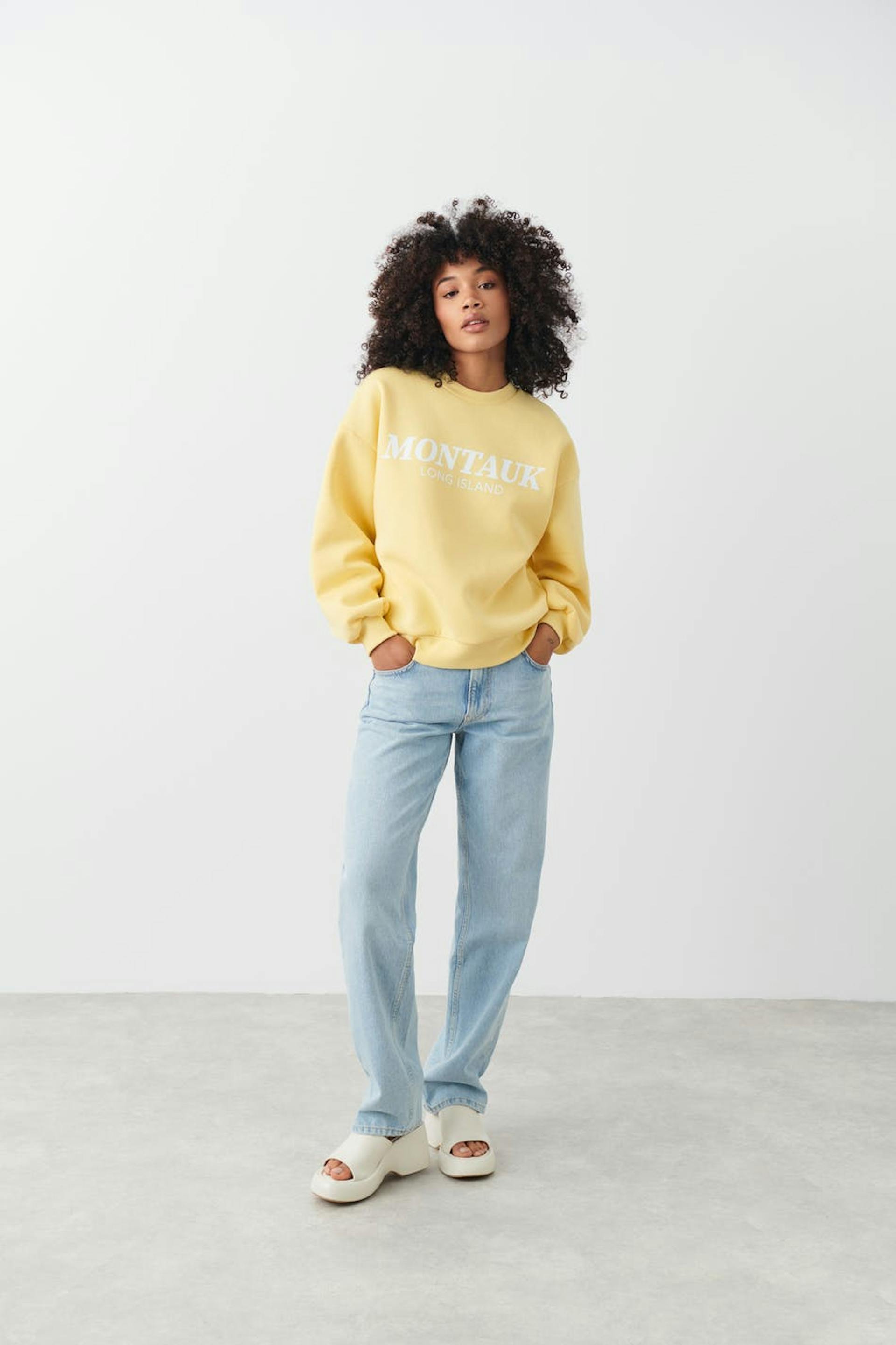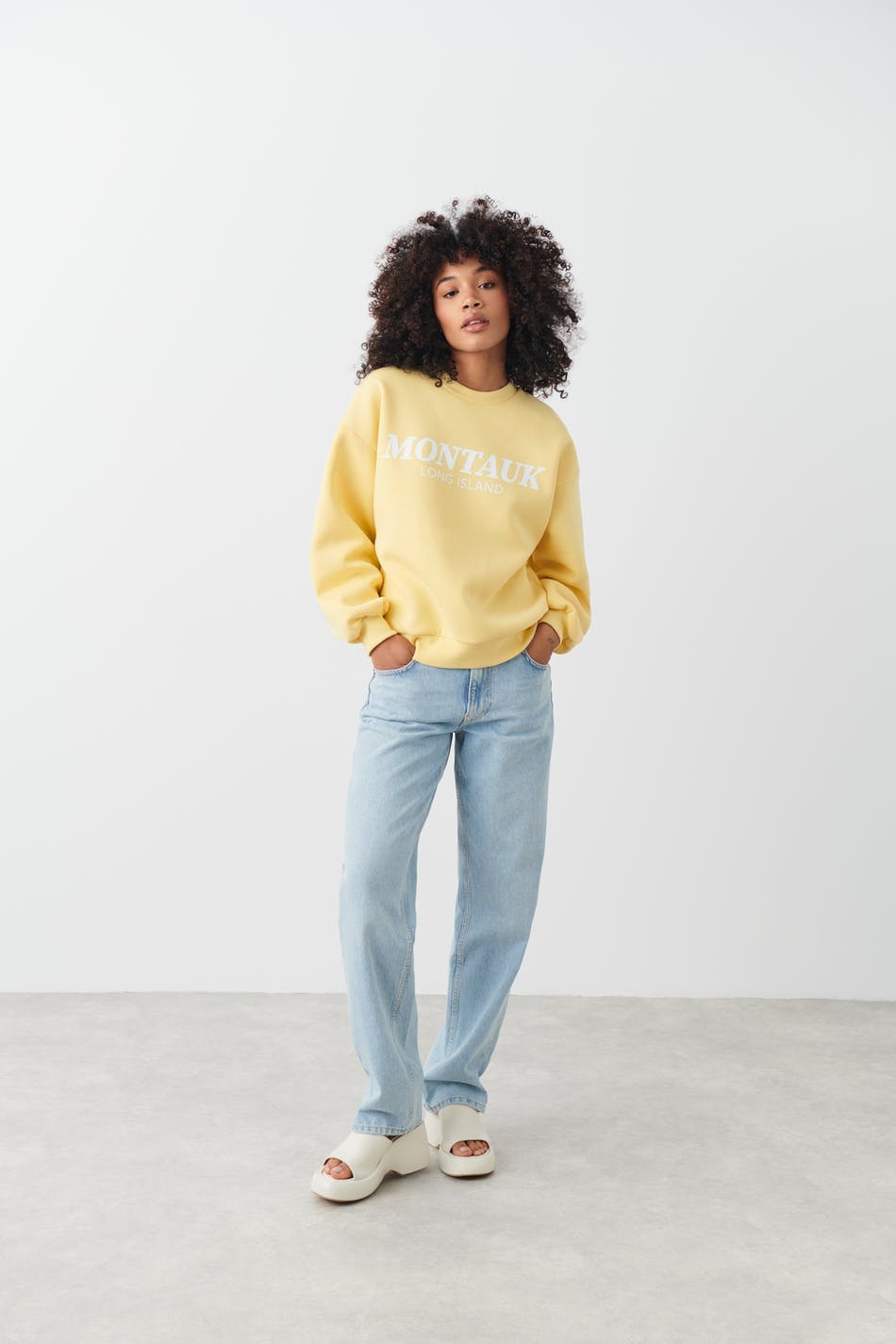 Sweatshirt with an oversize fit. The sweatshirt is yellow and has print in front. It has rounded neckline and ribbing on the sleeve ends and at the bottom hem.
