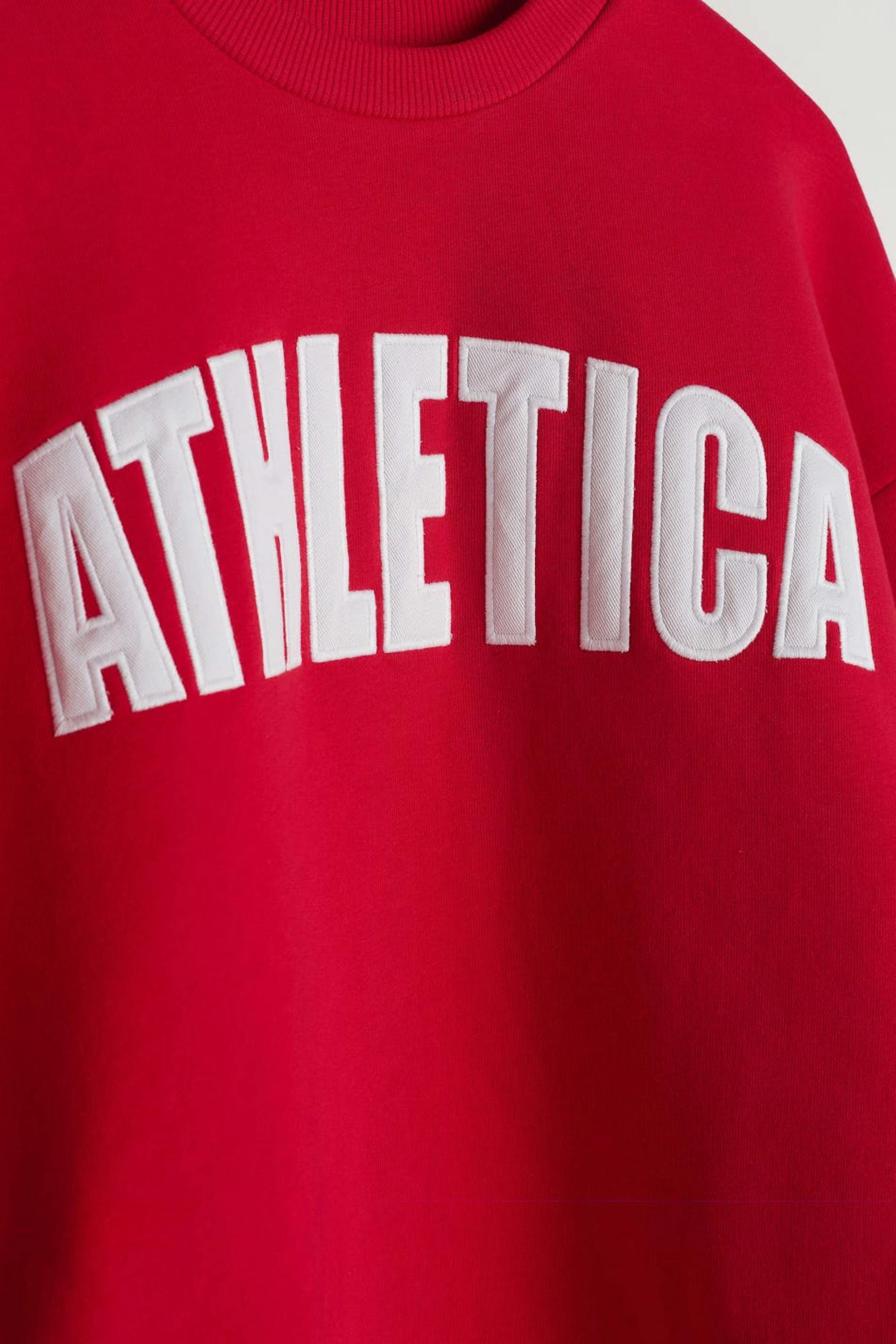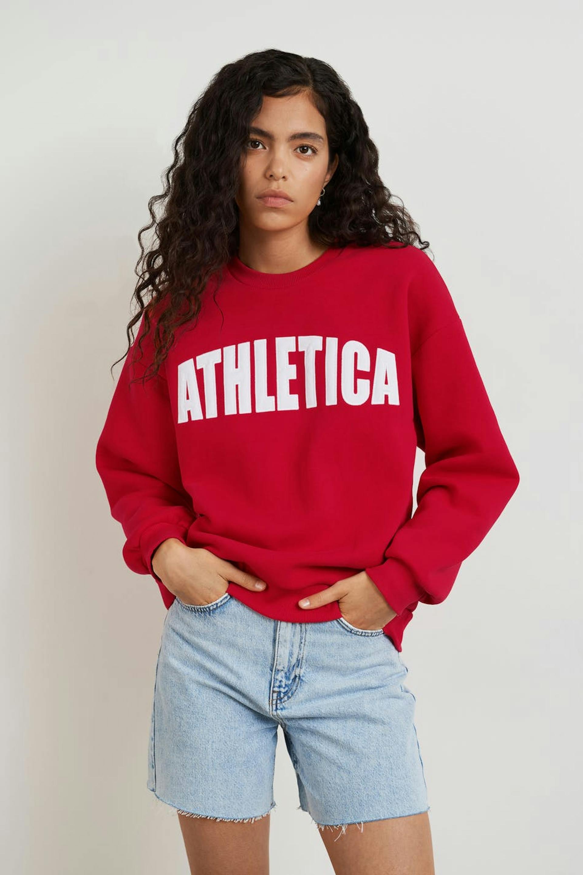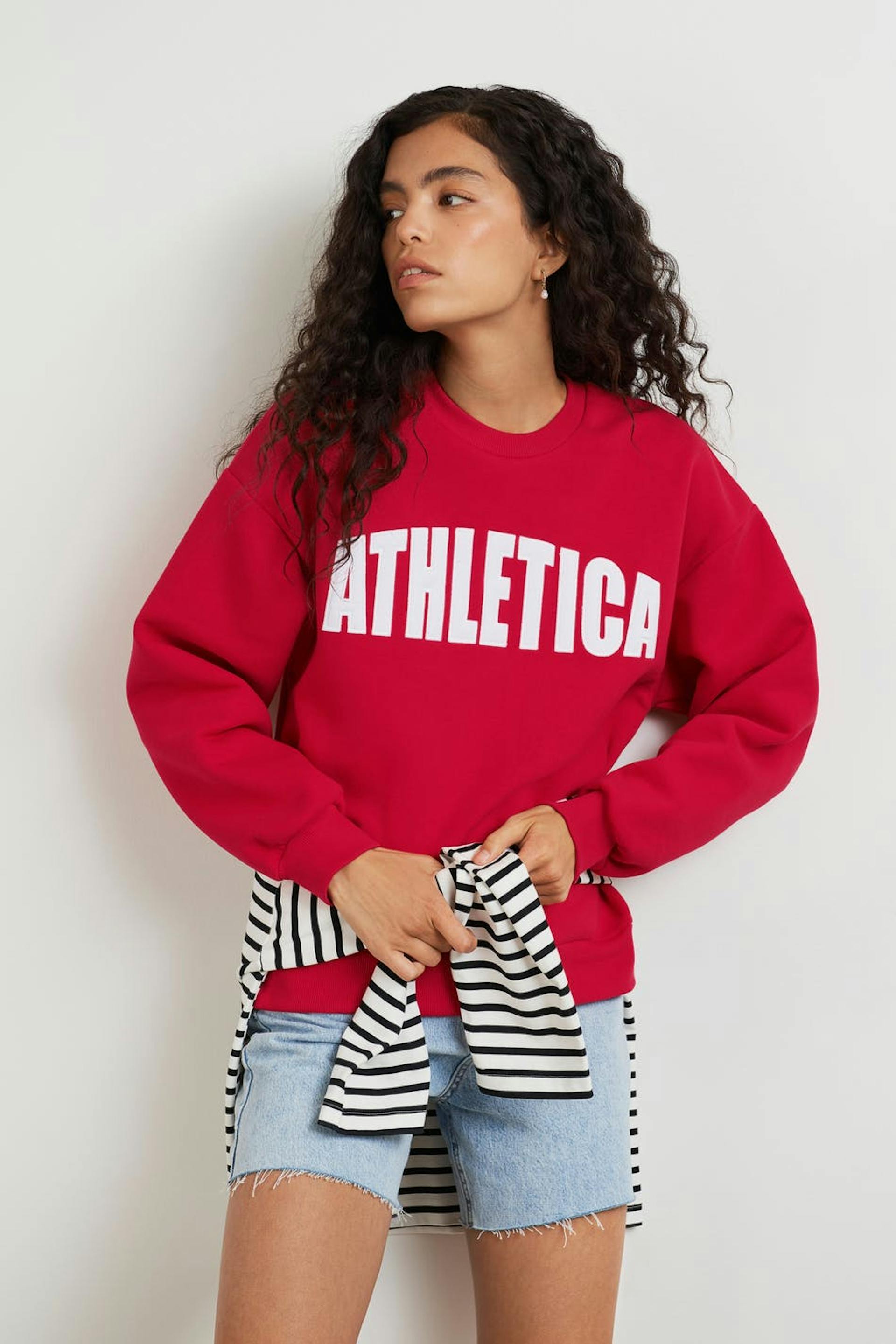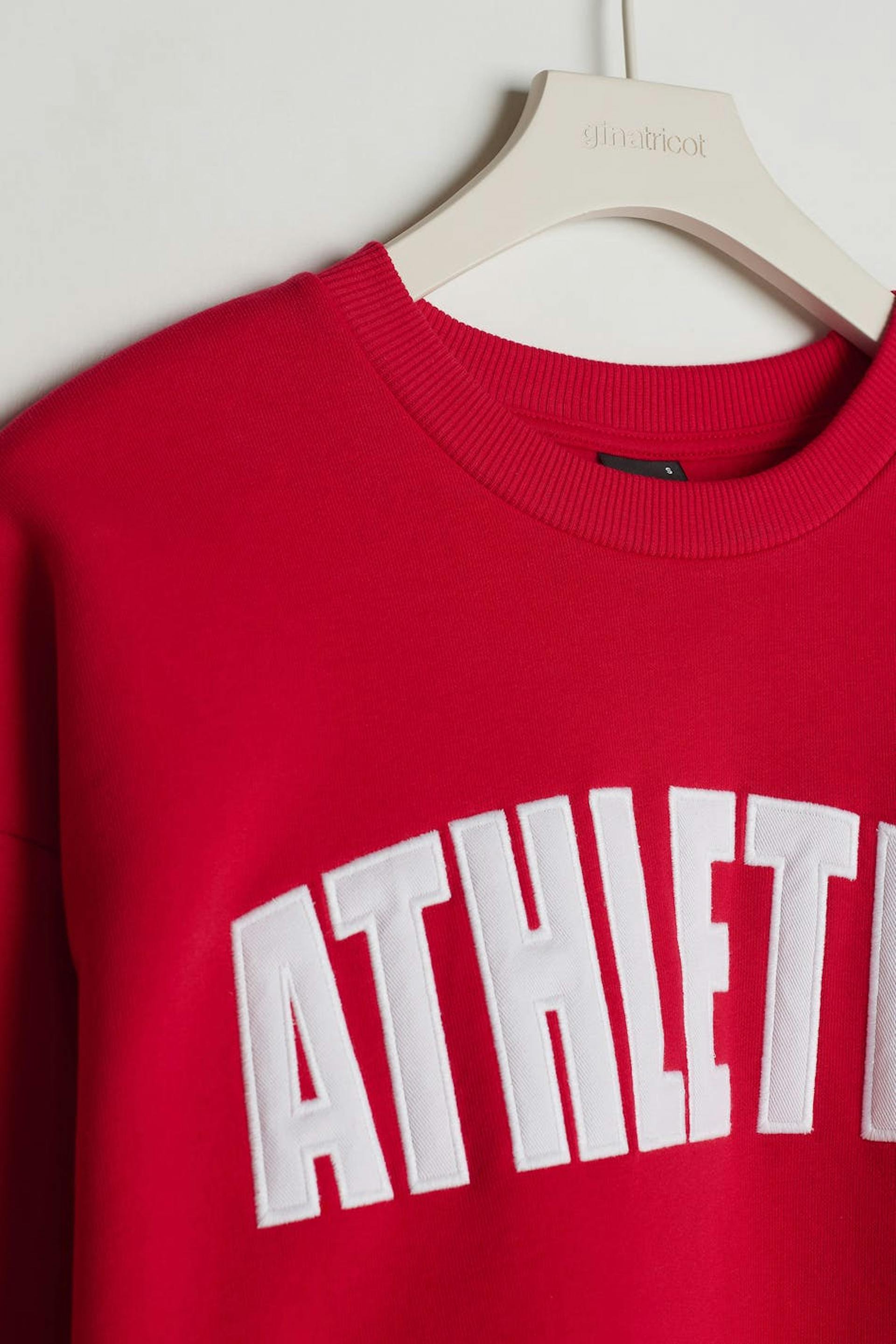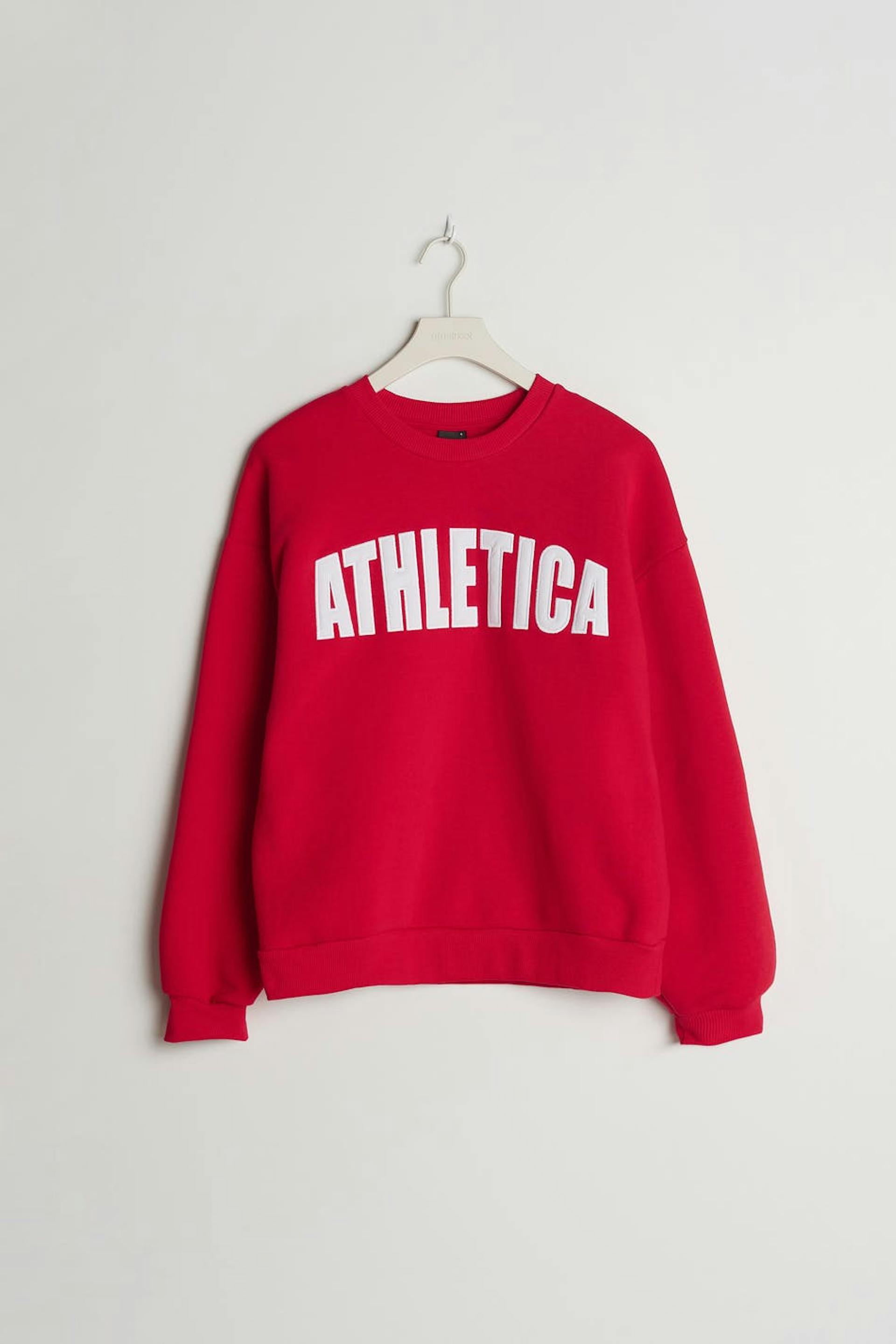 Sweatshirt with an oversize fit. The sweatshirt is red and has embroidery with a white text at the front.