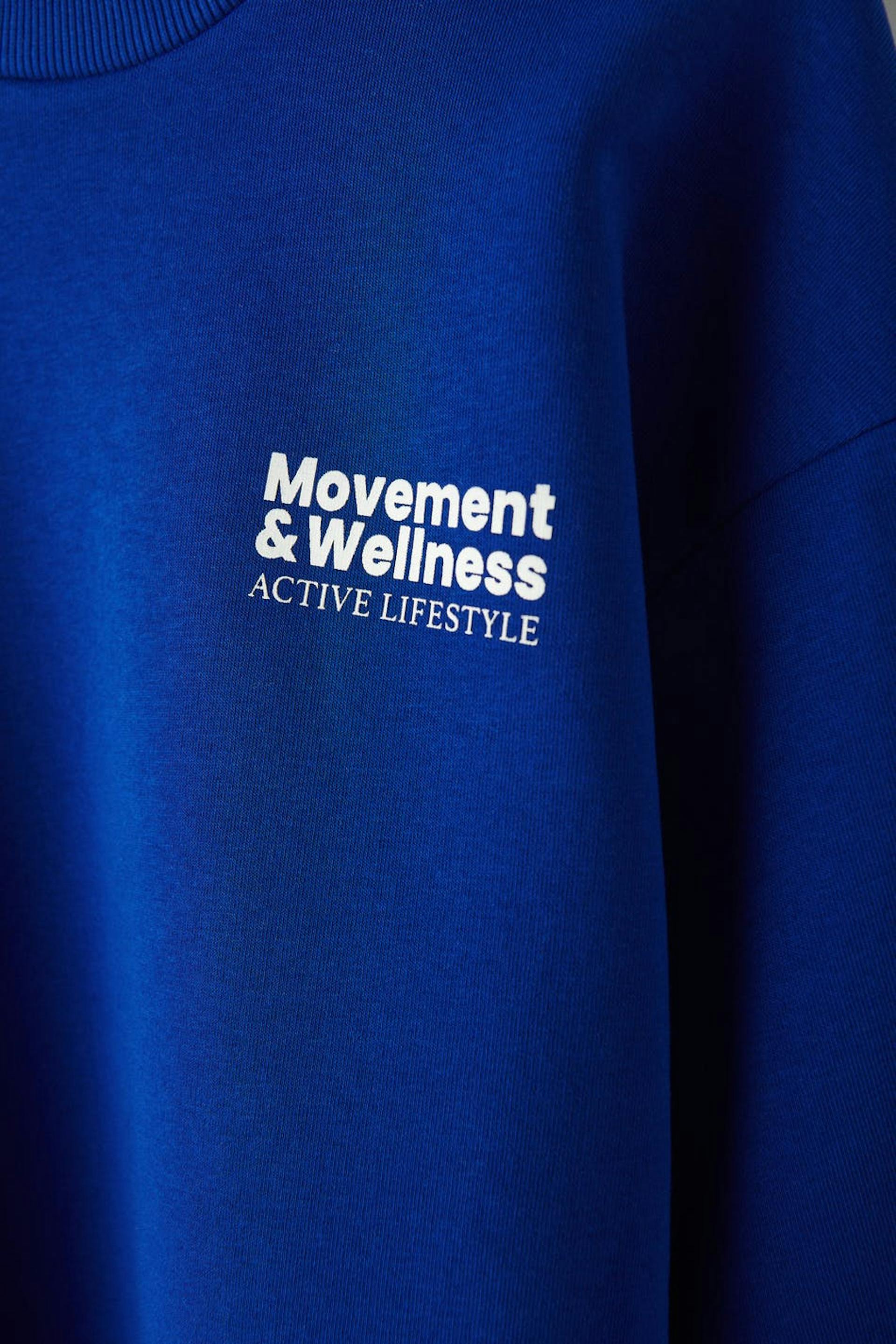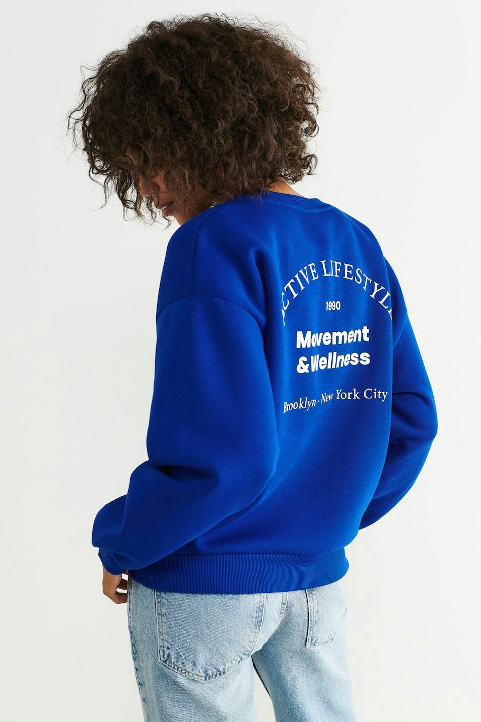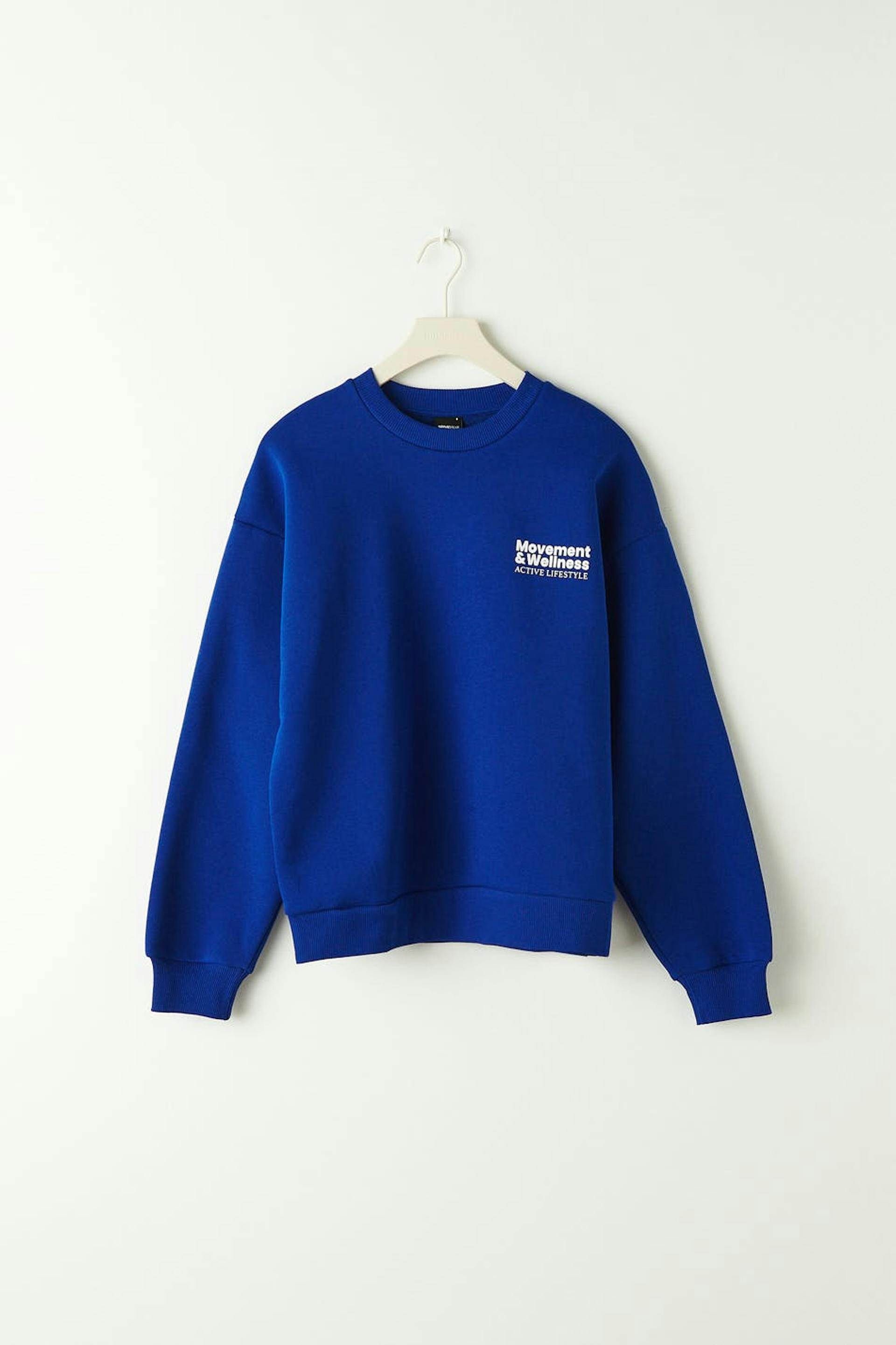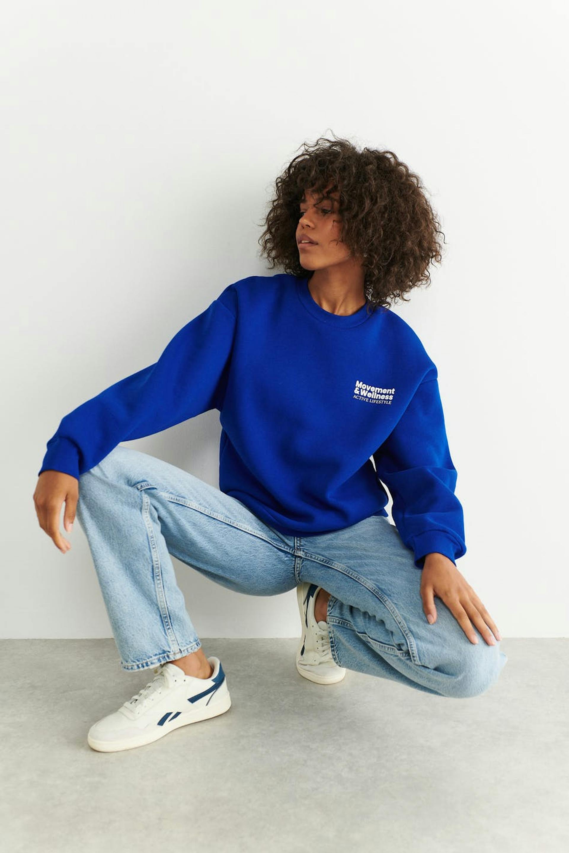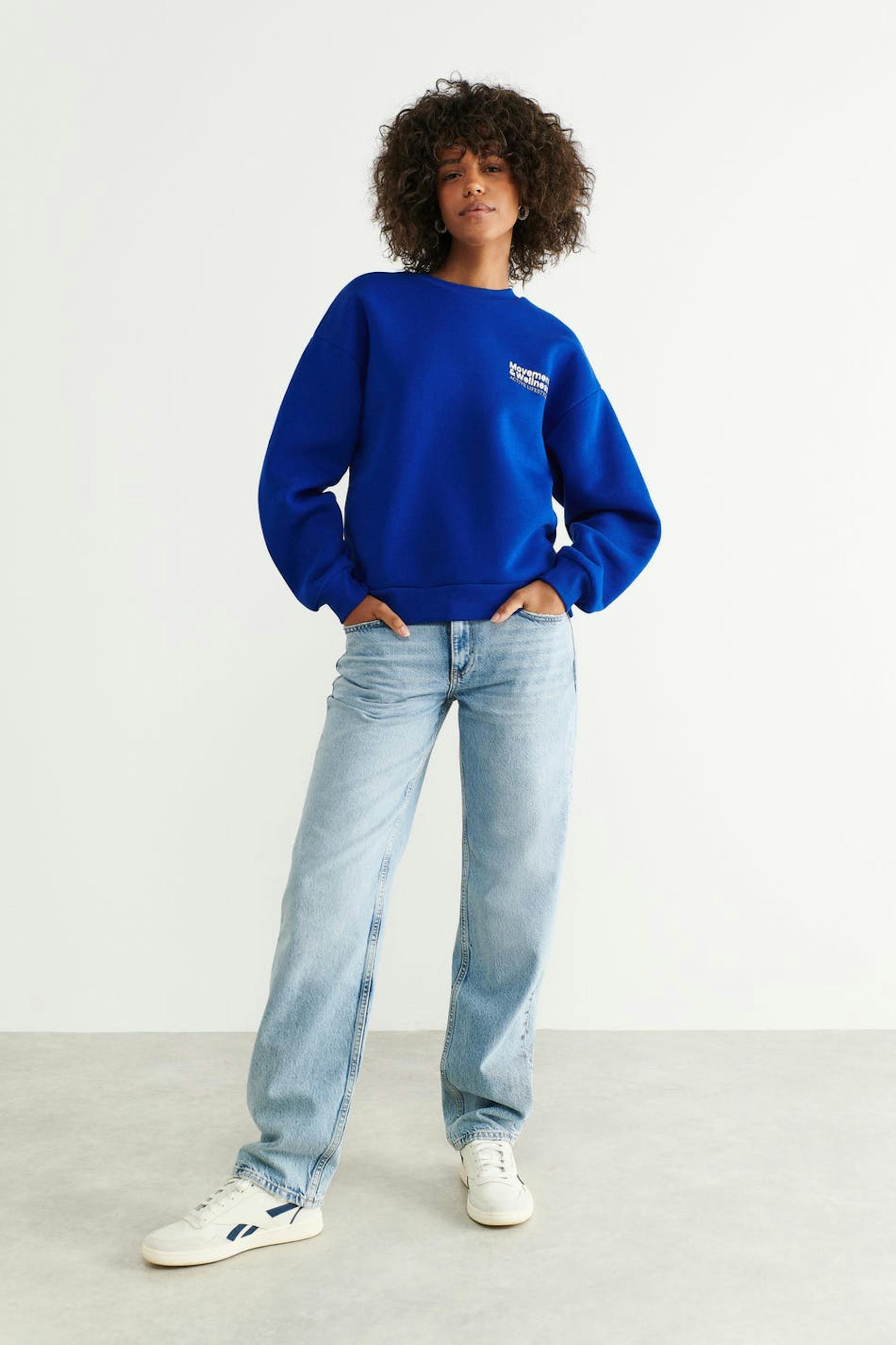 Sweatshirt with an oversize fit. The sweatshirt is blue and has a rounded neckline. It has a ribbed cuff on the sleeve ends and at the bottom hem.