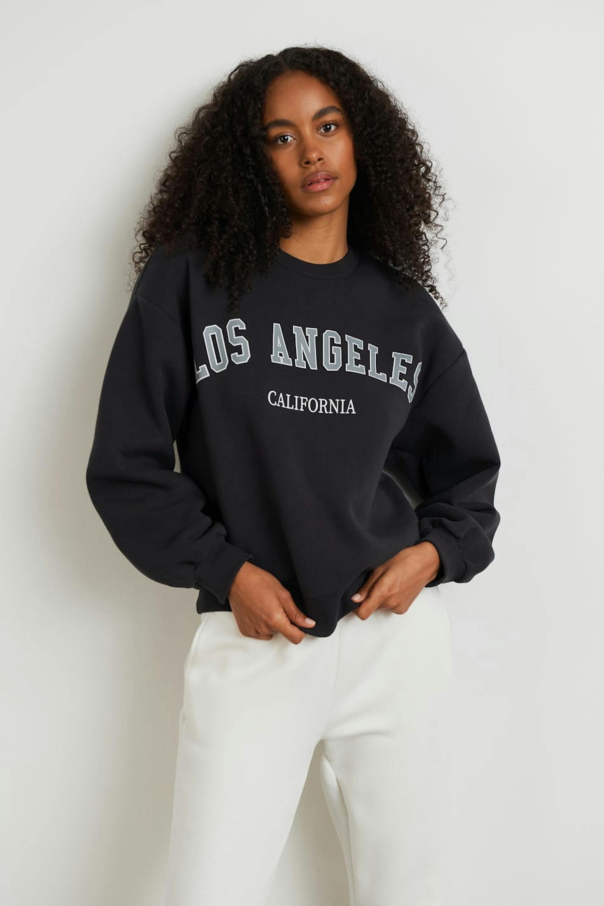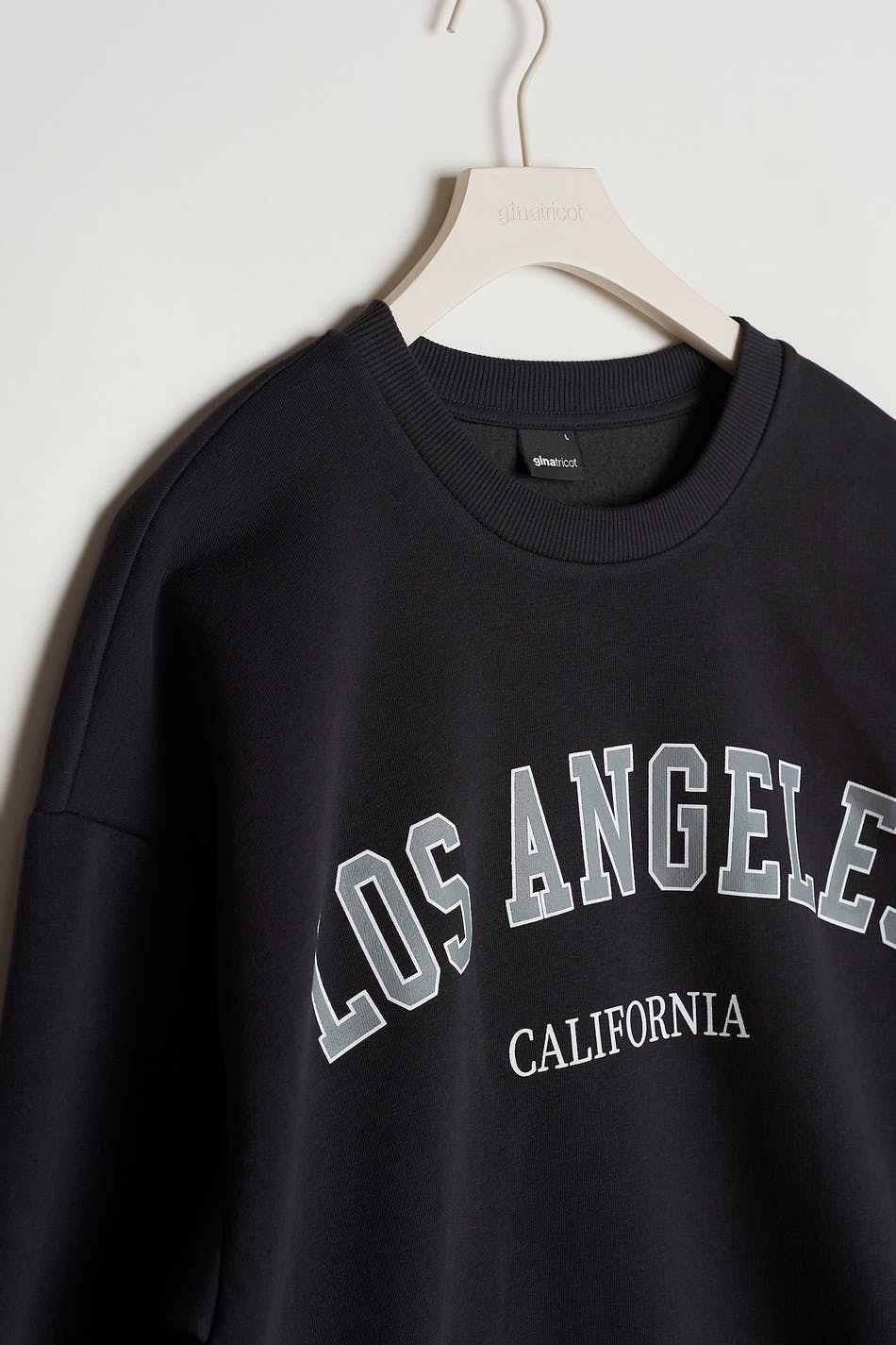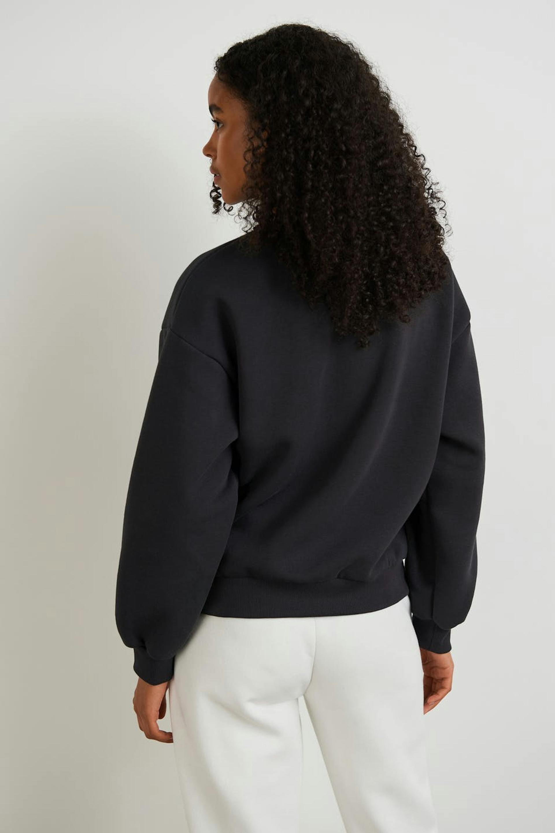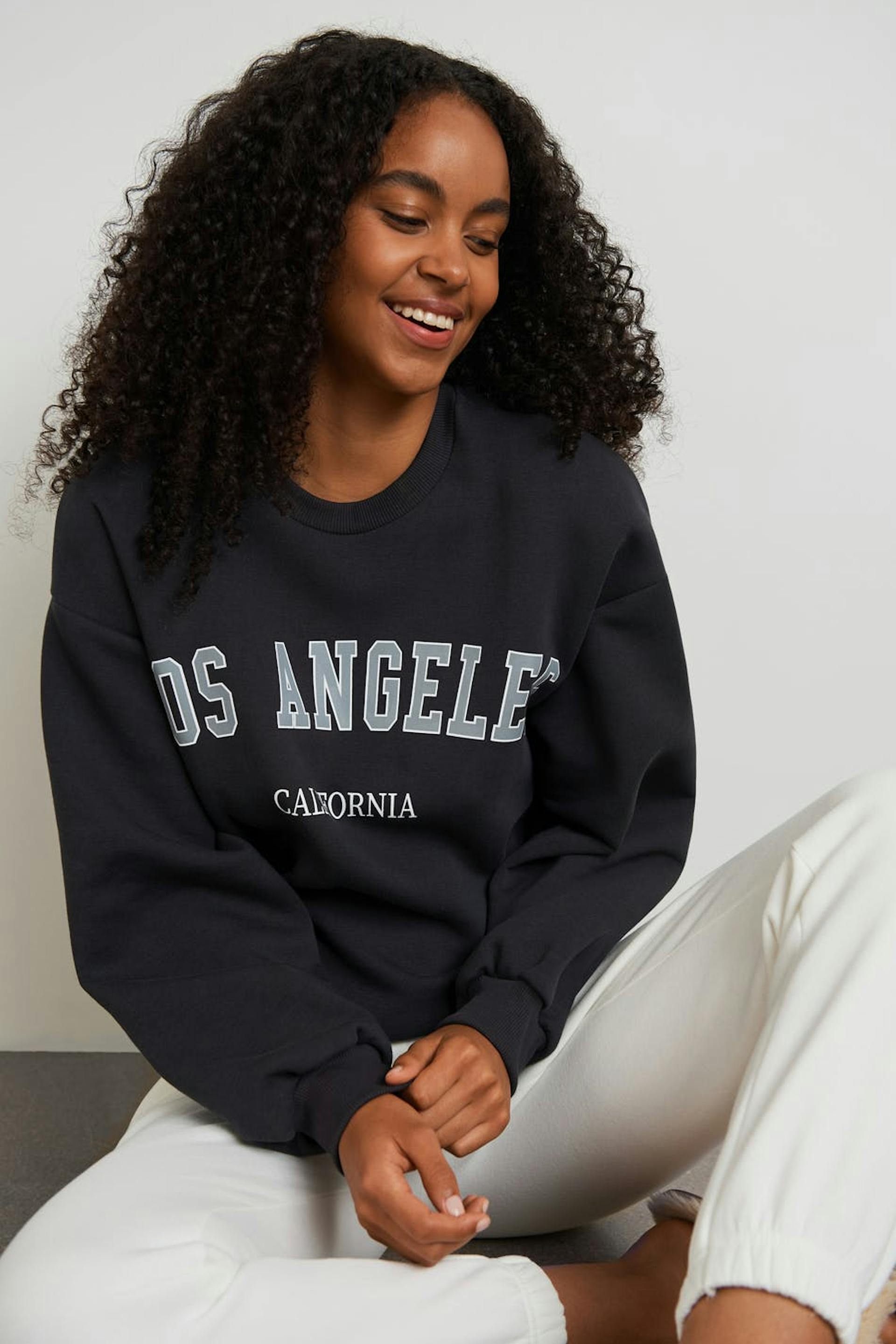 Sweatshirt with an oversize fit. The sweatshirt is black and has a sporty print with a blue text on the front. It has a ribbed cuff on the sleeve ends and at the bottom hem.