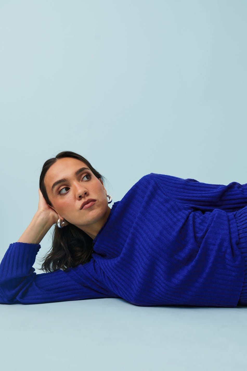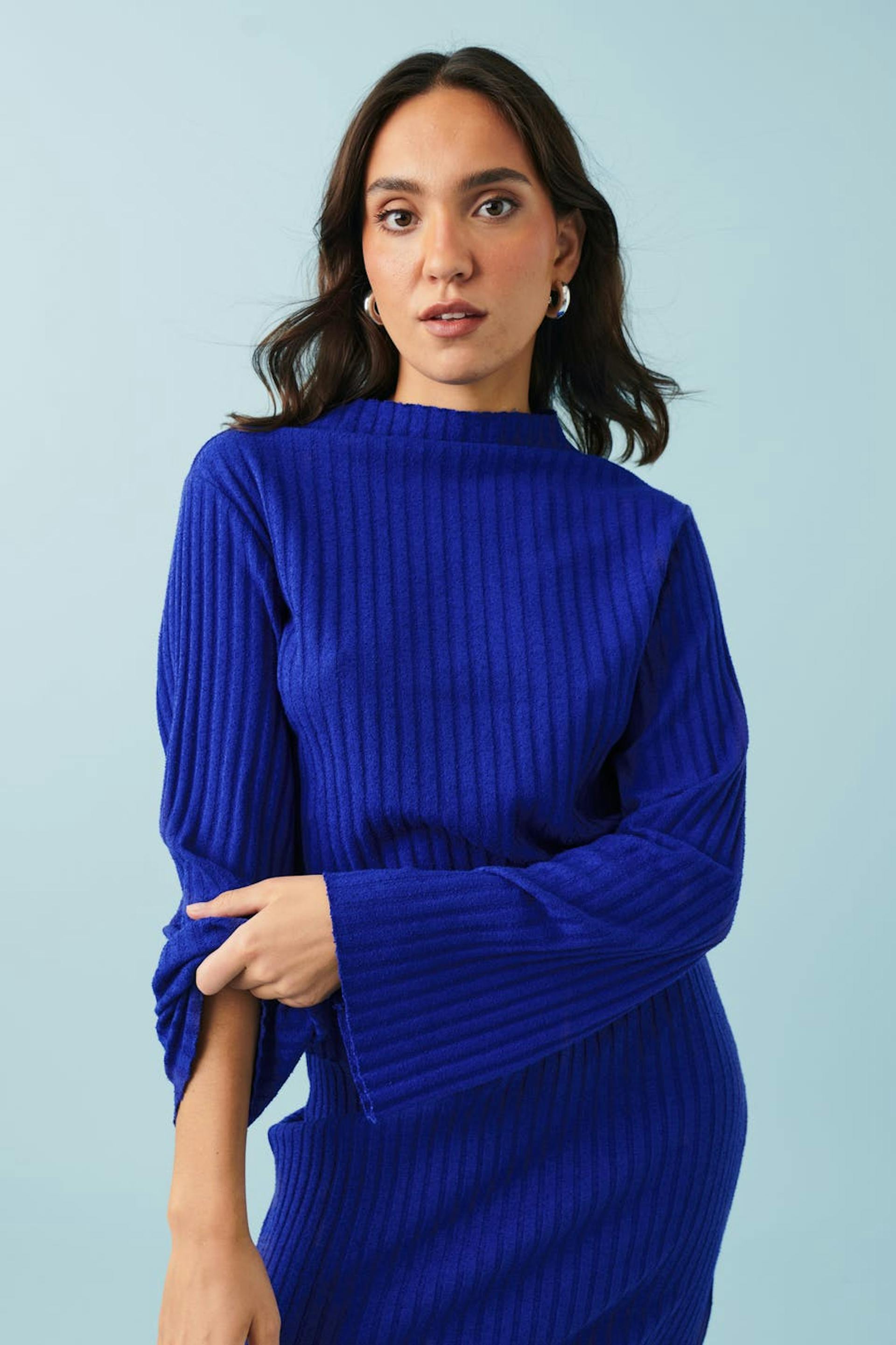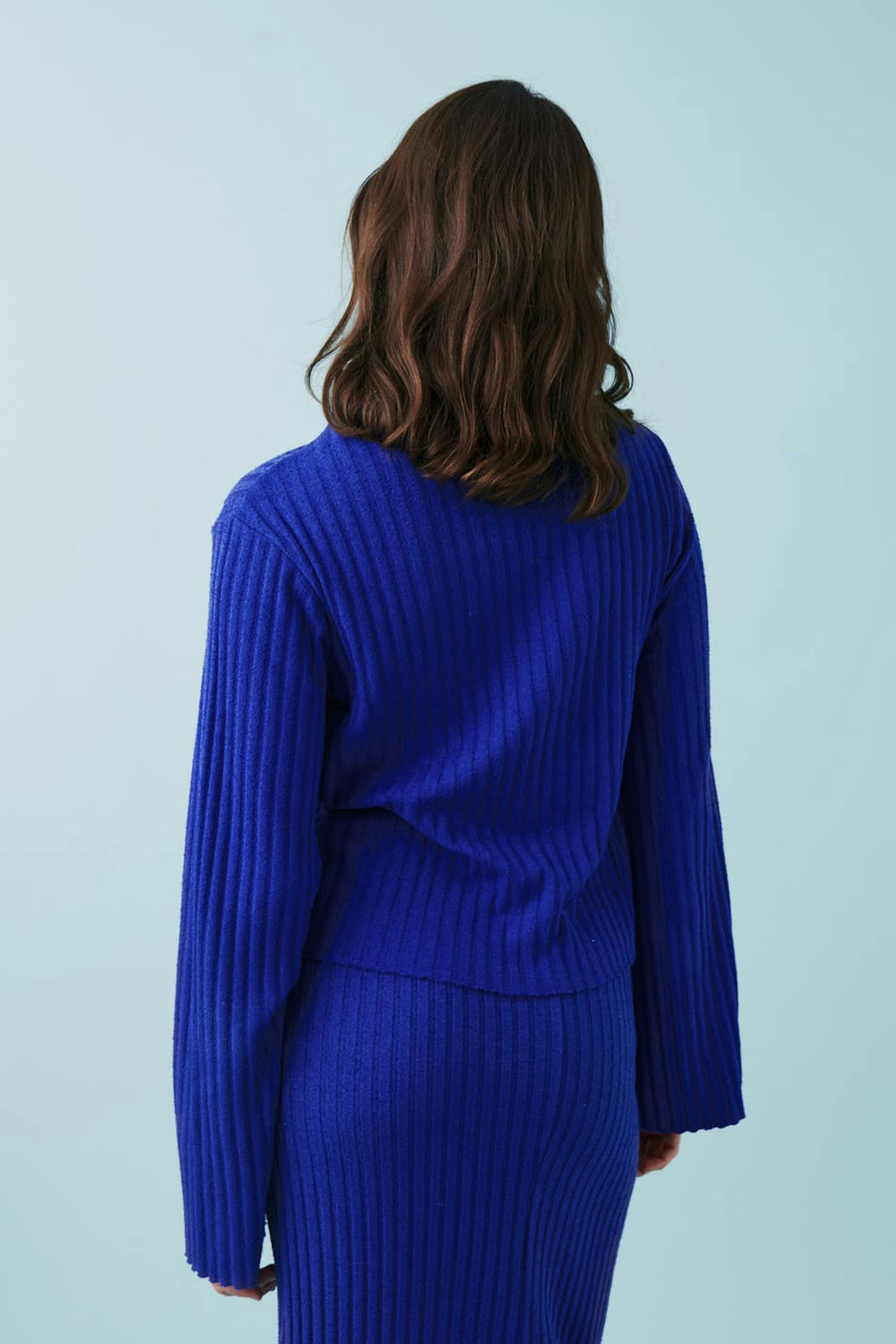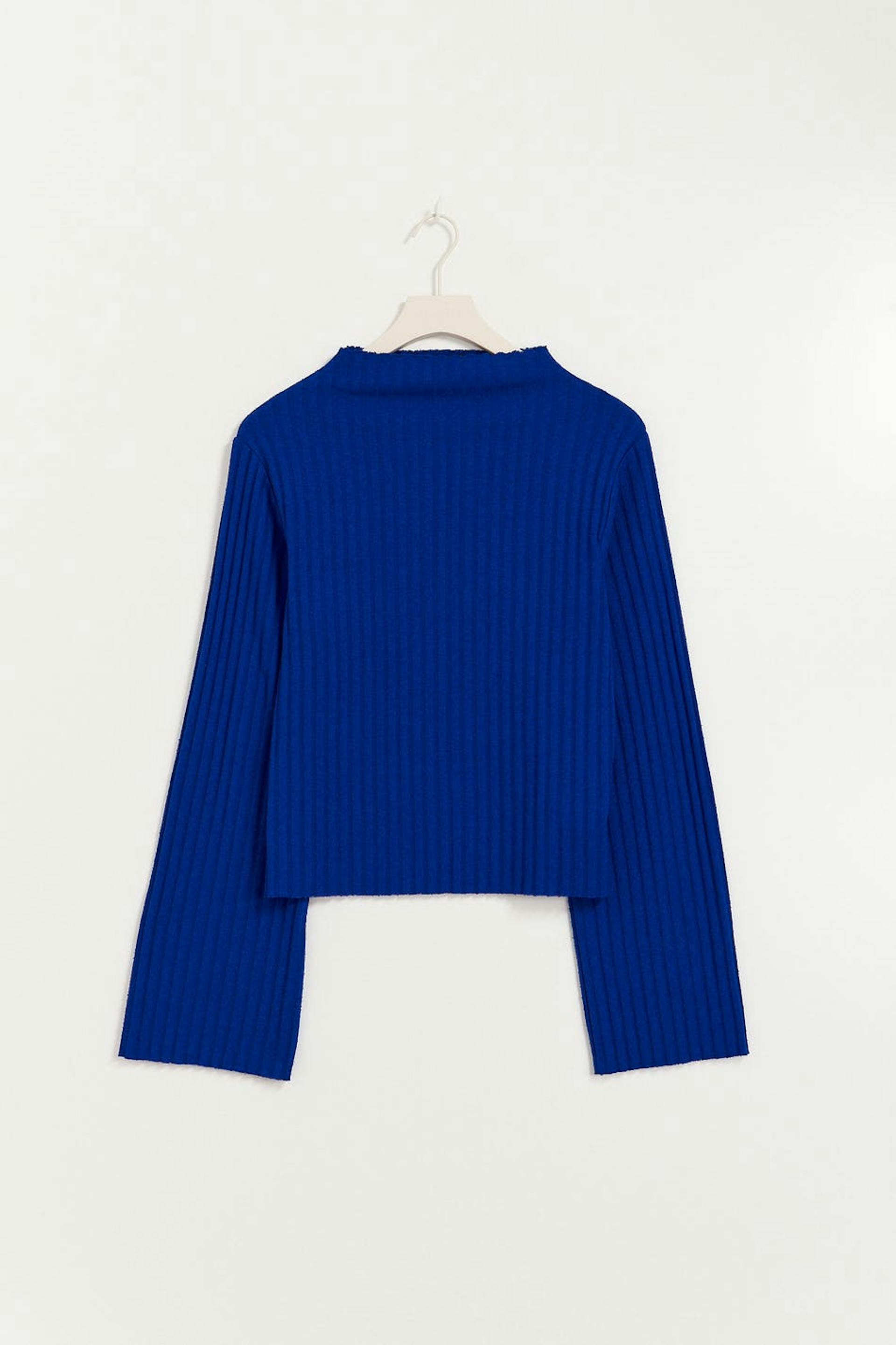 Ribbed jumper in jersey with oversize fit. The jumper is blue and has funnel neck. It has regular length, raw edges and long, flared sleeve.