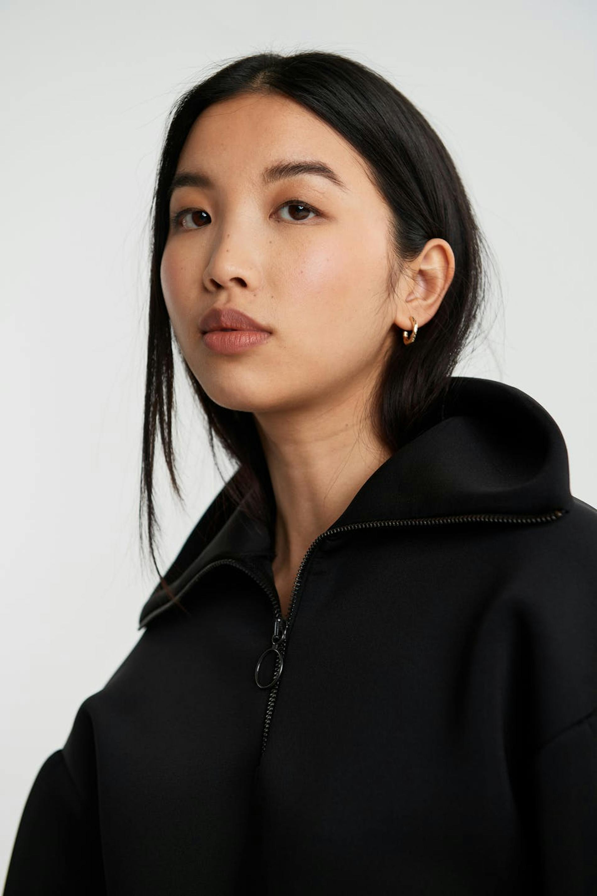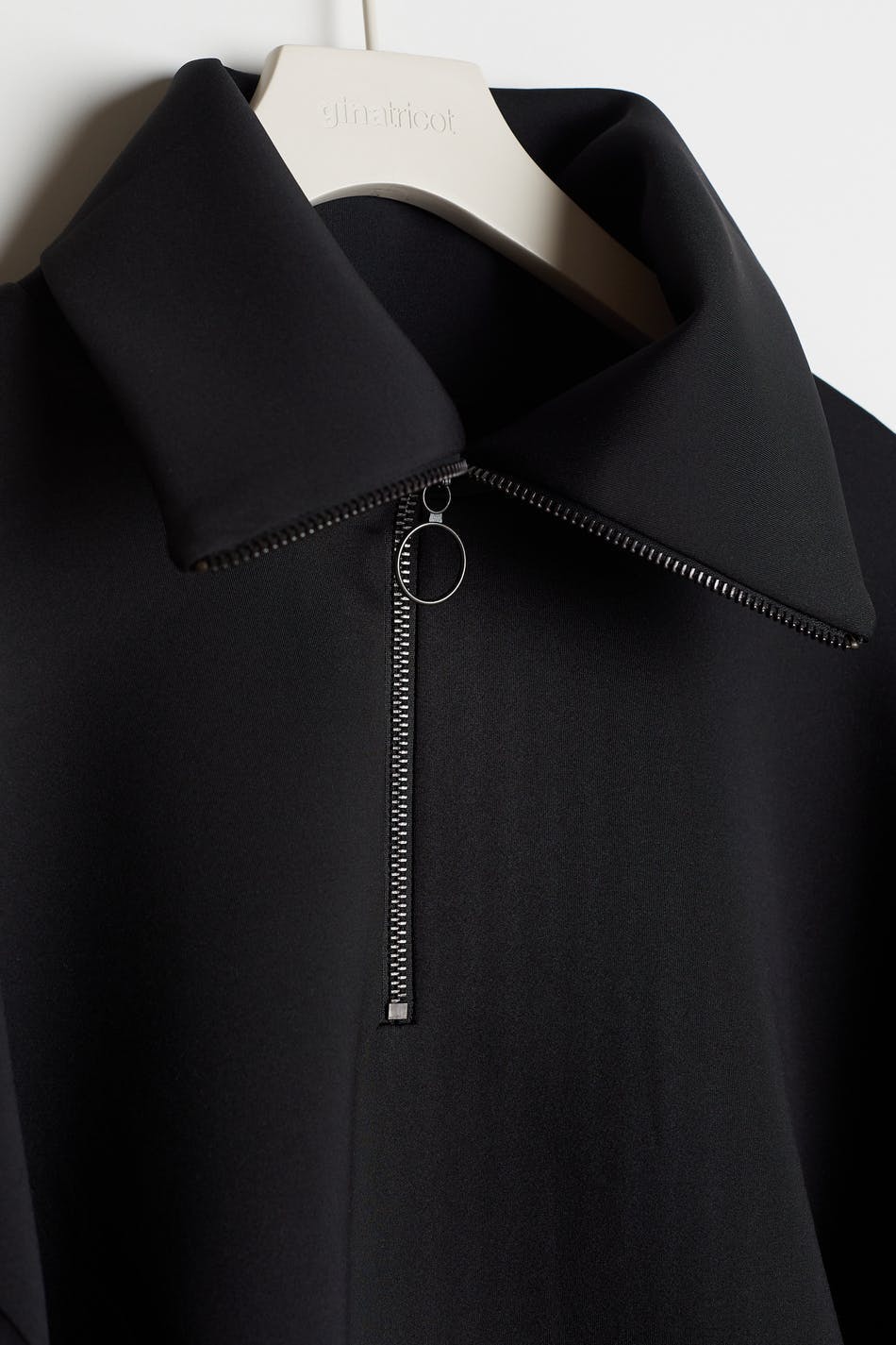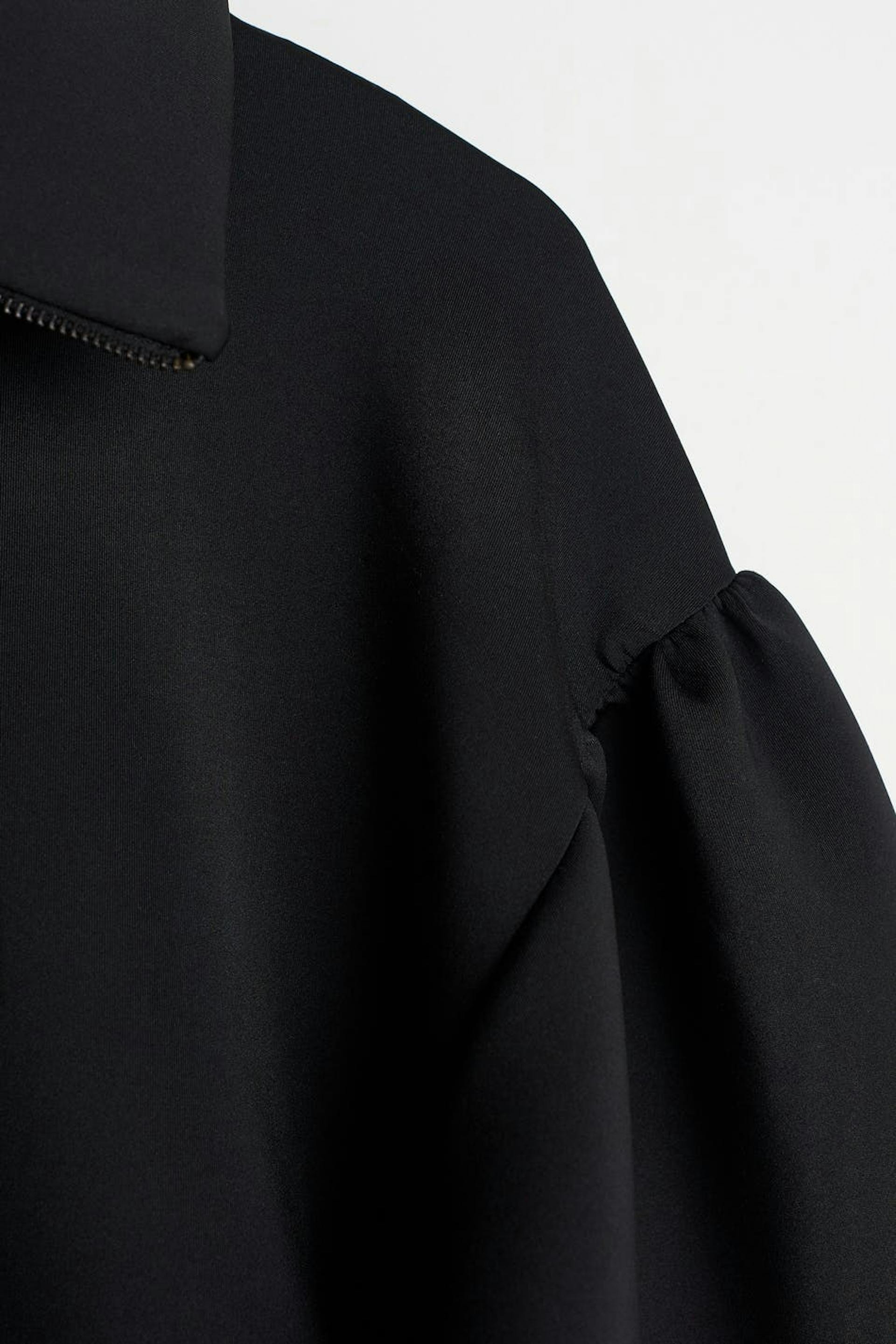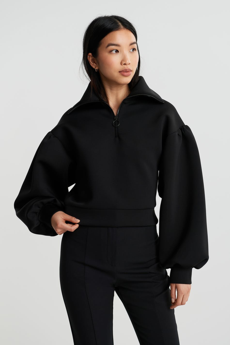 Sweat with an oversize fit. The sweat is black and has long puff sleeves with a ribbed cuff on the sleeve ends. It has a high neck with a zip at the front.