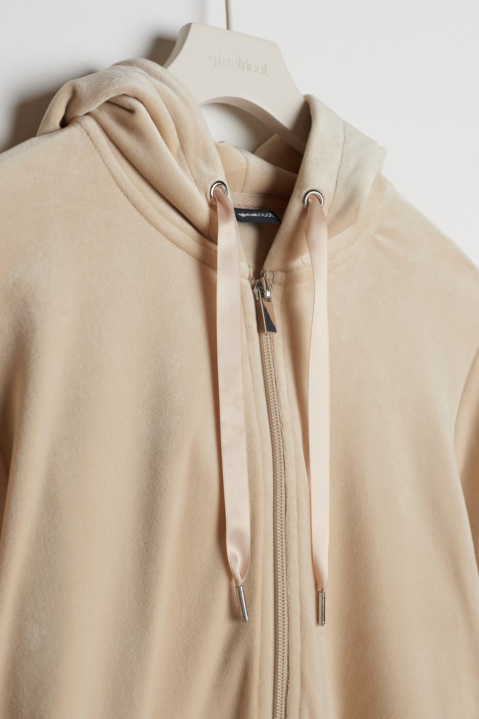 Sweatshirt with a hood with a drawstring in satin. The sweatshirt is beige and has a zip at the front. It is made of velour and has pockets in front. Keep away from fire.