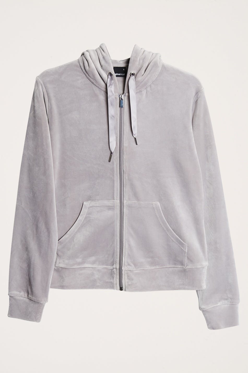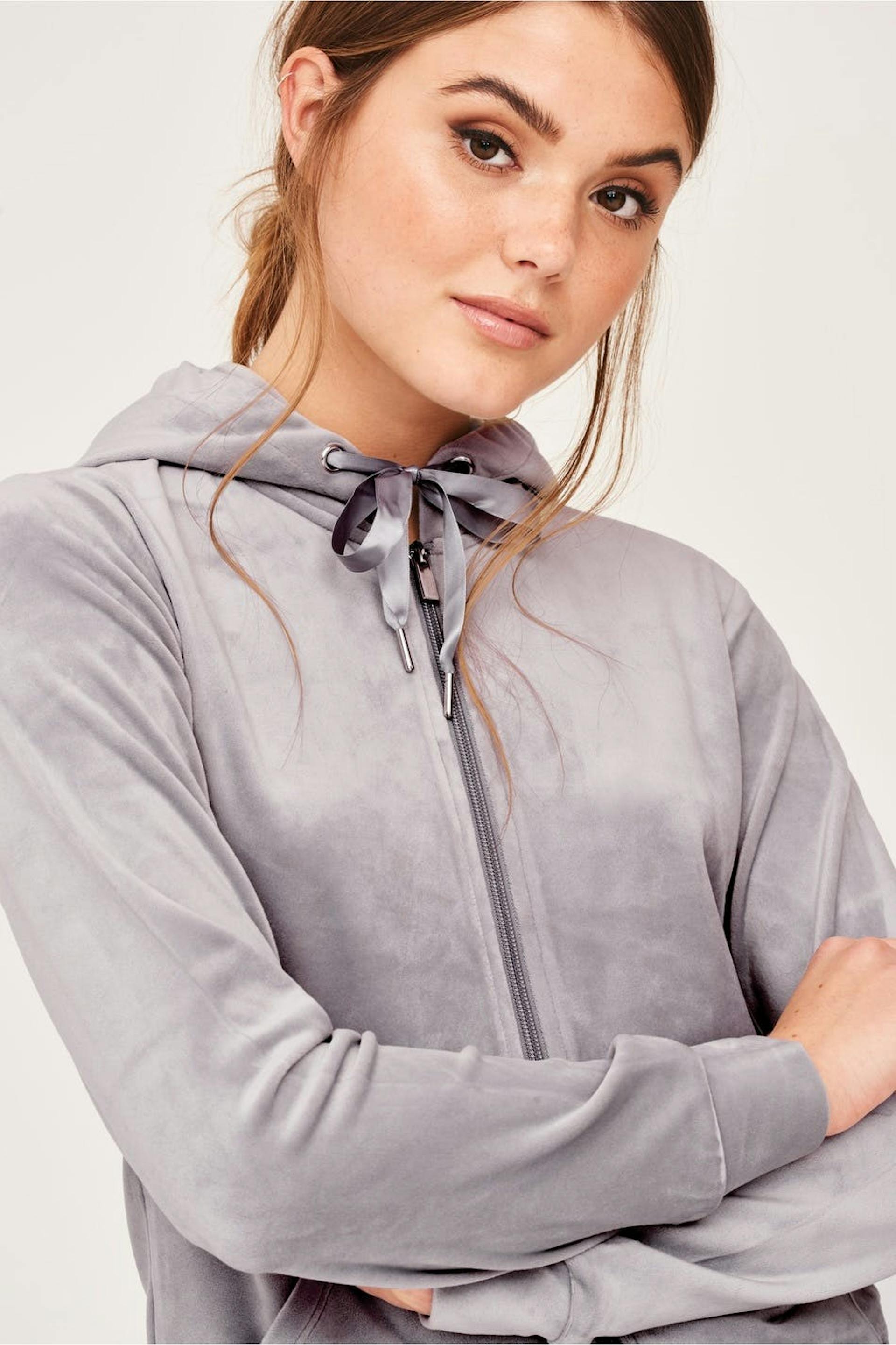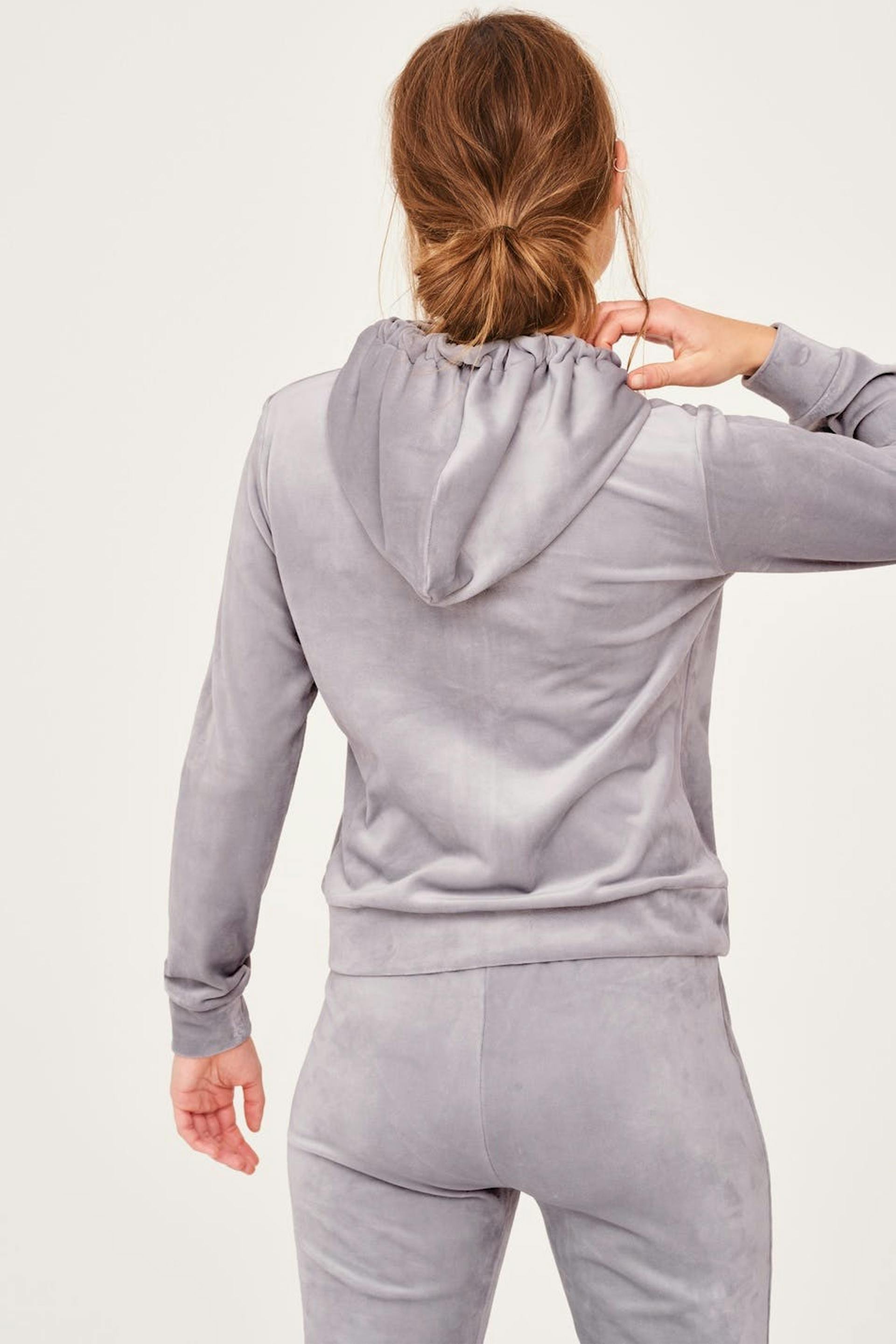 Jumper with a hood with a drawstring in satin. The jumper is grey and has a zip at the front. It is made of velour and has pockets in front. Keep away from fire.