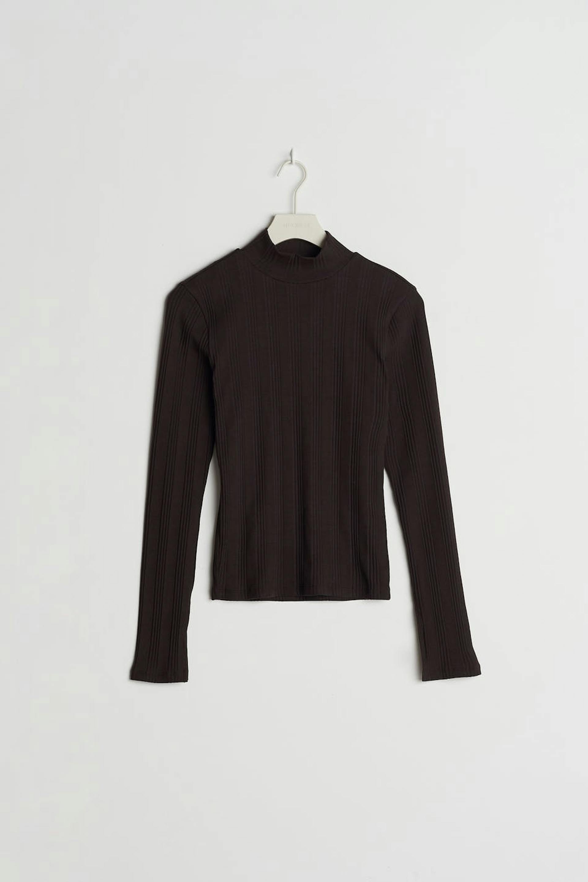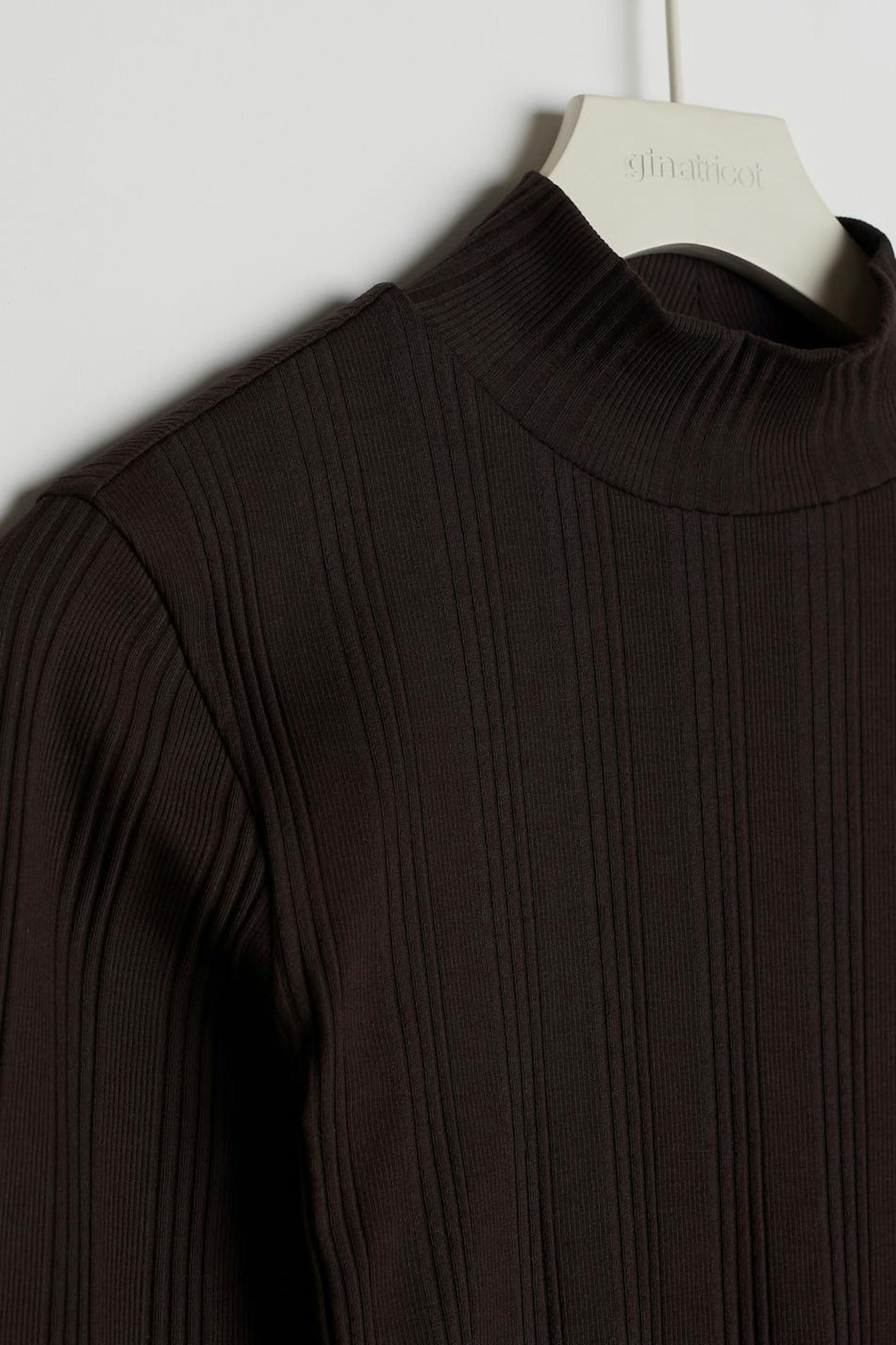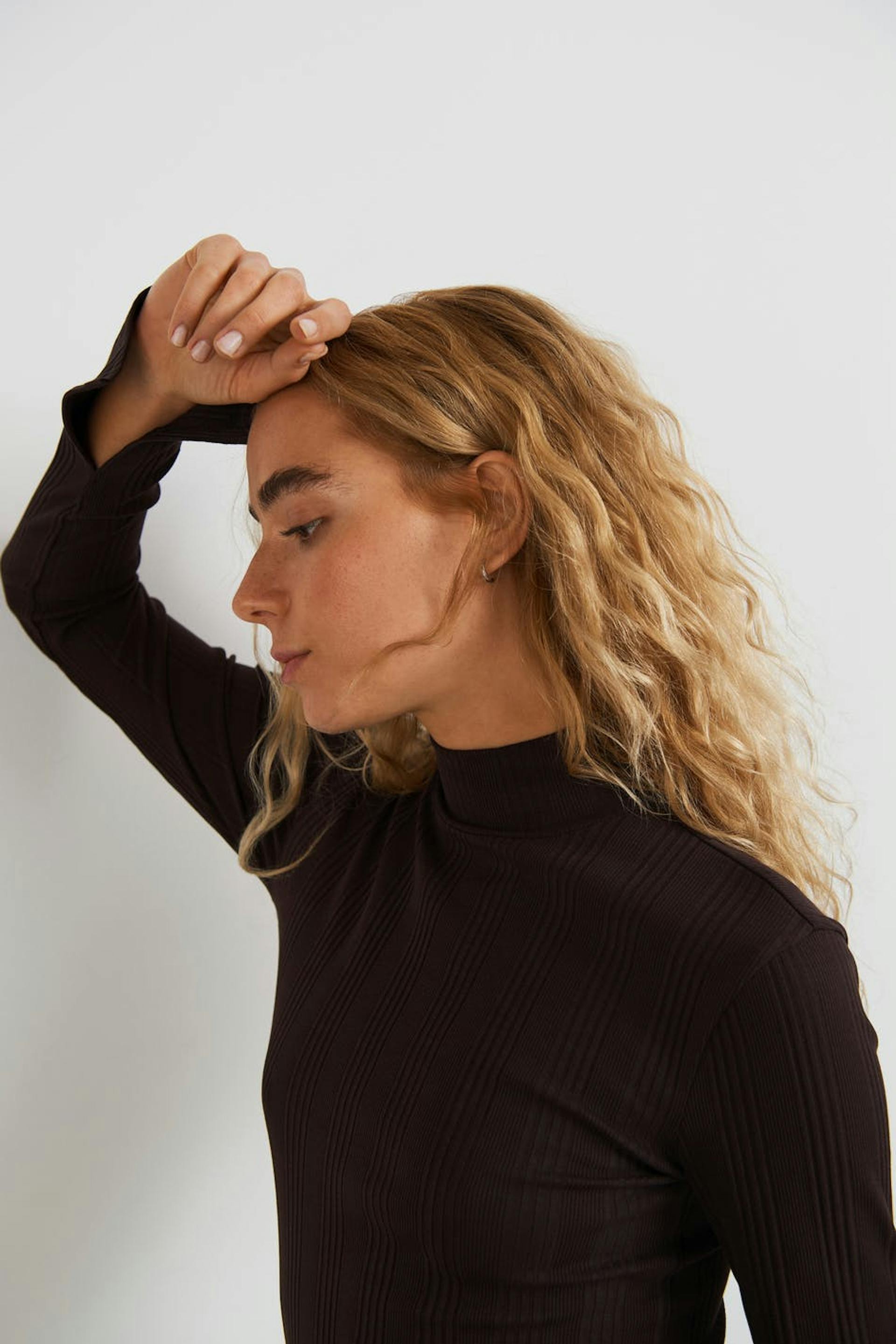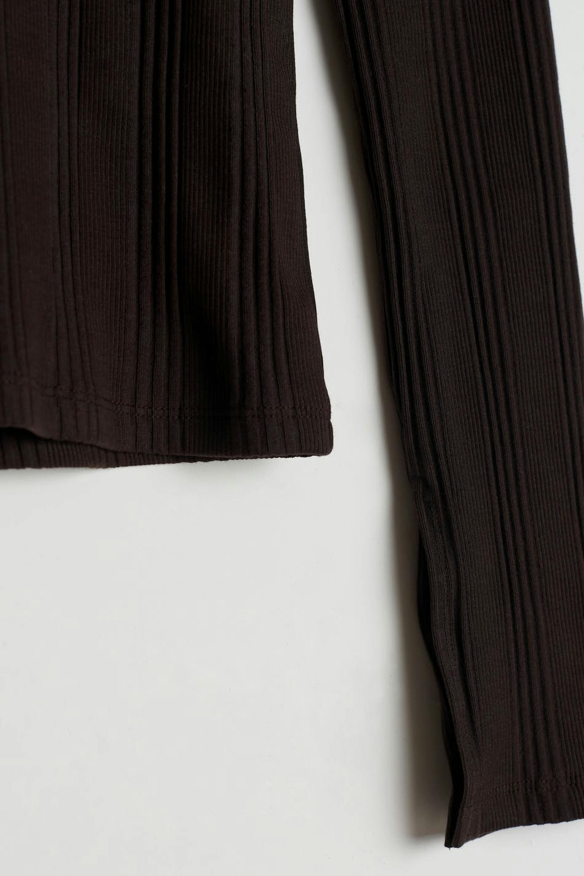 Ribbed jumper with a regular fit. The jumper is brown and has a turtleneck. It has long sleeves with a slit detail on the sleeve ends.
